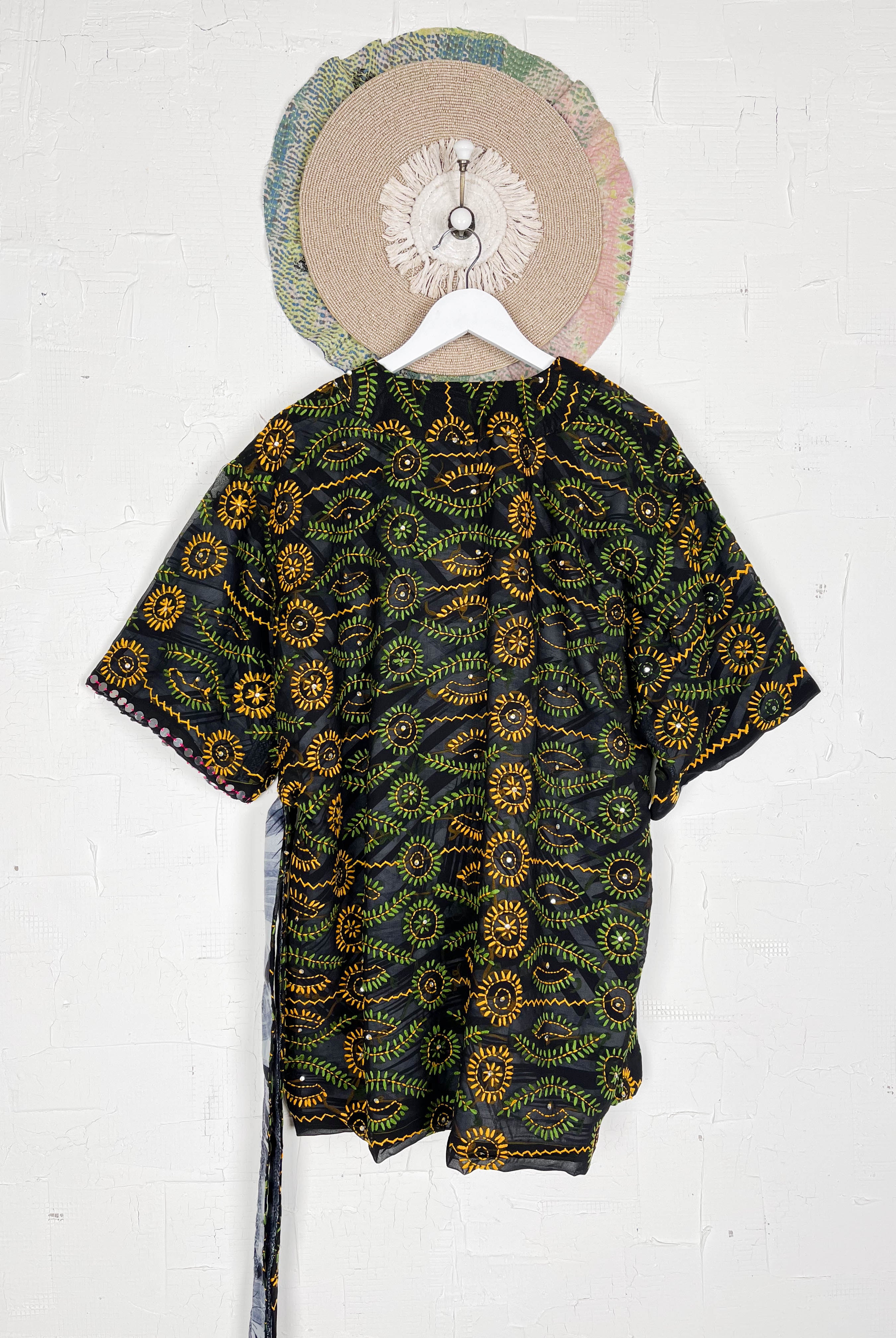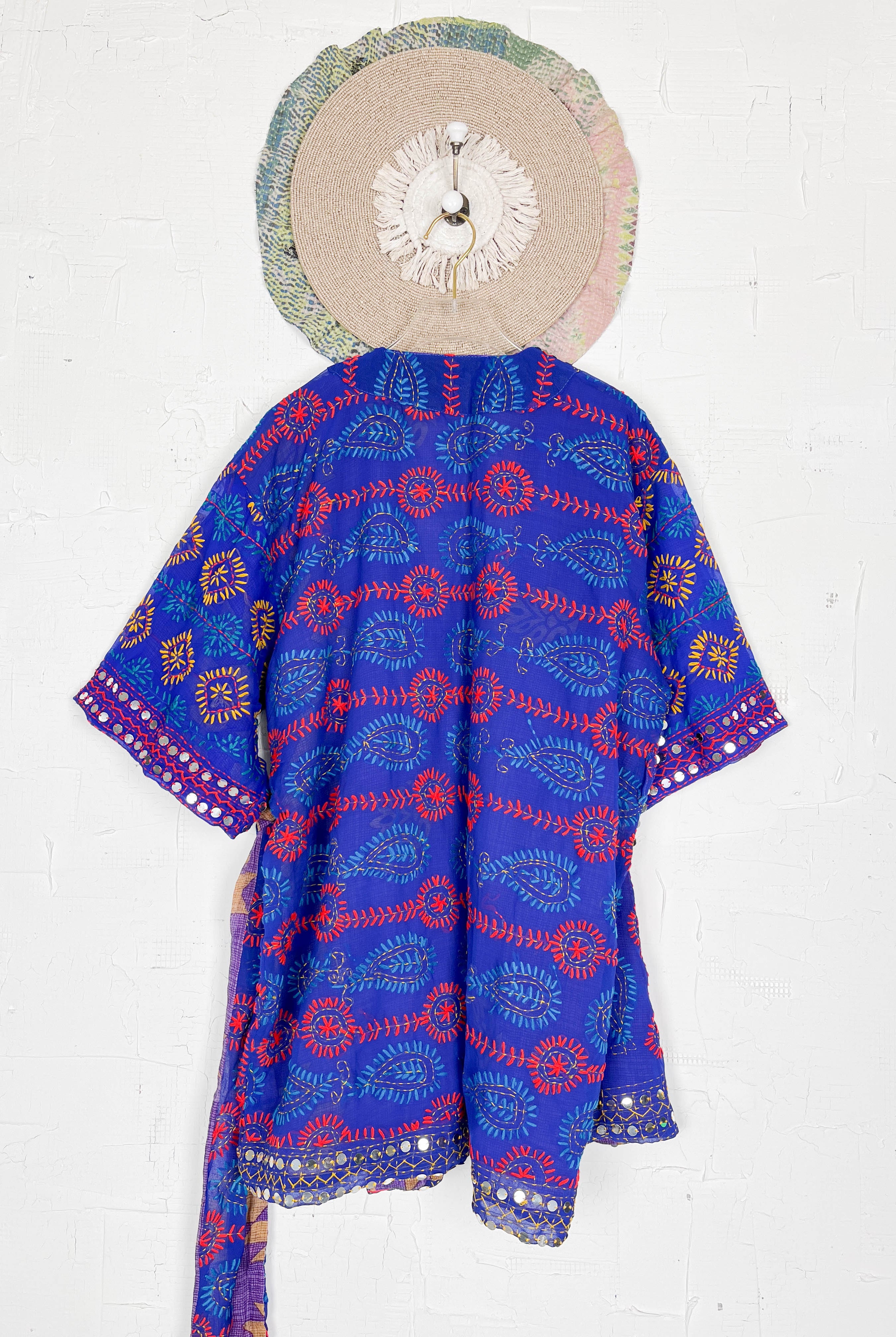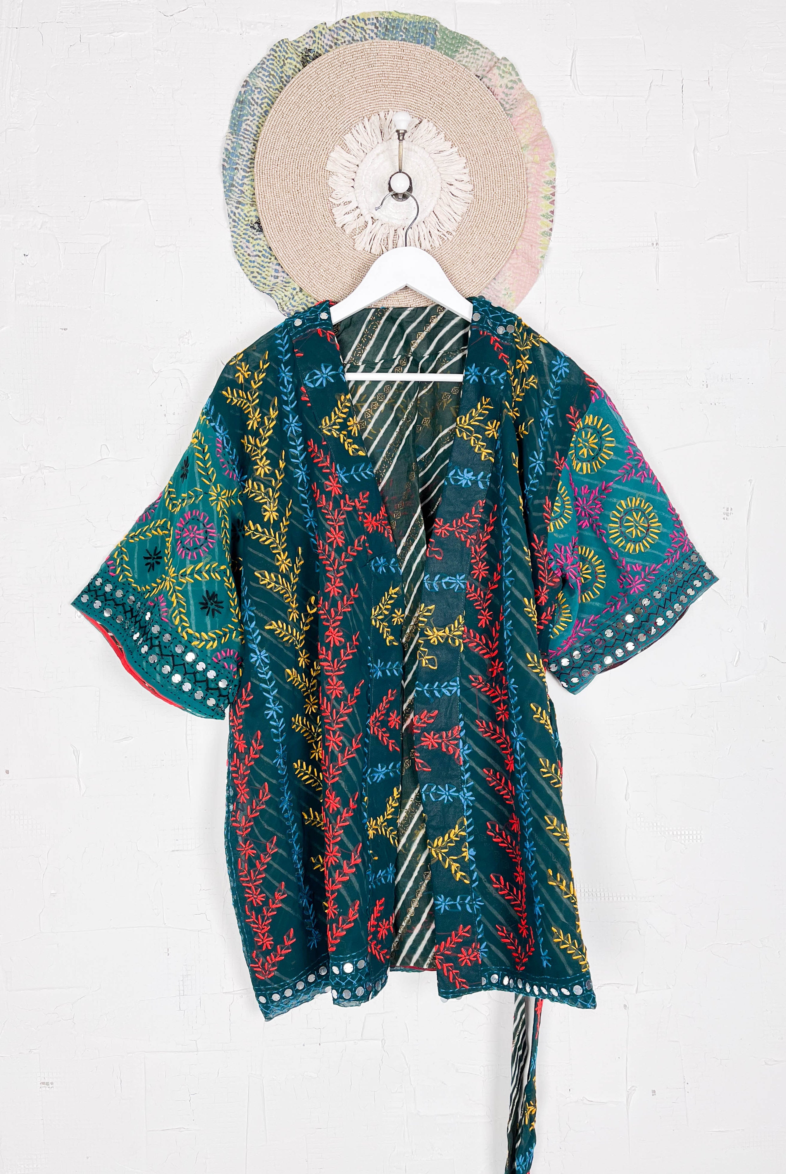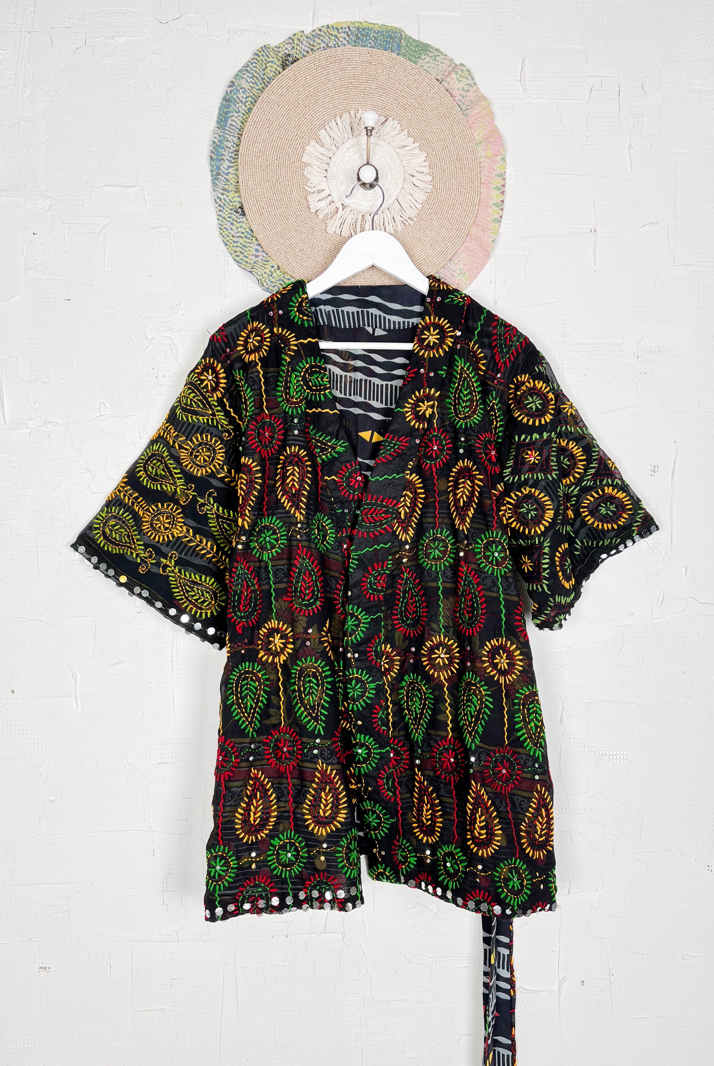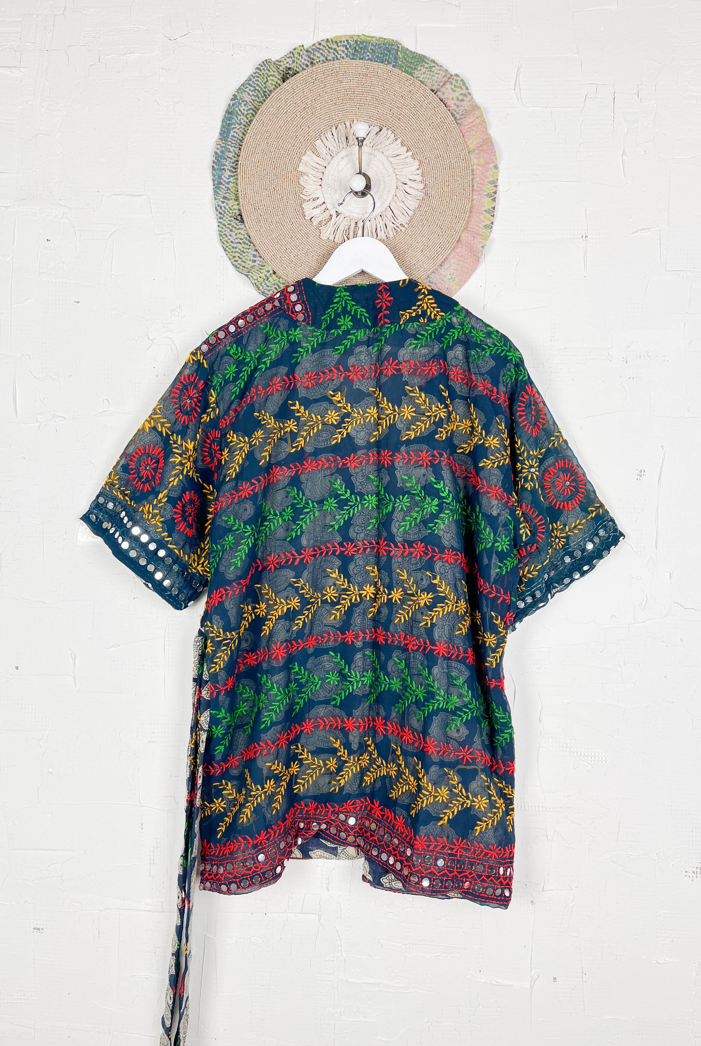 This handcrafted short Phulkari robe is a unique piece of wearable art, designed for daily elegance. Each hand-stitched floral motif, inspired by nature, creates a captivating texture and flow that flatters all body shapes and sizes. Lined with soft, vintage cotton, it offers a harmonious blend of traditional artistry and natural elements.