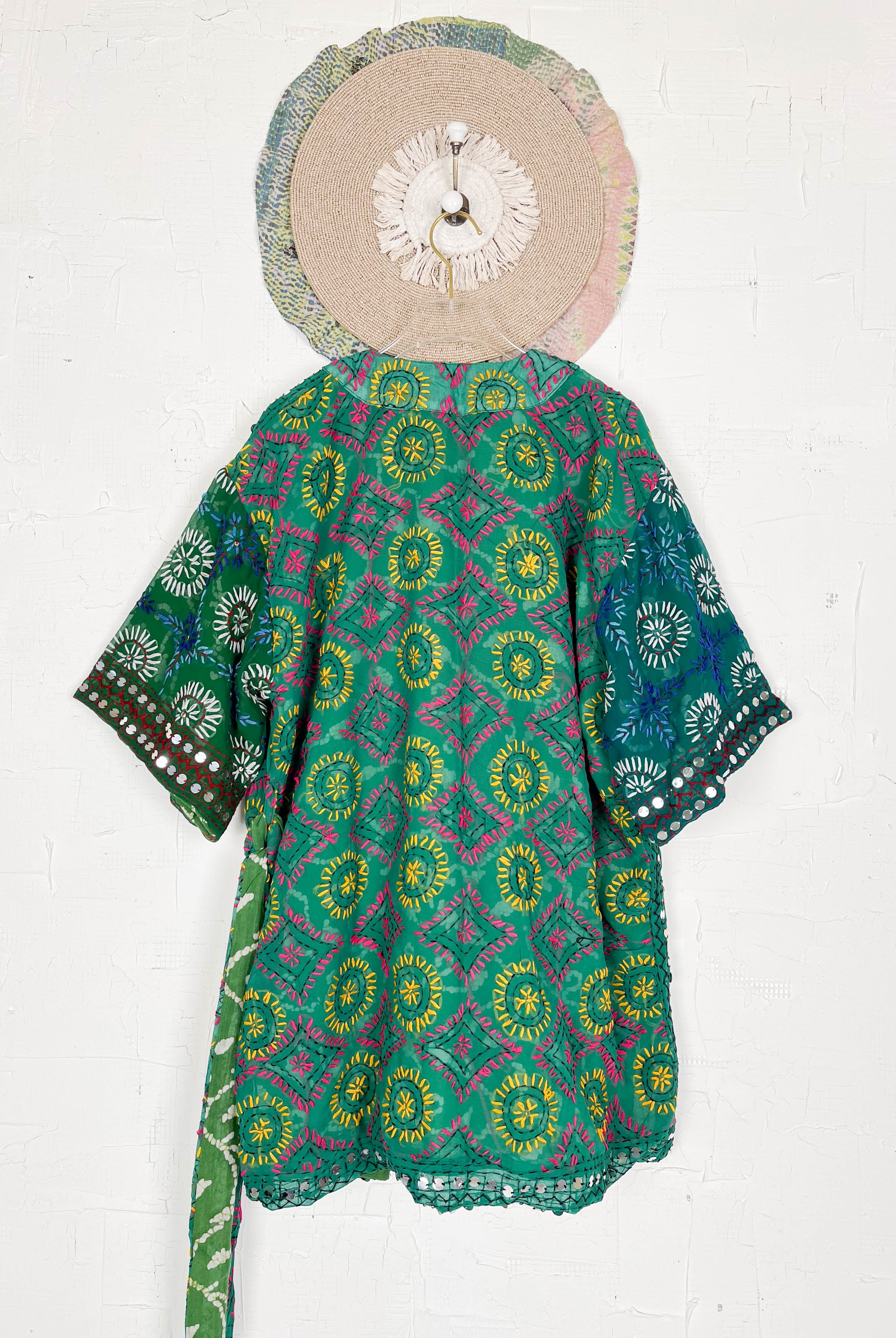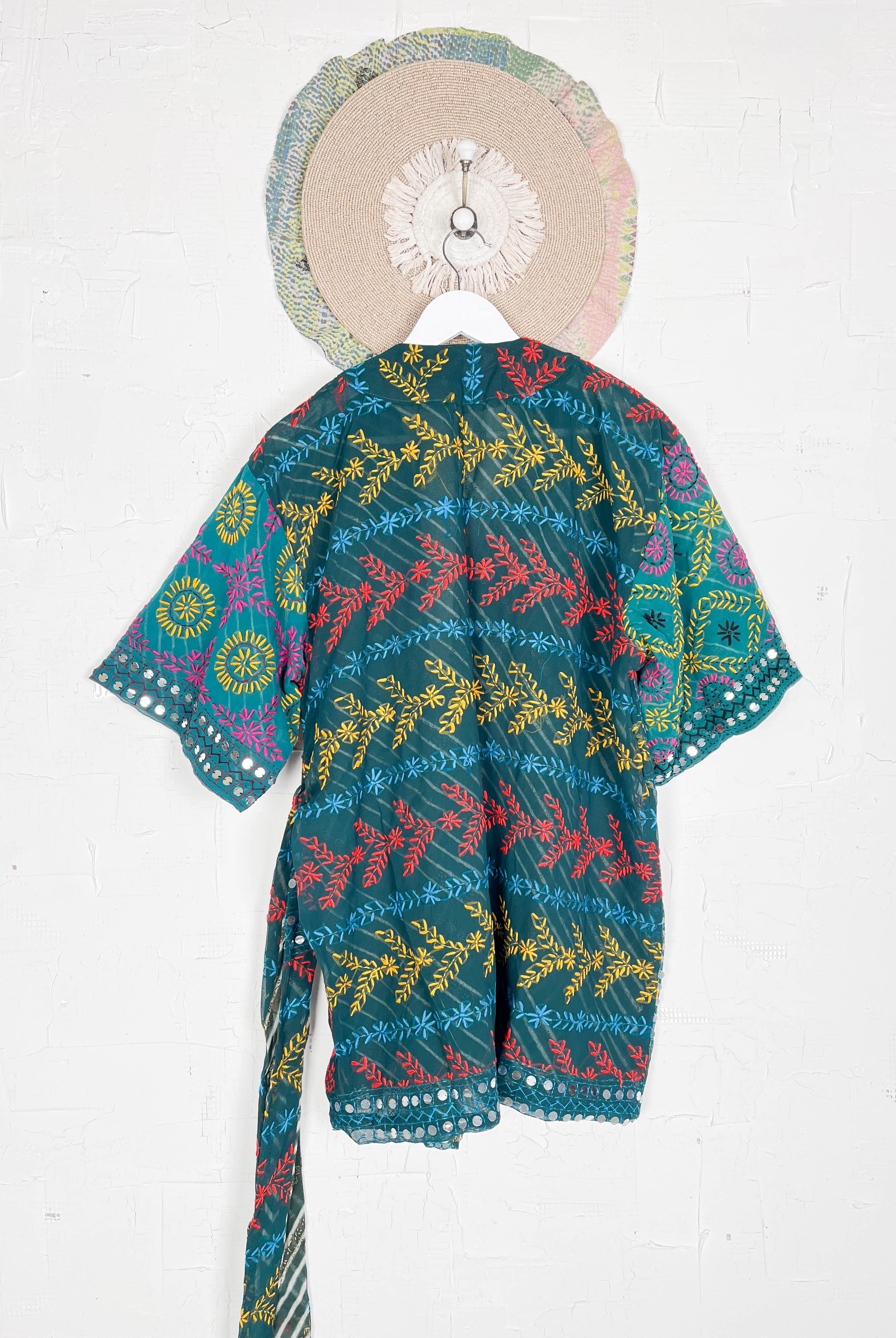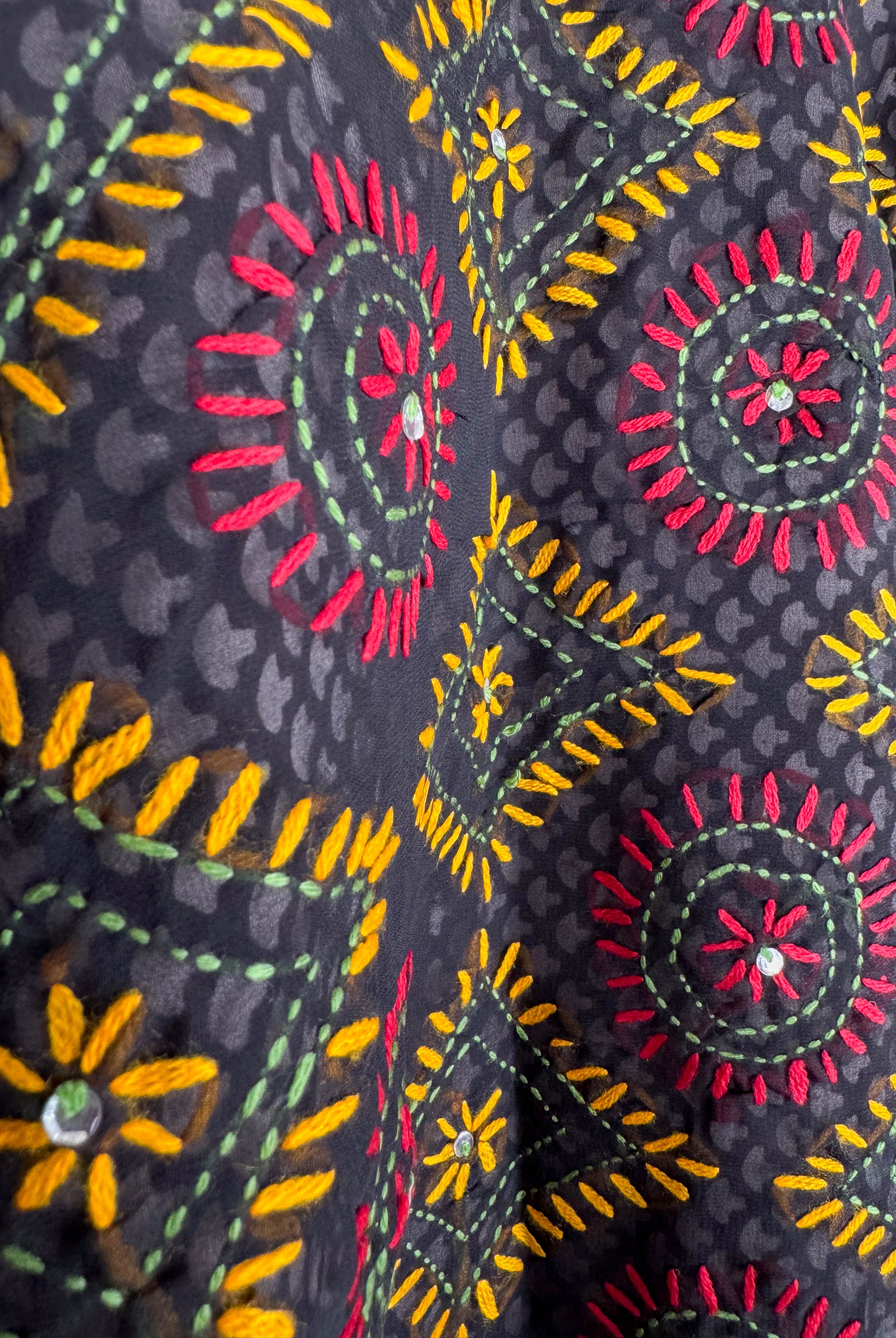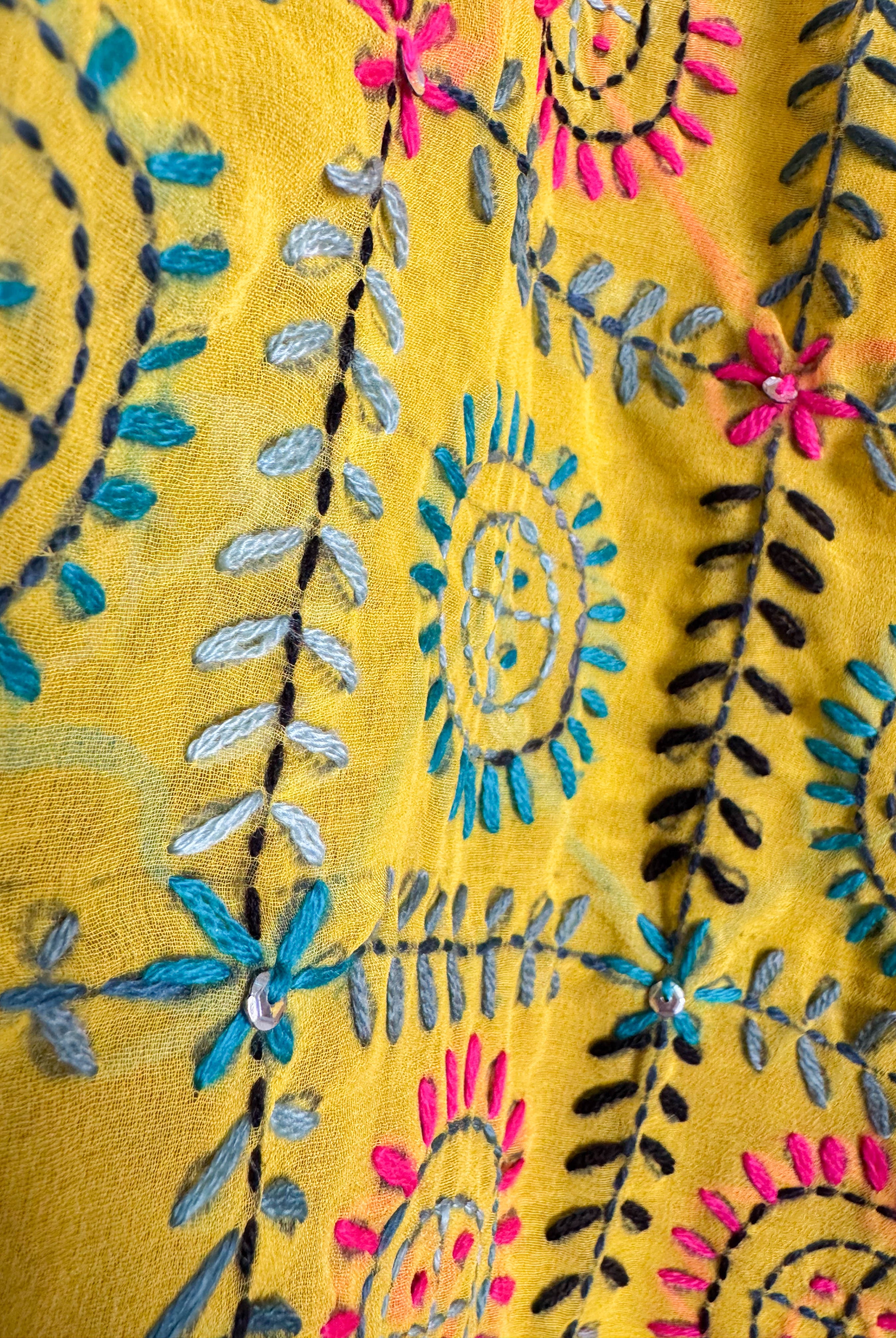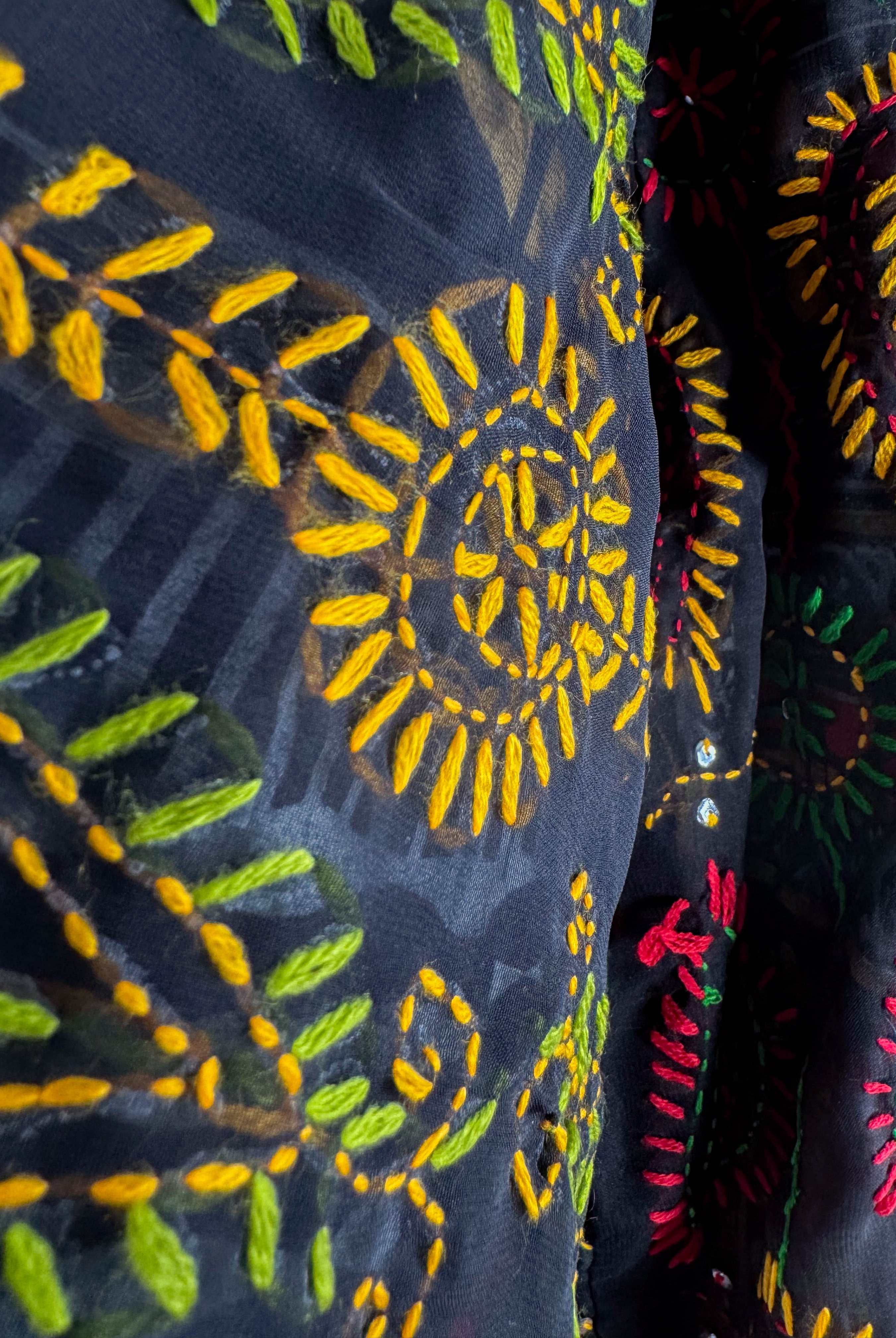 This handcrafted short Phulkari robe is a unique piece of wearable art, designed for daily elegance. Each hand-stitched floral motif, inspired by nature, creates a captivating texture and flow that flatters all body shapes and sizes. Lined with soft, vintage cotton, it offers a harmonious blend of traditional artistry and natural elements.