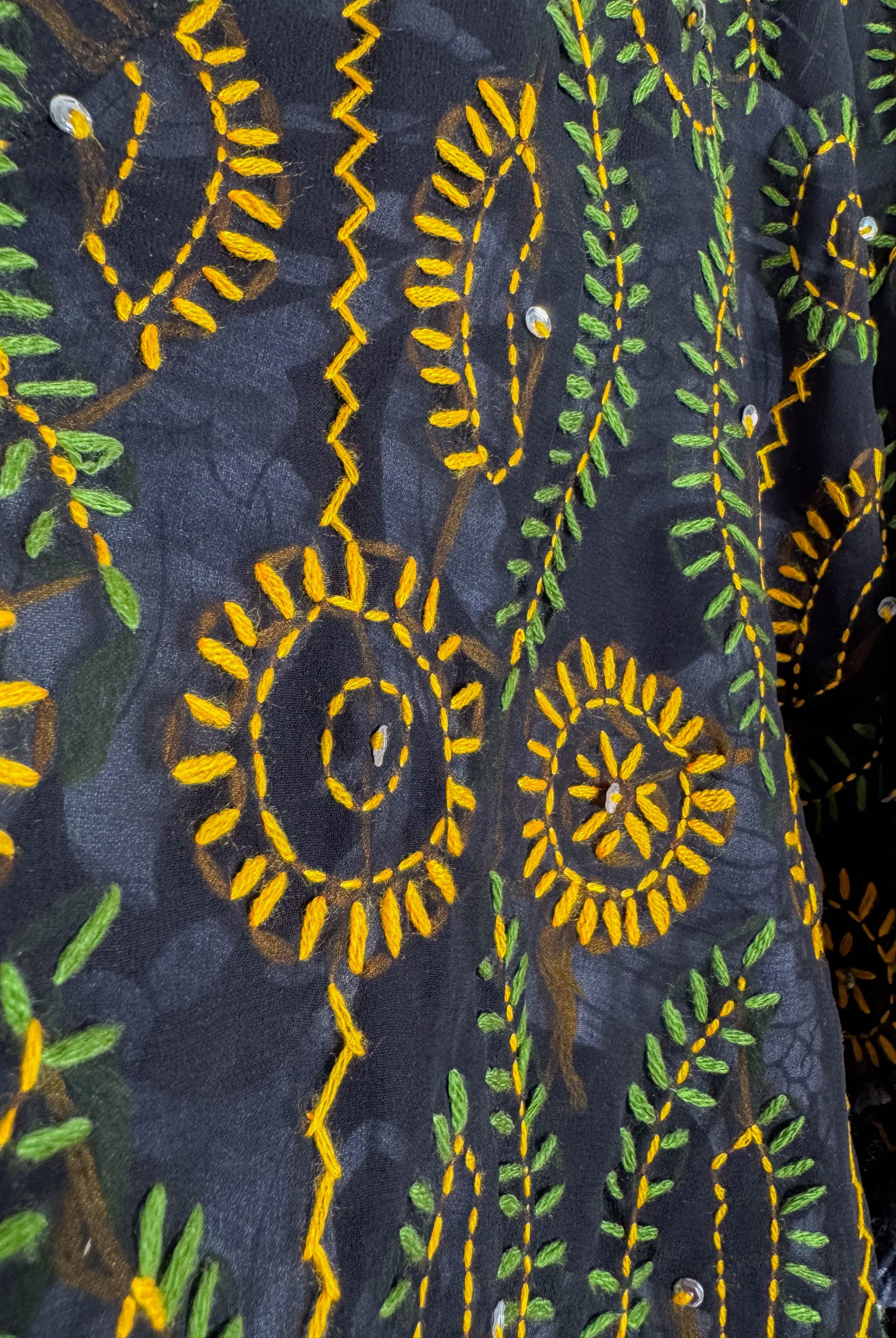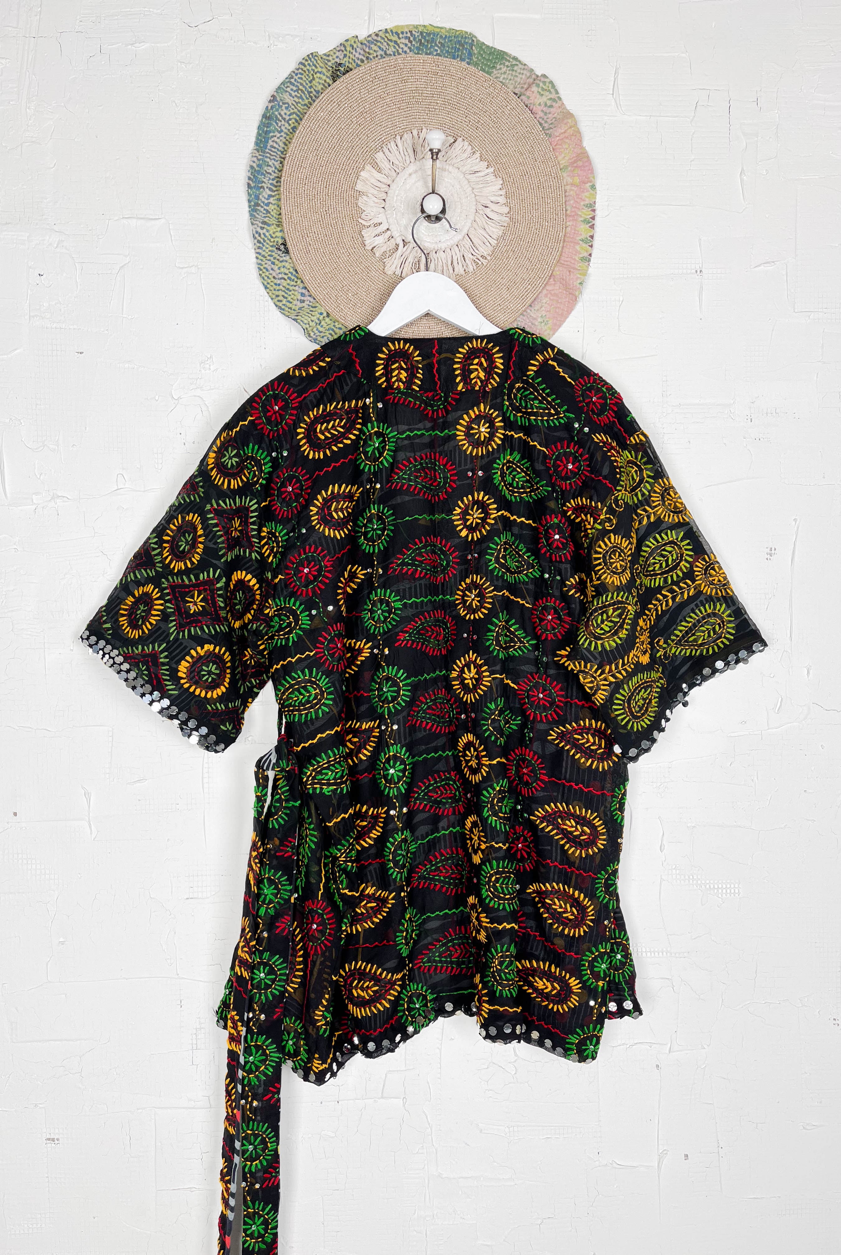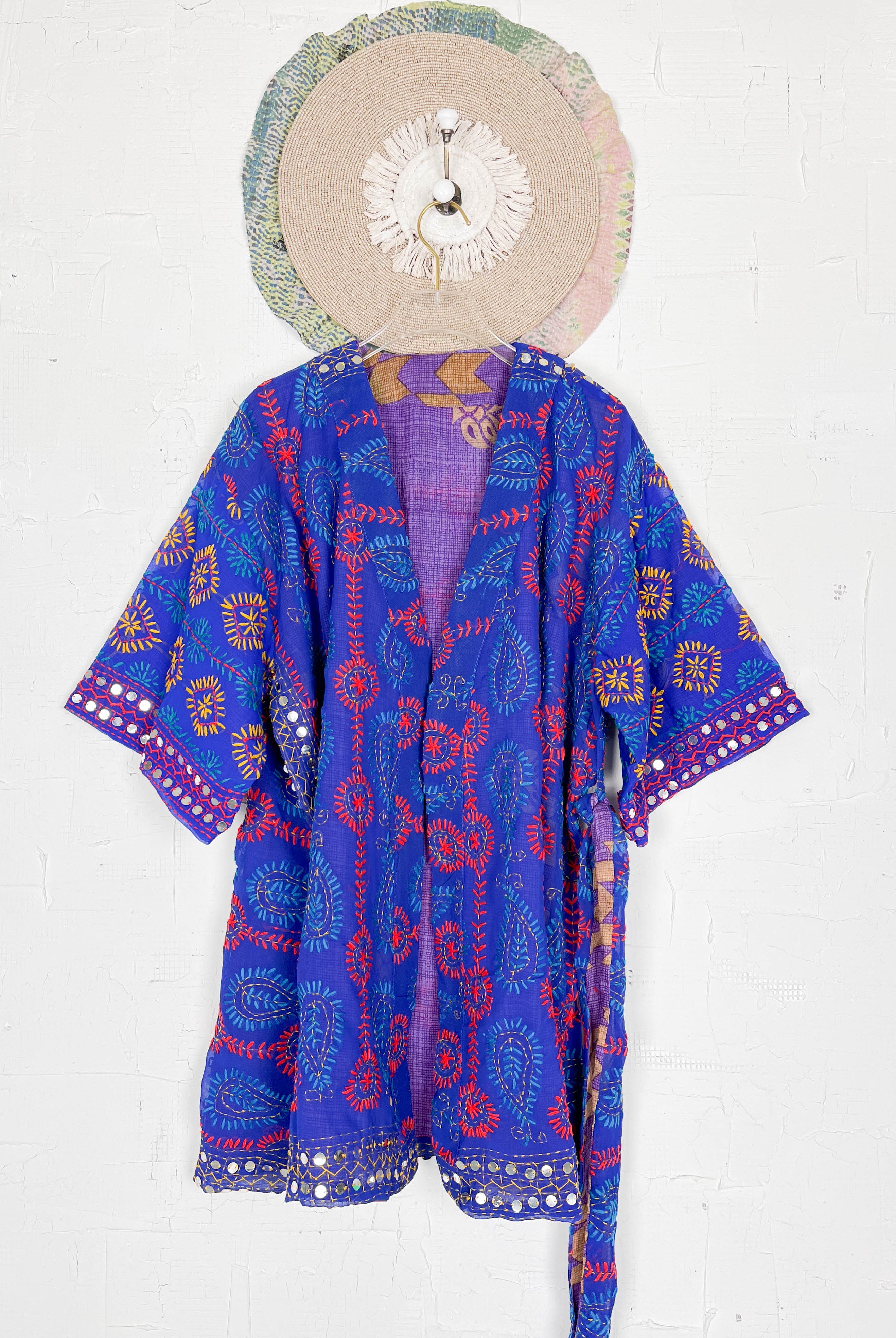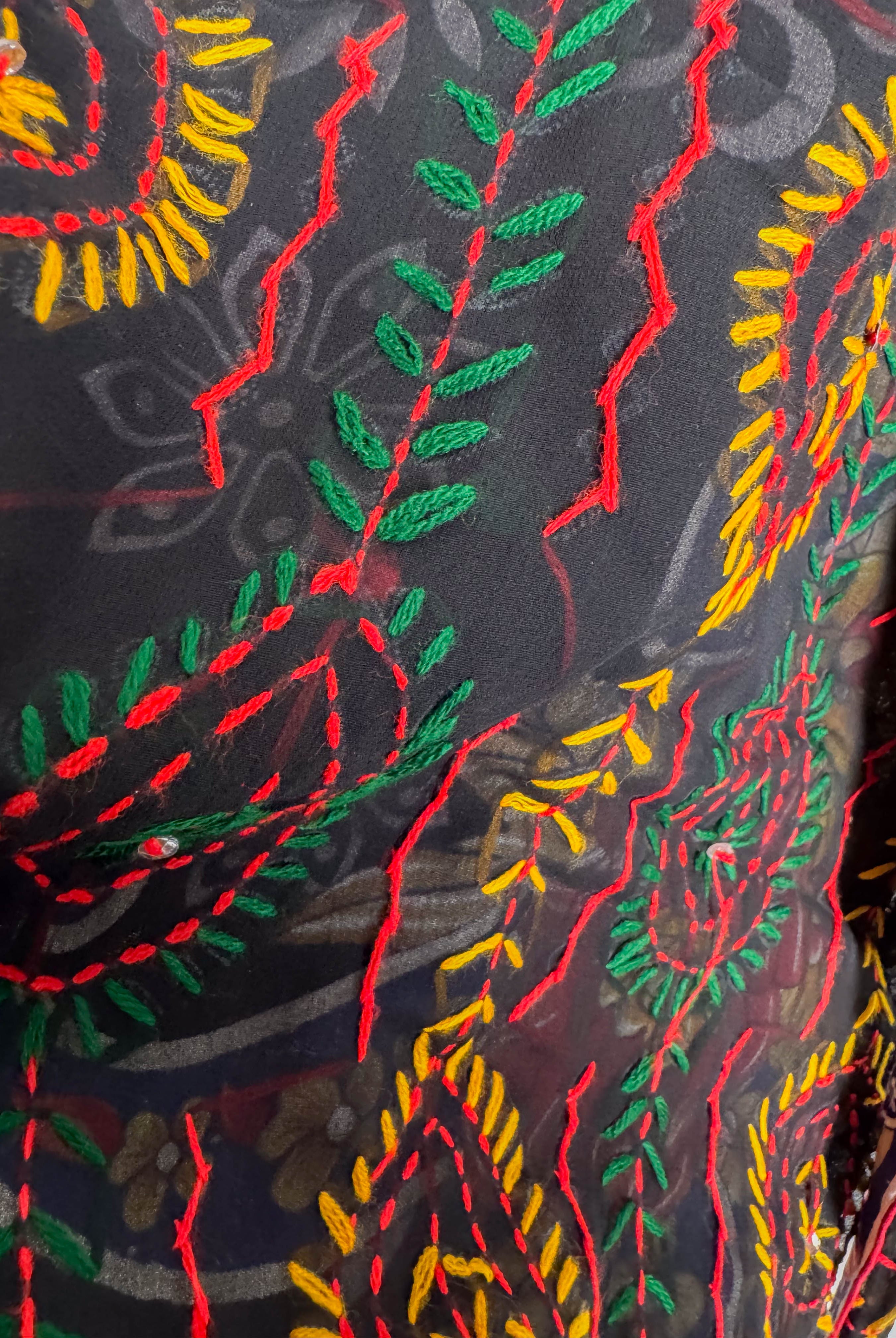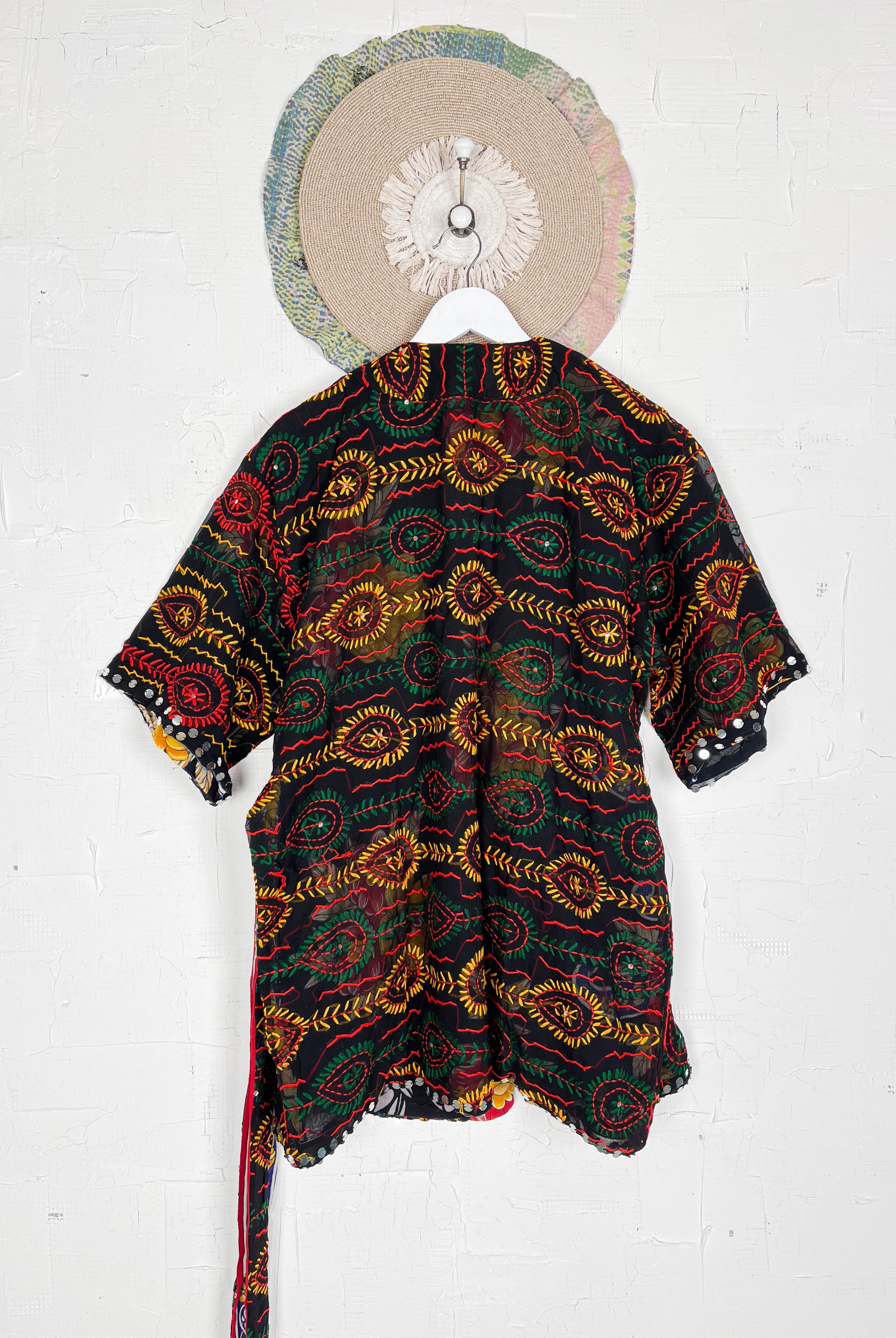 This handcrafted short Phulkari robe is a unique piece of wearable art, designed for daily elegance. Each hand-stitched floral motif, inspired by nature, creates a captivating texture and flow that flatters all body shapes and sizes. Lined with soft, vintage cotton, it offers a harmonious blend of traditional artistry and natural elements.