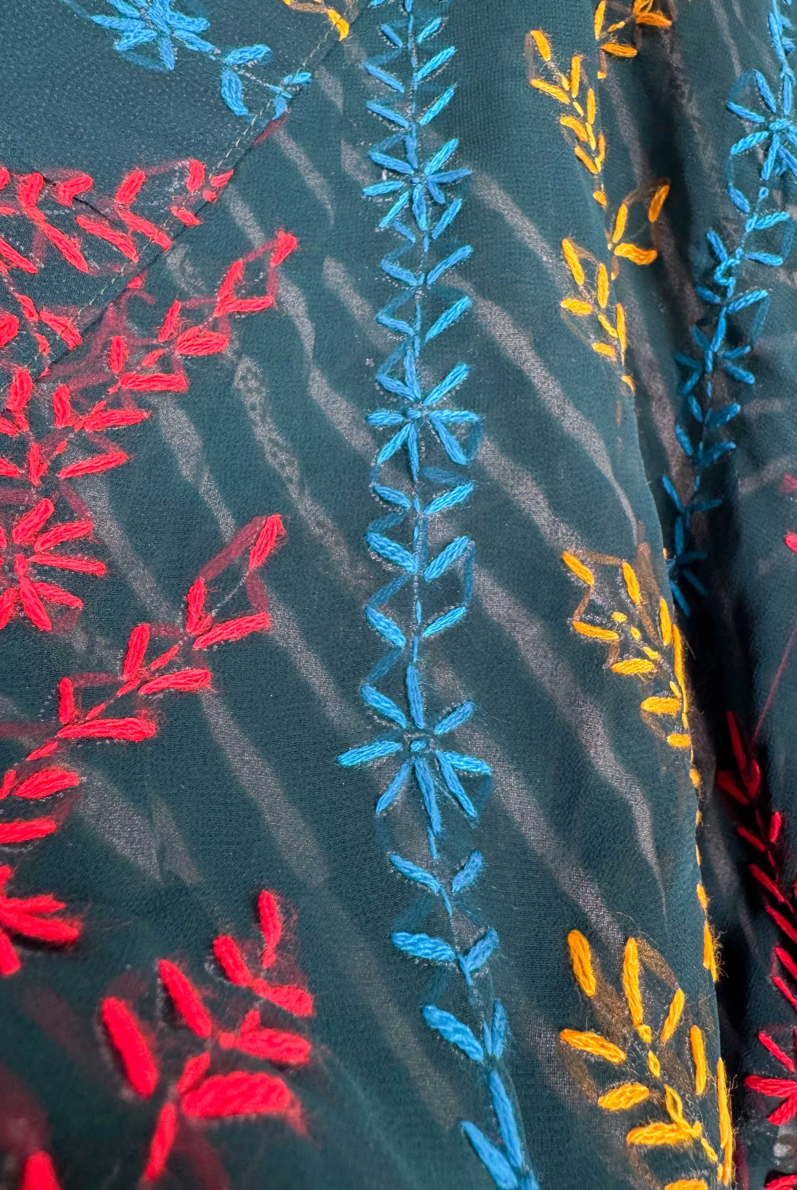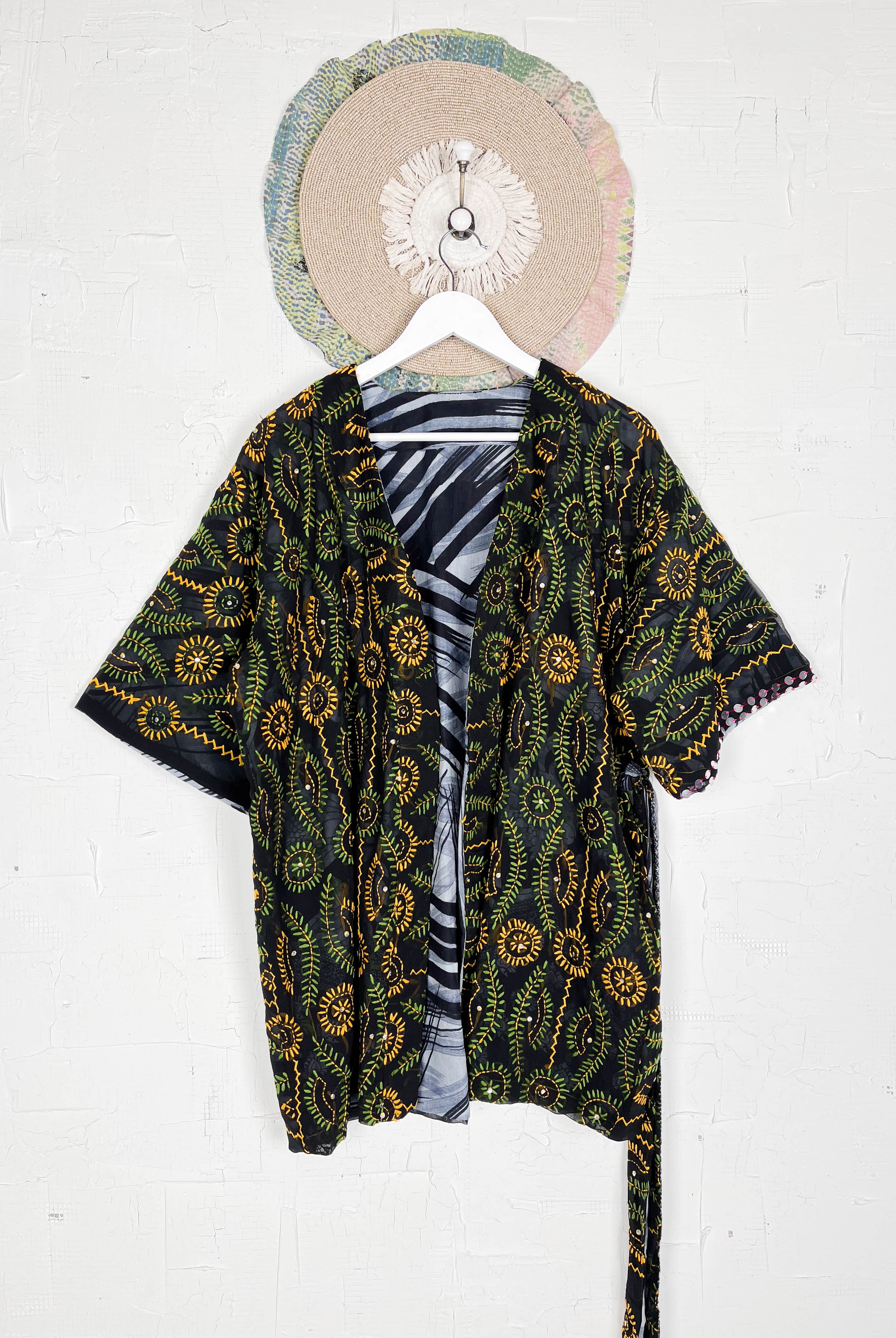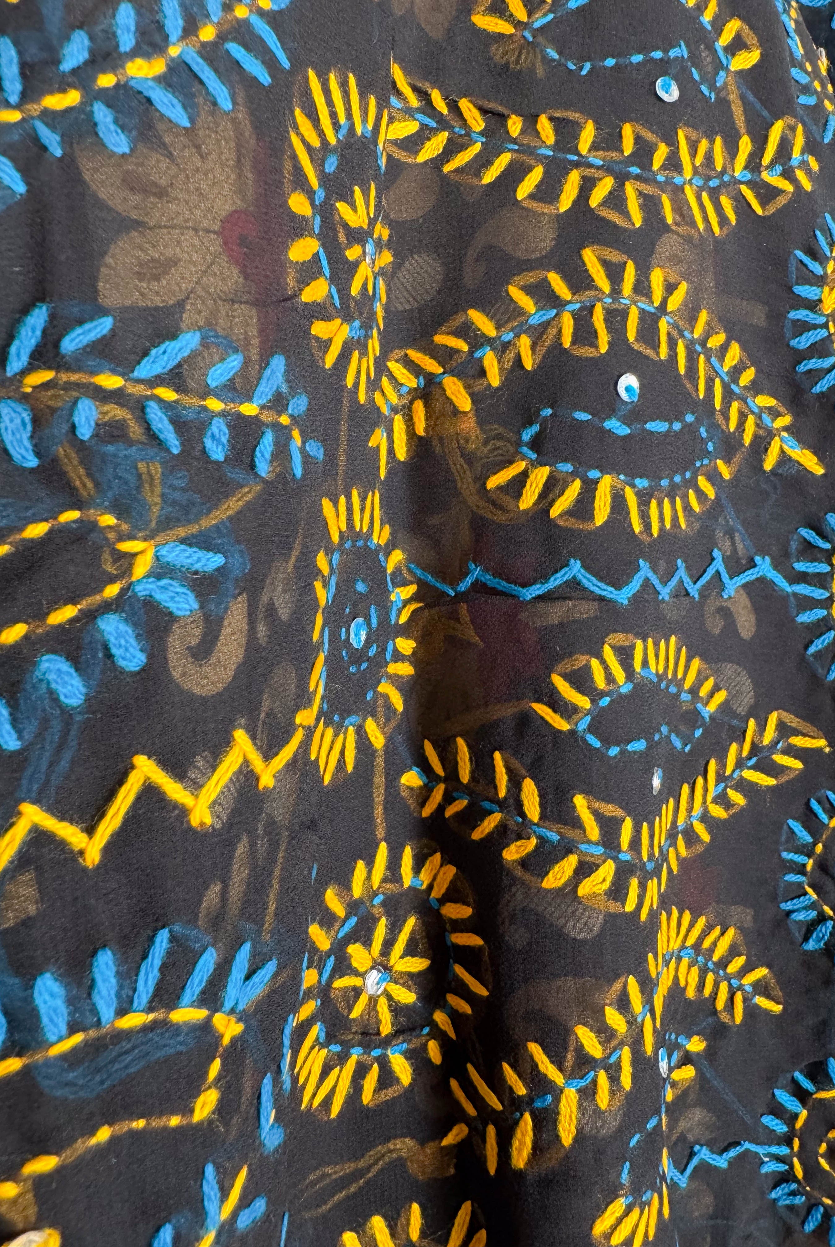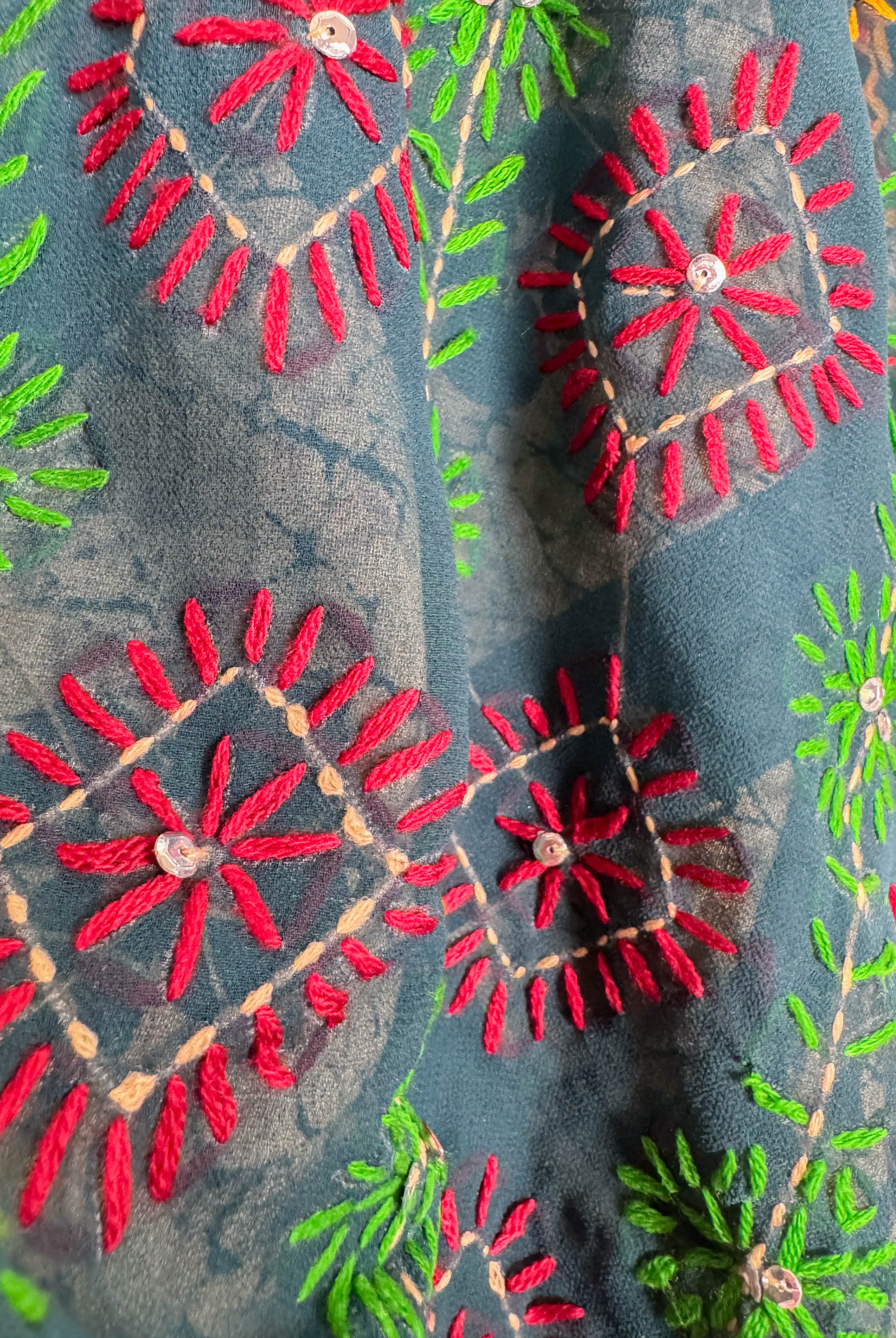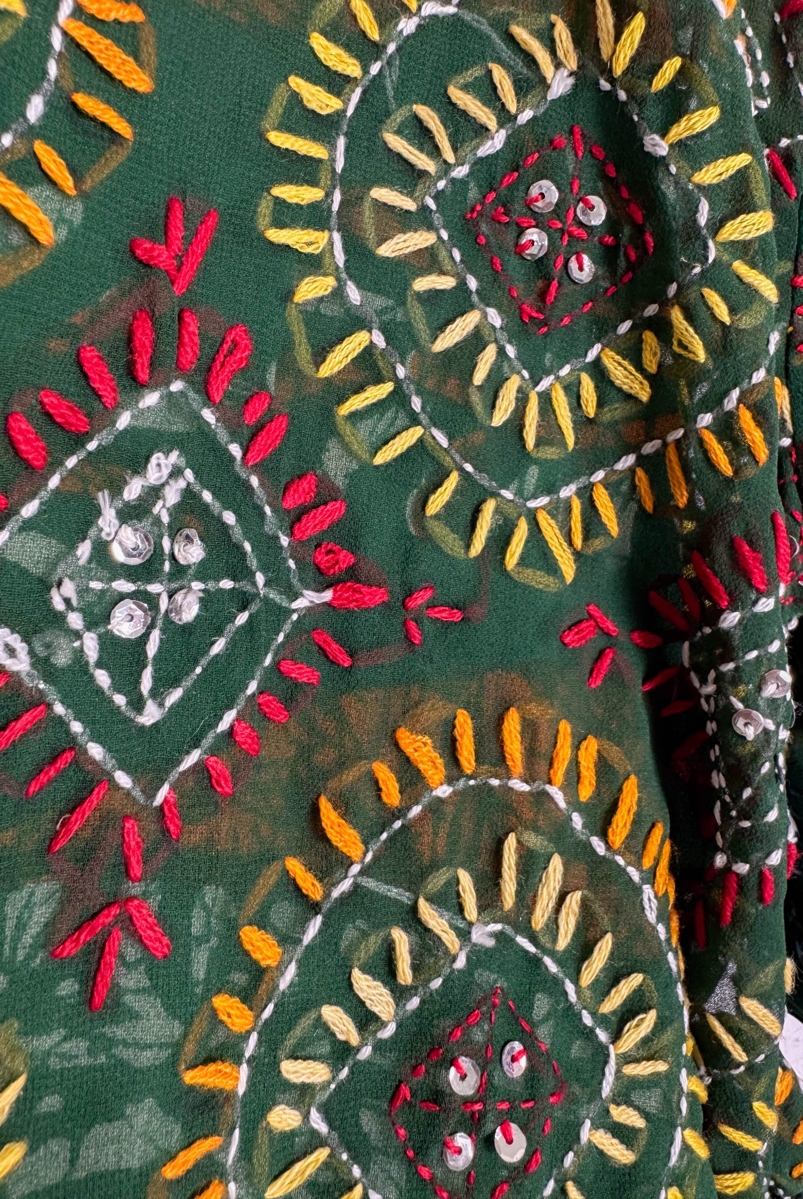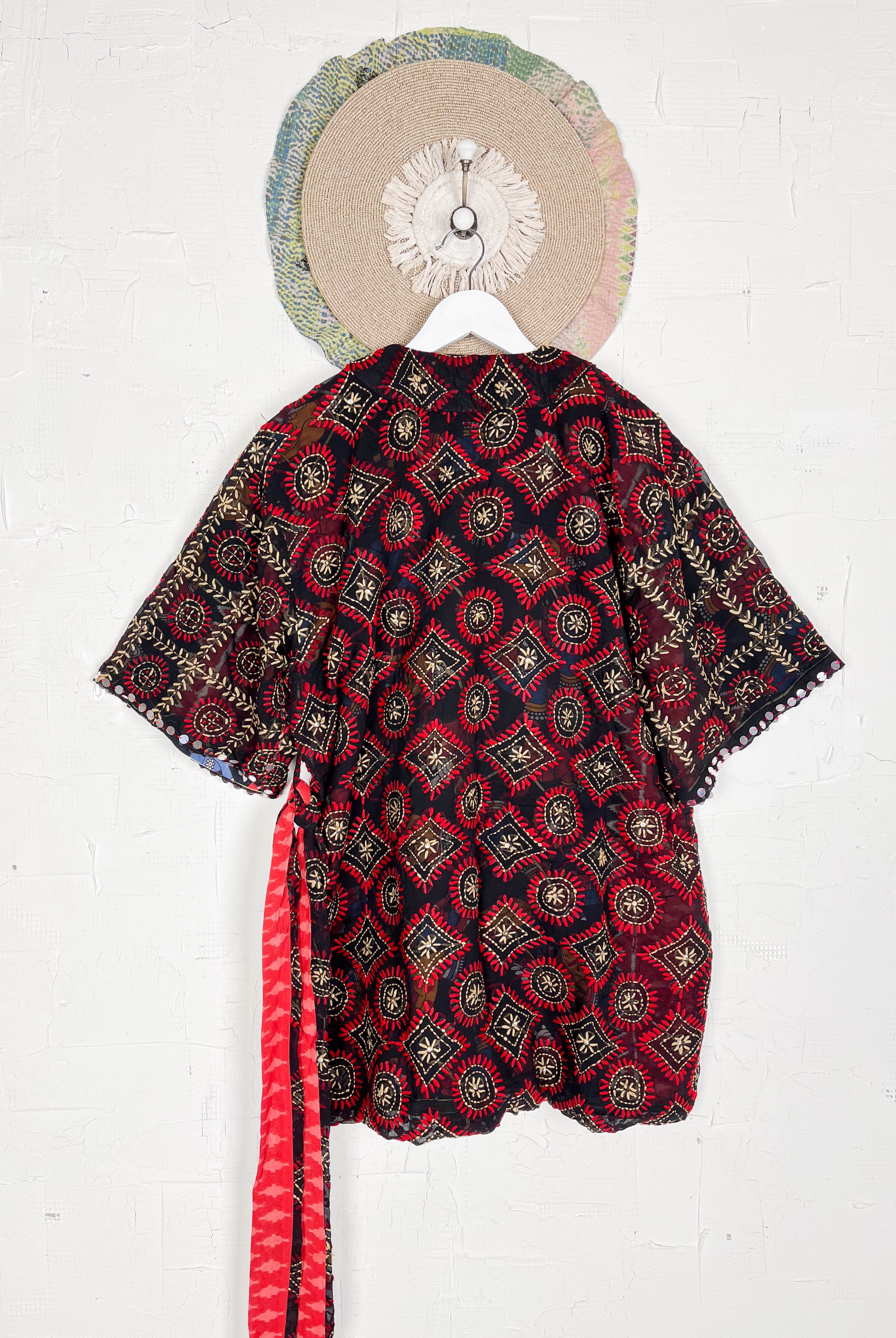 This handcrafted short Phulkari robe is a unique piece of wearable art, designed for daily elegance. Each hand-stitched floral motif, inspired by nature, creates a captivating texture and flow that flatters all body shapes and sizes. Lined with soft, vintage cotton, it offers a harmonious blend of traditional artistry and natural elements.