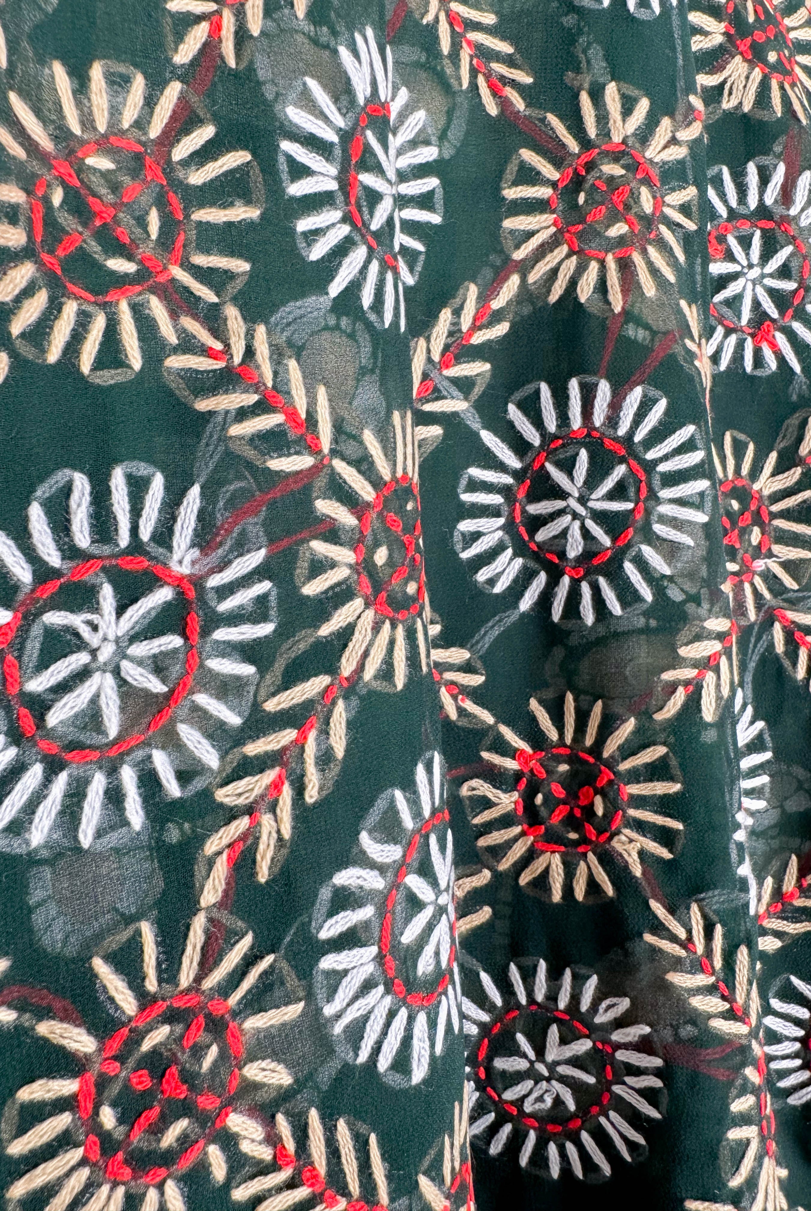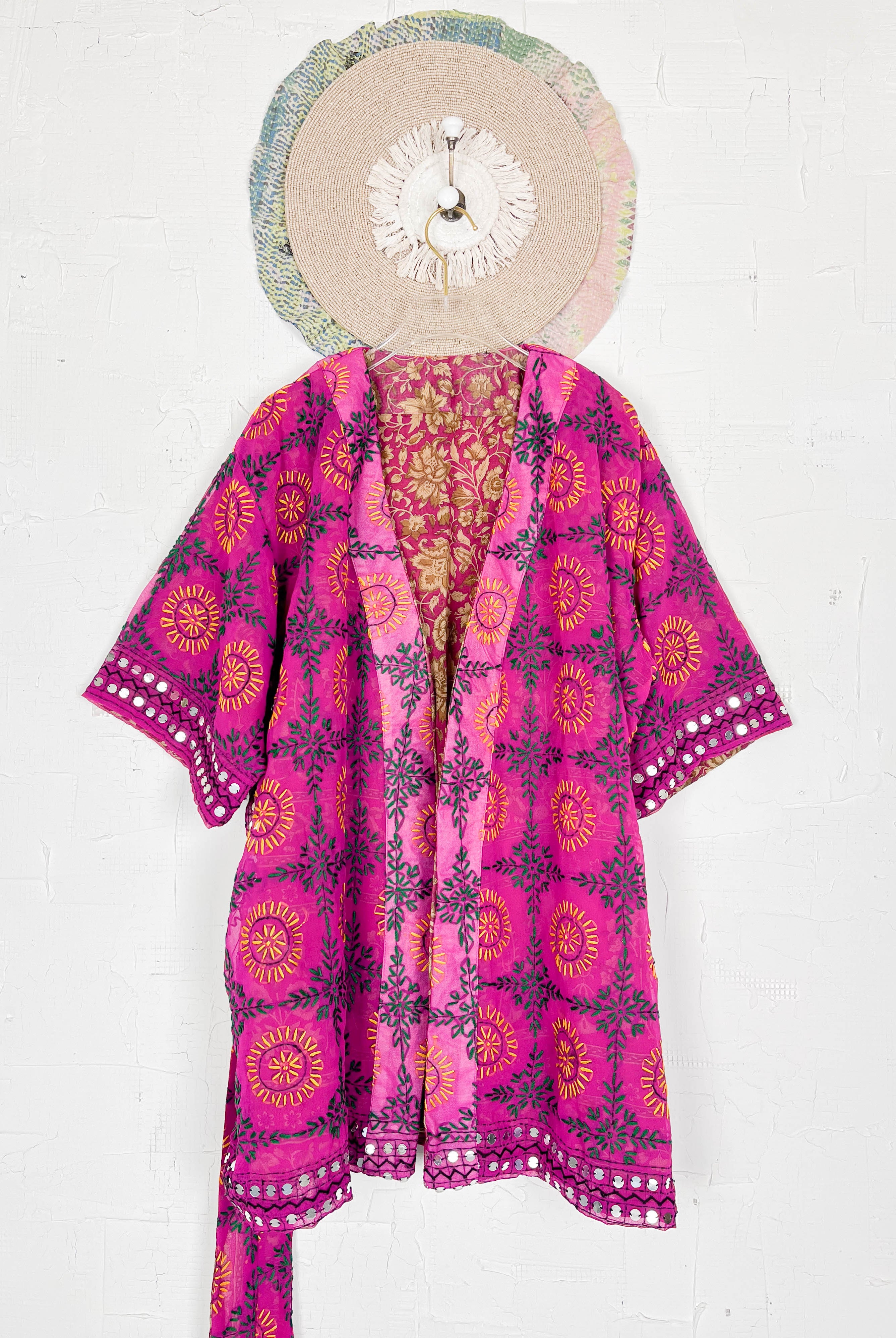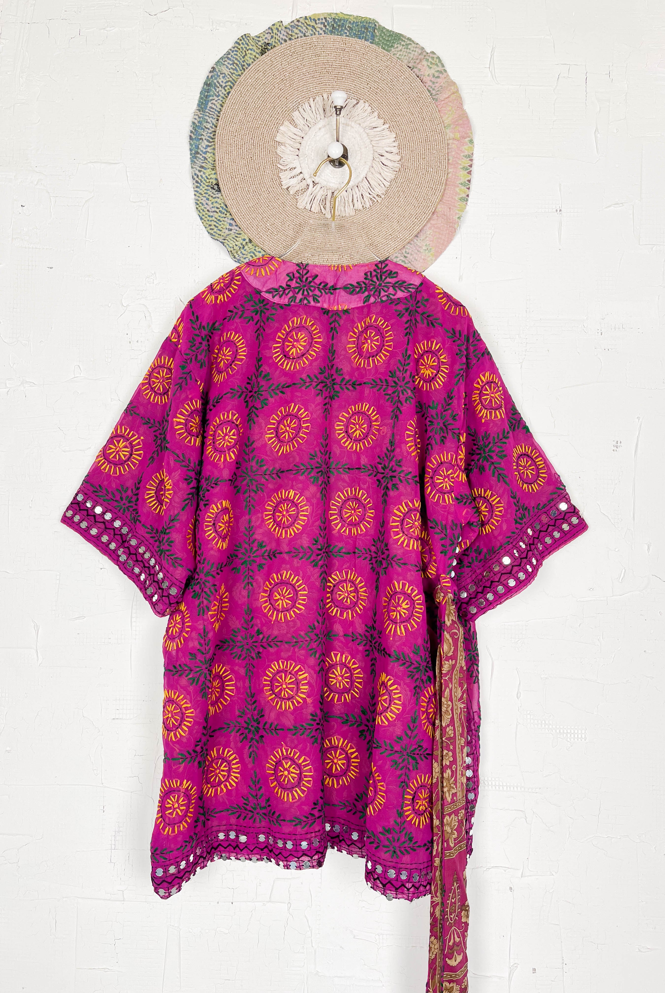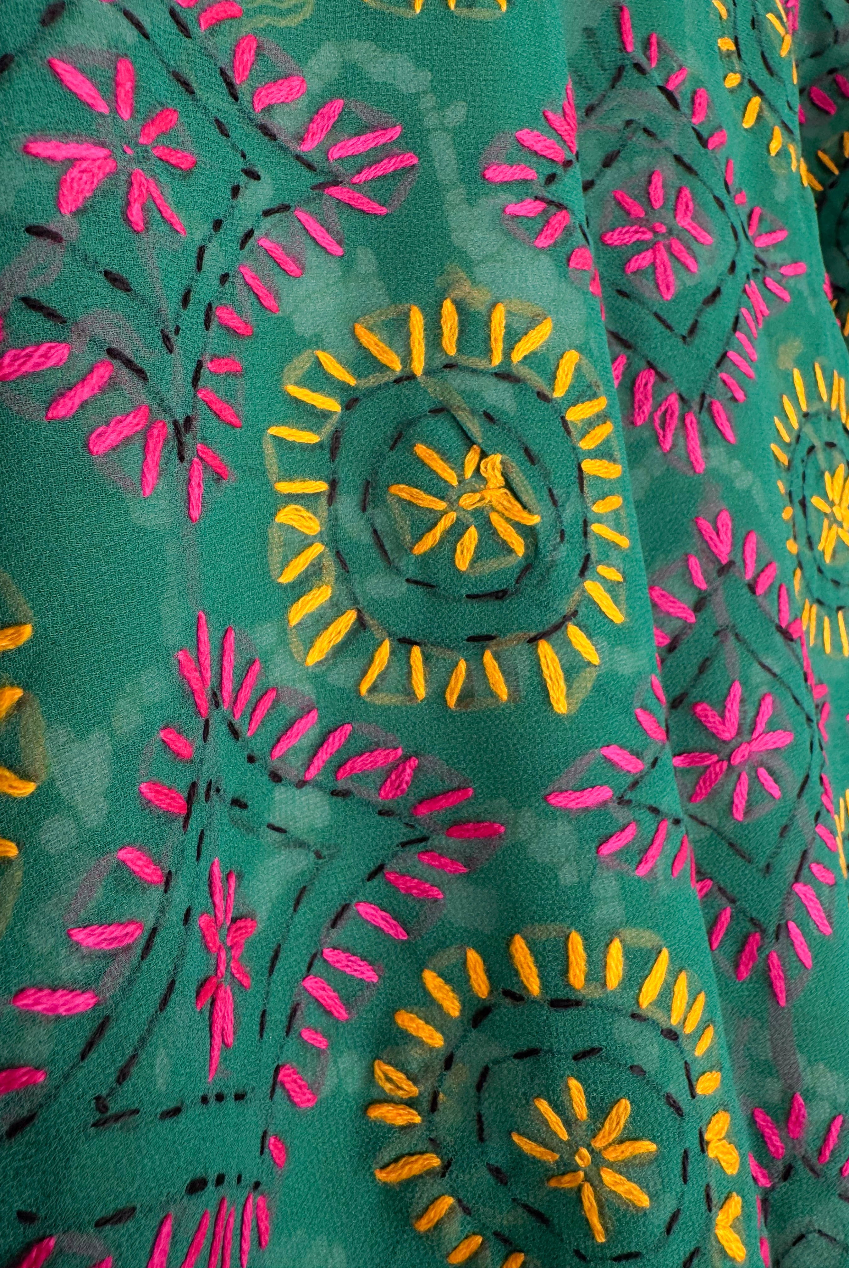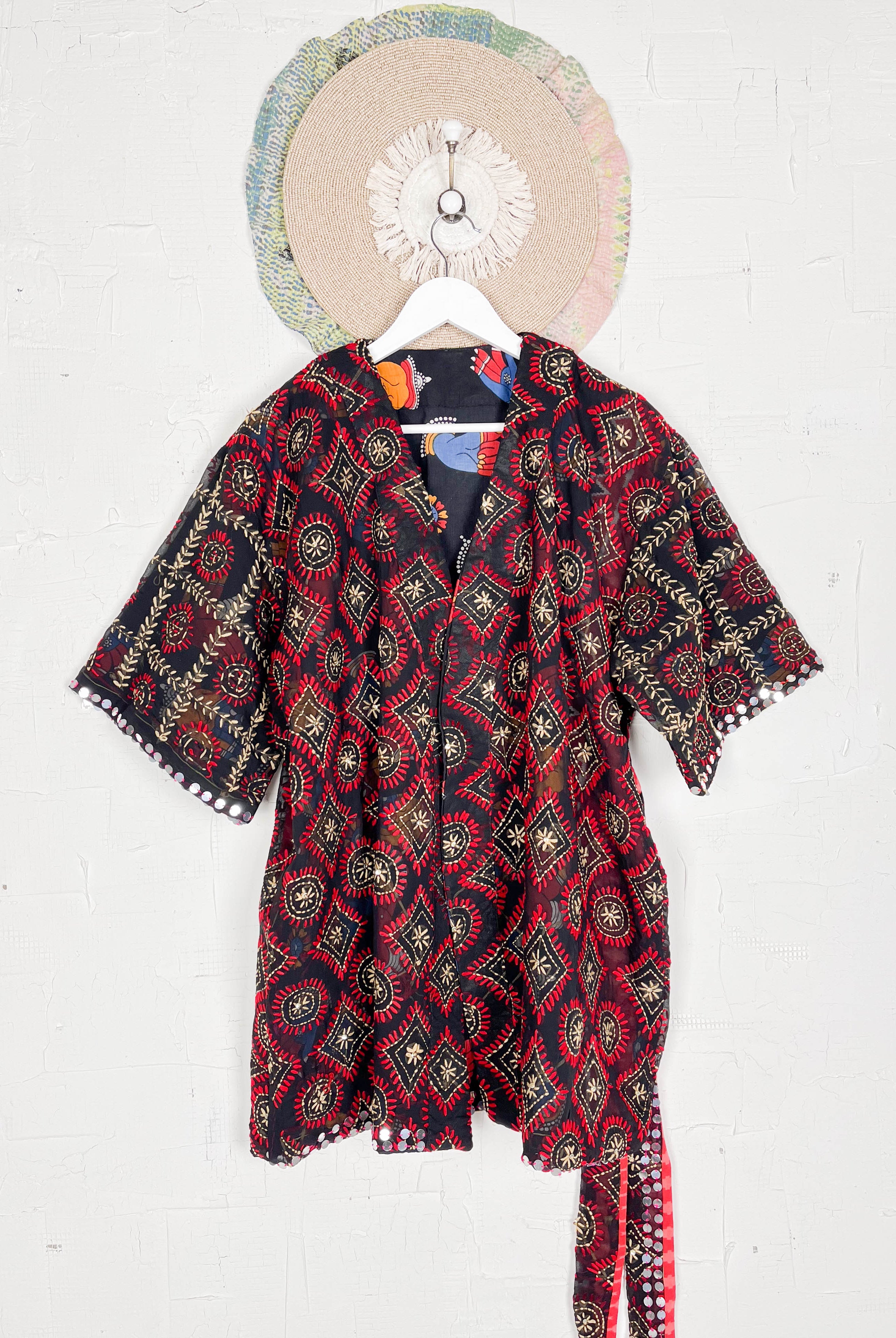 This handcrafted short Phulkari robe is a unique piece of wearable art, designed for daily elegance. Each hand-stitched floral motif, inspired by nature, creates a captivating texture and flow that flatters all body shapes and sizes. Lined with soft, vintage cotton, it offers a harmonious blend of traditional artistry and natural elements.