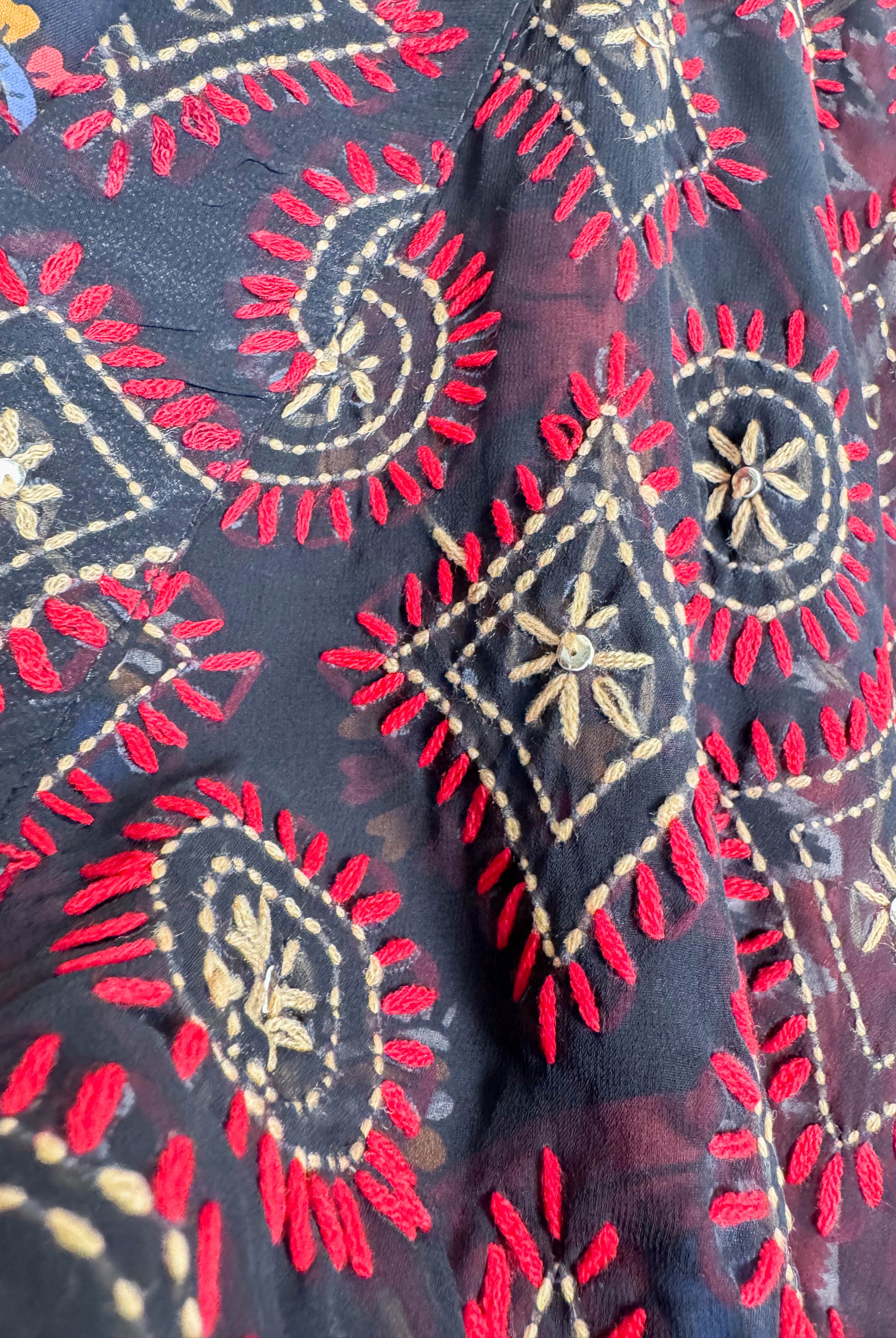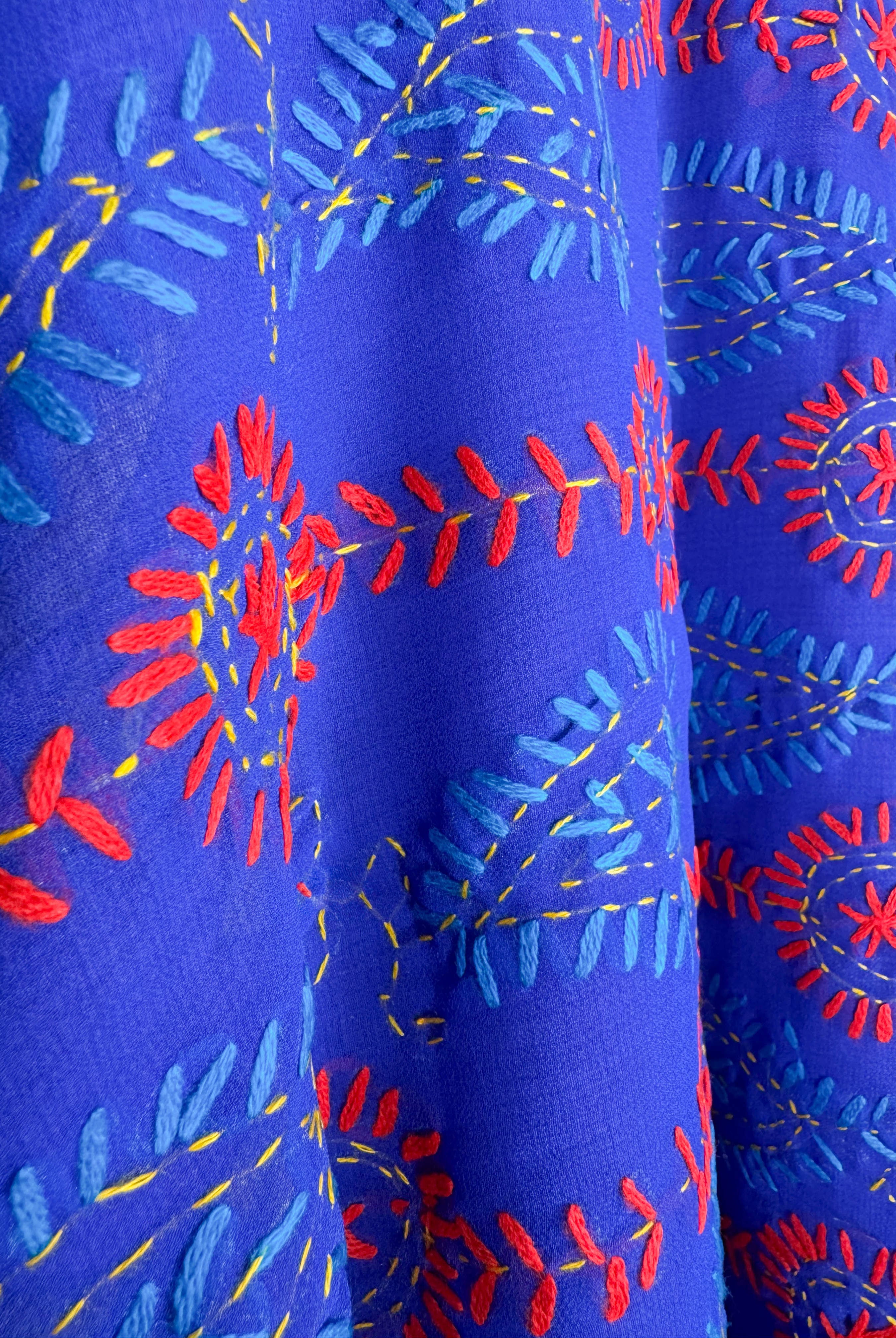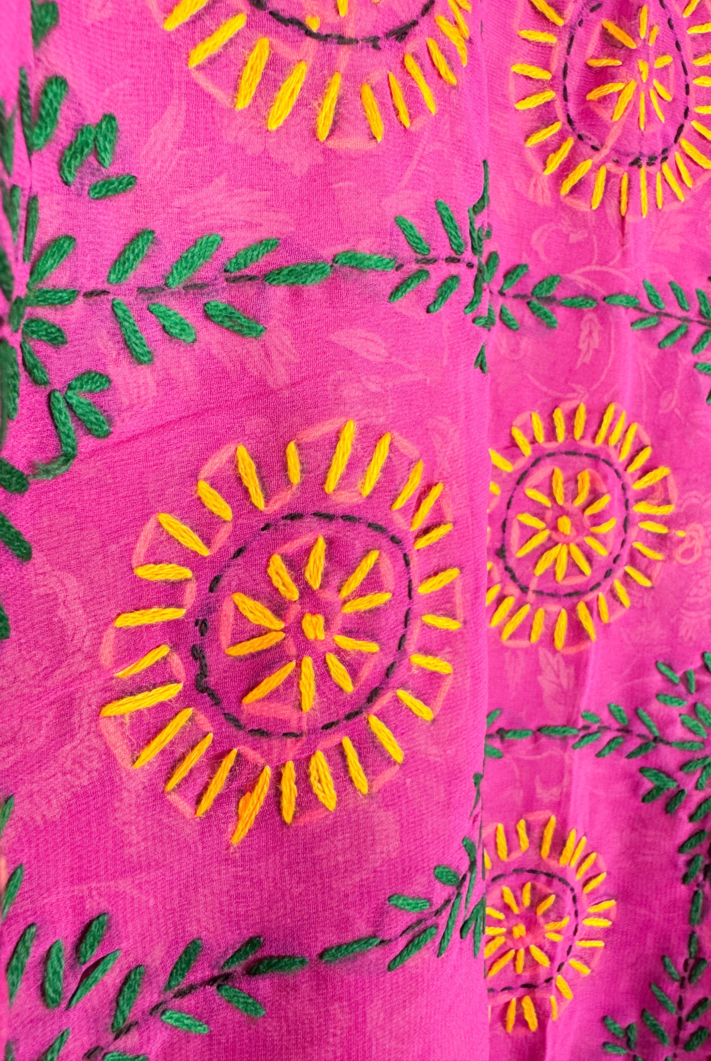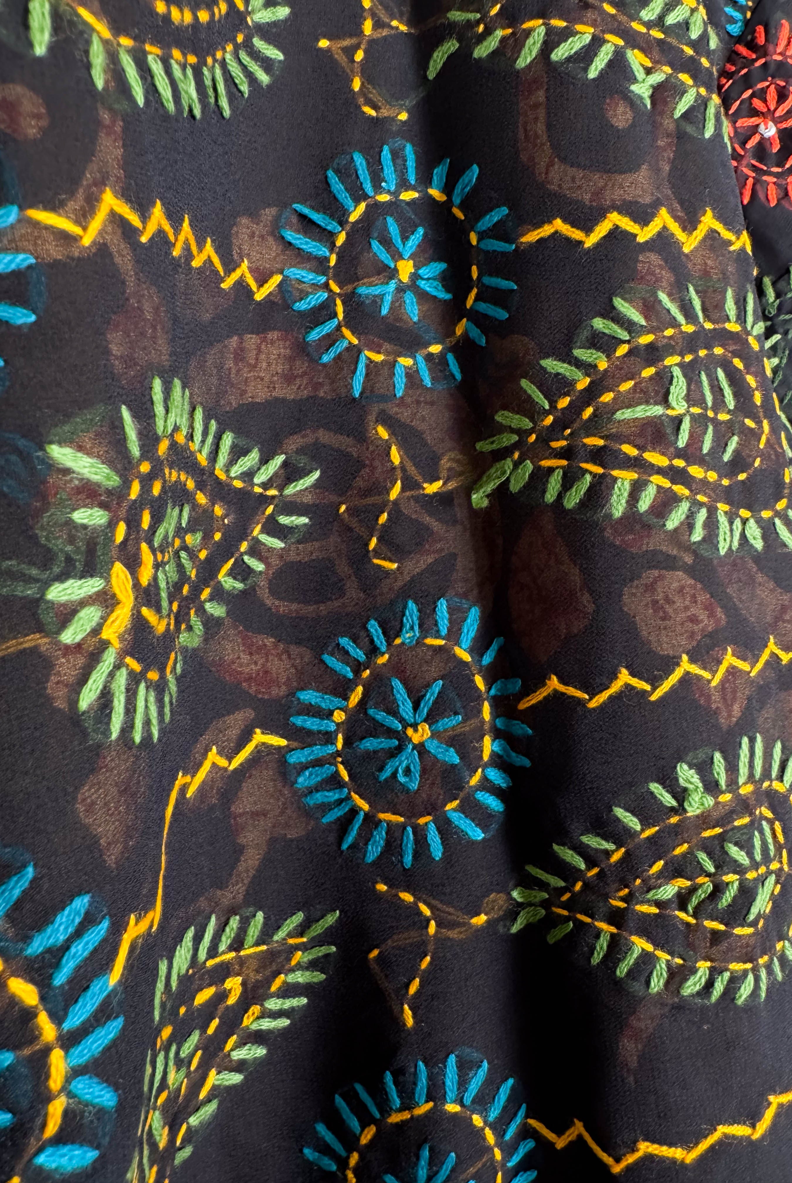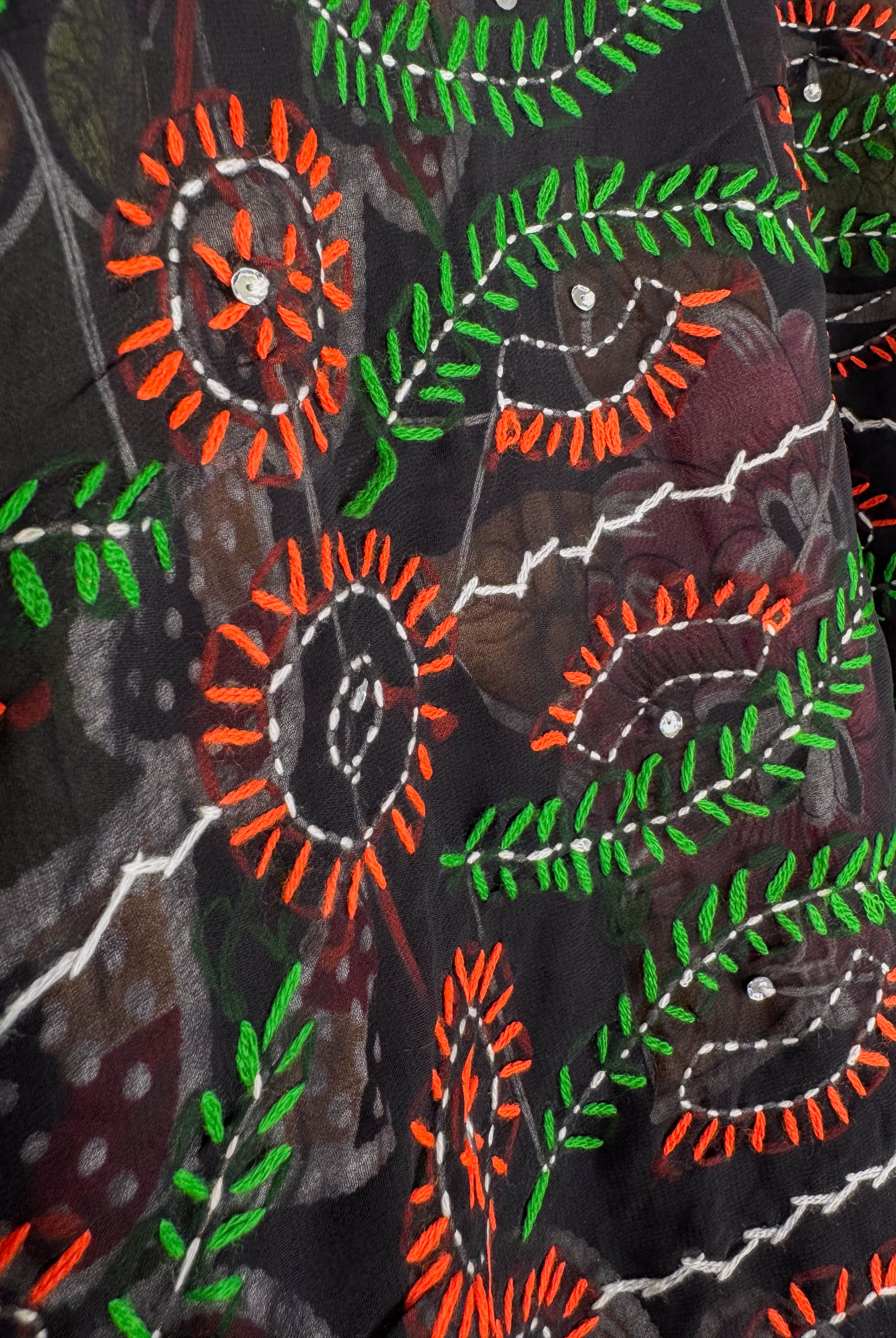 This handcrafted short Phulkari robe is a unique piece of wearable art, designed for daily elegance. Each hand-stitched floral motif, inspired by nature, creates a captivating texture and flow that flatters all body shapes and sizes. Lined with soft, vintage cotton, it offers a harmonious blend of traditional artistry and natural elements.