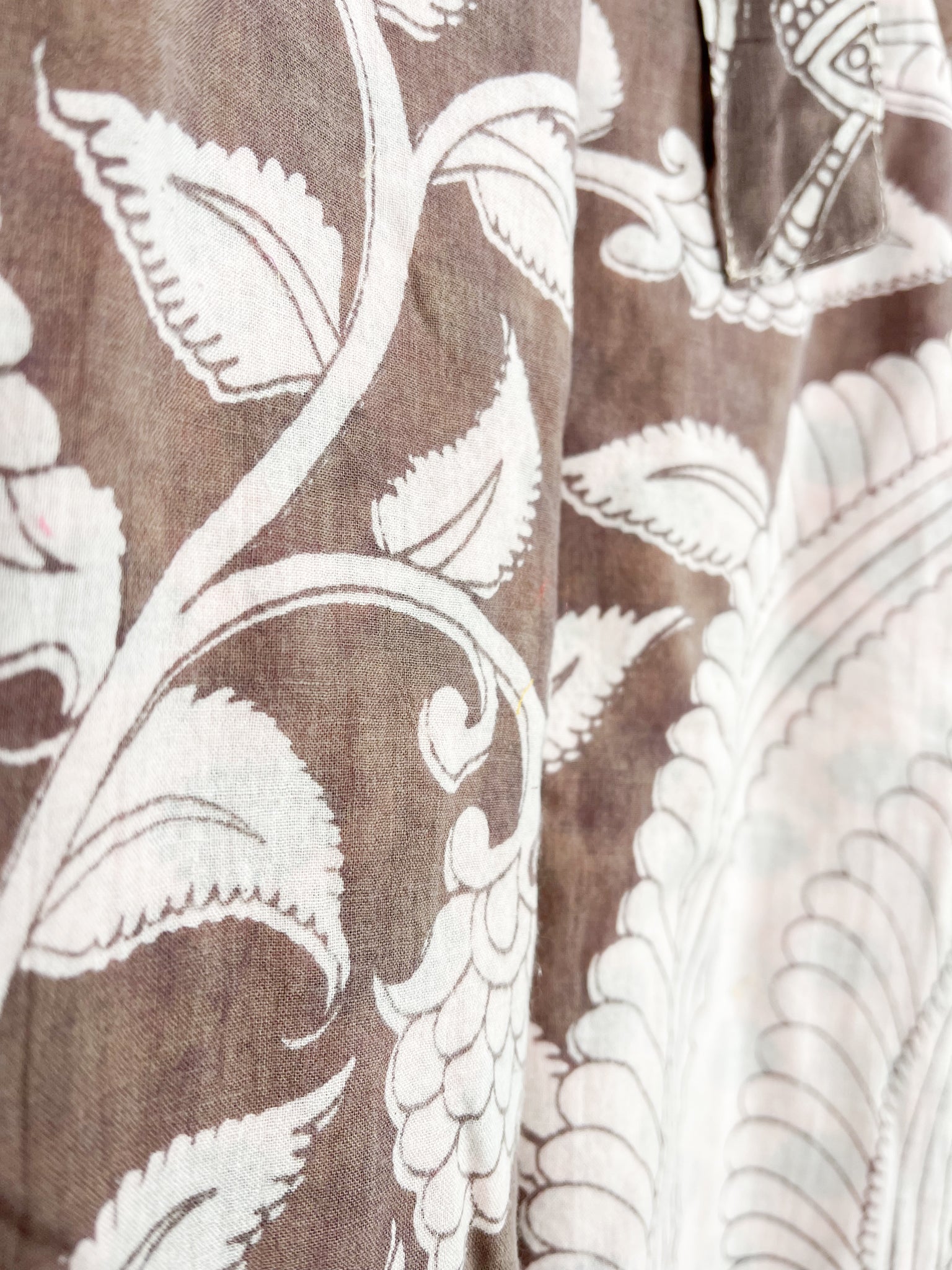 Made from vintage cotton sarees featuring traditional floral prints and vibrant hues, these pants are a celebration of timeless design. Their loose, flowing wide legs ensure ultimate comfort and freedom of movement, while the Adjustable front tie waistband with back-half elastic gives you control for desired fit.
