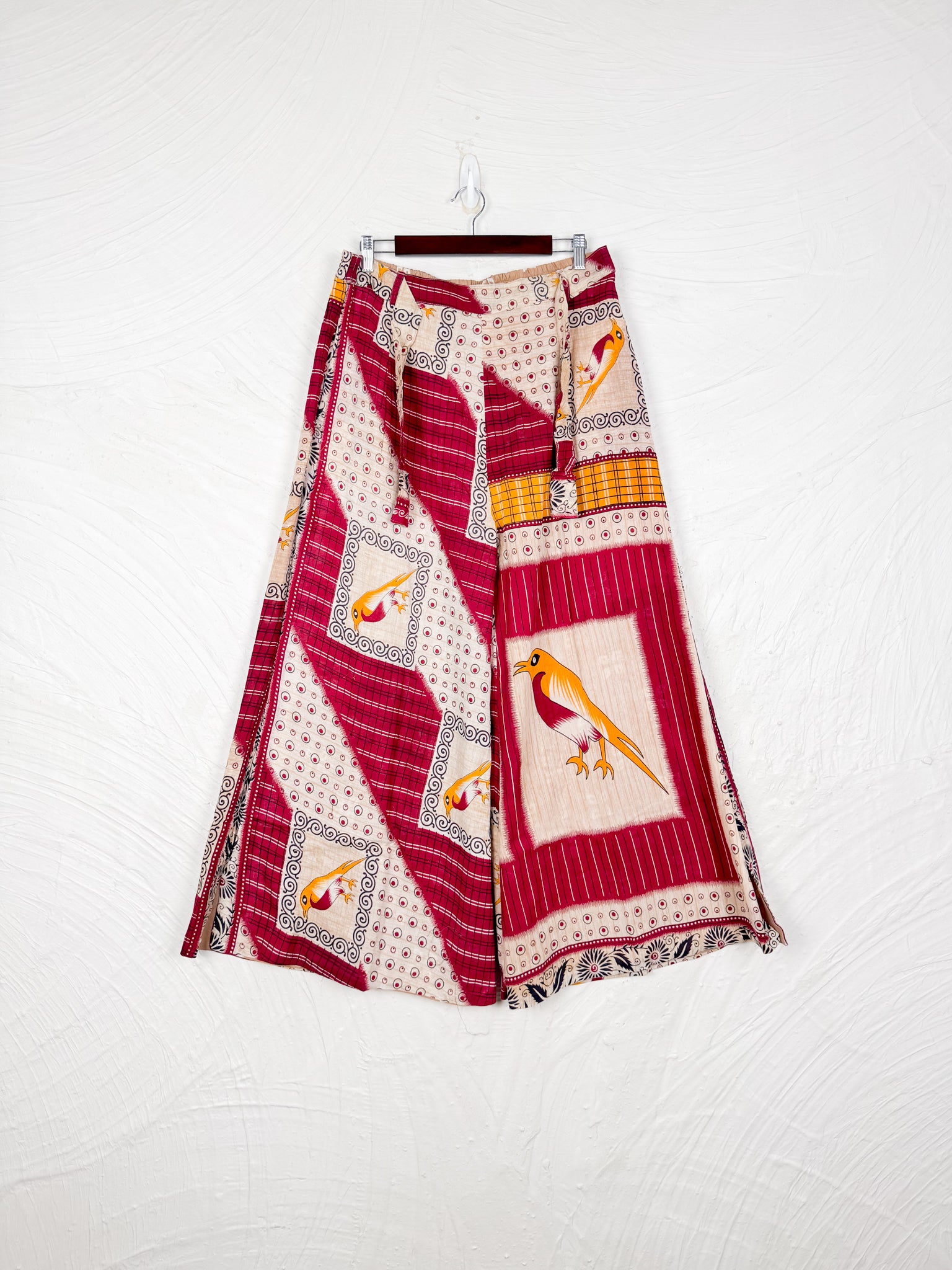 Made from vintage cotton sarees featuring traditional floral prints and vibrant hues, these pants are a celebration of timeless design. Their loose, flowing wide legs ensure ultimate comfort and freedom of movement, while the Adjustable front tie waistband with back-half elastic gives you control for desired fit.