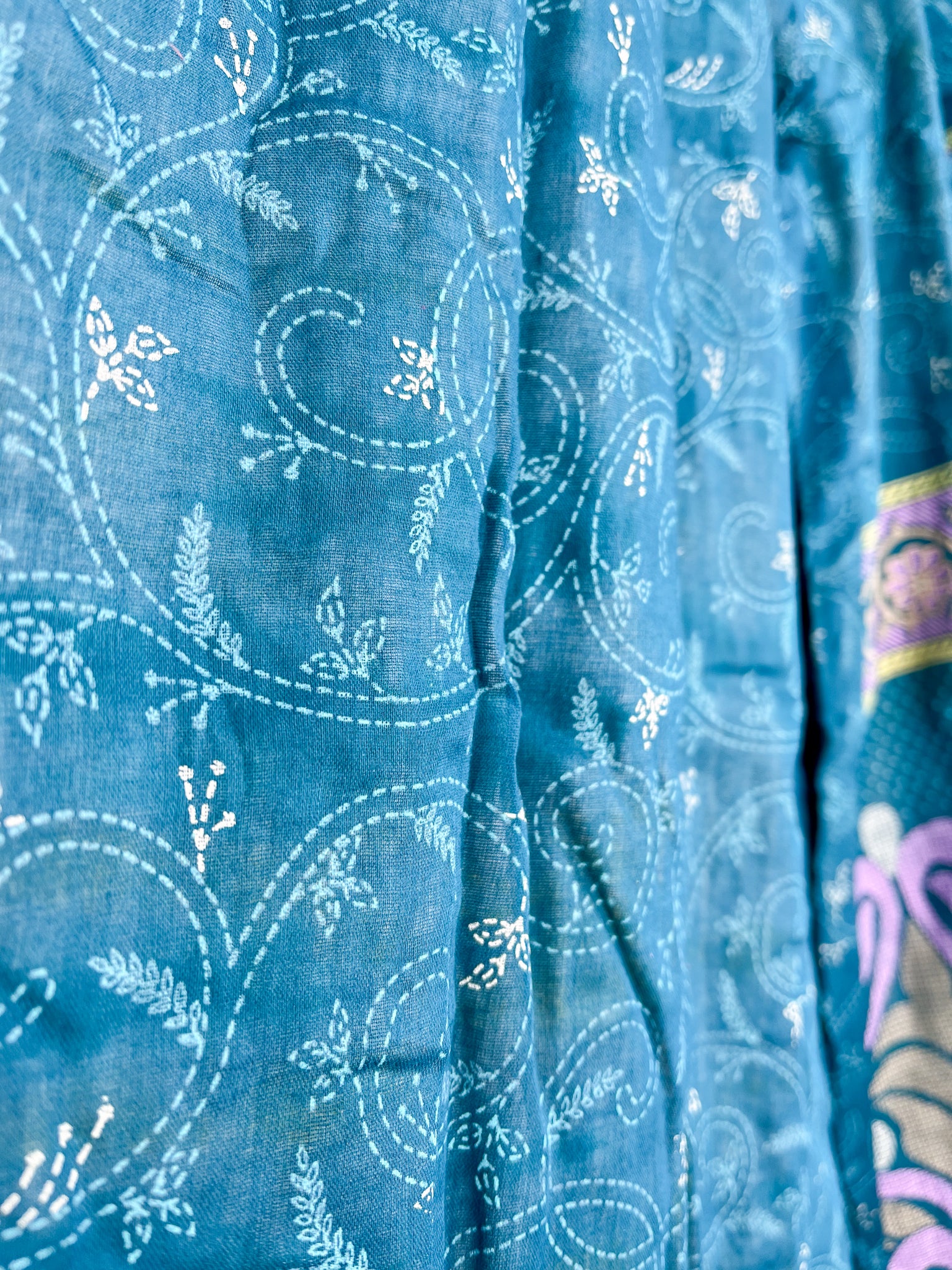Made from vintage cotton sarees featuring traditional floral prints and vibrant hues, these pants are a celebration of timeless design. Their loose, flowing wide legs ensure ultimate comfort and freedom of movement, while the Adjustable front tie waistband with back-half elastic gives you control for desired fit.