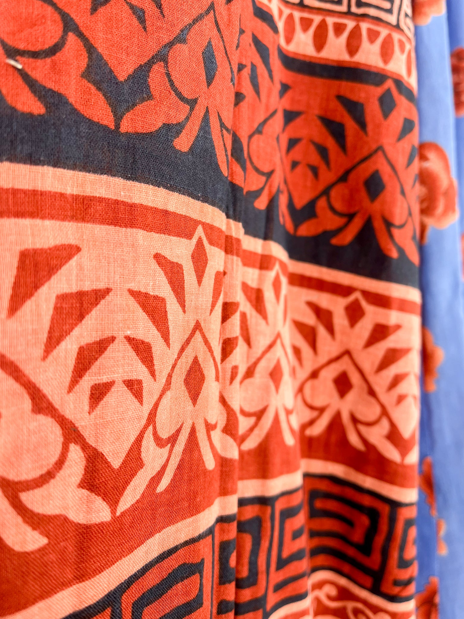 Made from vintage cotton sarees featuring traditional floral prints and vibrant hues, these pants are a celebration of timeless design. Their loose, flowing wide legs ensure ultimate comfort and freedom of movement, while the Adjustable front tie waistband with back-half elastic gives you control for desired fit.