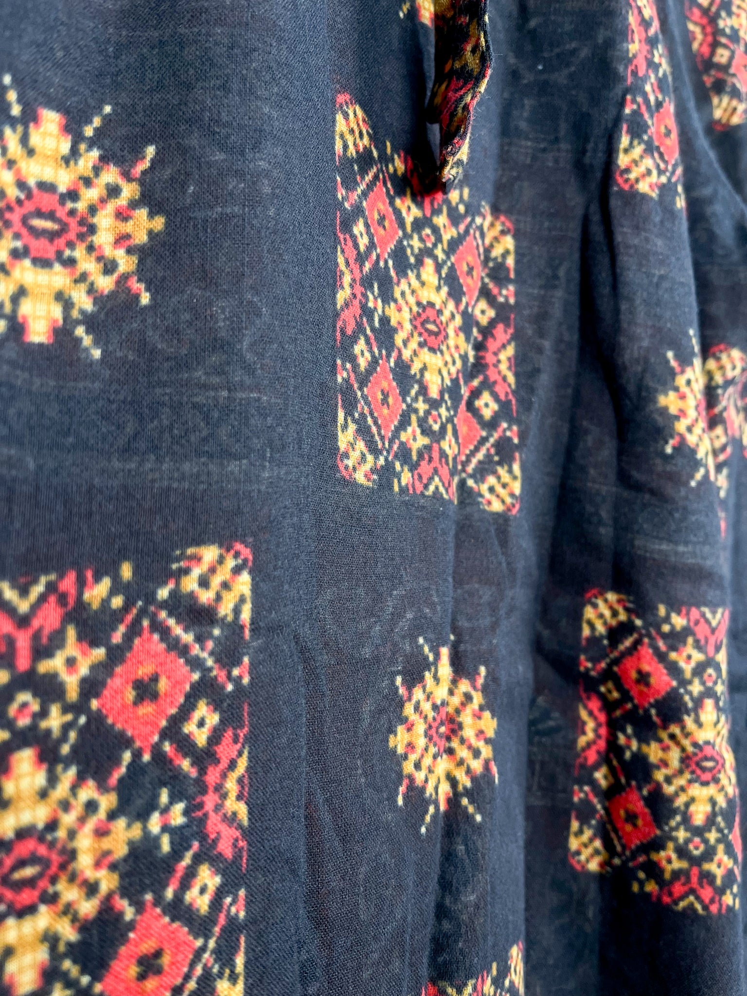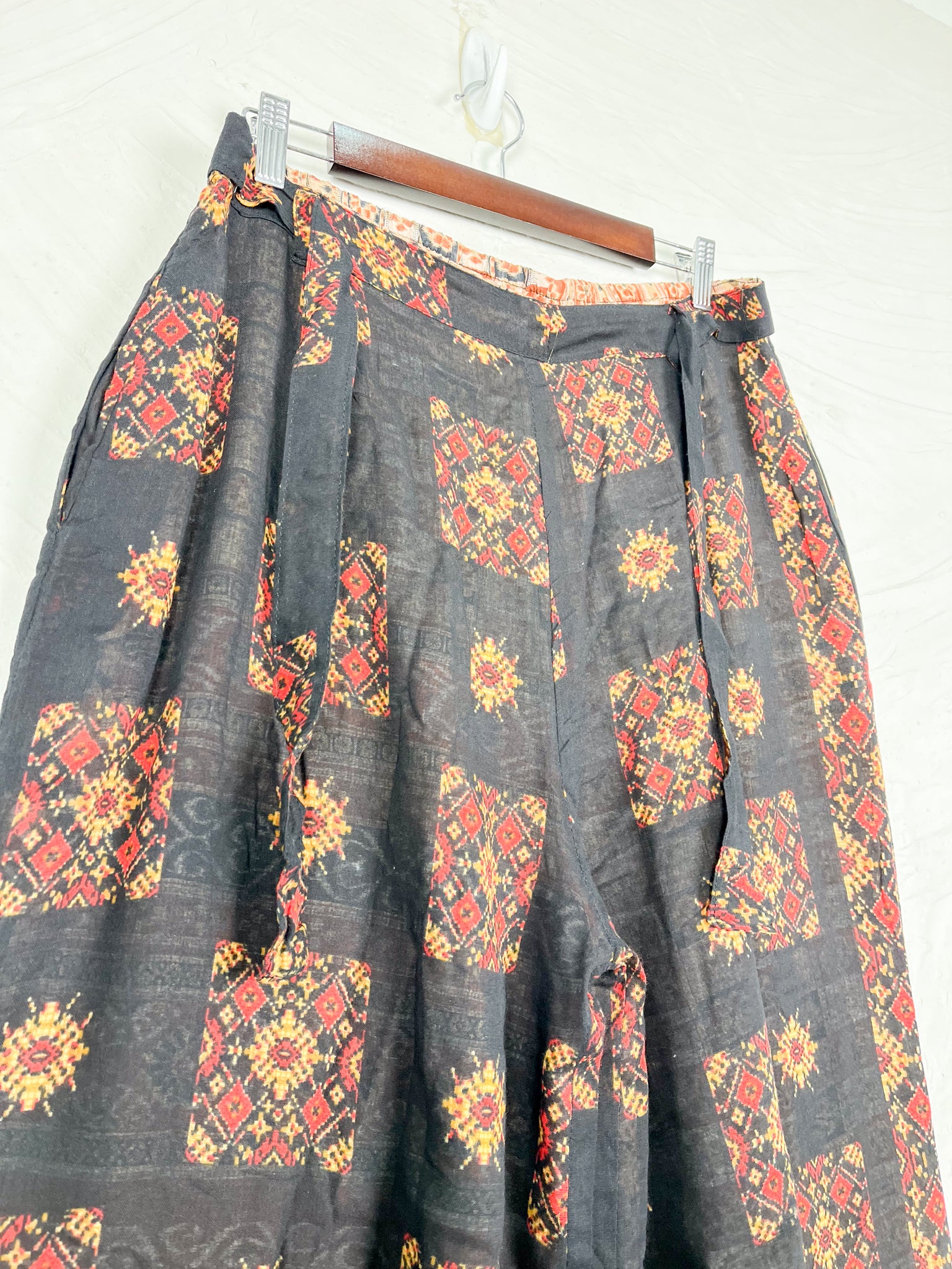 Made from vintage cotton sarees featuring traditional floral prints and vibrant hues, these pants are a celebration of timeless design. Their loose, flowing wide legs ensure ultimate comfort and freedom of movement, while the Adjustable front tie waistband with back-half elastic gives you control for desired fit.