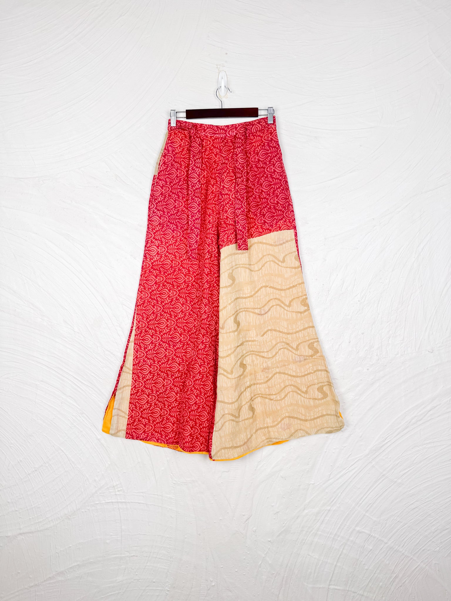 Made from vintage cotton sarees featuring traditional floral prints and vibrant hues, these pants are a celebration of timeless design. Their loose, flowing wide legs ensure ultimate comfort and freedom of movement, while the Adjustable front tie waistband with back-half elastic gives you control for desired fit.
