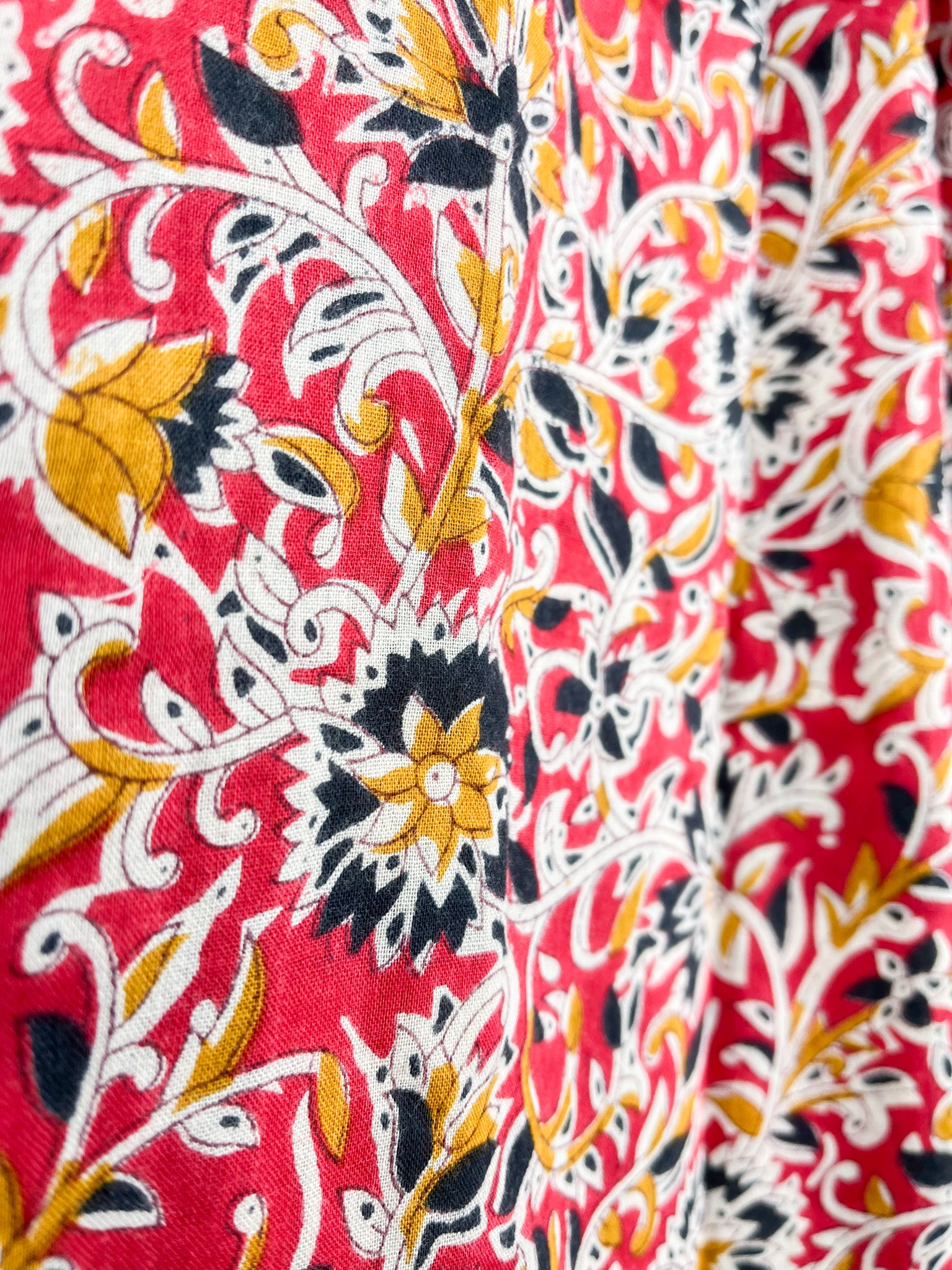 Made from vintage cotton sarees featuring traditional floral prints and vibrant hues, these pants are a celebration of timeless design. Their loose, flowing wide legs ensure ultimate comfort and freedom of movement, while the Adjustable front tie waistband with back-half elastic gives you control for desired fit.