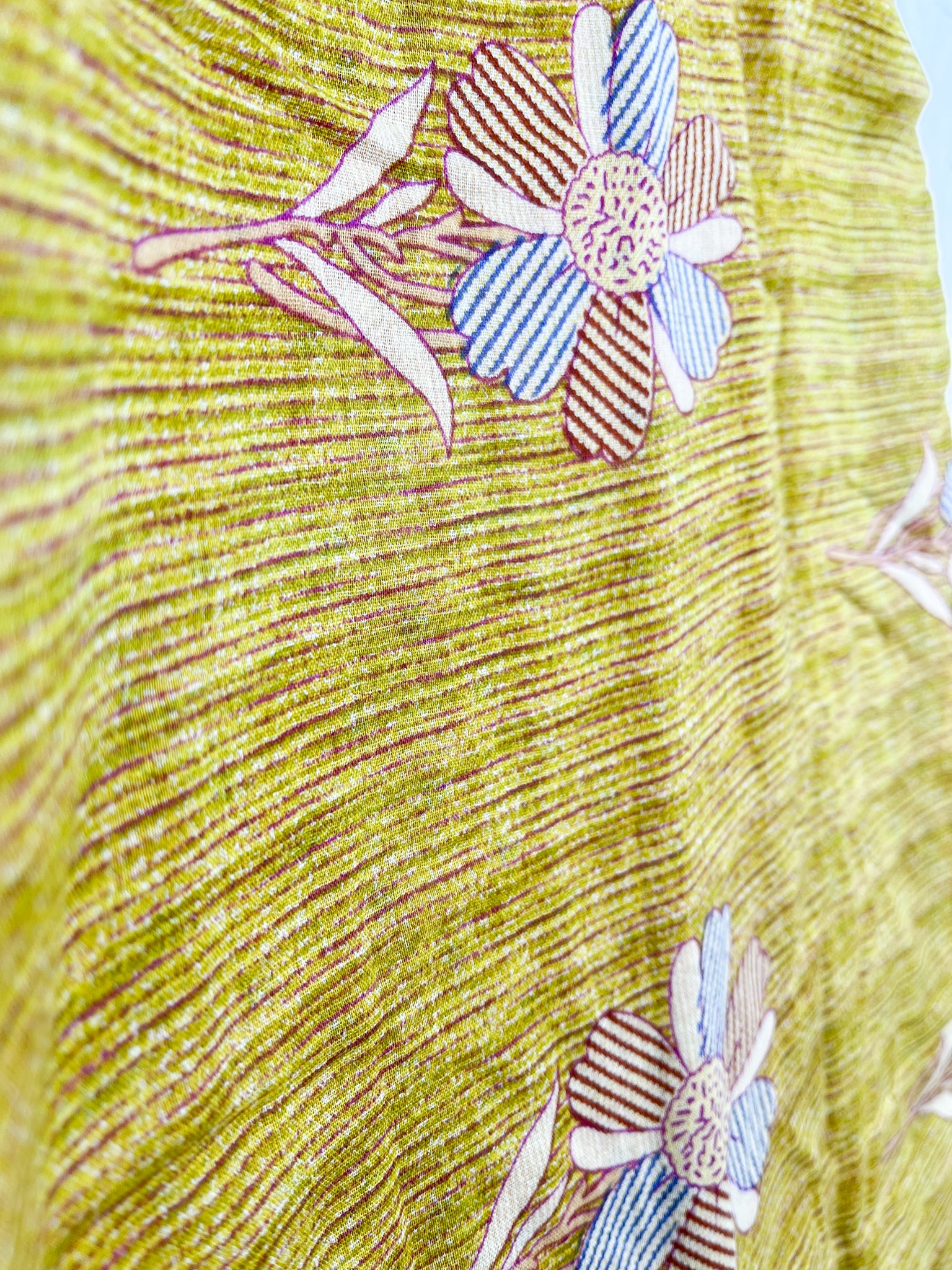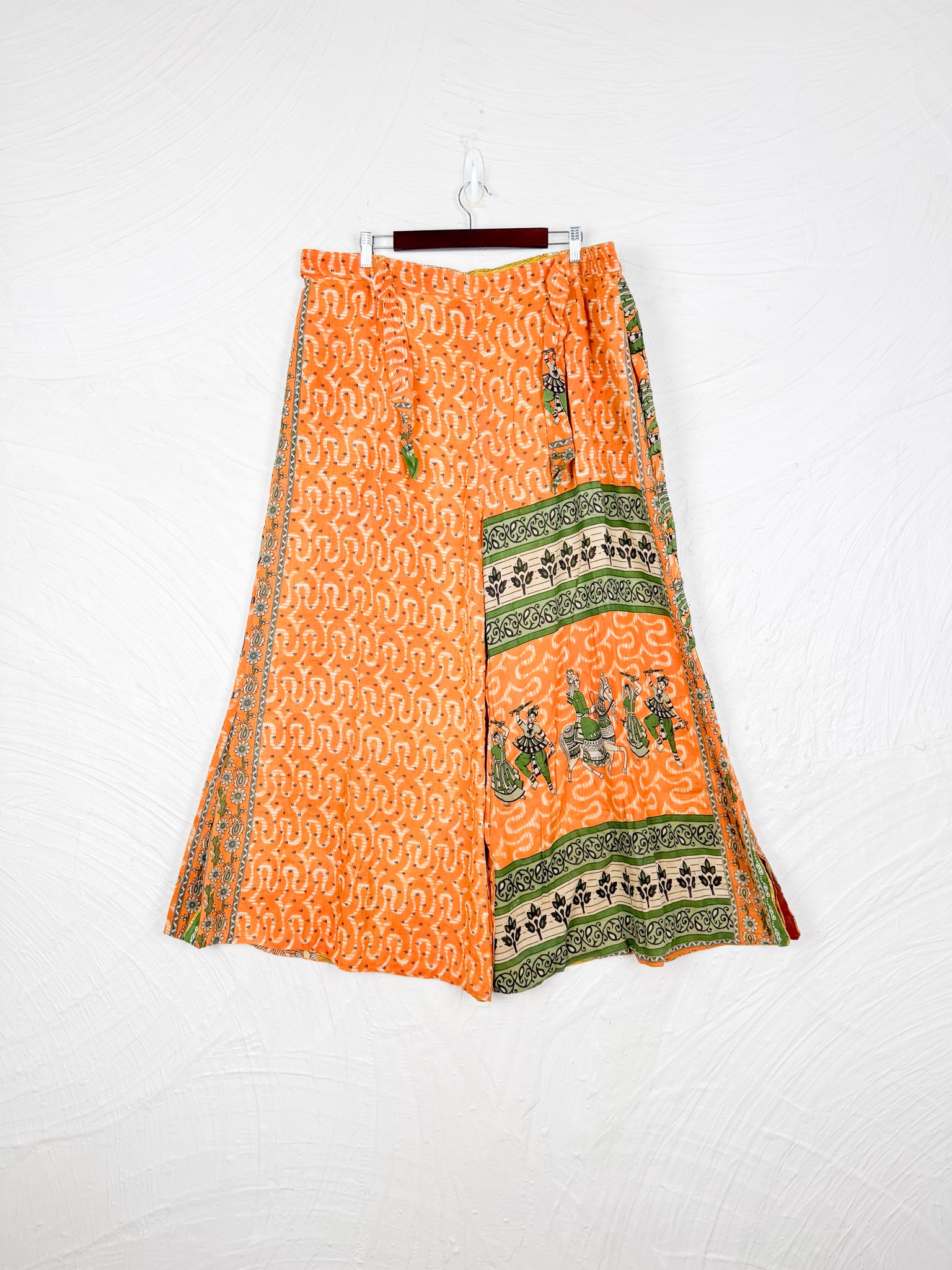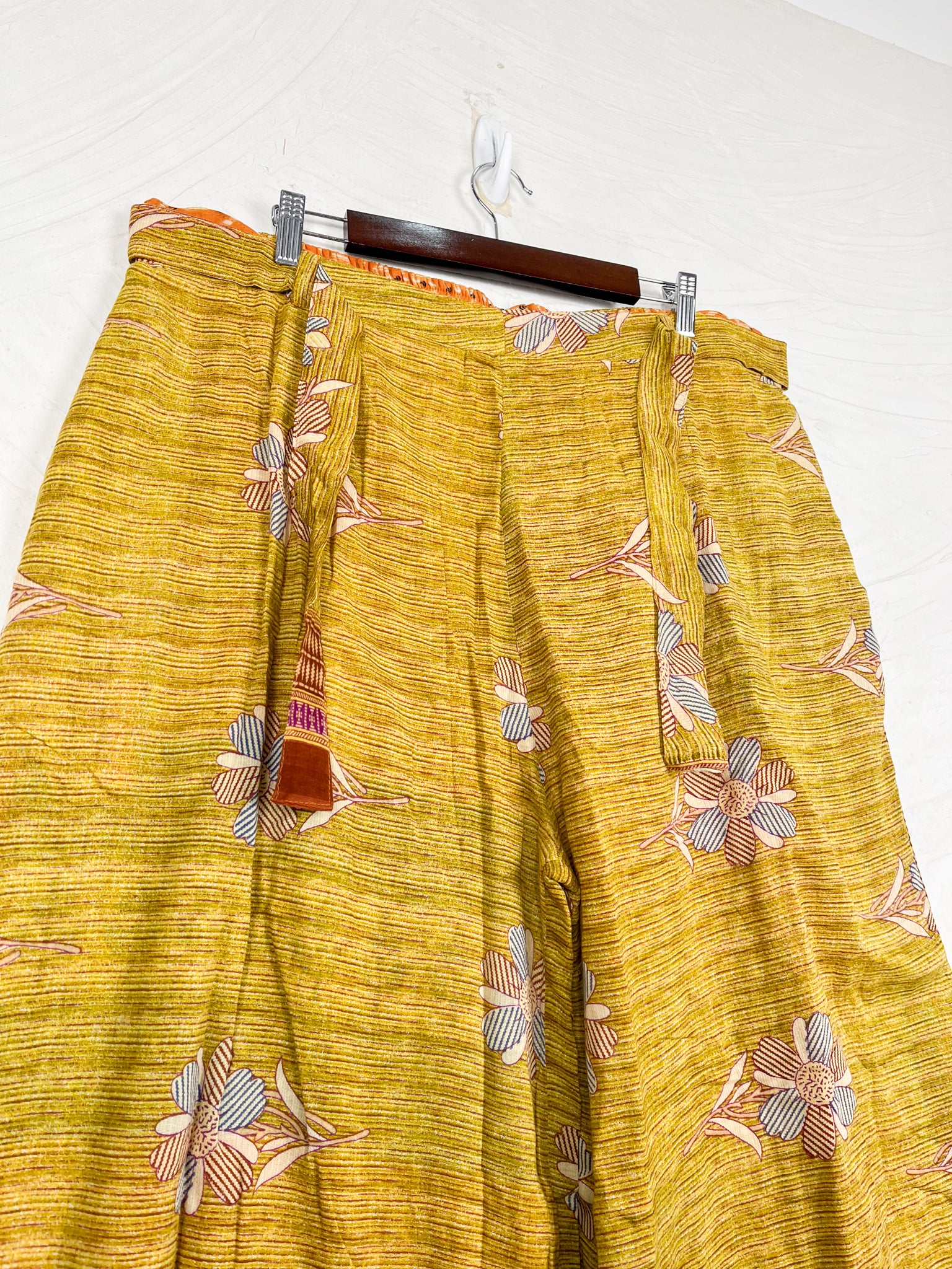 Made from vintage cotton sarees featuring traditional floral prints and vibrant hues, these pants are a celebration of timeless design. Their loose, flowing wide legs ensure ultimate comfort and freedom of movement, while the Adjustable front tie waistband with back-half elastic gives you control for desired fit.