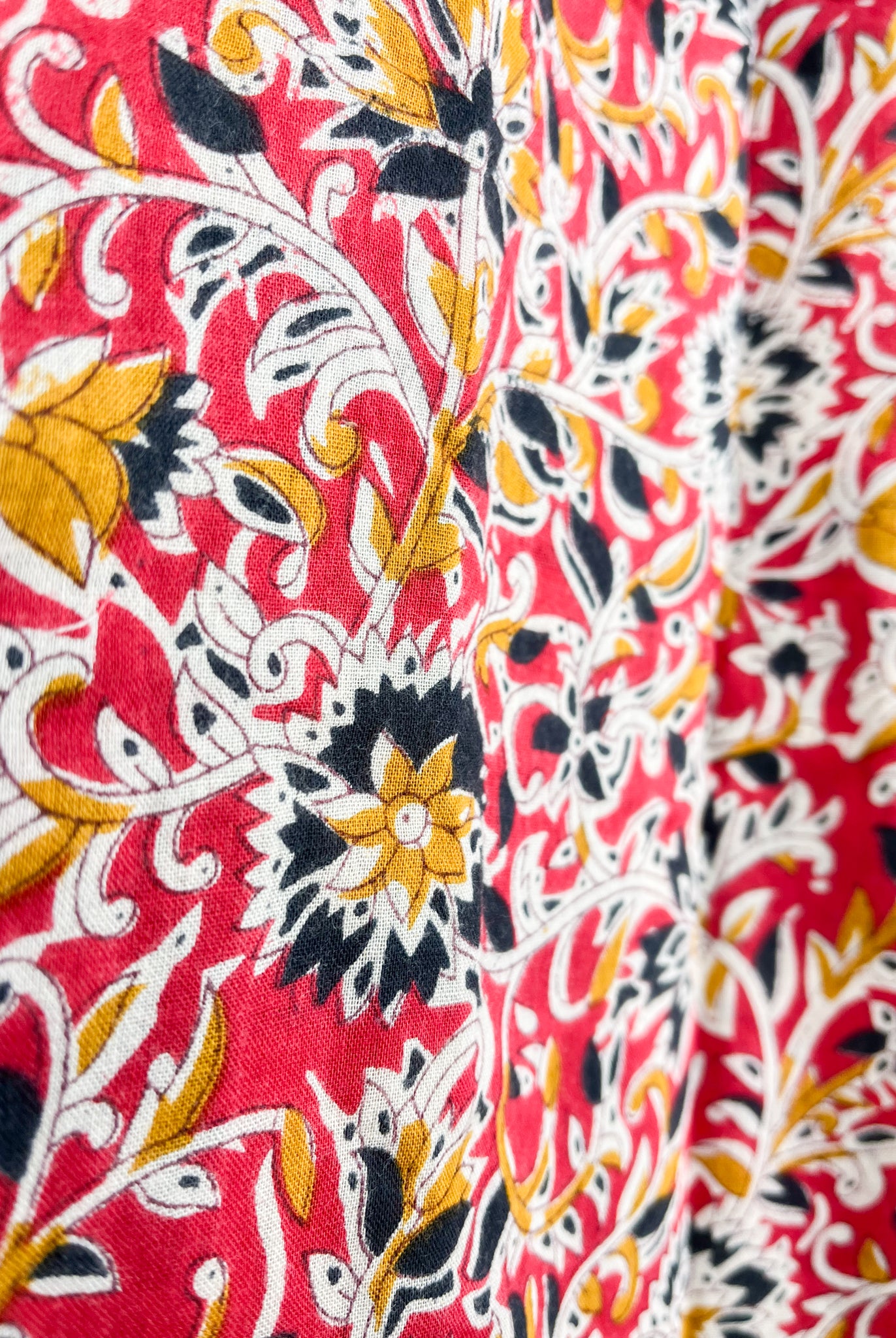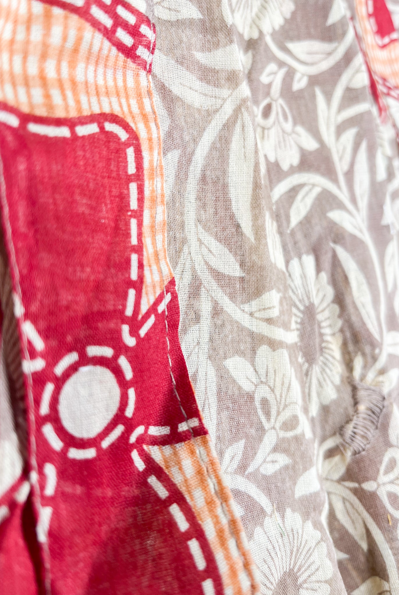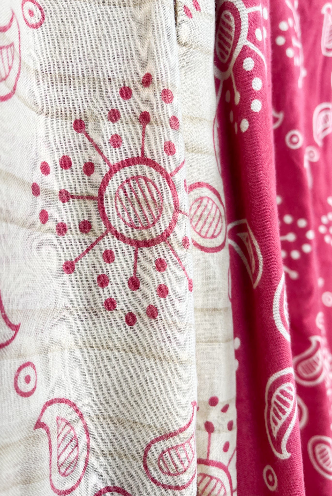 These unique reversible pants, crafted from vintage cotton sarees with vibrant traditional floral prints, offer two distinct looks. Their loose, flowing wide legs provide ultimate comfort and freedom, while an adjustable tie waistband ensures a perfect fit, making them a versatile addition for any occasion.