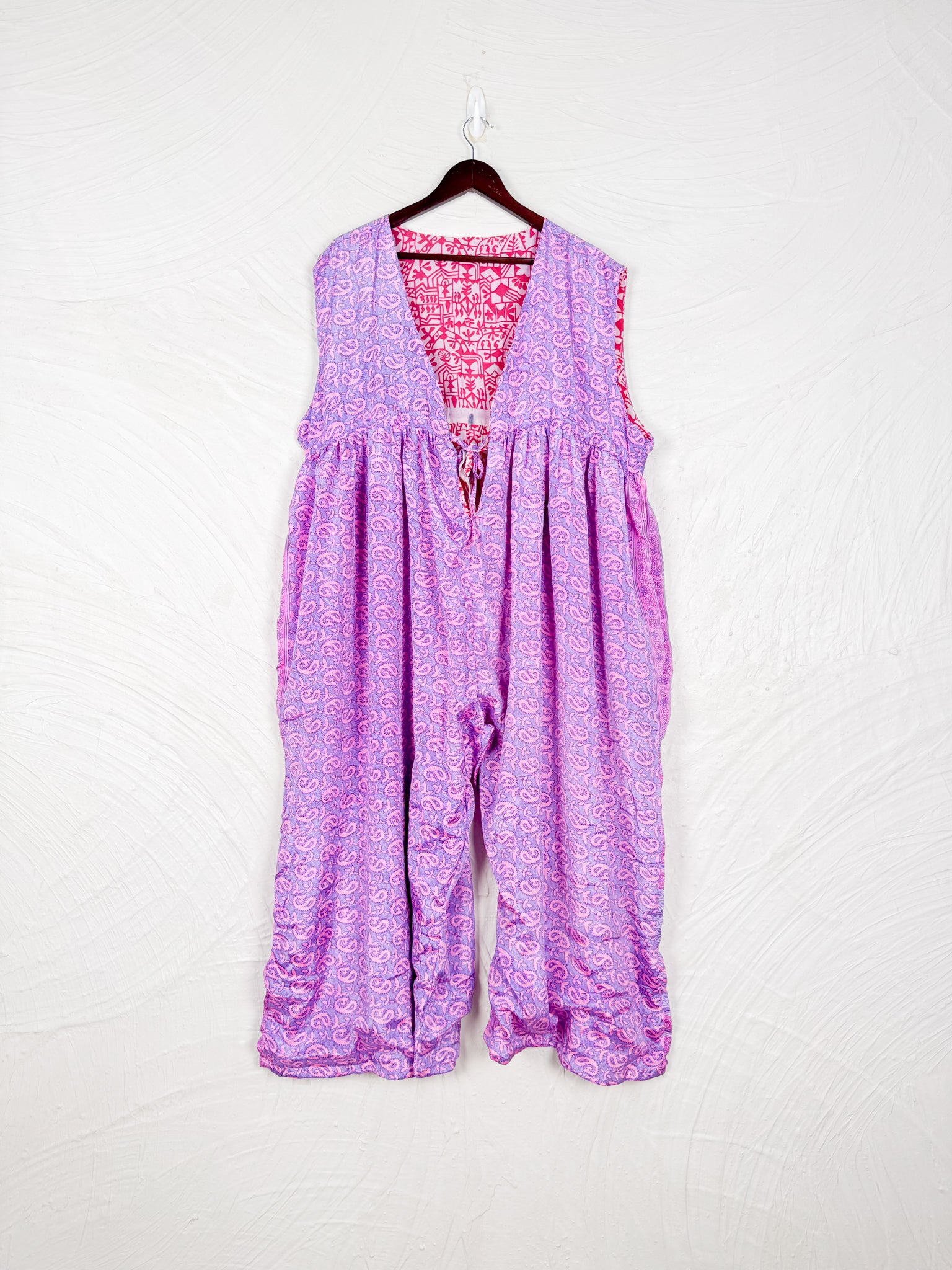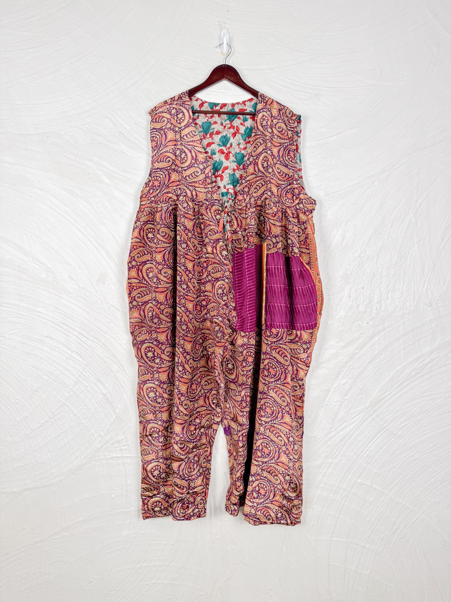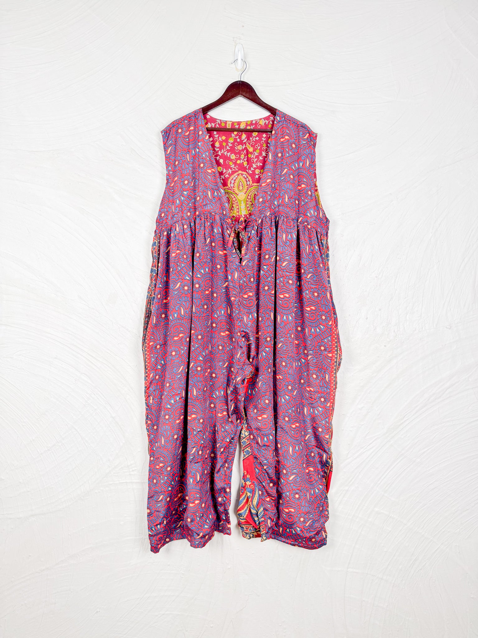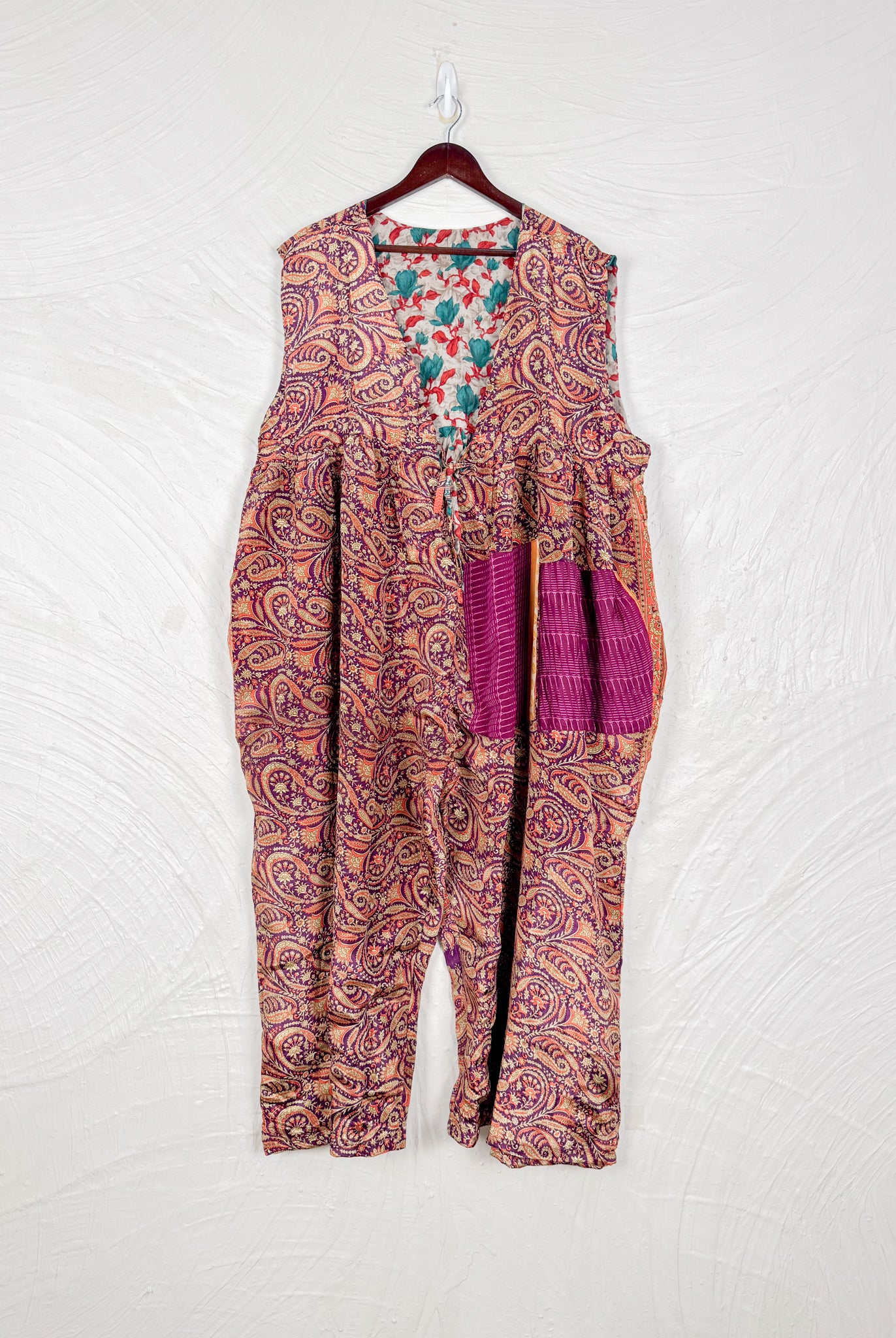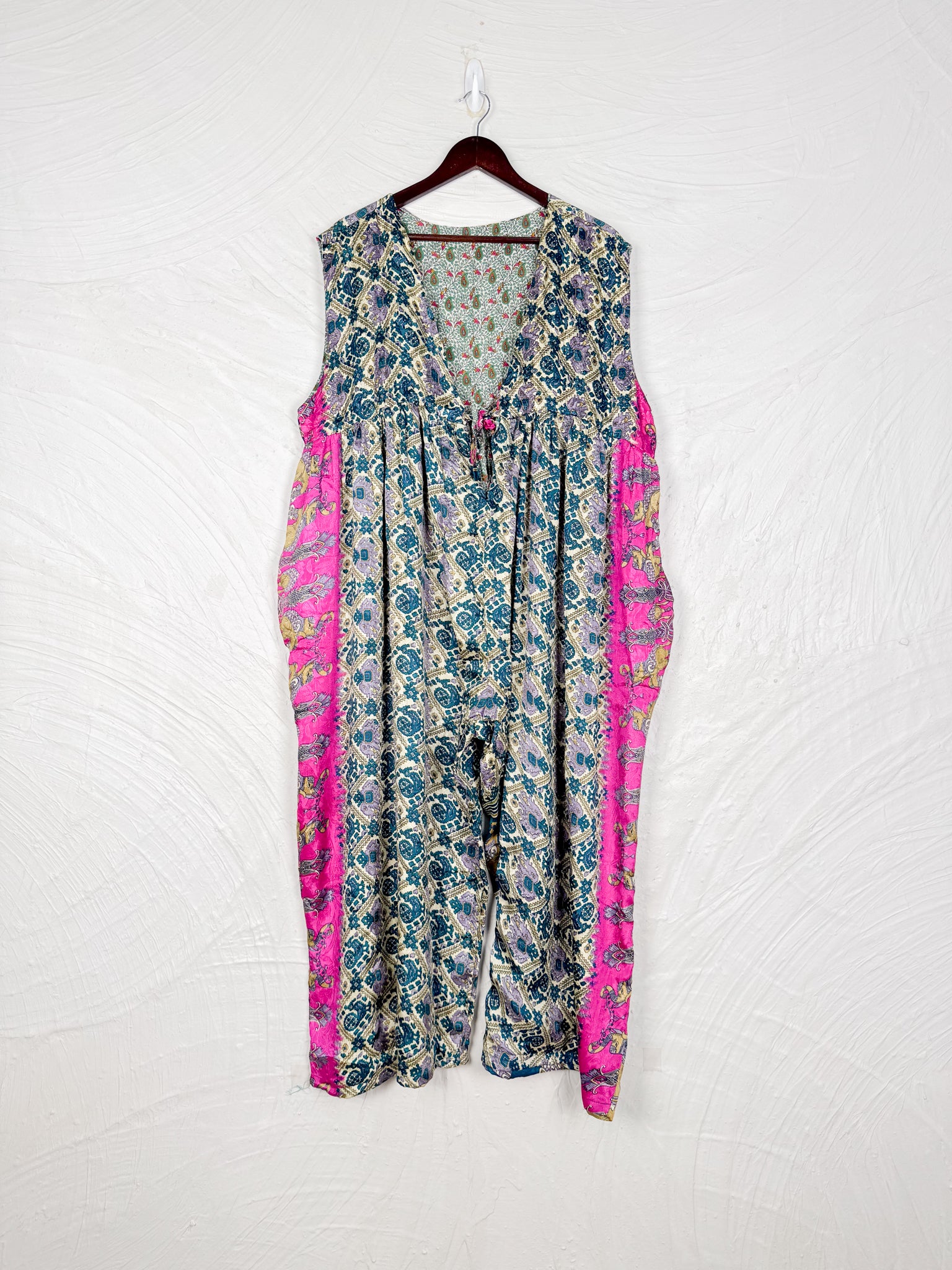 This reversible silk jumpsuit offers two distinct personalities: one side in vibrant, intricately patterned vintage Indian saree fabric, and the other in flowing, elegant silk. Its flattering V-neck, delicate ties, gathered waist, and wide, cropped legs provide ultimate comfort and breathability, making it a versatile piece of wearable art.
