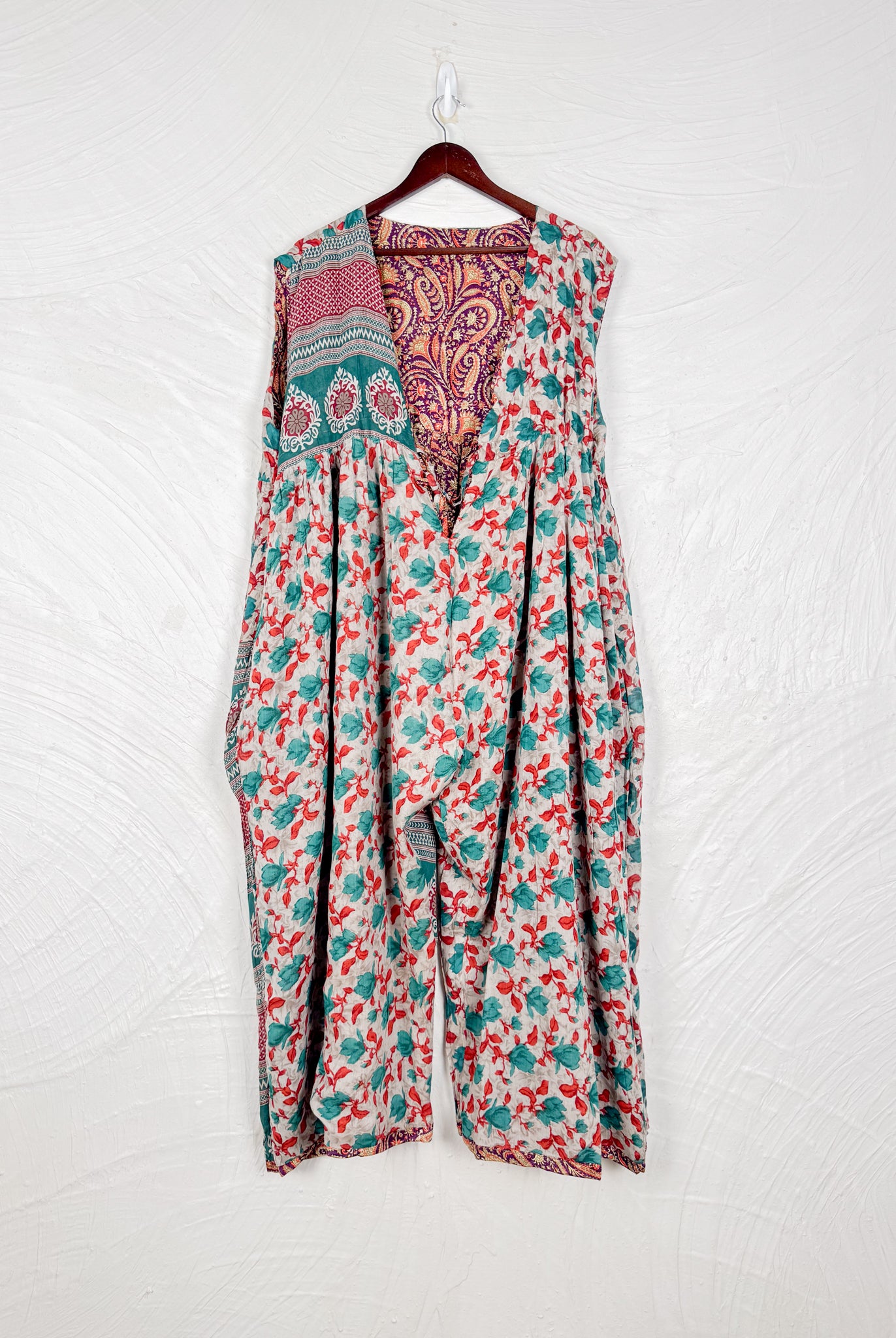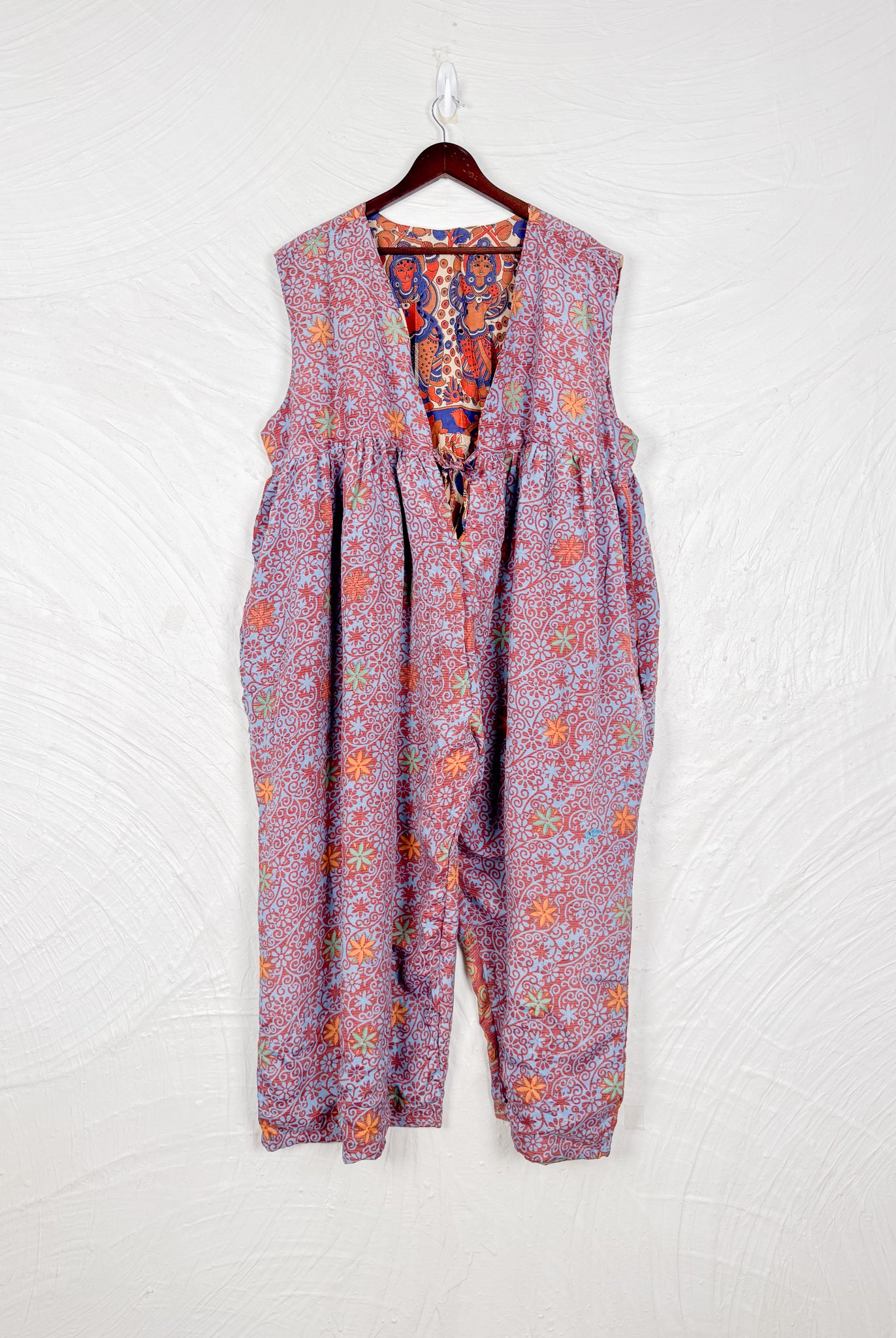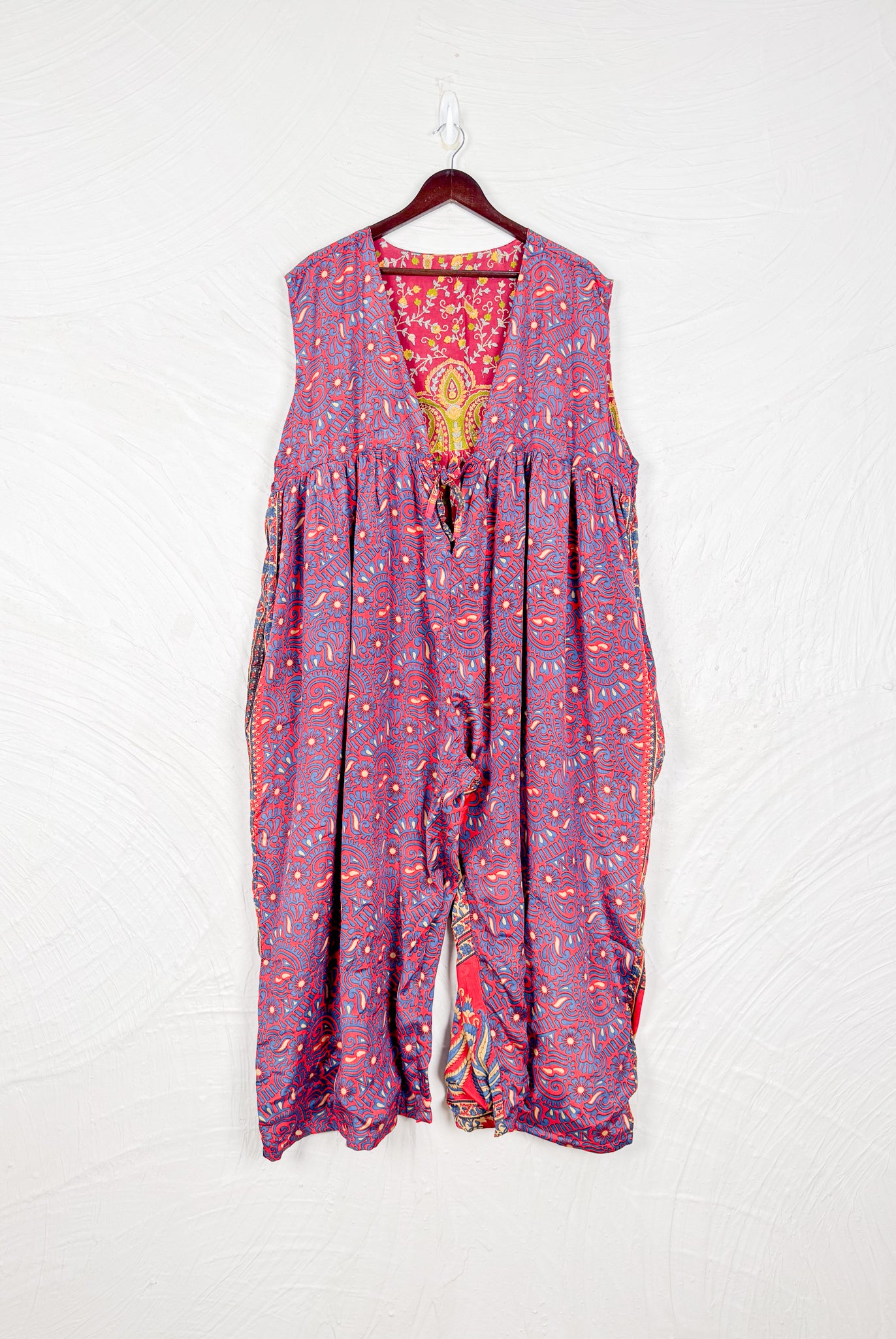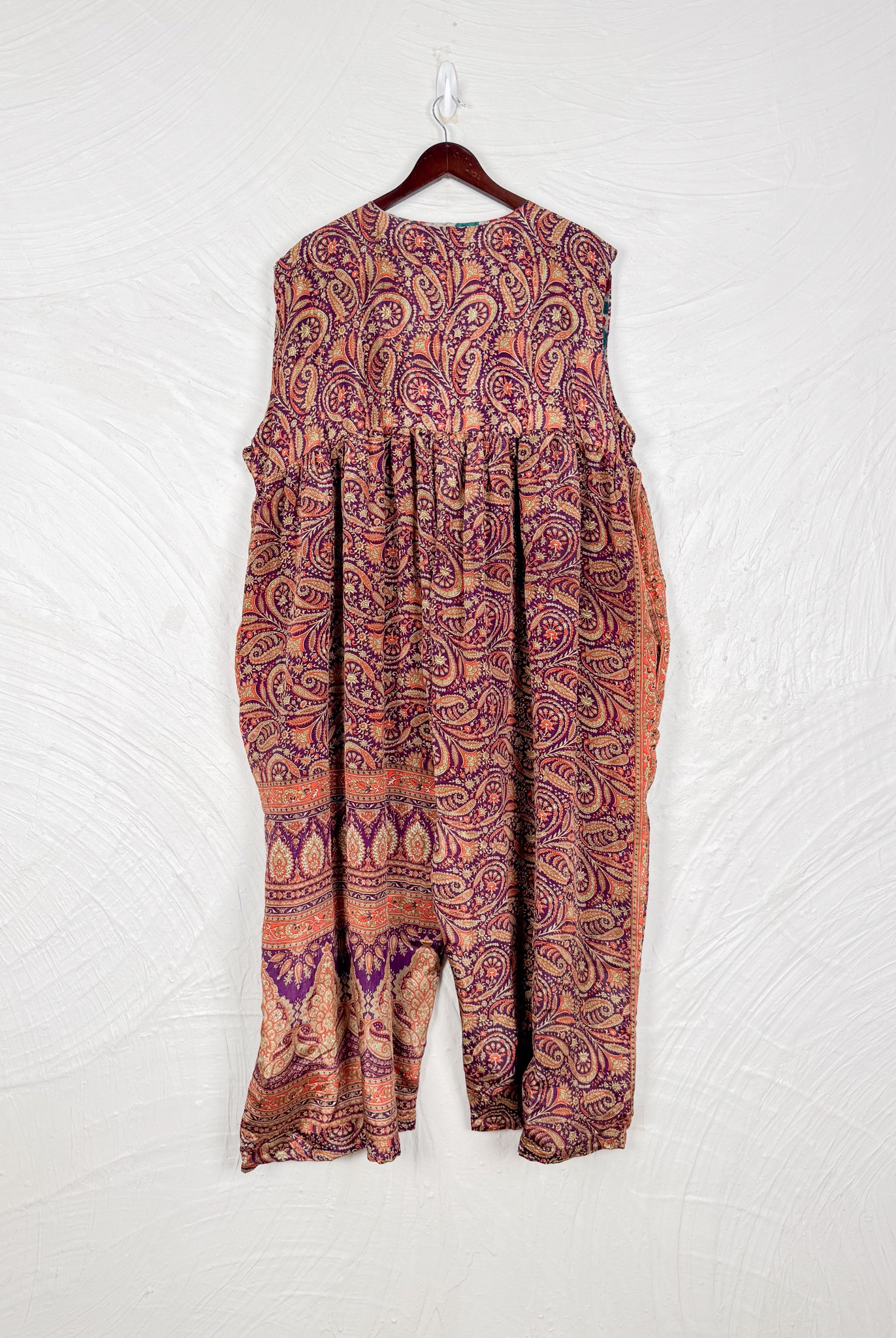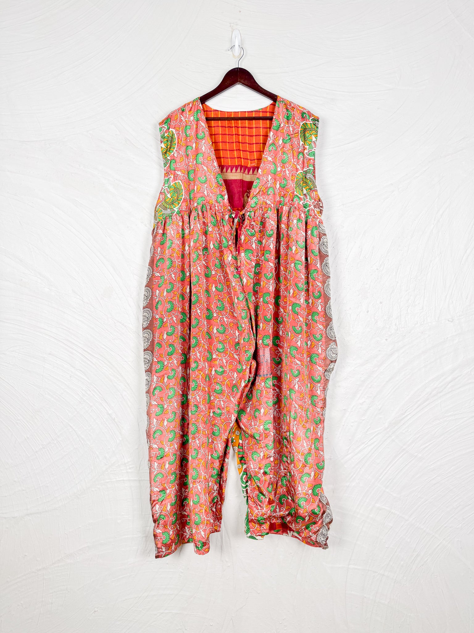 This reversible silk jumpsuit offers two distinct personalities: one side in vibrant, intricately patterned vintage Indian saree fabric, and the other in flowing, elegant silk. Its flattering V-neck, delicate ties, gathered waist, and wide, cropped legs provide ultimate comfort and breathability, making it a versatile piece of wearable art.