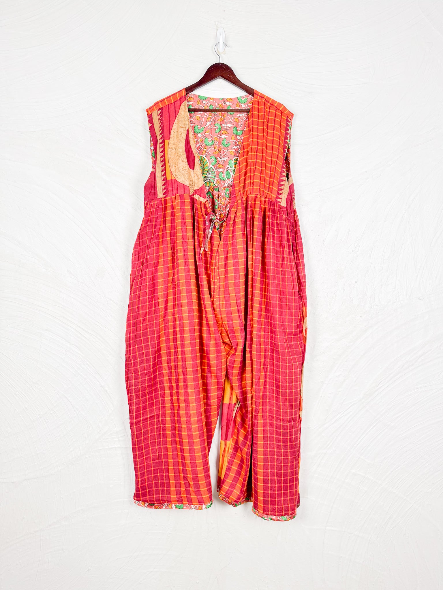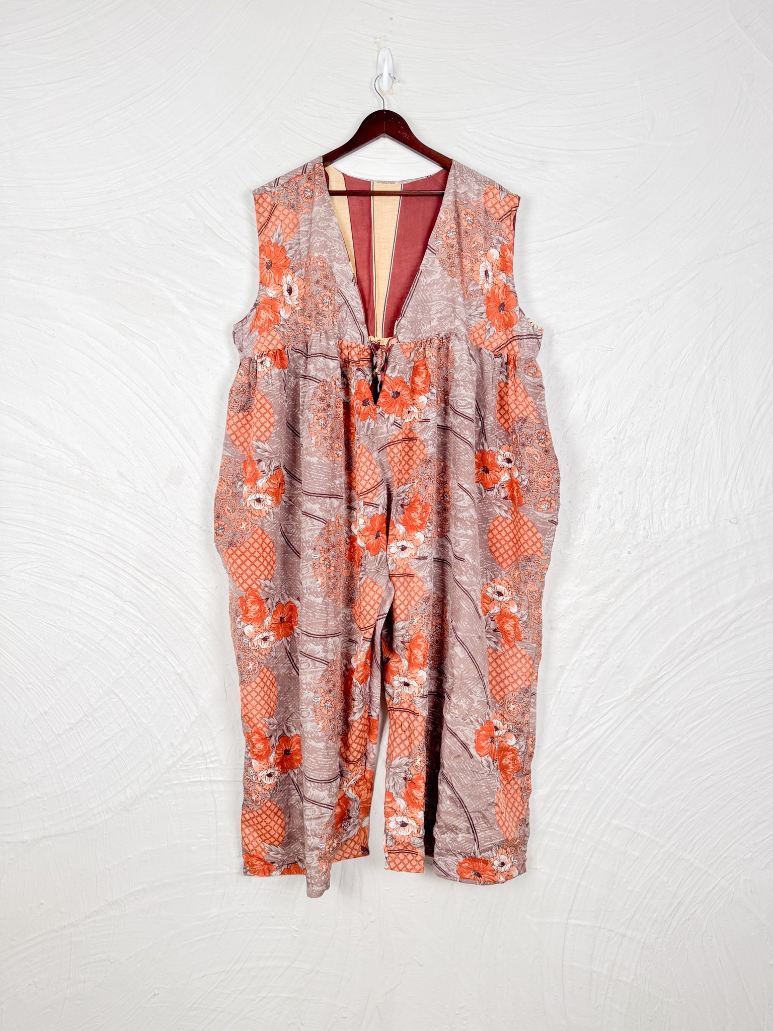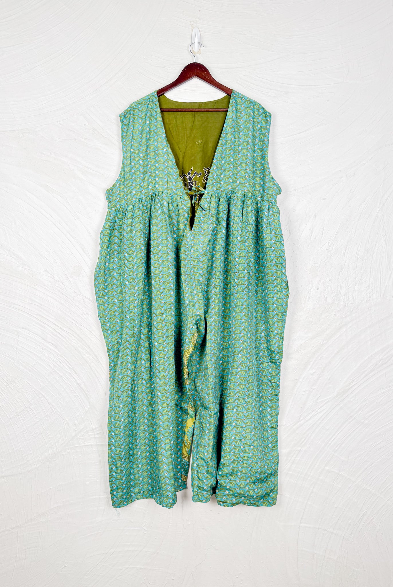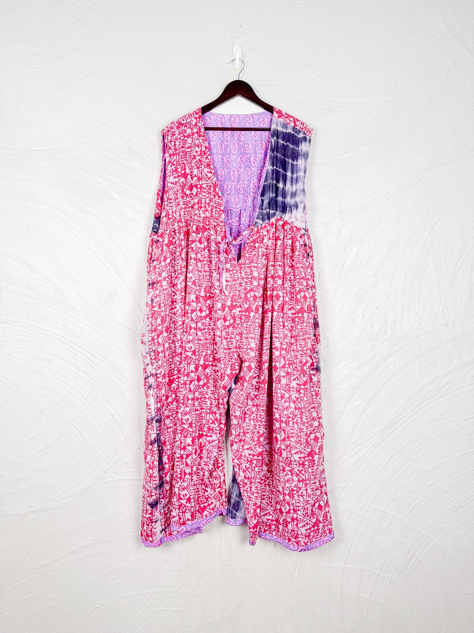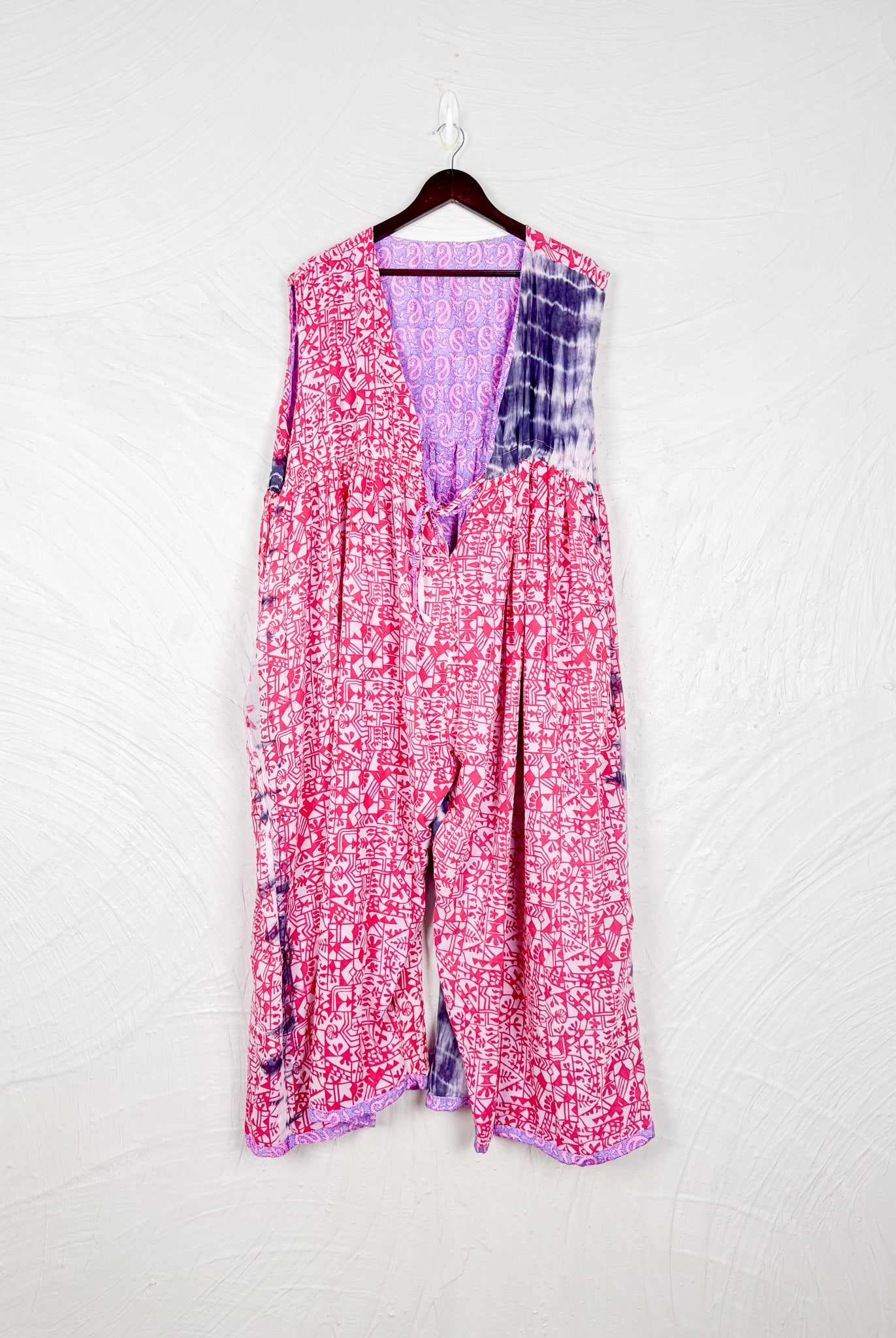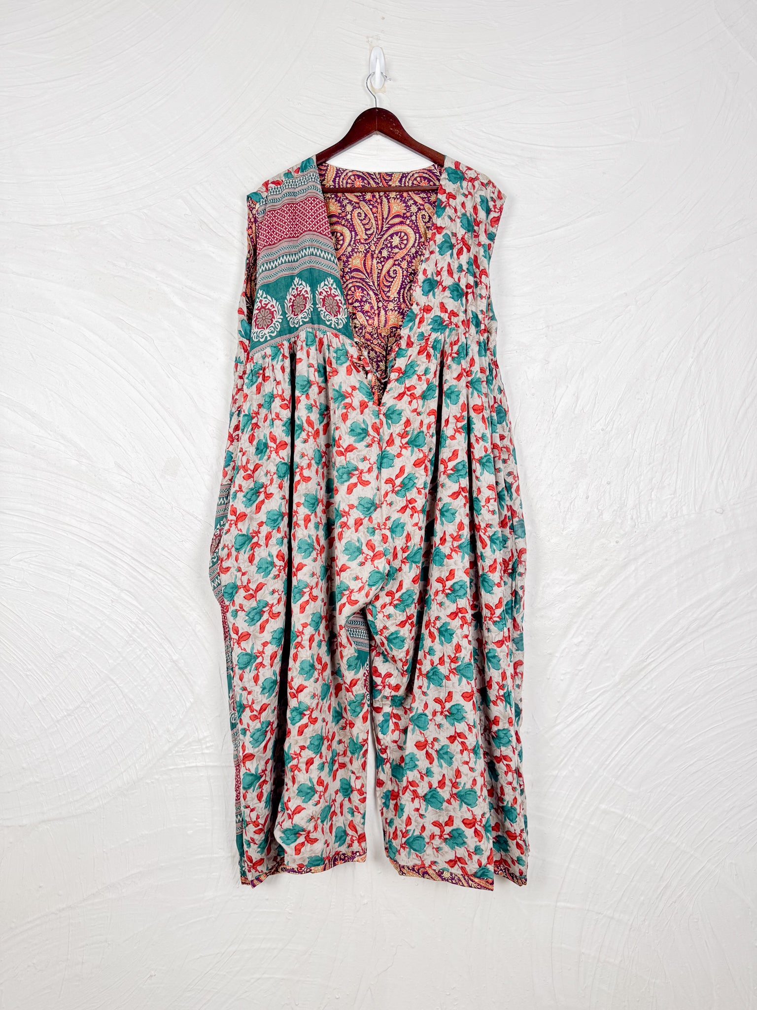 This reversible silk jumpsuit offers two distinct personalities: one side in vibrant, intricately patterned vintage Indian saree fabric, and the other in flowing, elegant silk. Its flattering V-neck, delicate ties, gathered waist, and wide, cropped legs provide ultimate comfort and breathability, making it a versatile piece of wearable art.