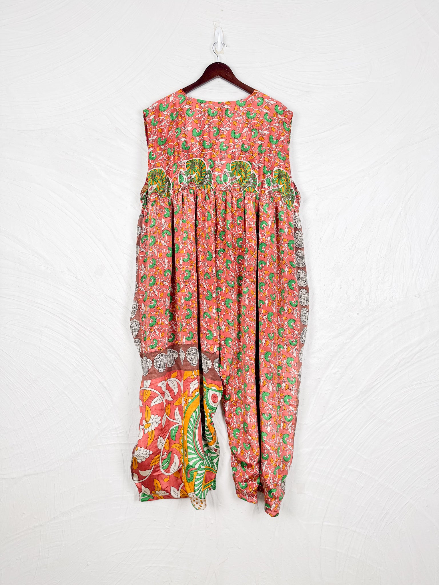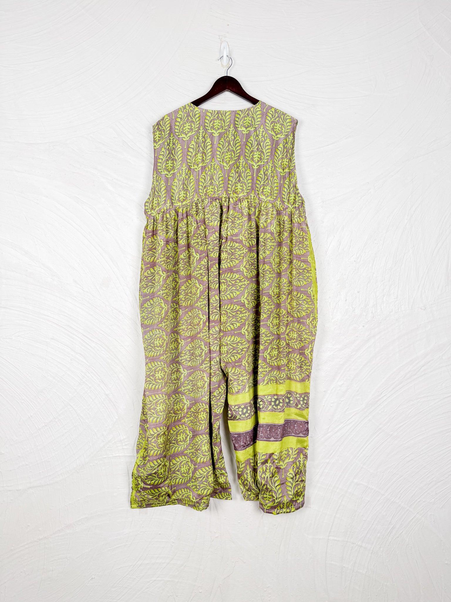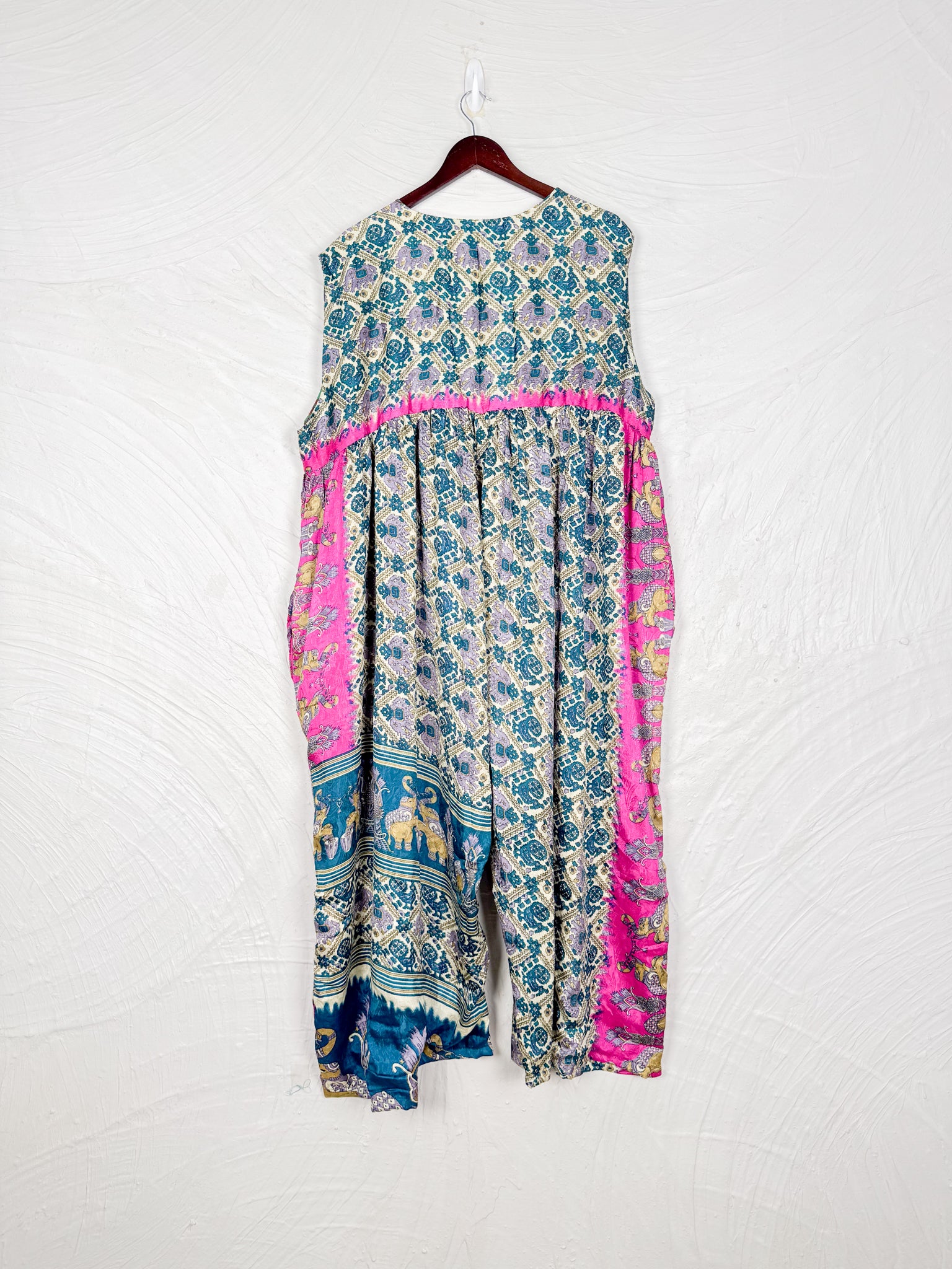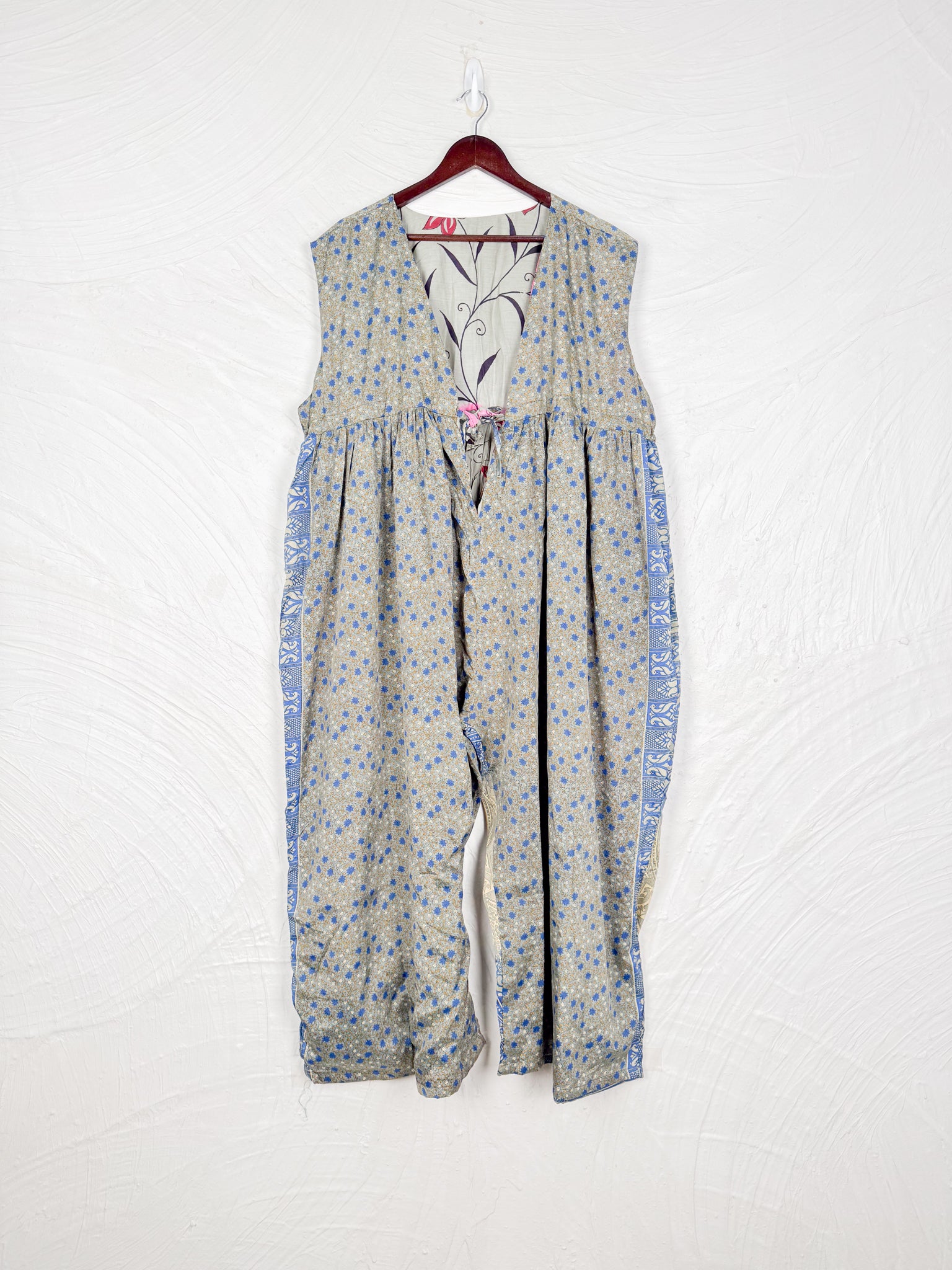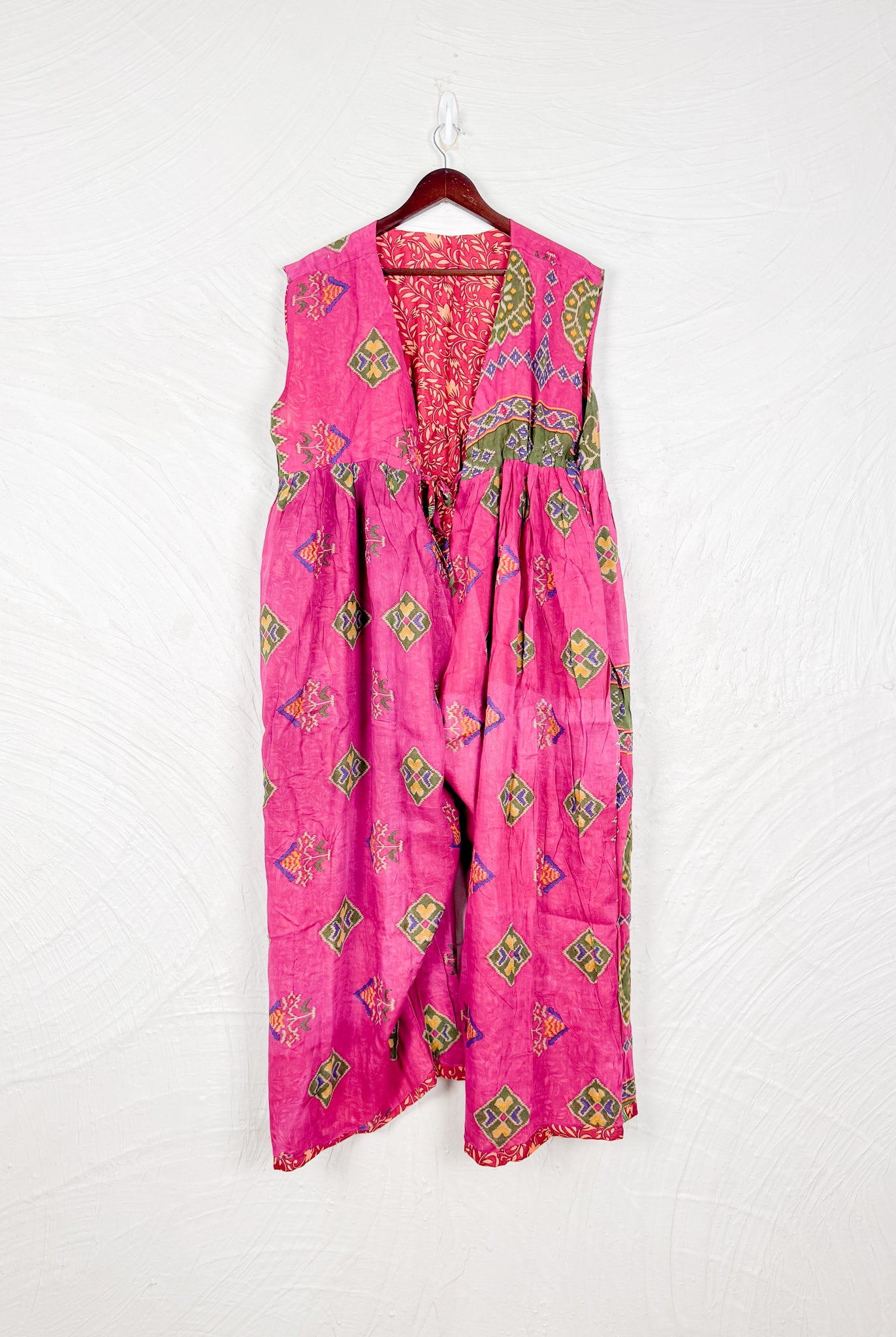 This reversible silk jumpsuit offers two distinct personalities: one side in vibrant, intricately patterned vintage Indian saree fabric, and the other in flowing, elegant silk. Its flattering V-neck, delicate ties, gathered waist, and wide, cropped legs provide ultimate comfort and breathability, making it a versatile piece of wearable art.