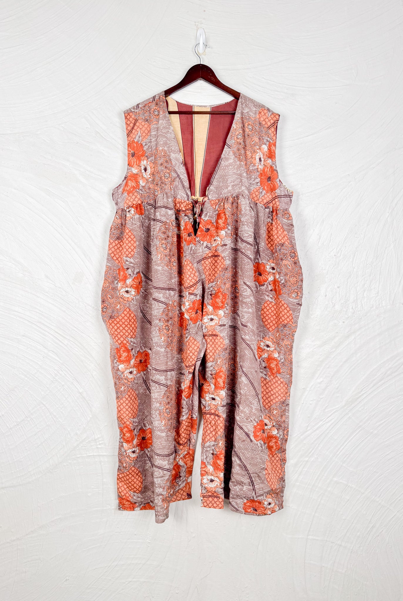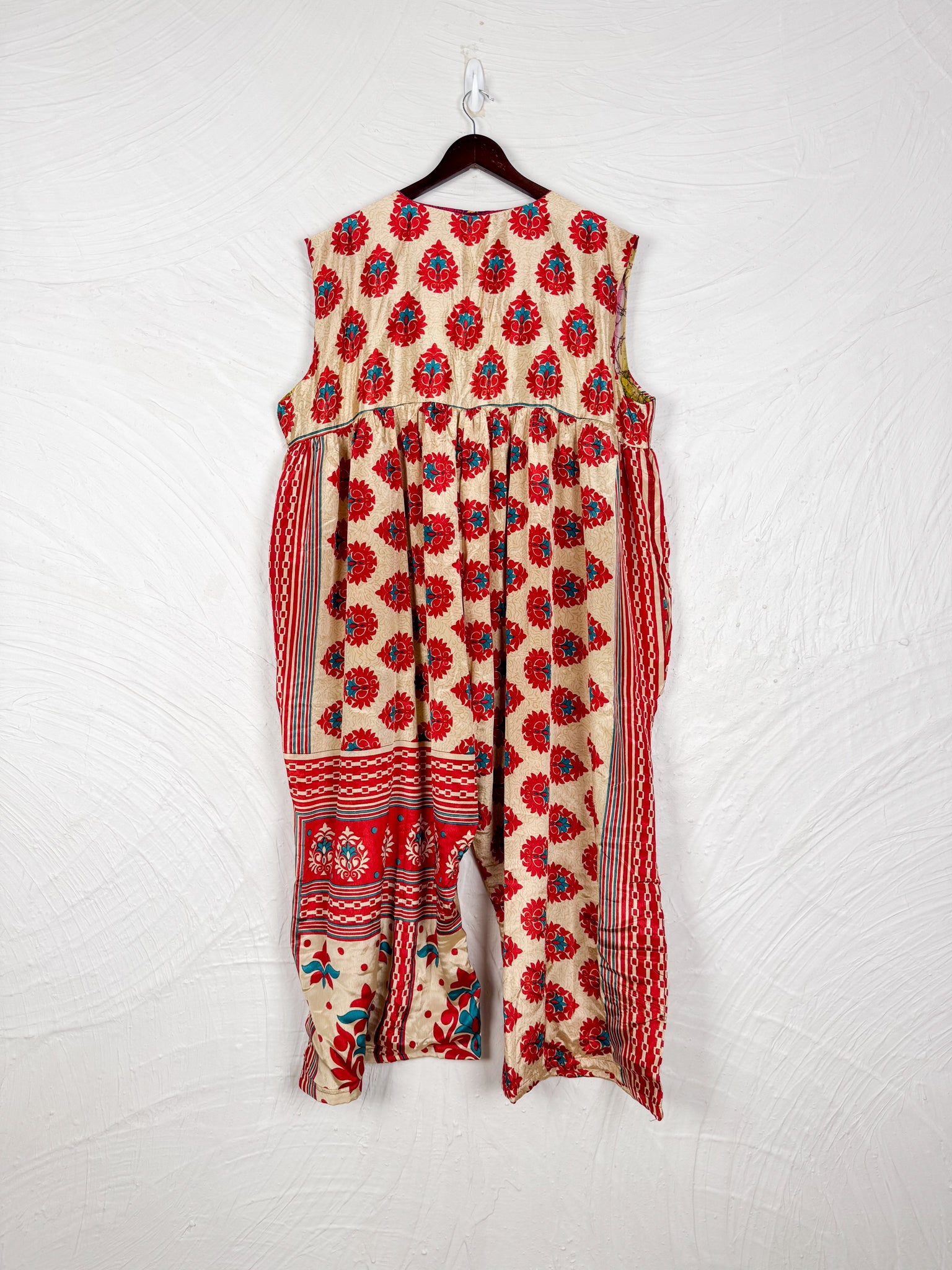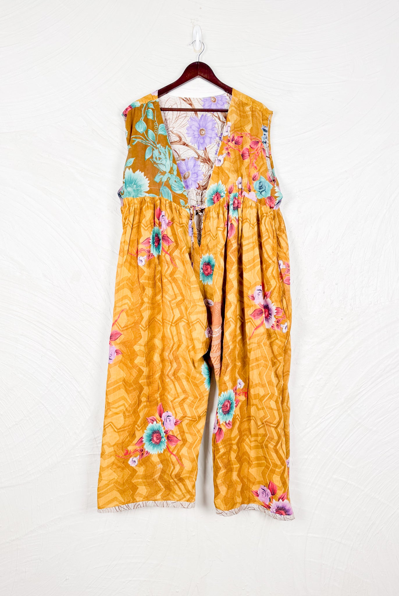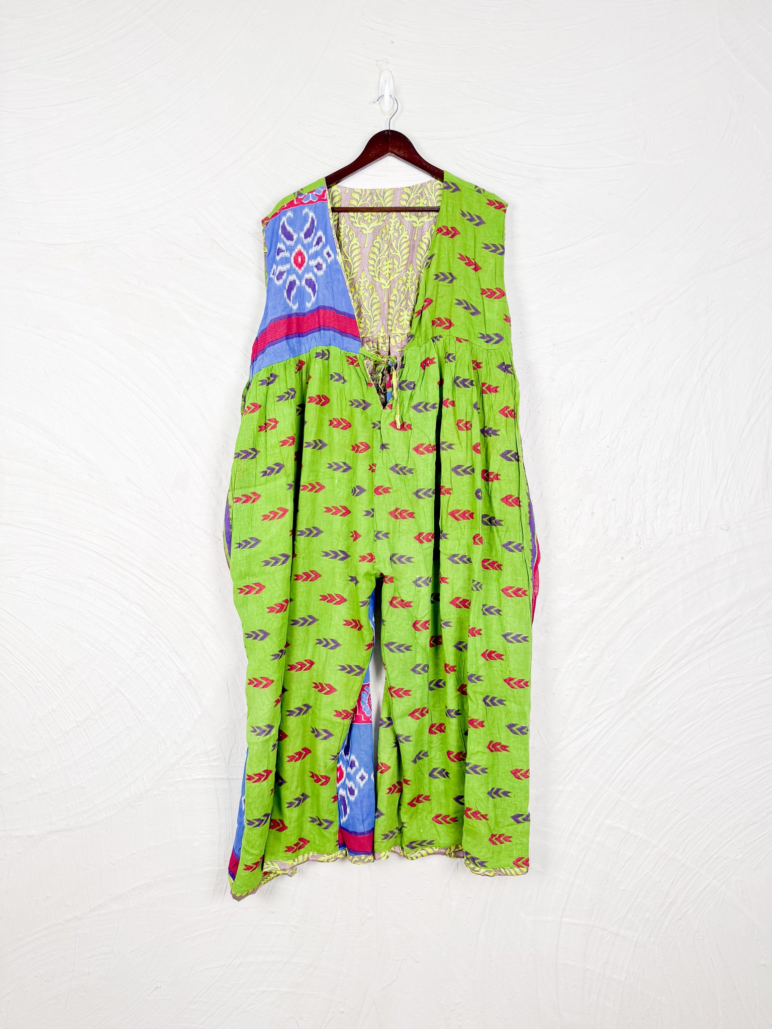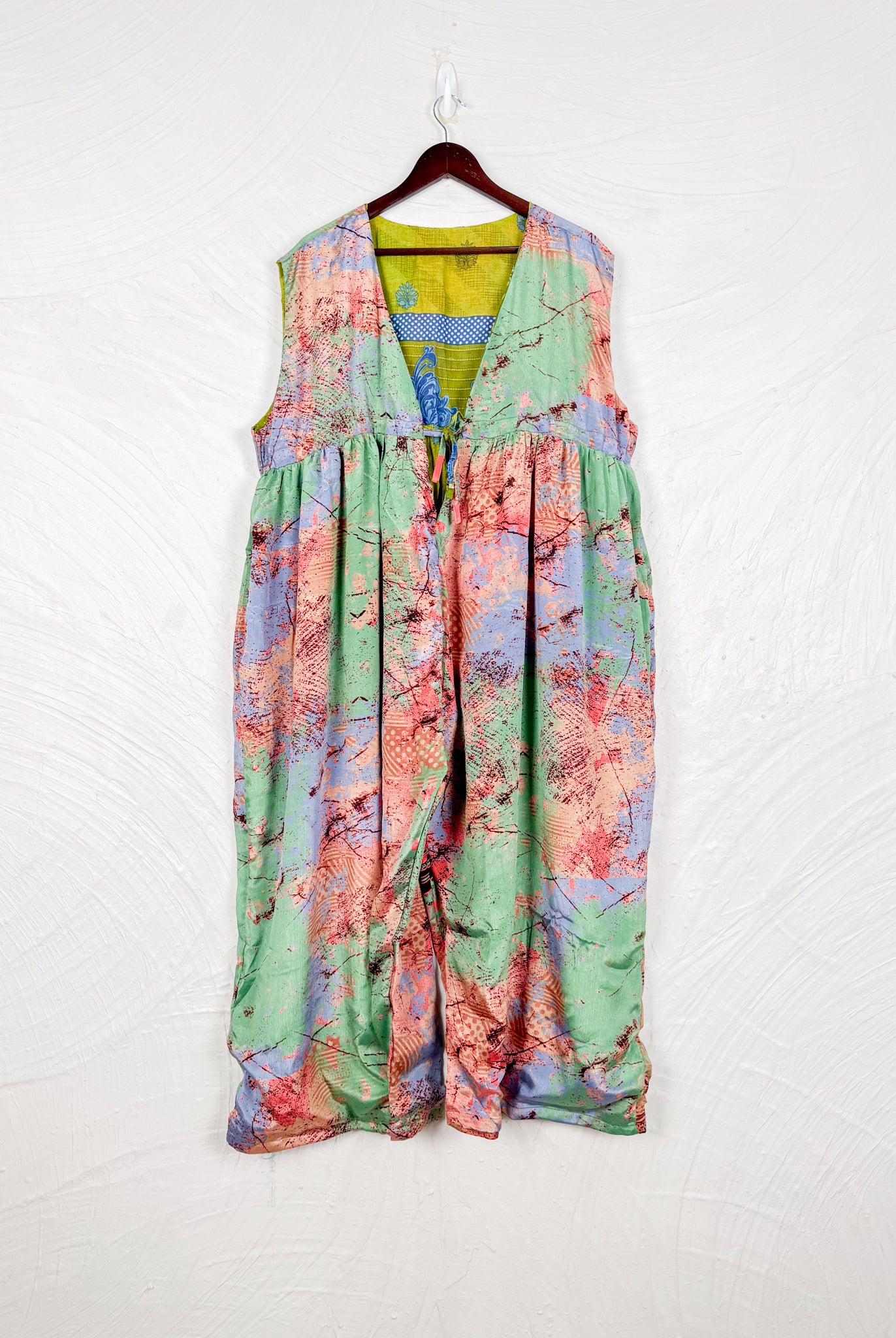 This reversible silk jumpsuit offers two distinct personalities: one side in vibrant, intricately patterned vintage Indian saree fabric, and the other in flowing, elegant silk. Its flattering V-neck, delicate ties, gathered waist, and wide, cropped legs provide ultimate comfort and breathability, making it a versatile piece of wearable art.