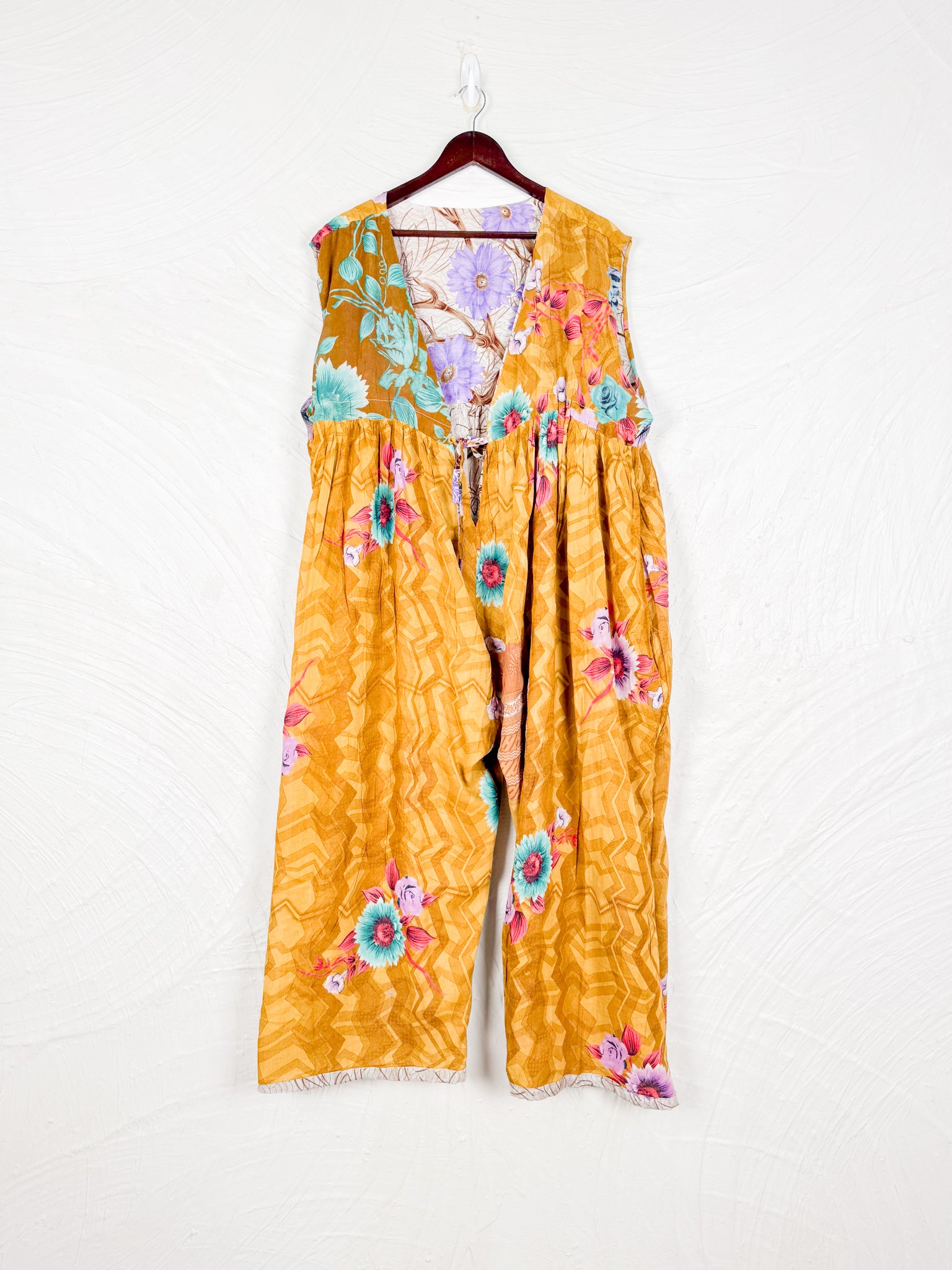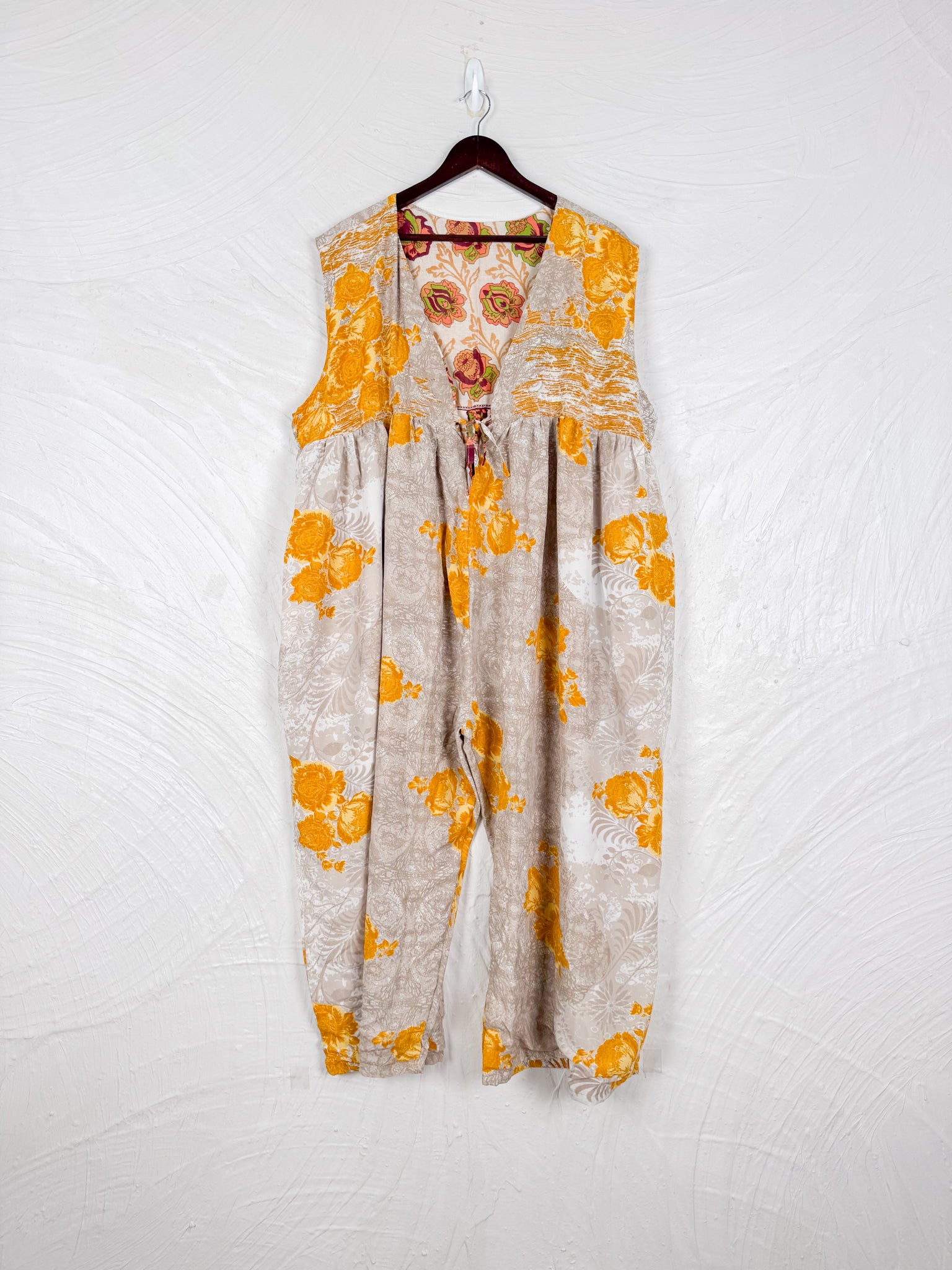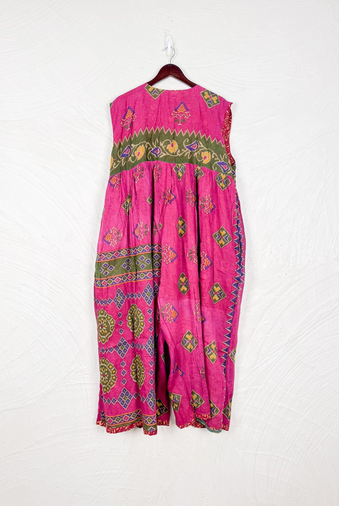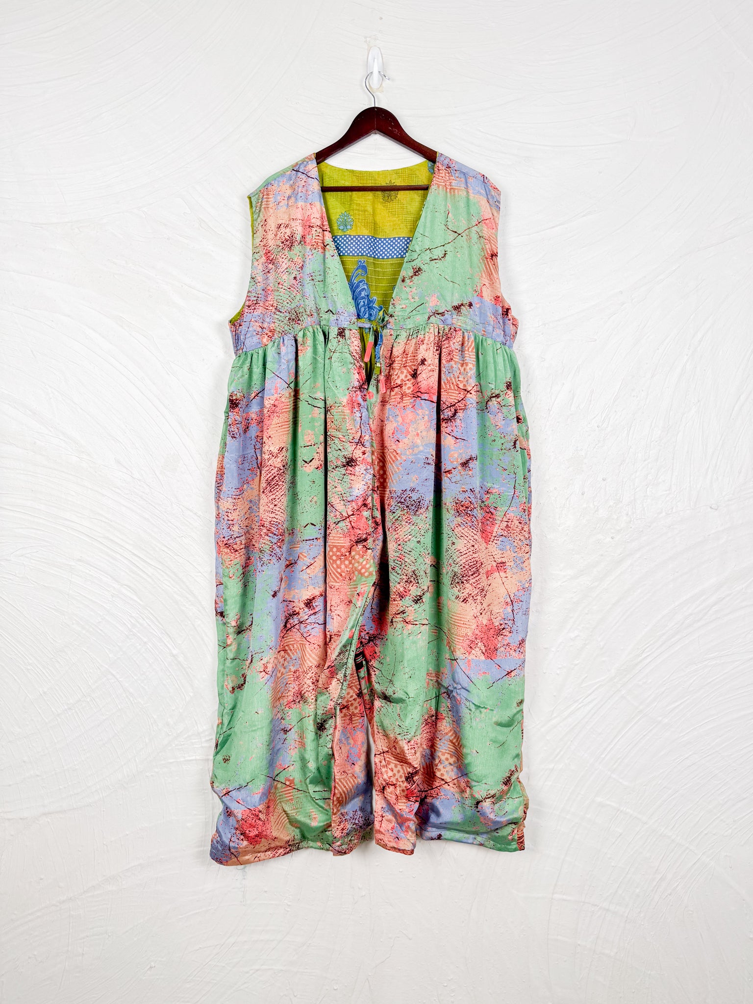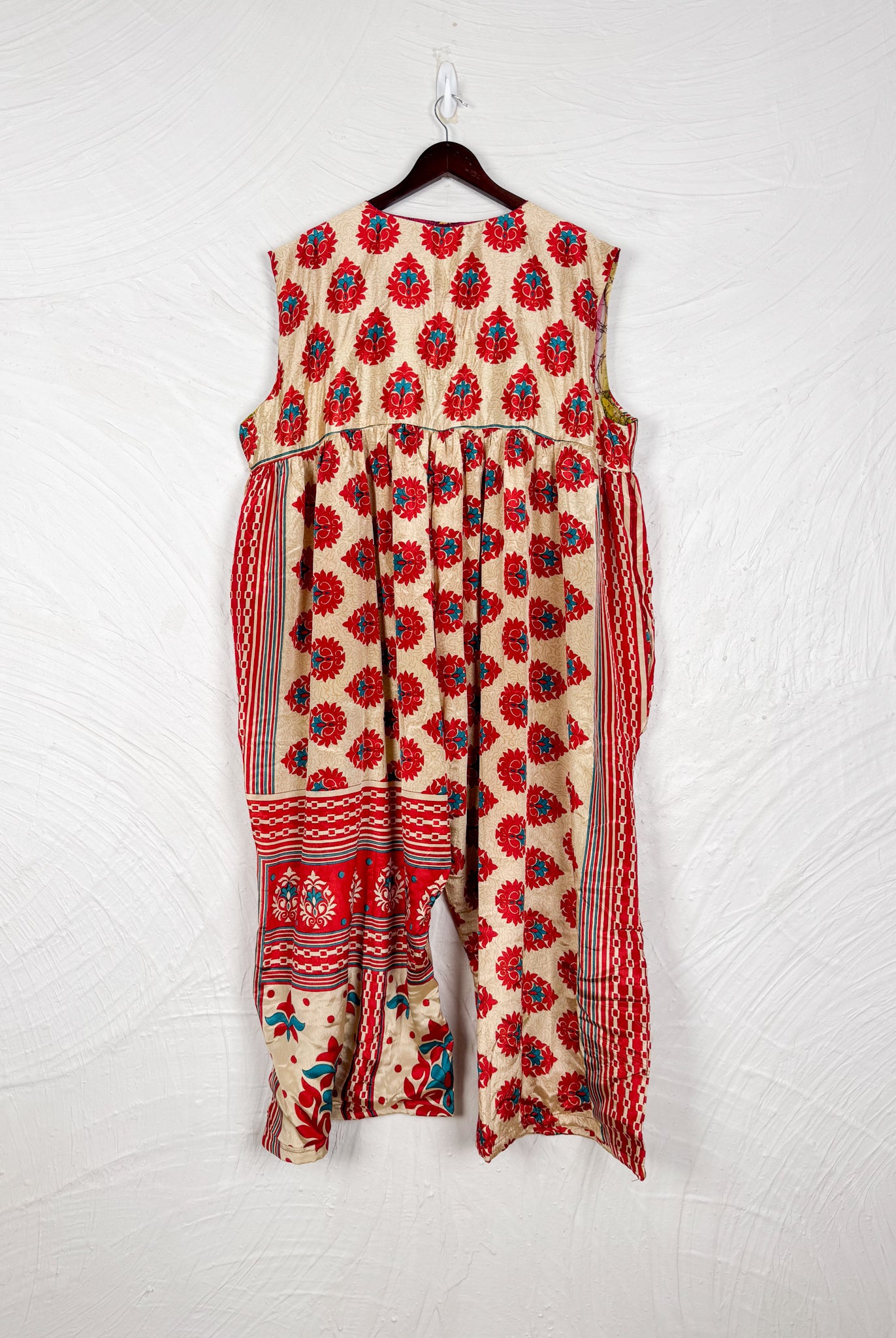 This reversible silk jumpsuit offers two distinct personalities: one side in vibrant, intricately patterned vintage Indian saree fabric, and the other in flowing, elegant silk. Its flattering V-neck, delicate ties, gathered waist, and wide, cropped legs provide ultimate comfort and breathability, making it a versatile piece of wearable art.