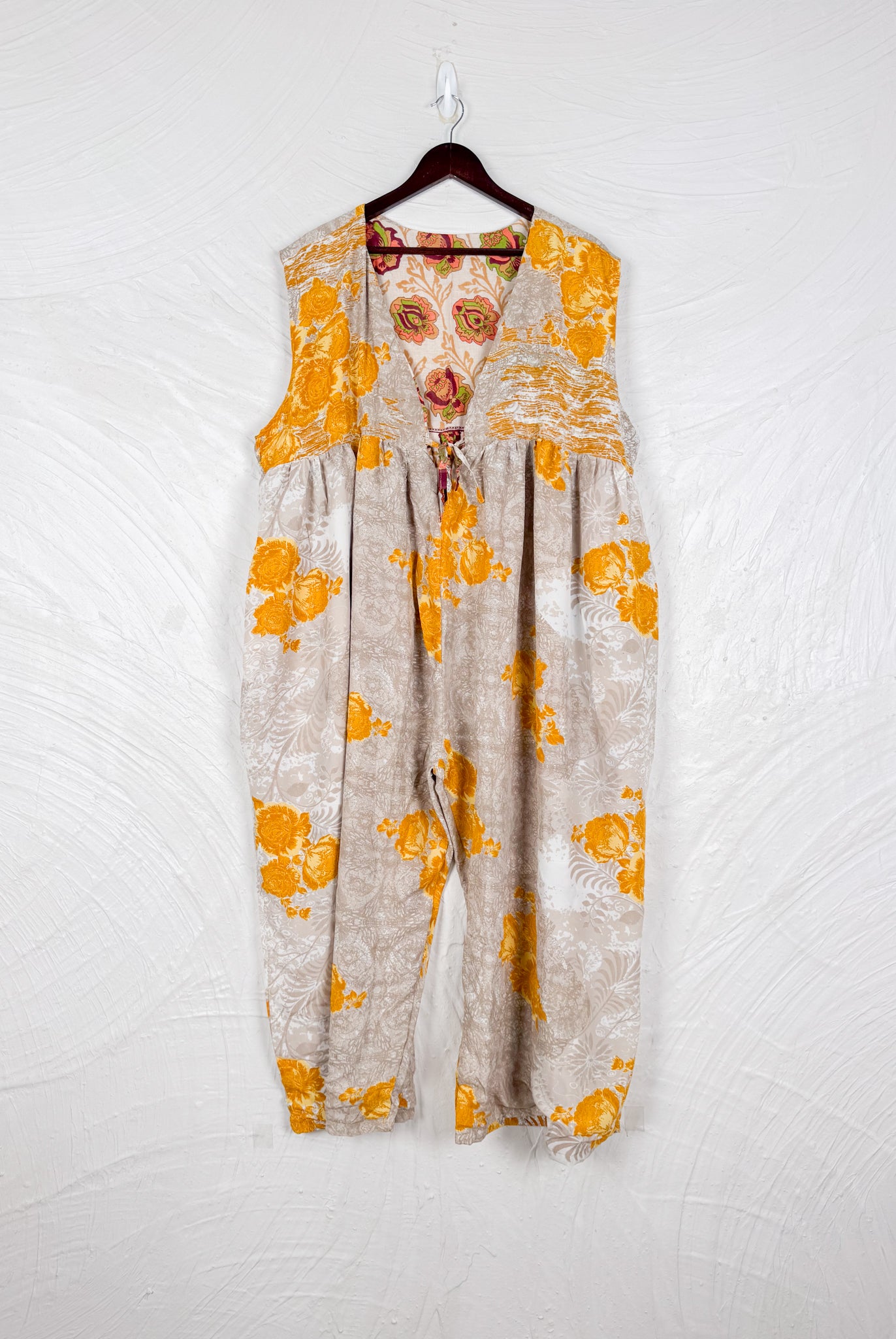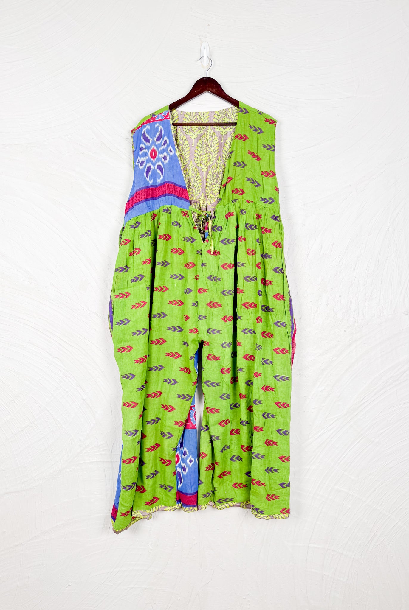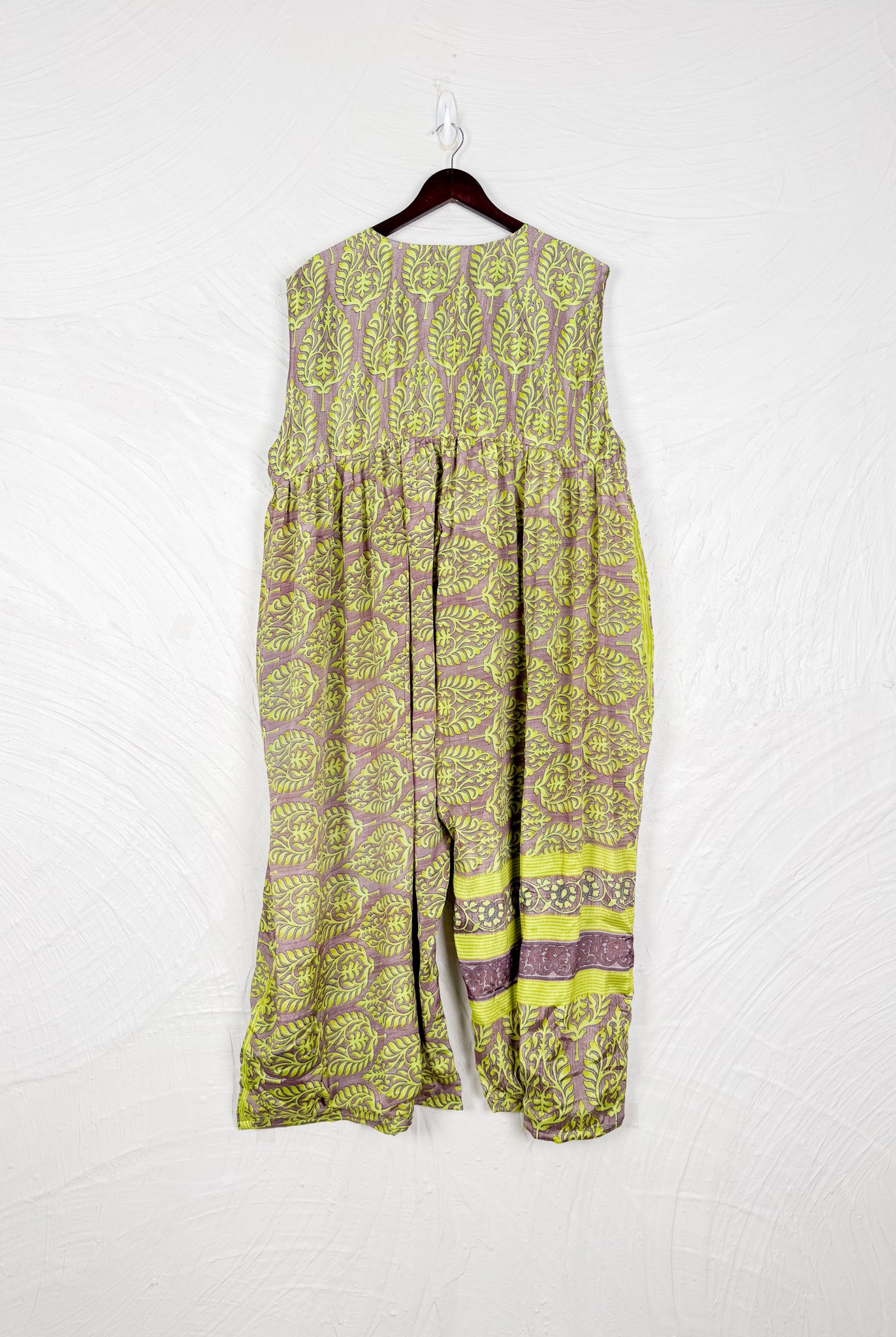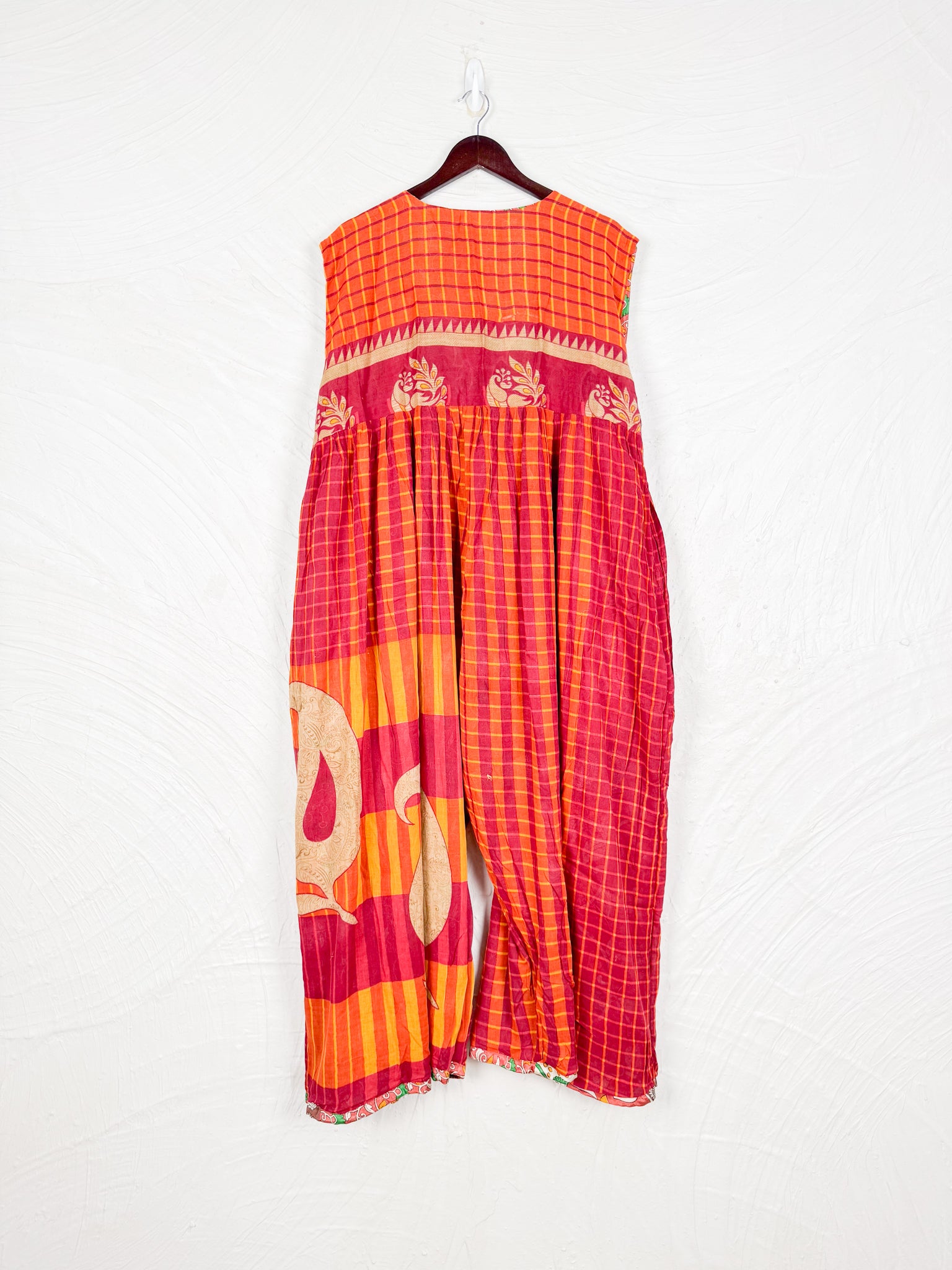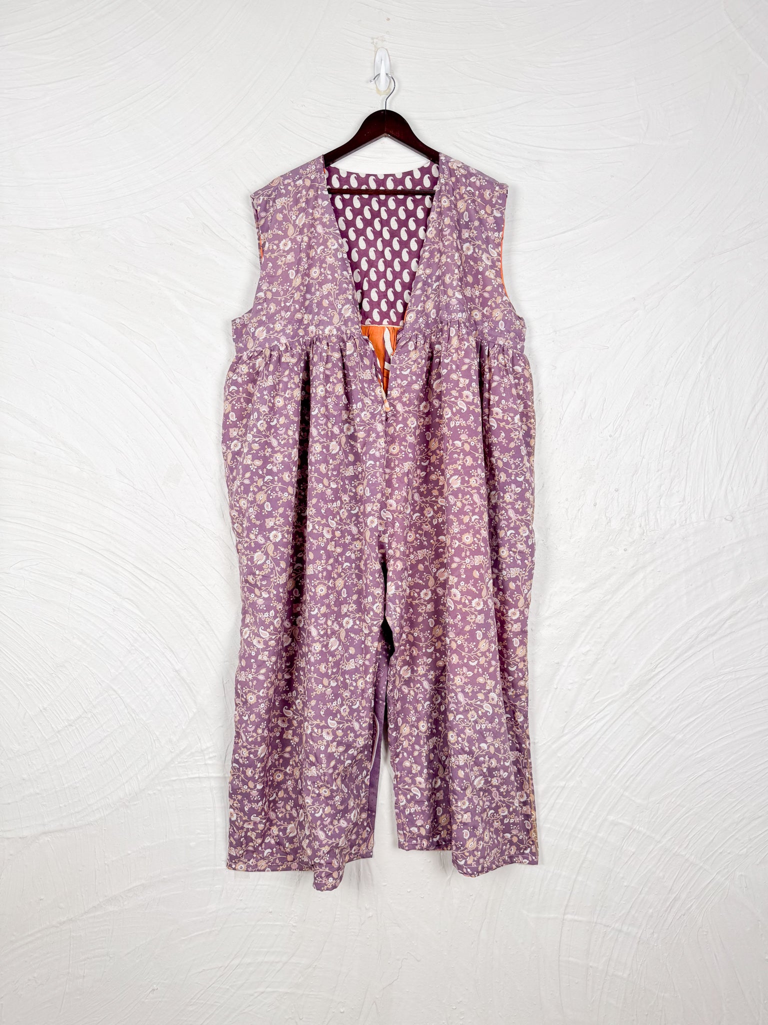 This reversible silk jumpsuit offers two distinct personalities: one side in vibrant, intricately patterned vintage Indian saree fabric, and the other in flowing, elegant silk. Its flattering V-neck, delicate ties, gathered waist, and wide, cropped legs provide ultimate comfort and breathability, making it a versatile piece of wearable art.