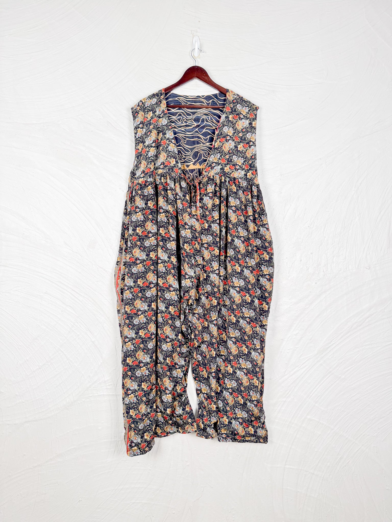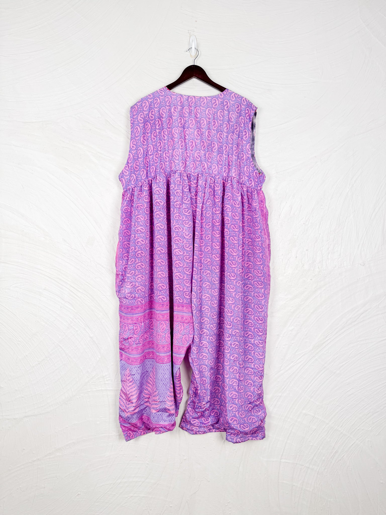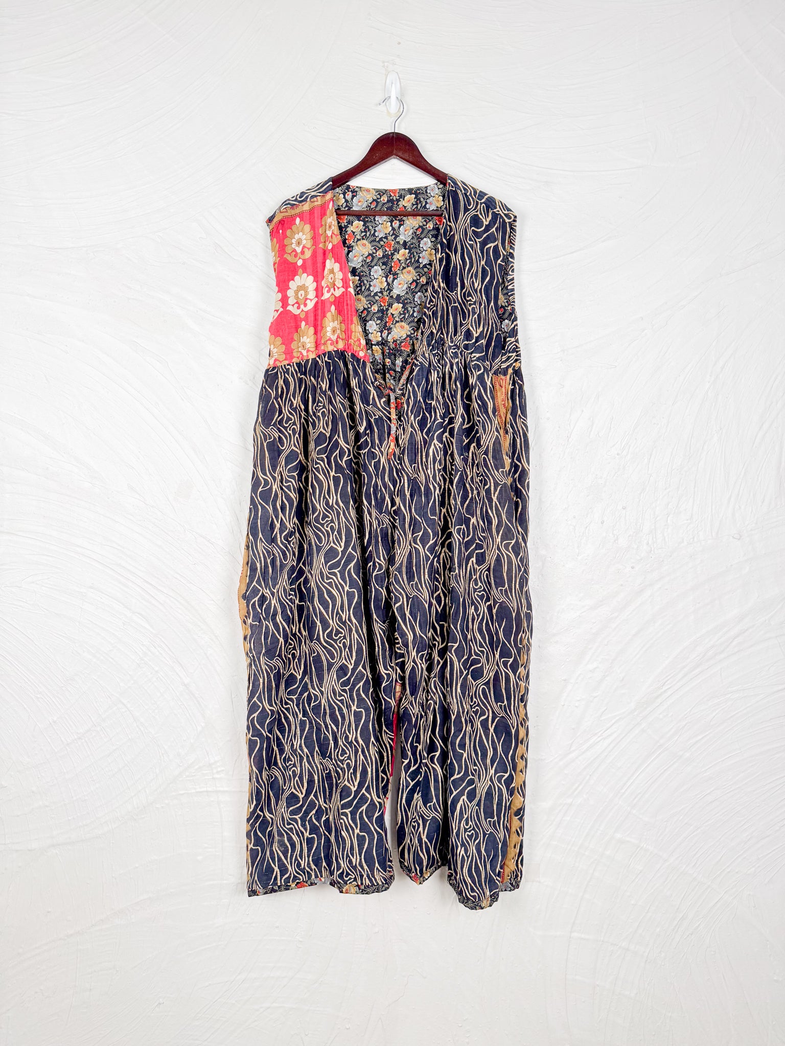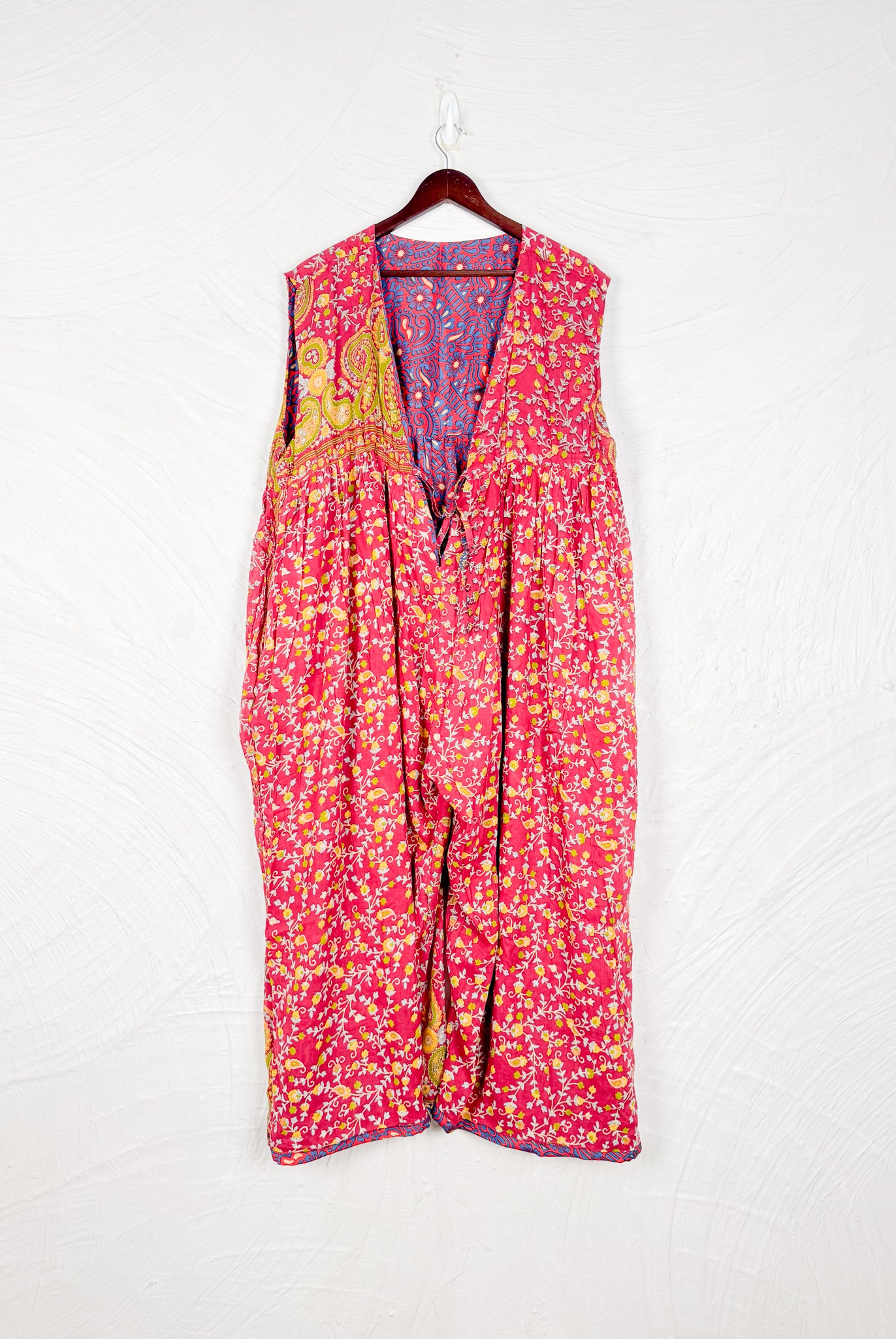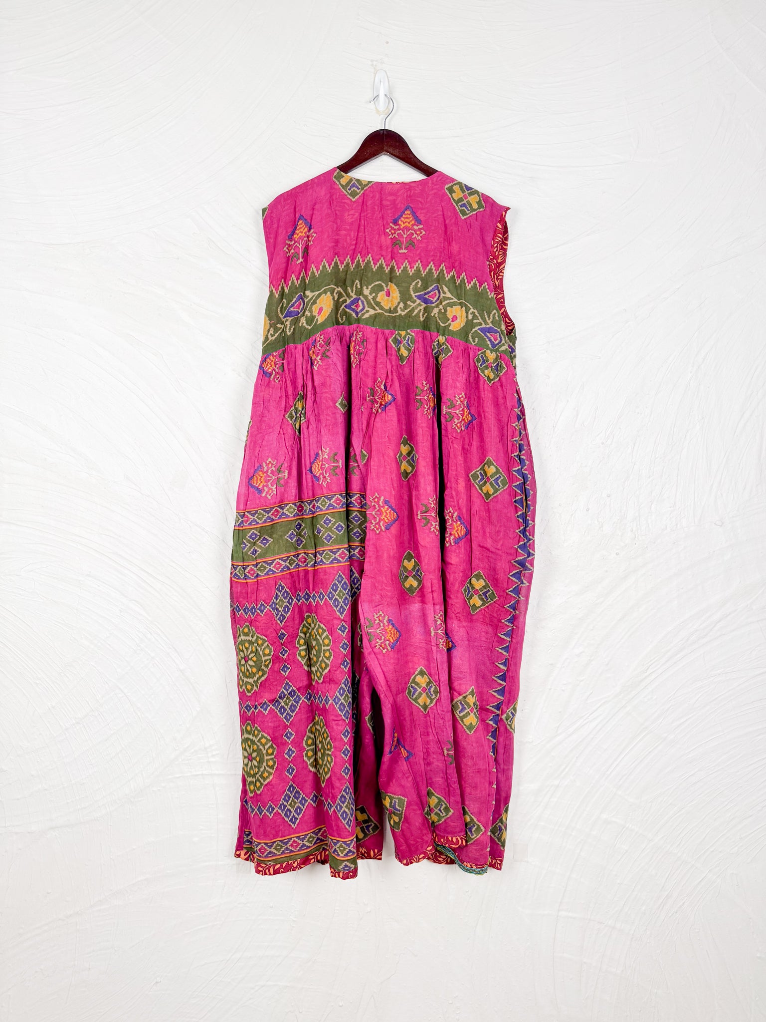 This reversible silk jumpsuit offers two distinct personalities: one side in vibrant, intricately patterned vintage Indian saree fabric, and the other in flowing, elegant silk. Its flattering V-neck, delicate ties, gathered waist, and wide, cropped legs provide ultimate comfort and breathability, making it a versatile piece of wearable art.