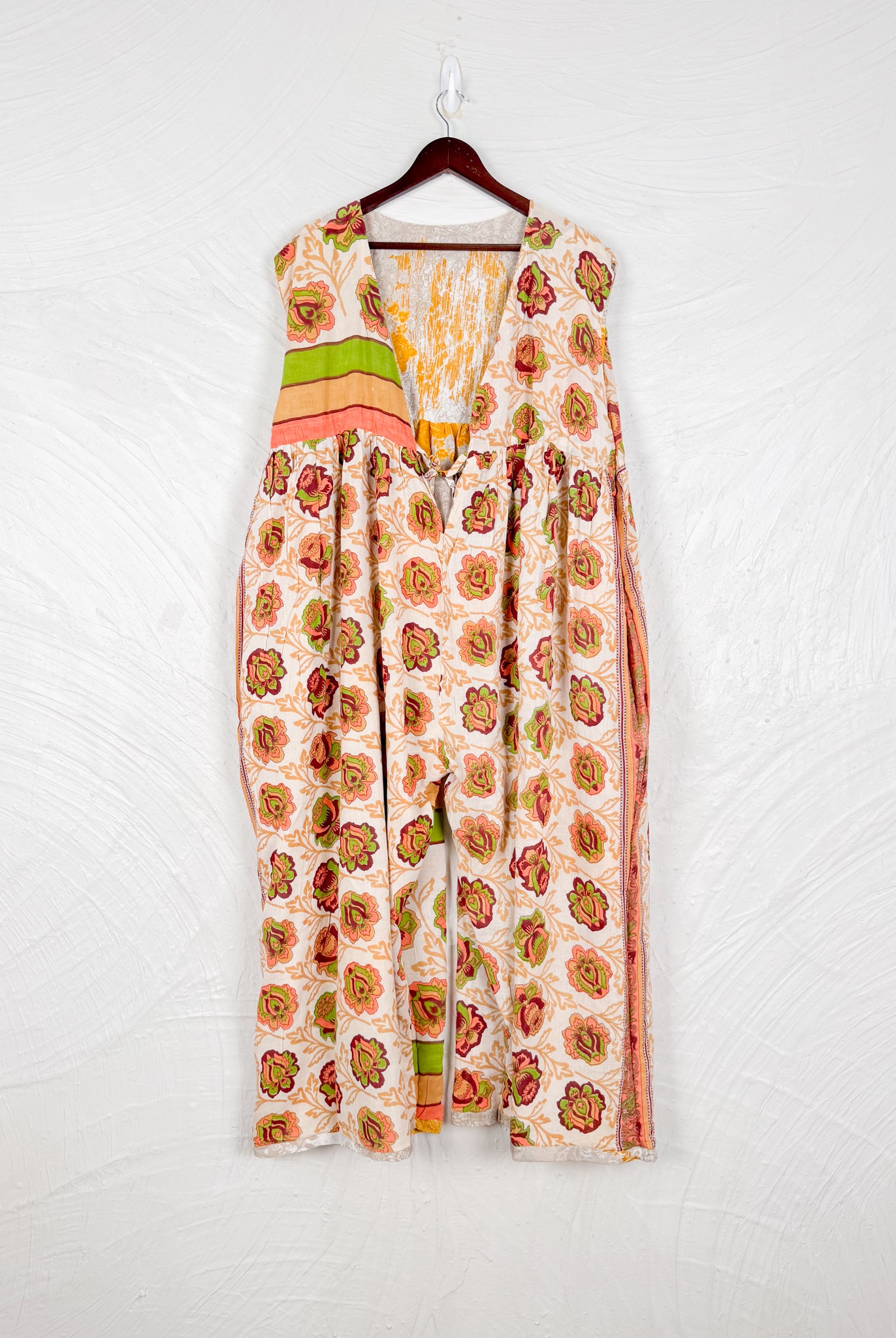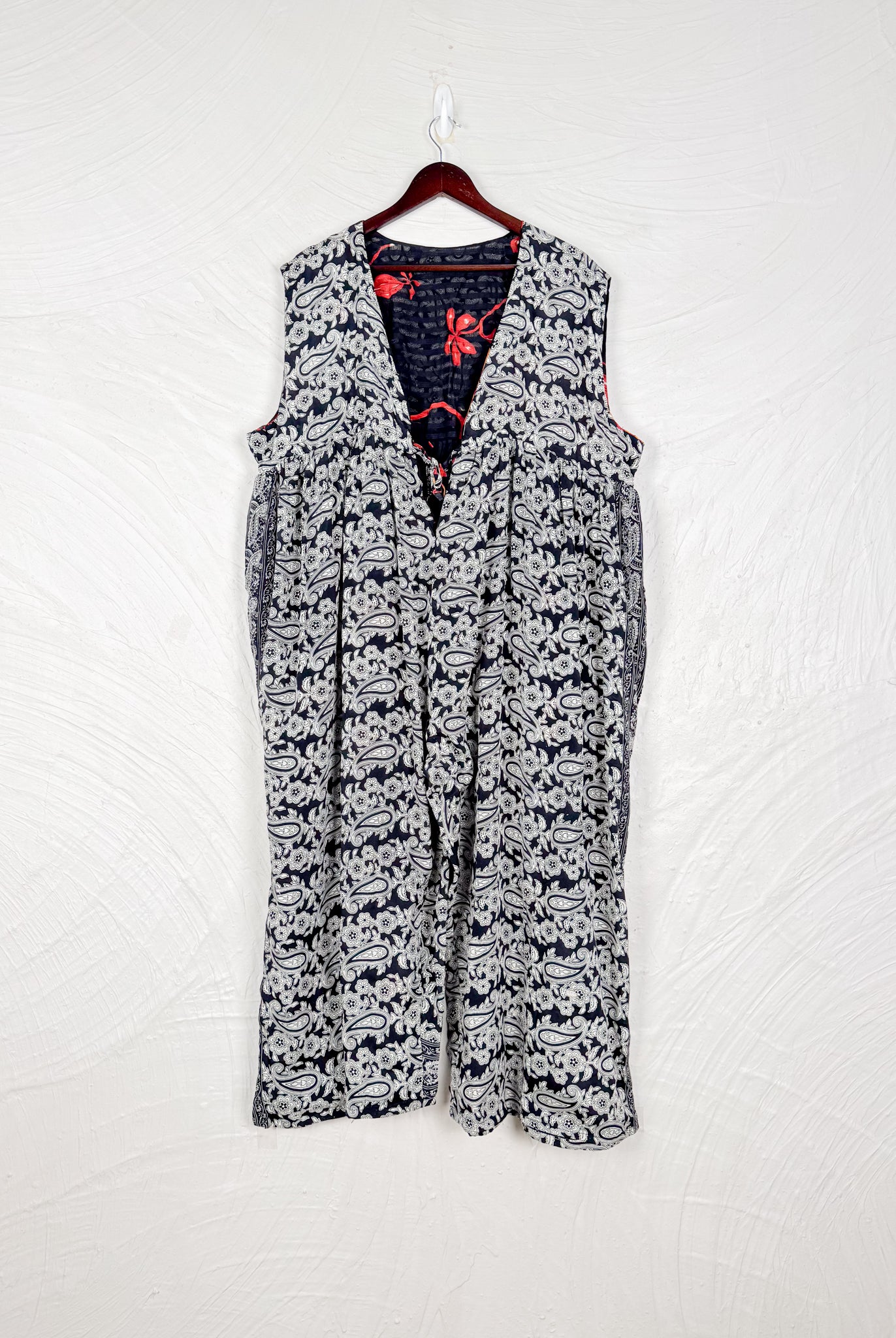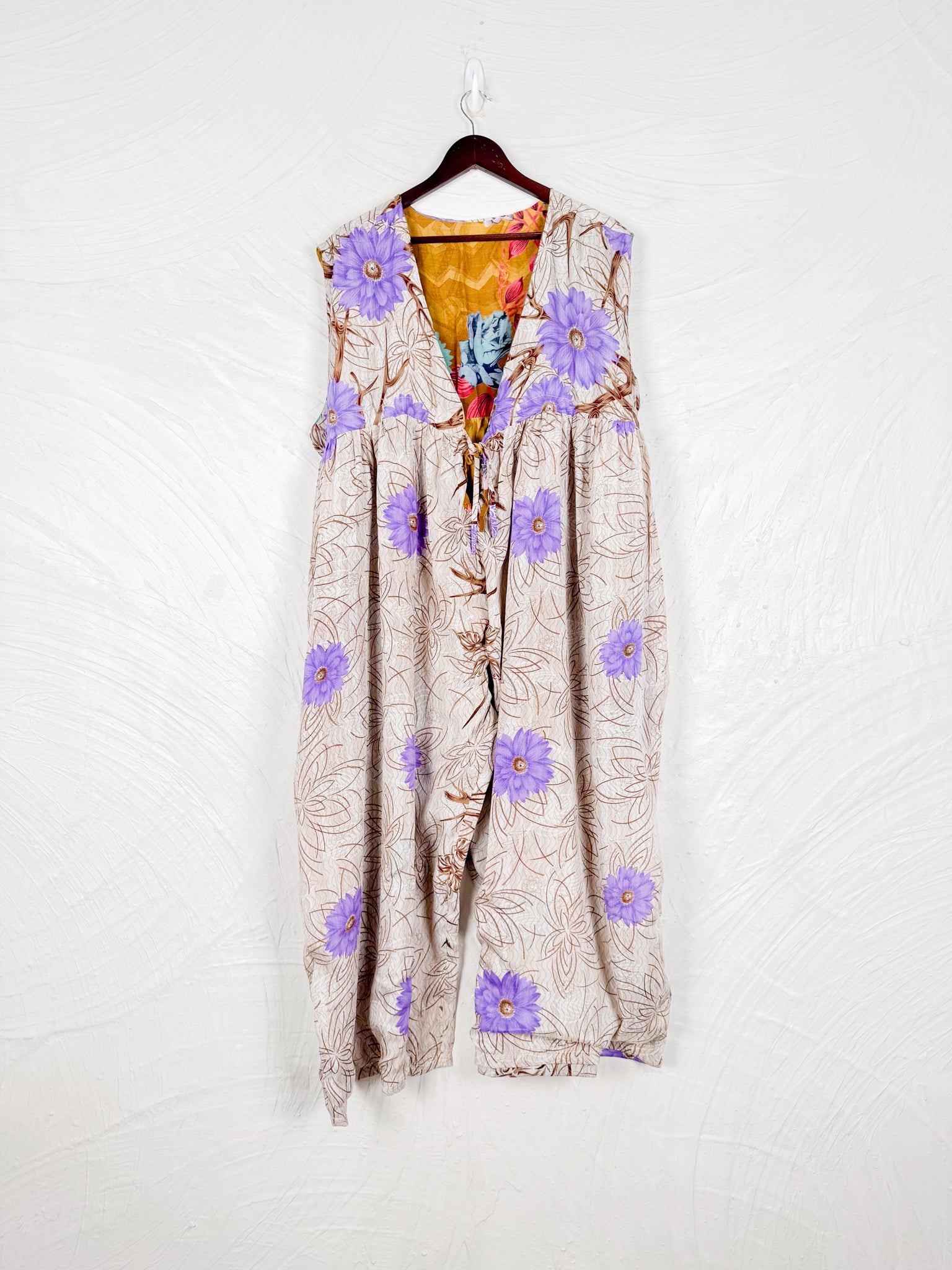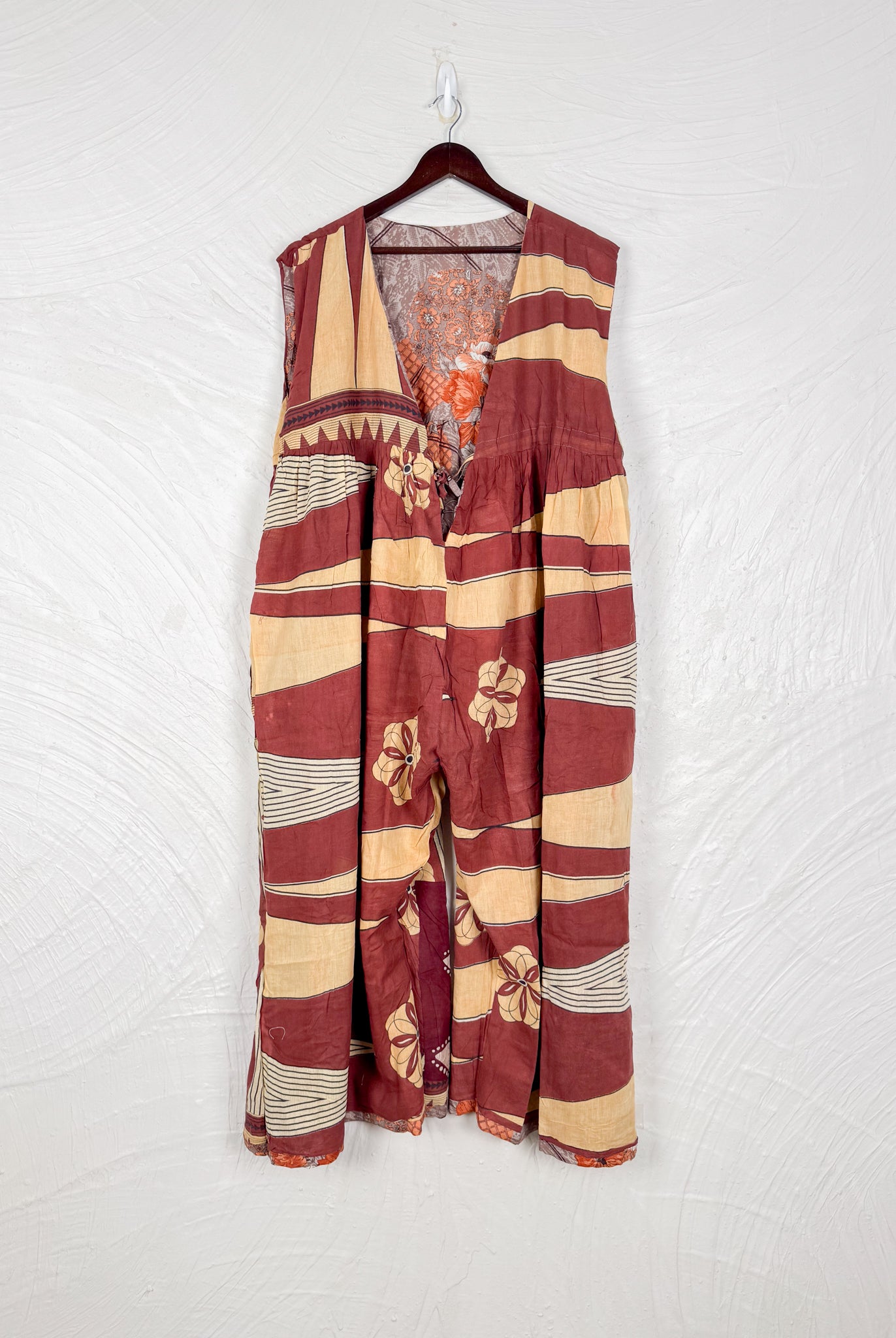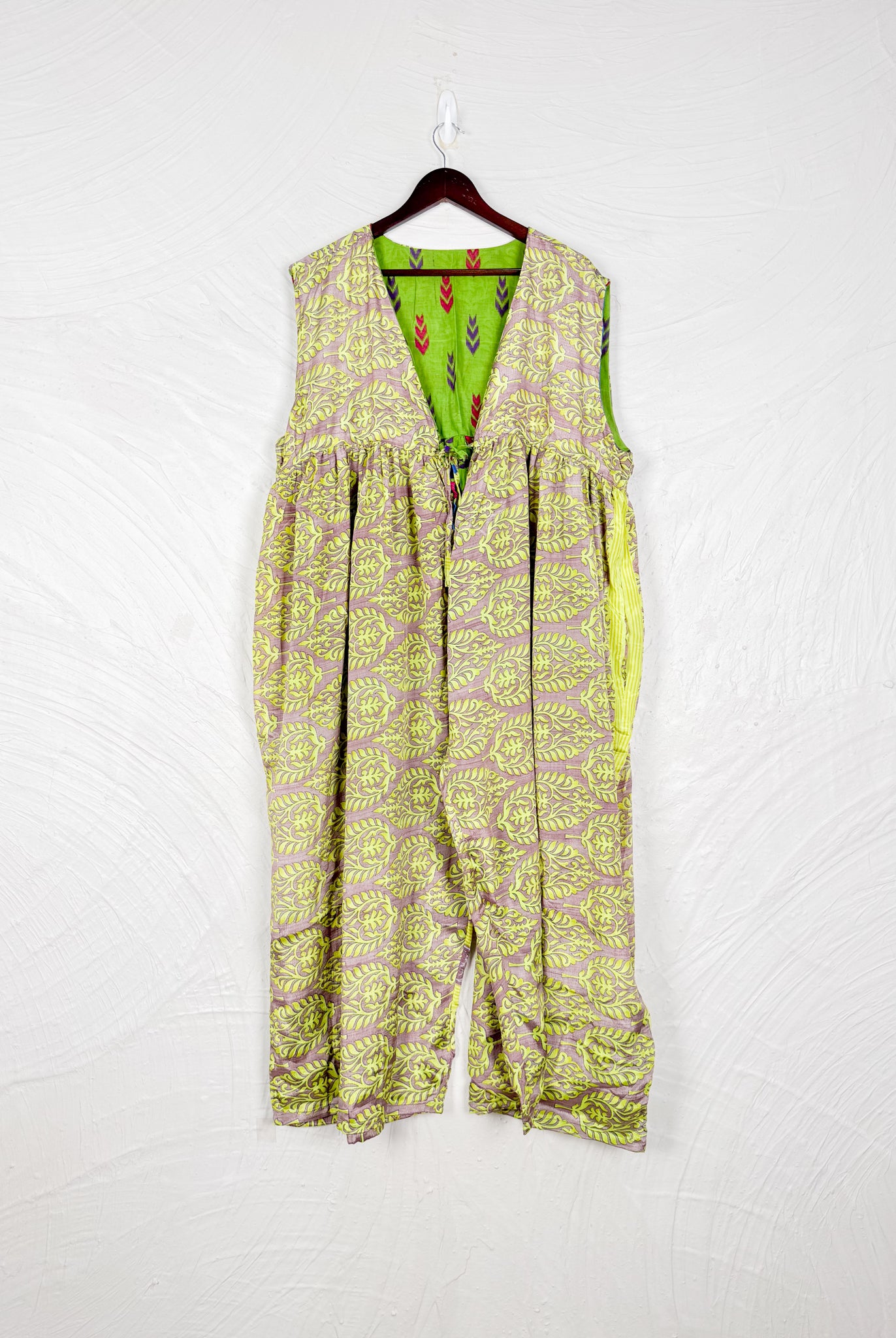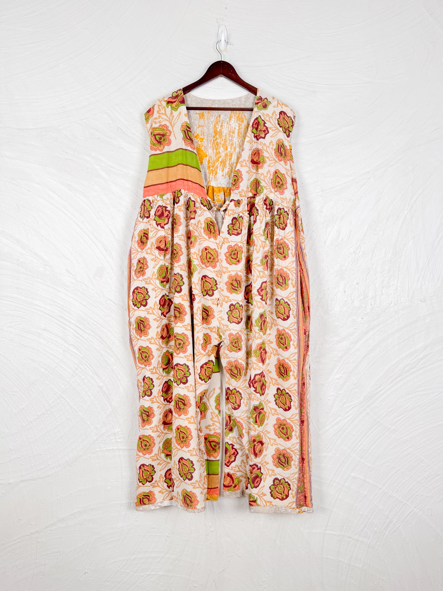 This reversible silk jumpsuit offers two distinct personalities: one side in vibrant, intricately patterned vintage Indian saree fabric, and the other in flowing, elegant silk. Its flattering V-neck, delicate ties, gathered waist, and wide, cropped legs provide ultimate comfort and breathability, making it a versatile piece of wearable art.