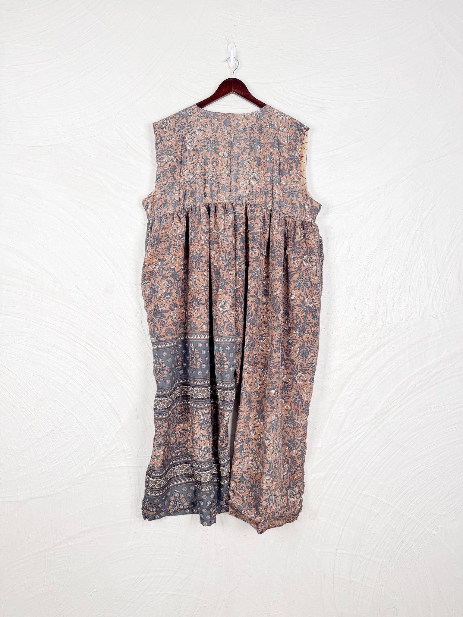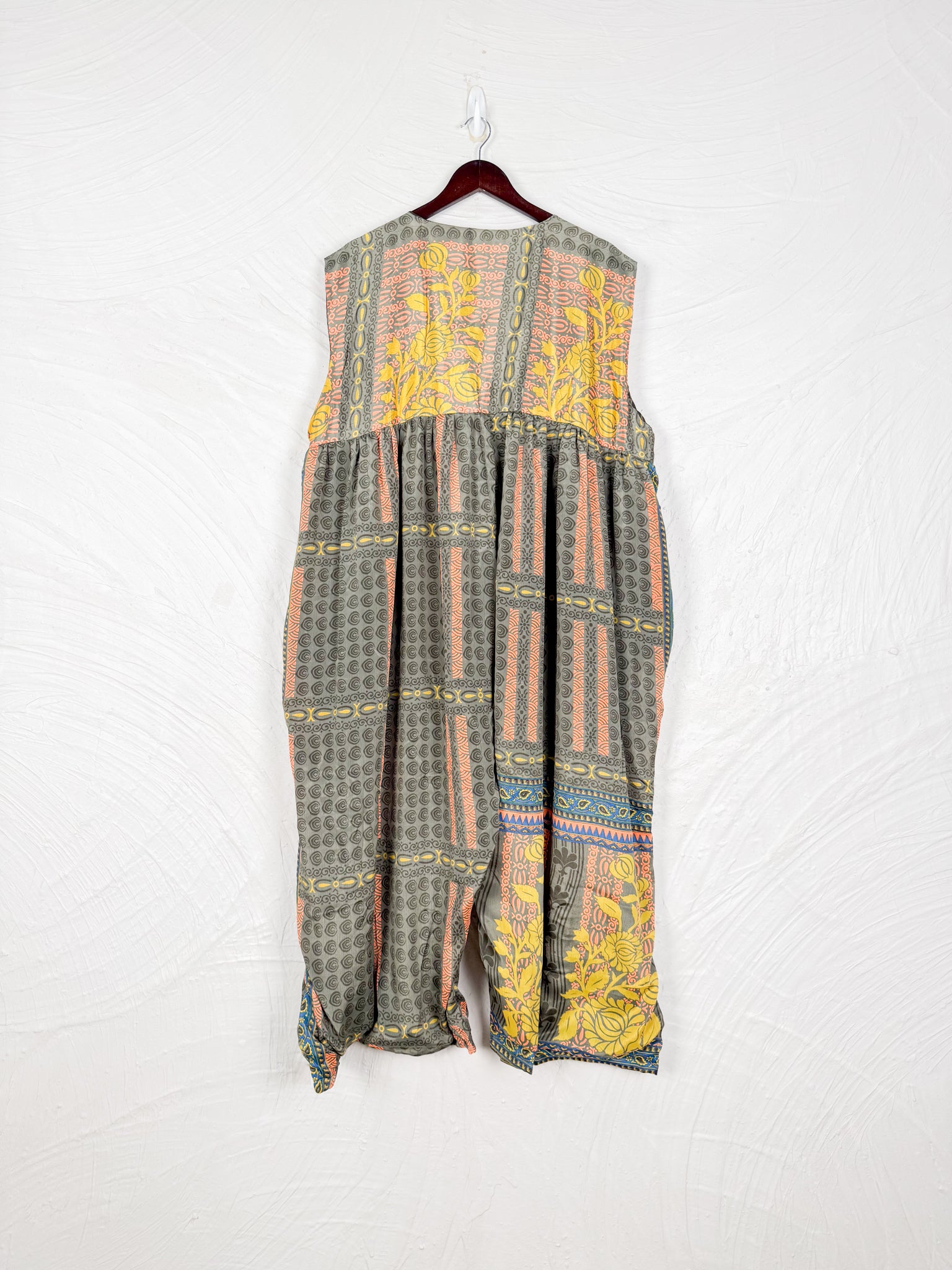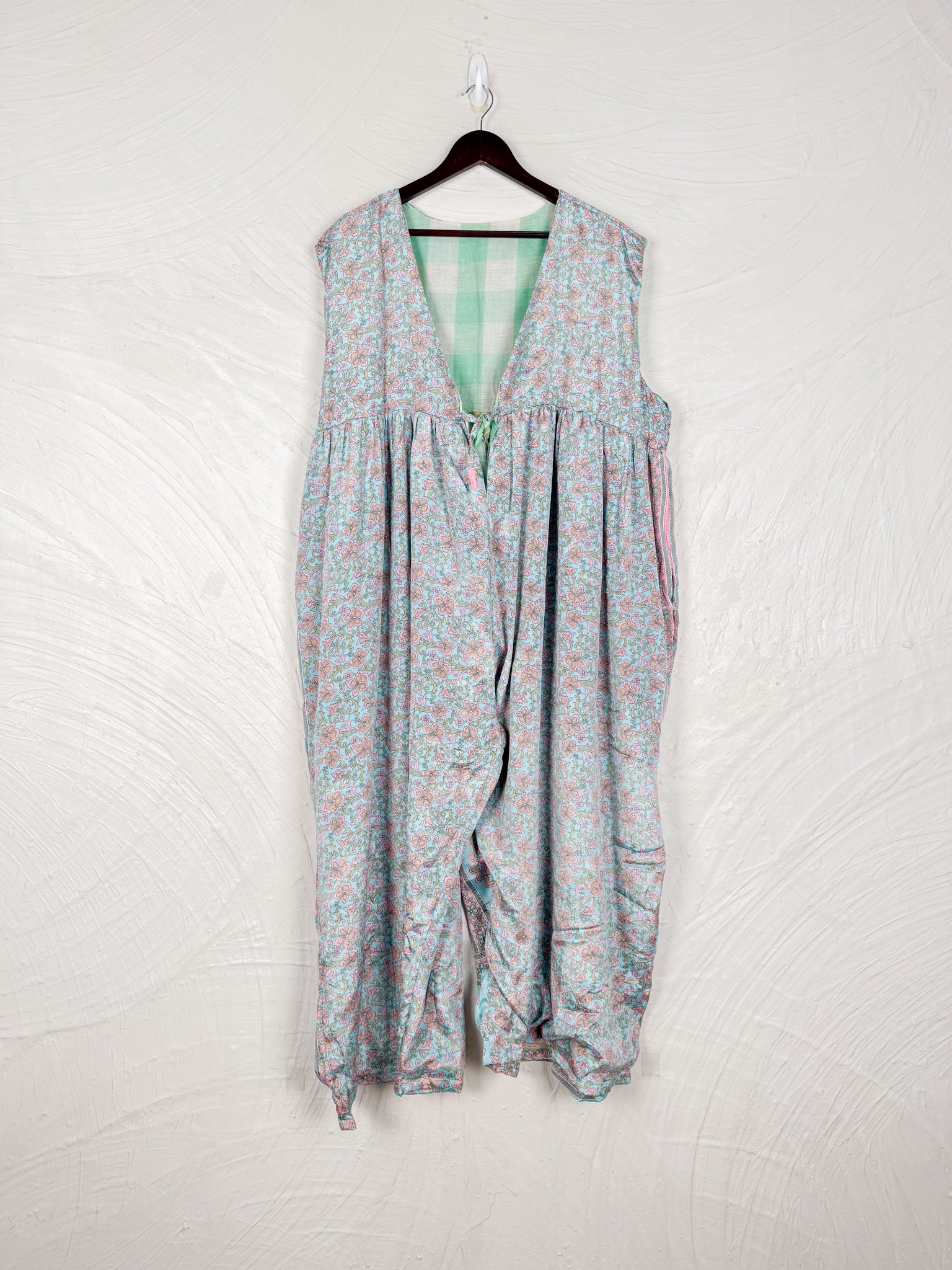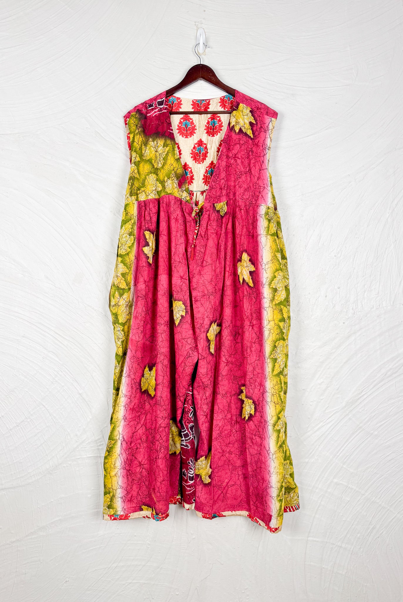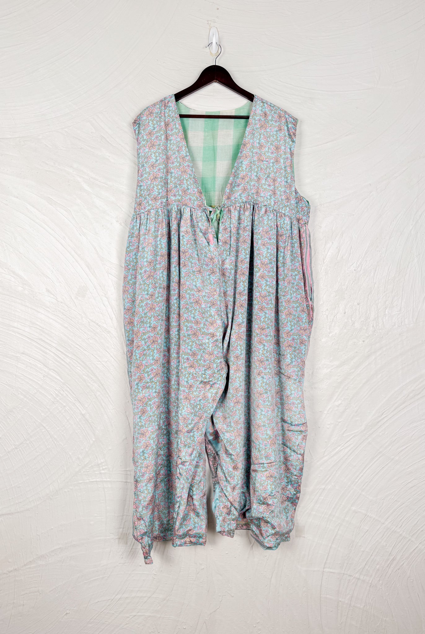 This reversible silk jumpsuit offers two distinct personalities: one side in vibrant, intricately patterned vintage Indian saree fabric, and the other in flowing, elegant silk. Its flattering V-neck, delicate ties, gathered waist, and wide, cropped legs provide ultimate comfort and breathability, making it a versatile piece of wearable art.