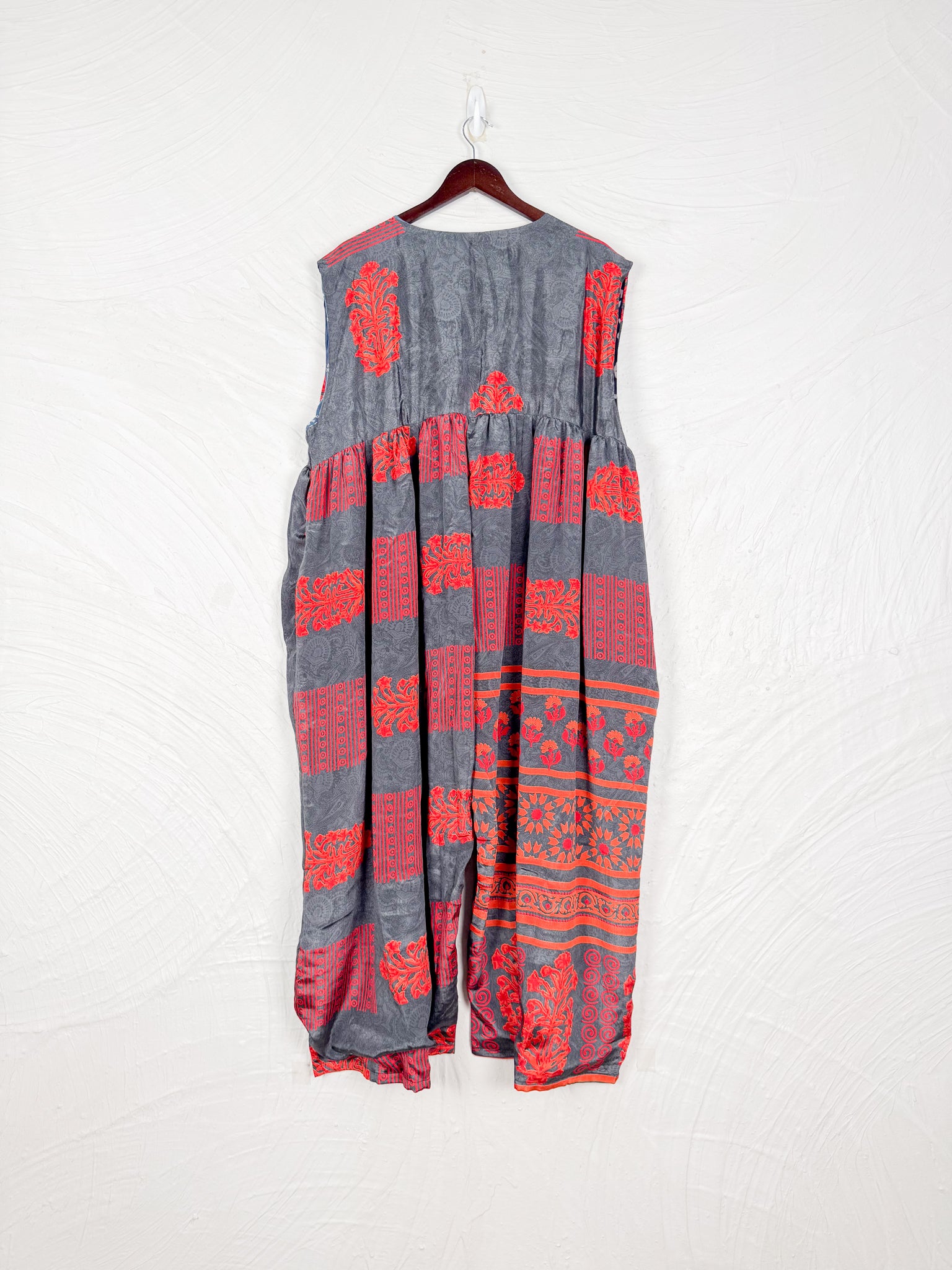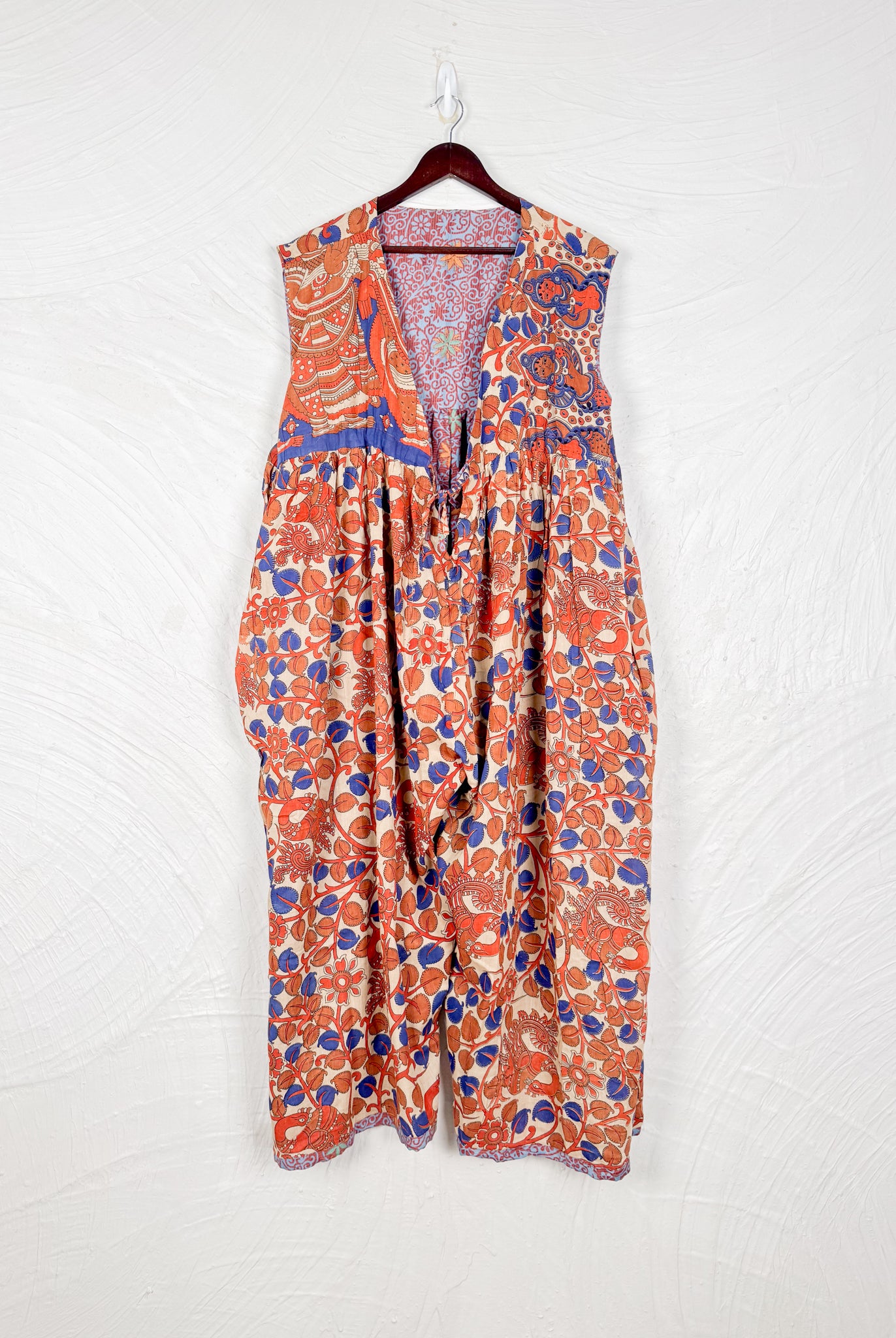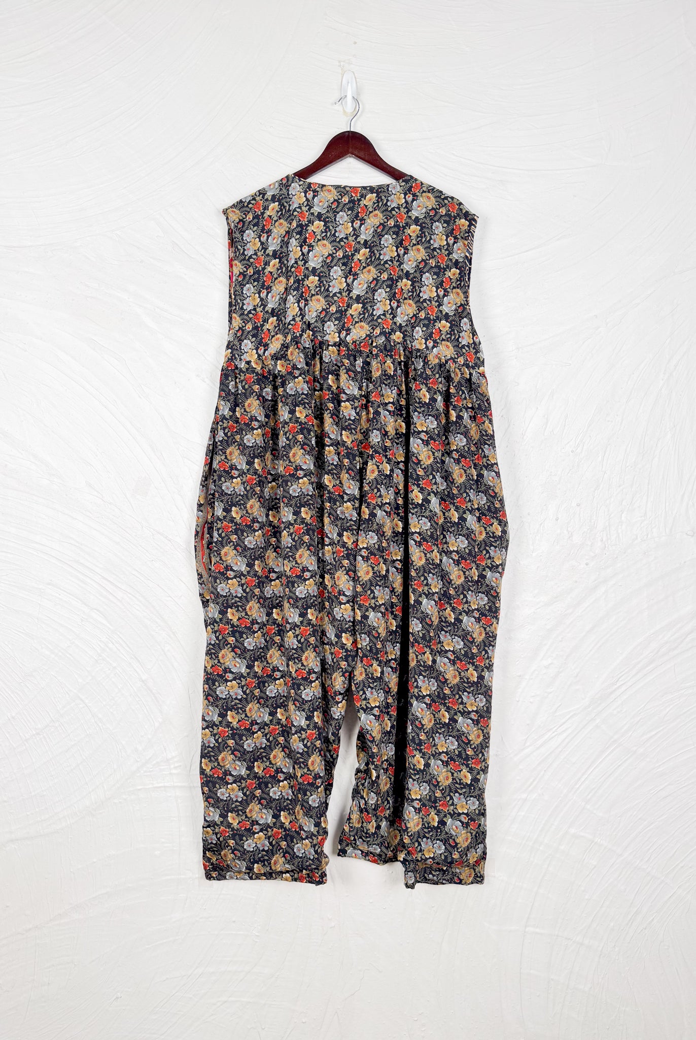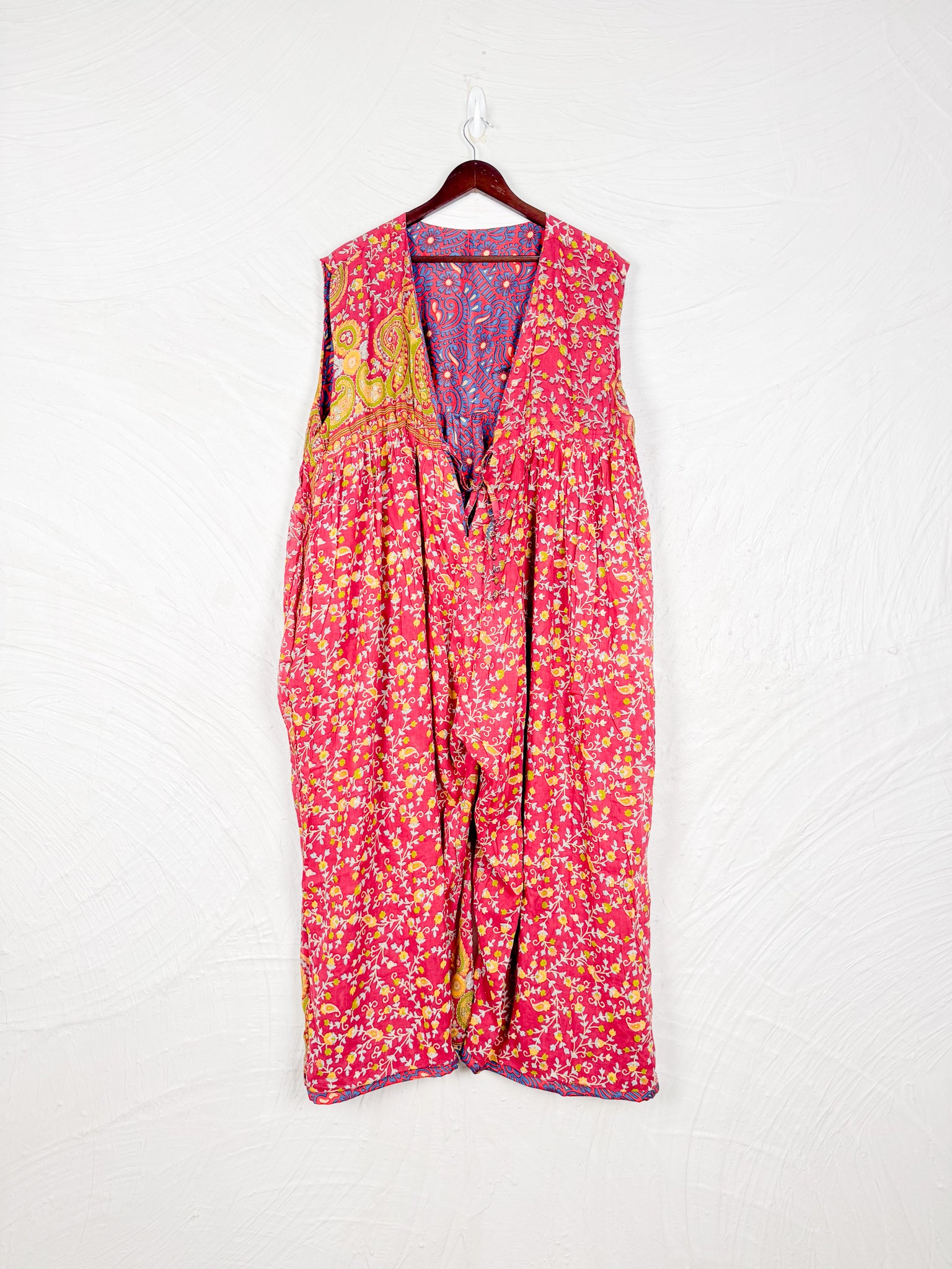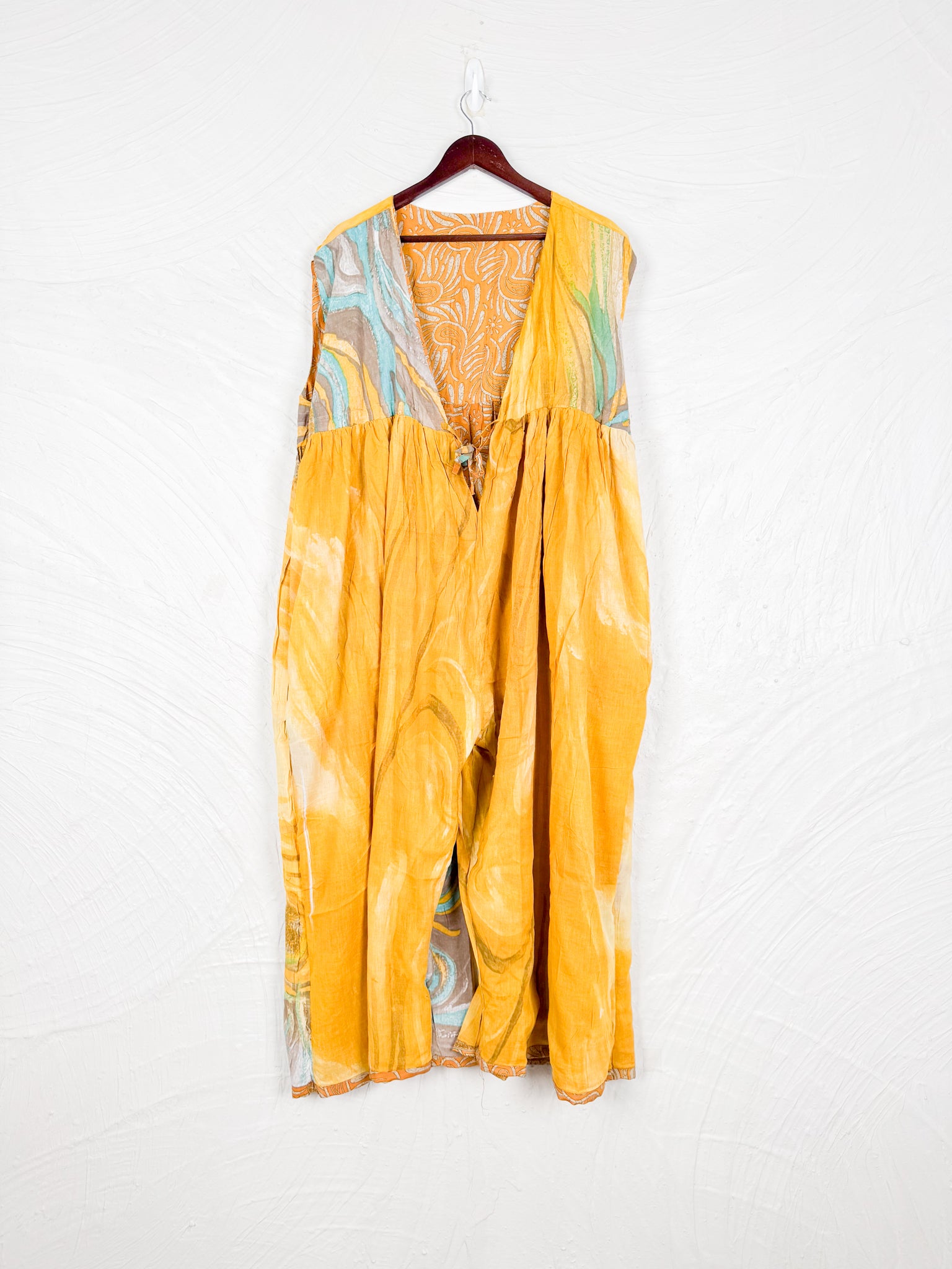 This reversible silk jumpsuit offers two distinct personalities: one side in vibrant, intricately patterned vintage Indian saree fabric, and the other in flowing, elegant silk. Its flattering V-neck, delicate ties, gathered waist, and wide, cropped legs provide ultimate comfort and breathability, making it a versatile piece of wearable art.