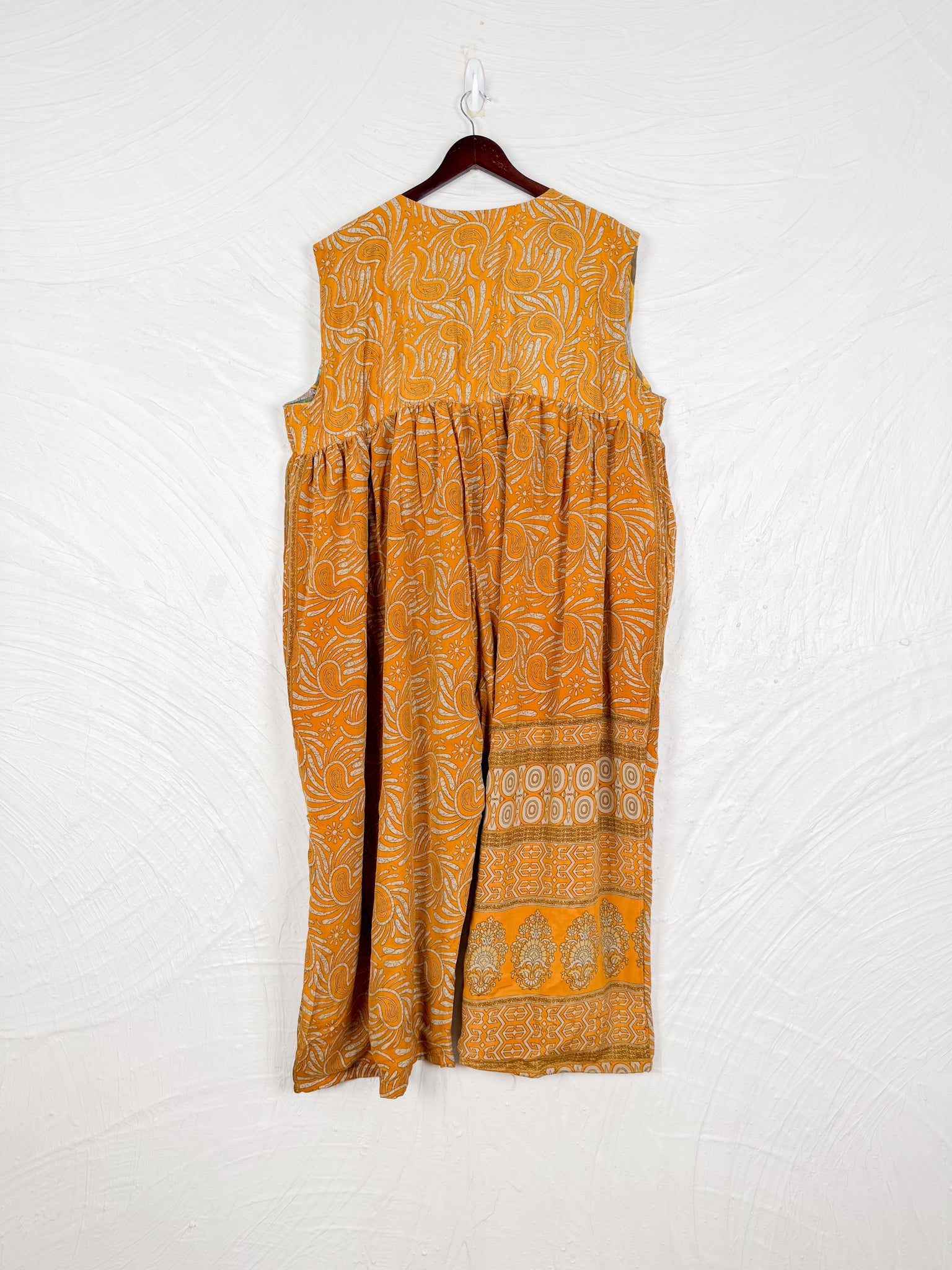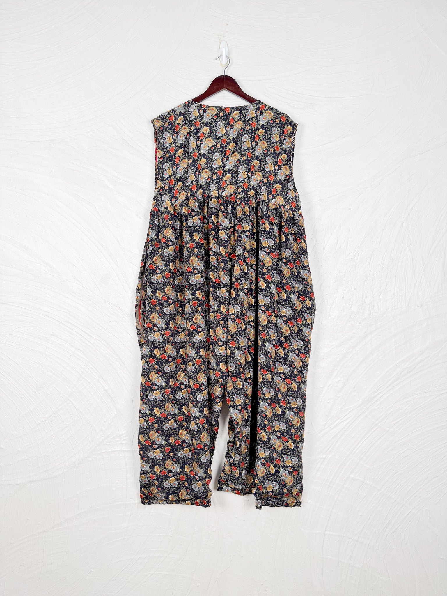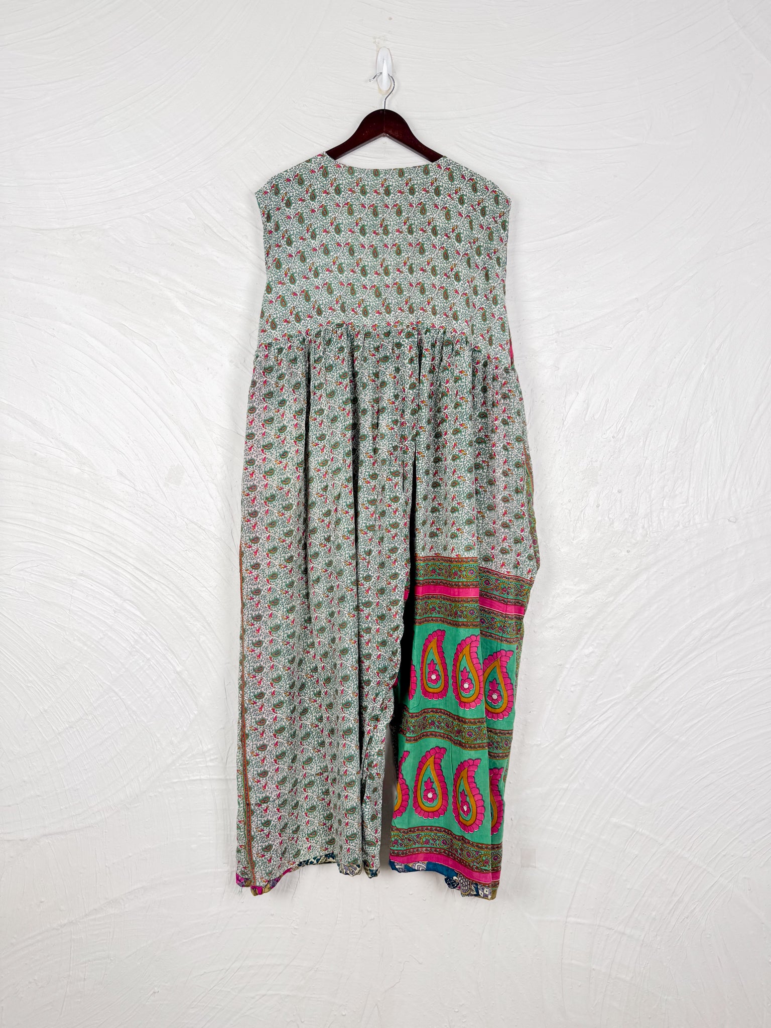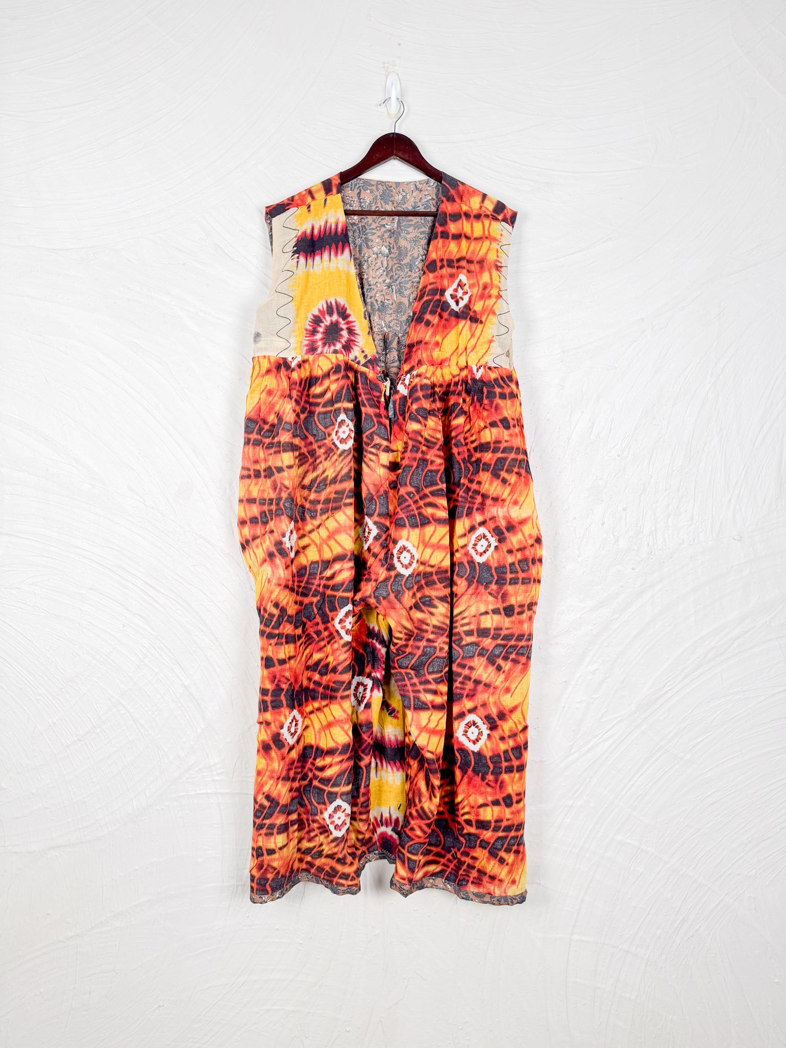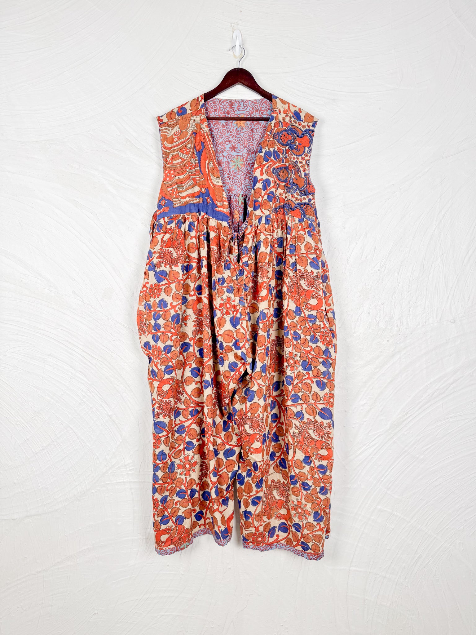 This reversible silk jumpsuit offers two distinct personalities: one side in vibrant, intricately patterned vintage Indian saree fabric, and the other in flowing, elegant silk. Its flattering V-neck, delicate ties, gathered waist, and wide, cropped legs provide ultimate comfort and breathability, making it a versatile piece of wearable art.
