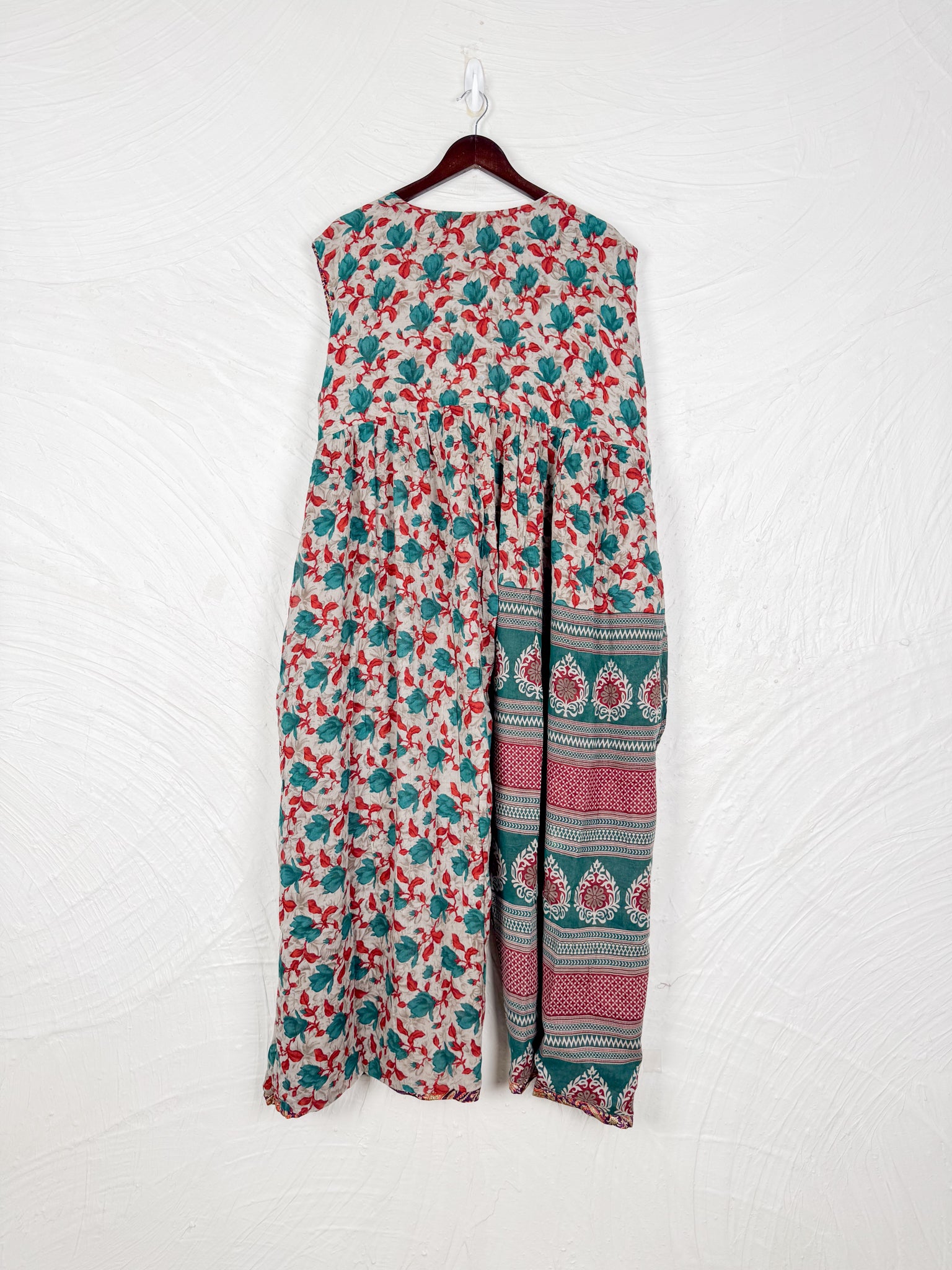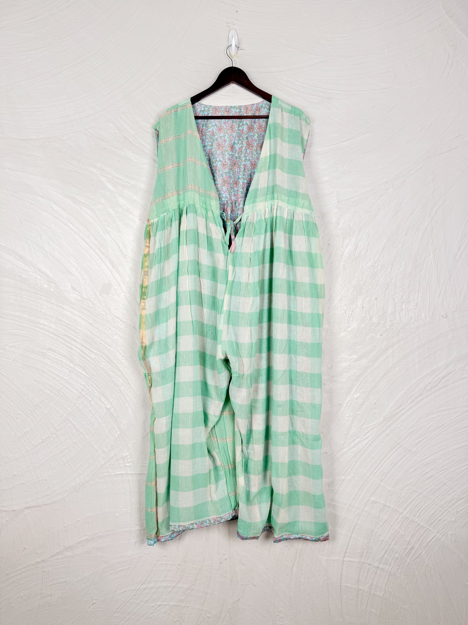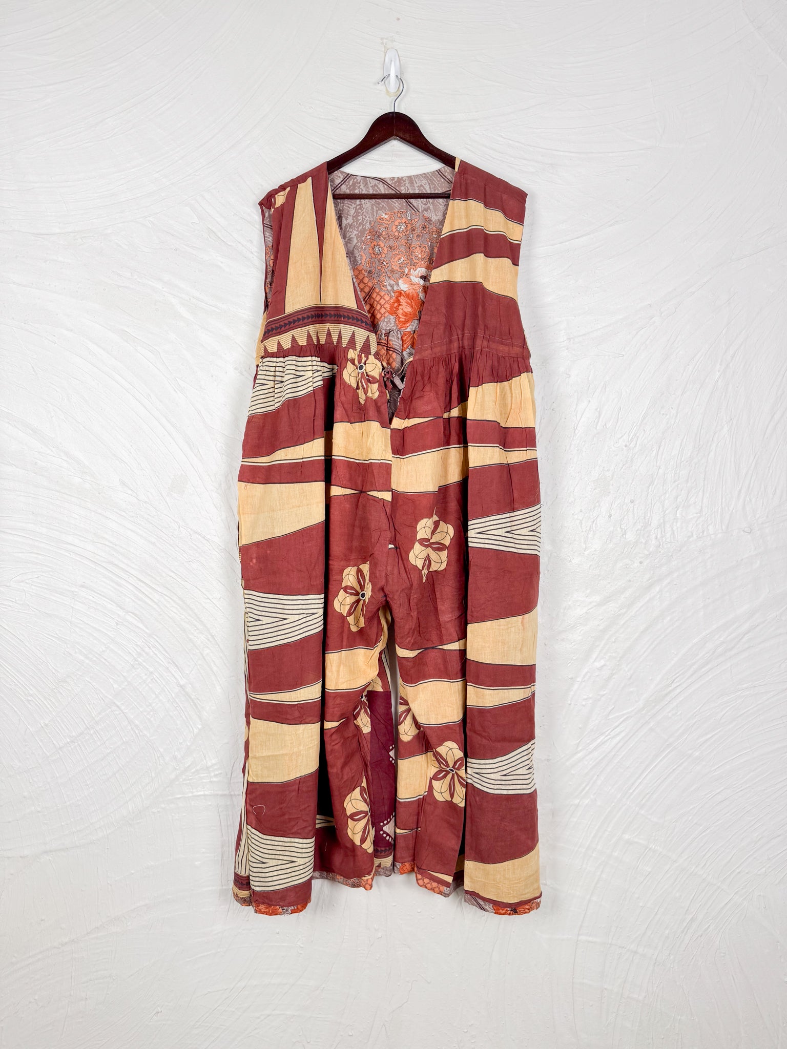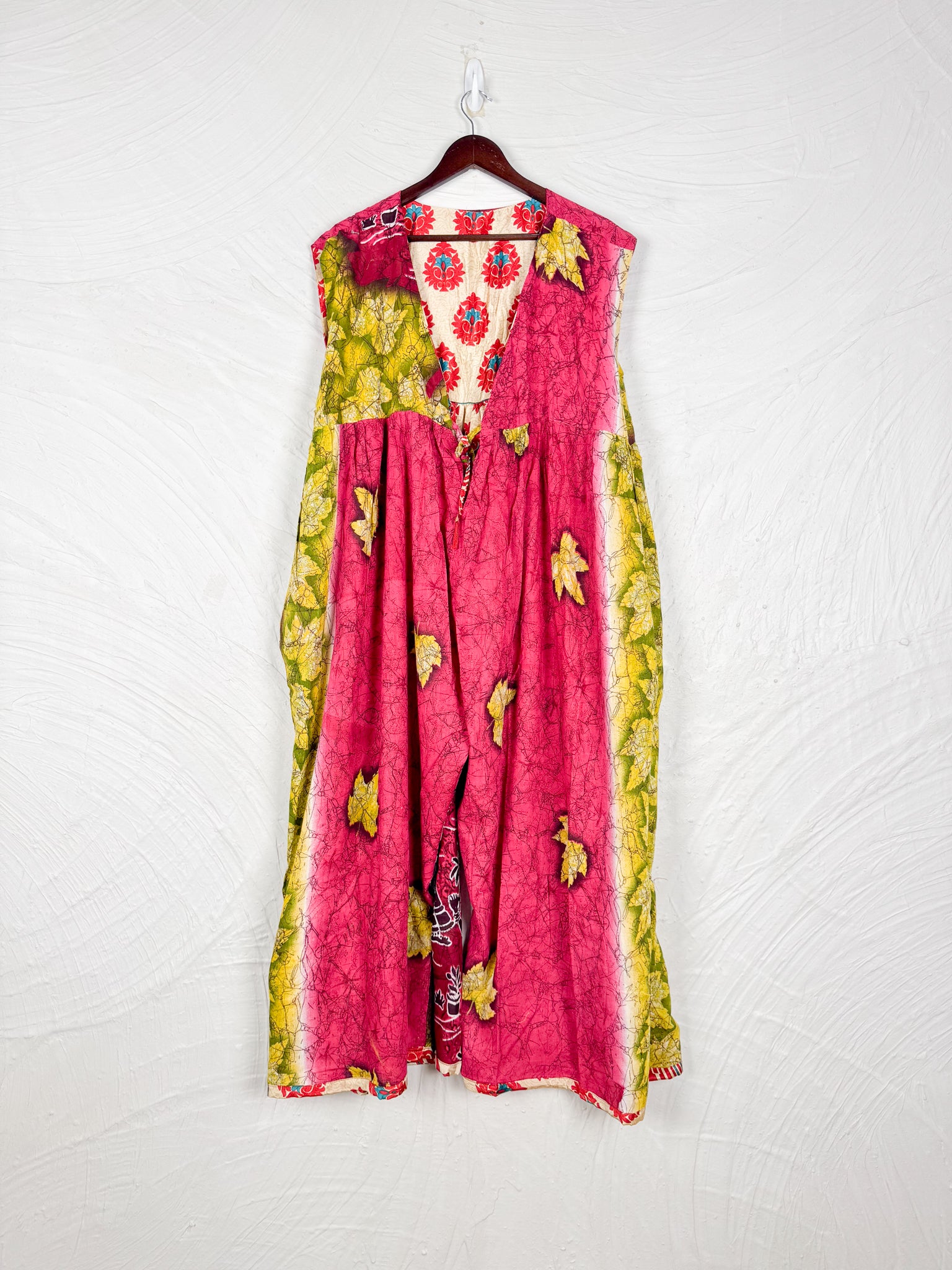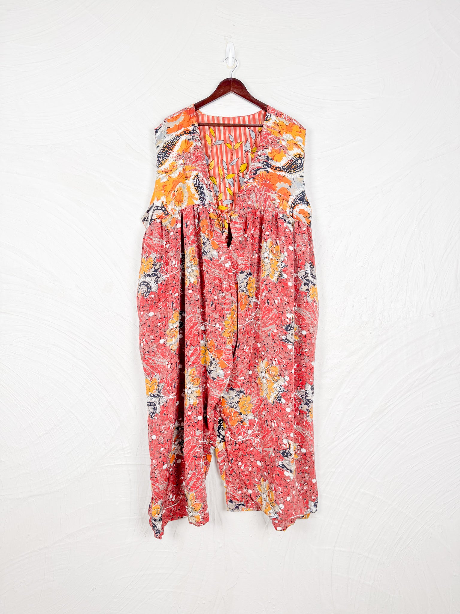 This reversible silk jumpsuit offers two distinct personalities: one side in vibrant, intricately patterned vintage Indian saree fabric, and the other in flowing, elegant silk. Its flattering V-neck, delicate ties, gathered waist, and wide, cropped legs provide ultimate comfort and breathability, making it a versatile piece of wearable art.