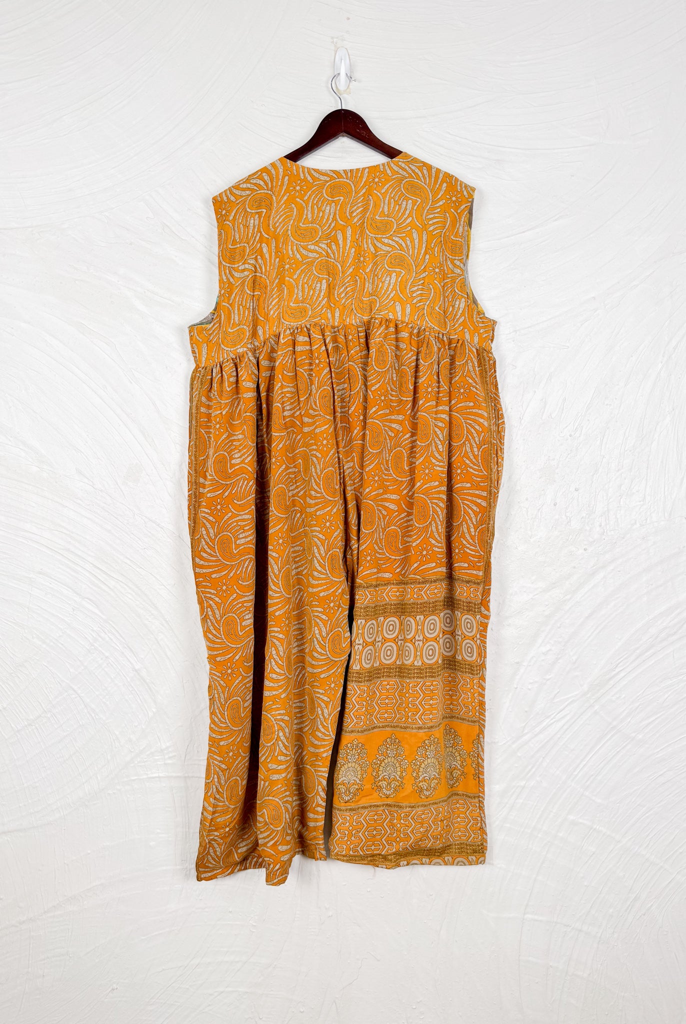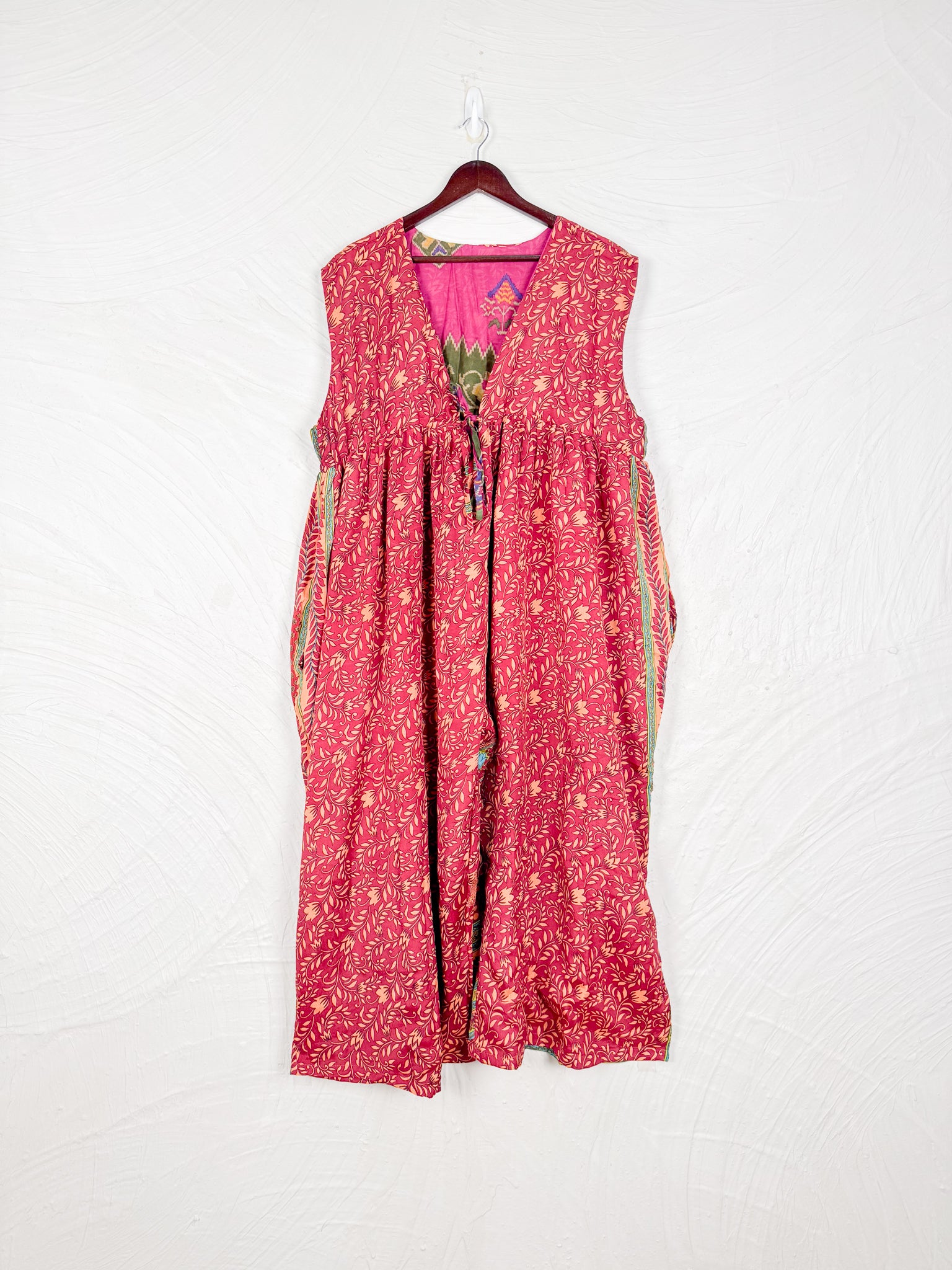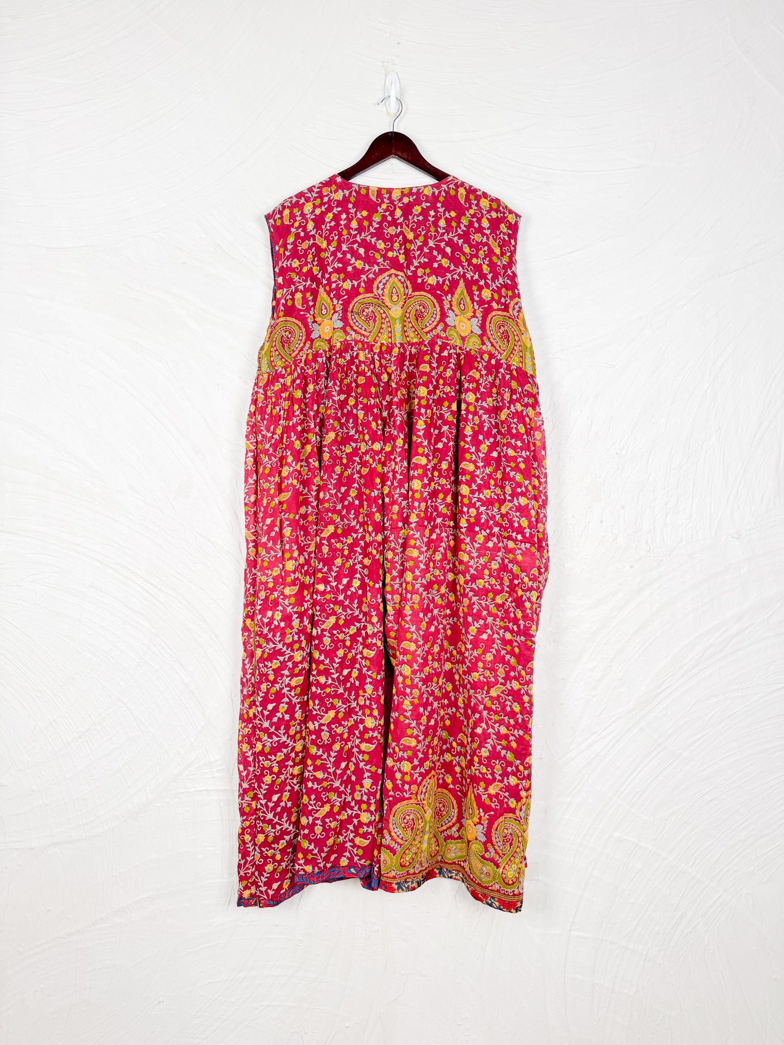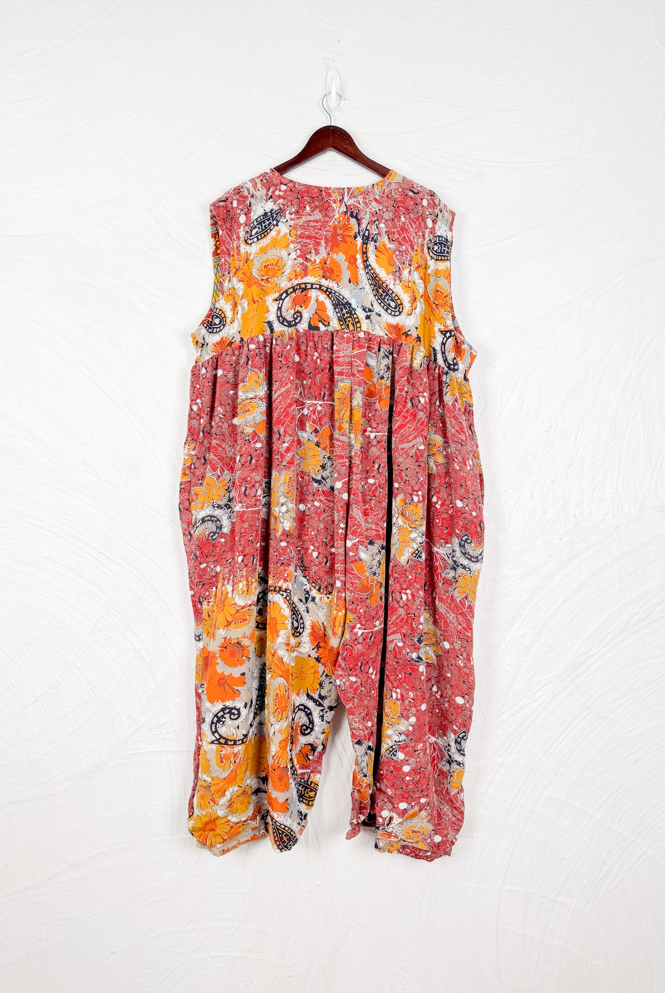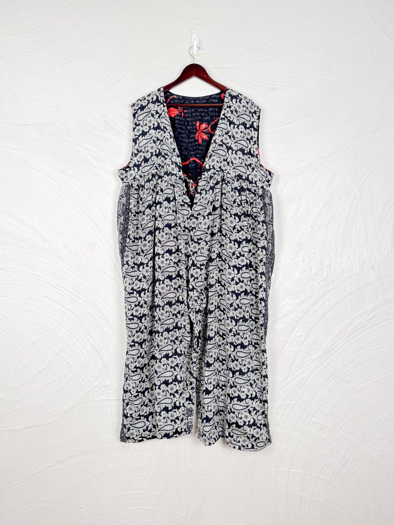 This reversible silk jumpsuit offers two distinct personalities: one side in vibrant, intricately patterned vintage Indian saree fabric, and the other in flowing, elegant silk. Its flattering V-neck, delicate ties, gathered waist, and wide, cropped legs provide ultimate comfort and breathability, making it a versatile piece of wearable art.
