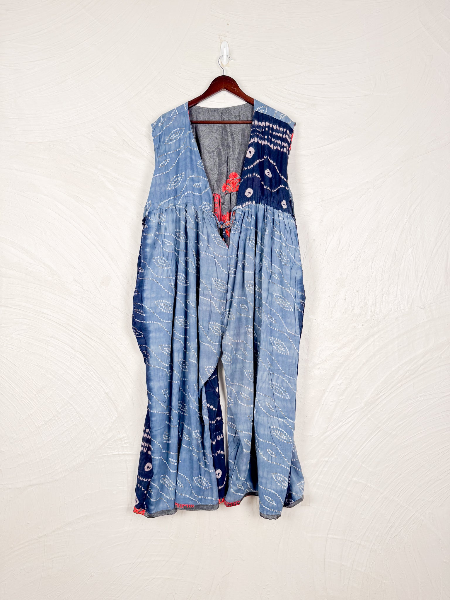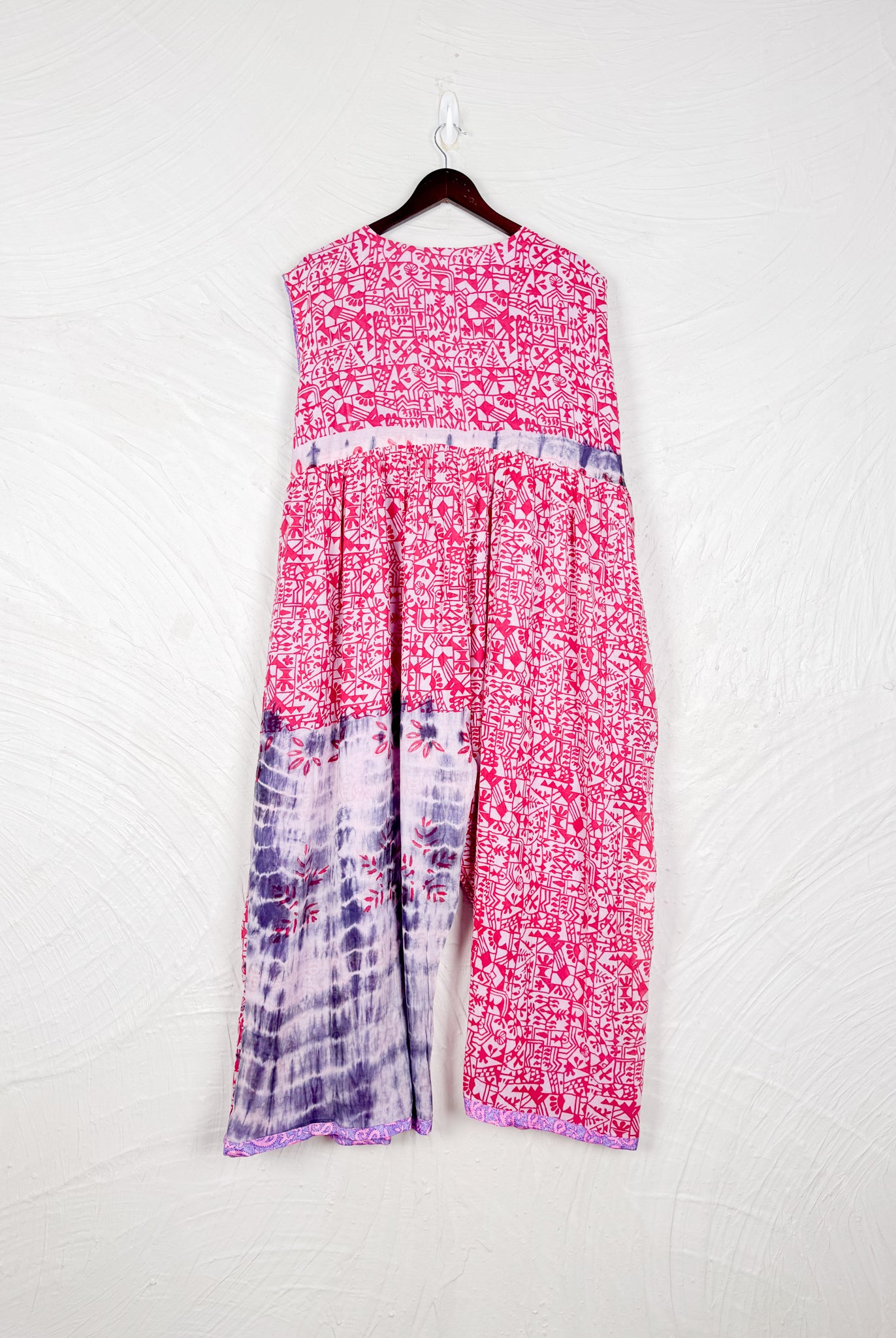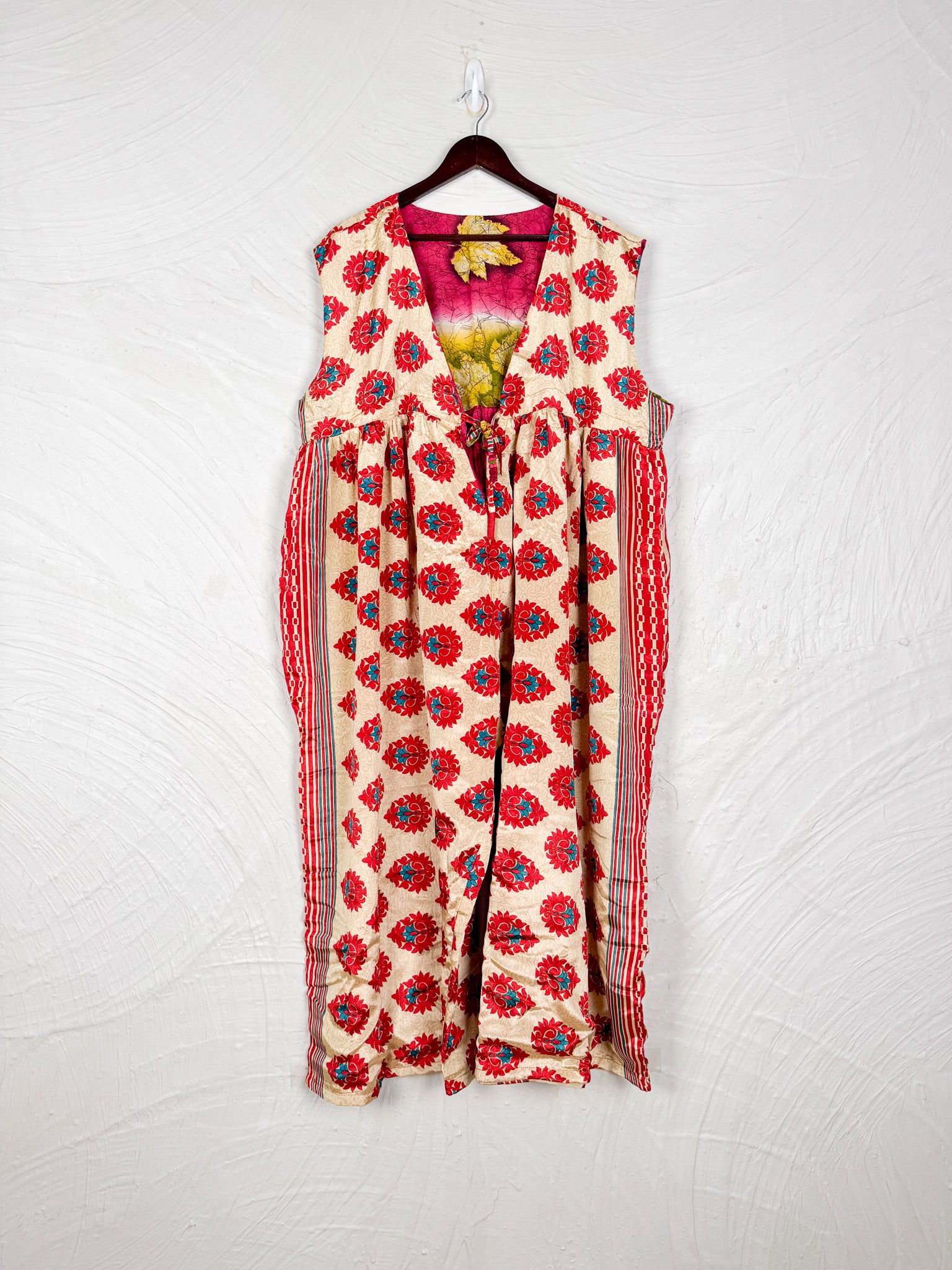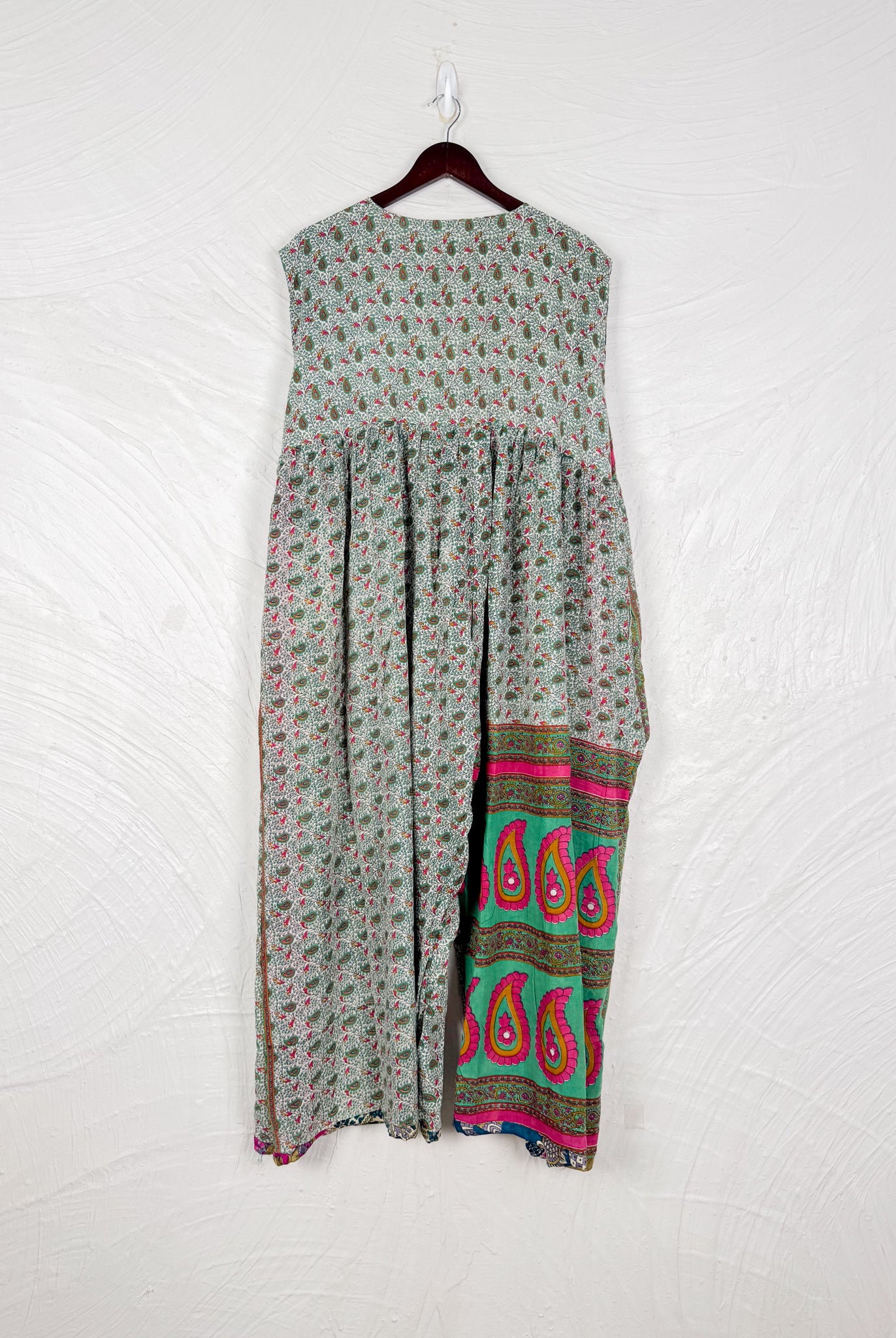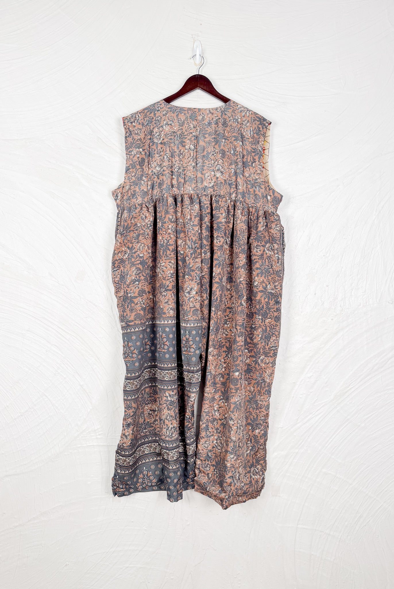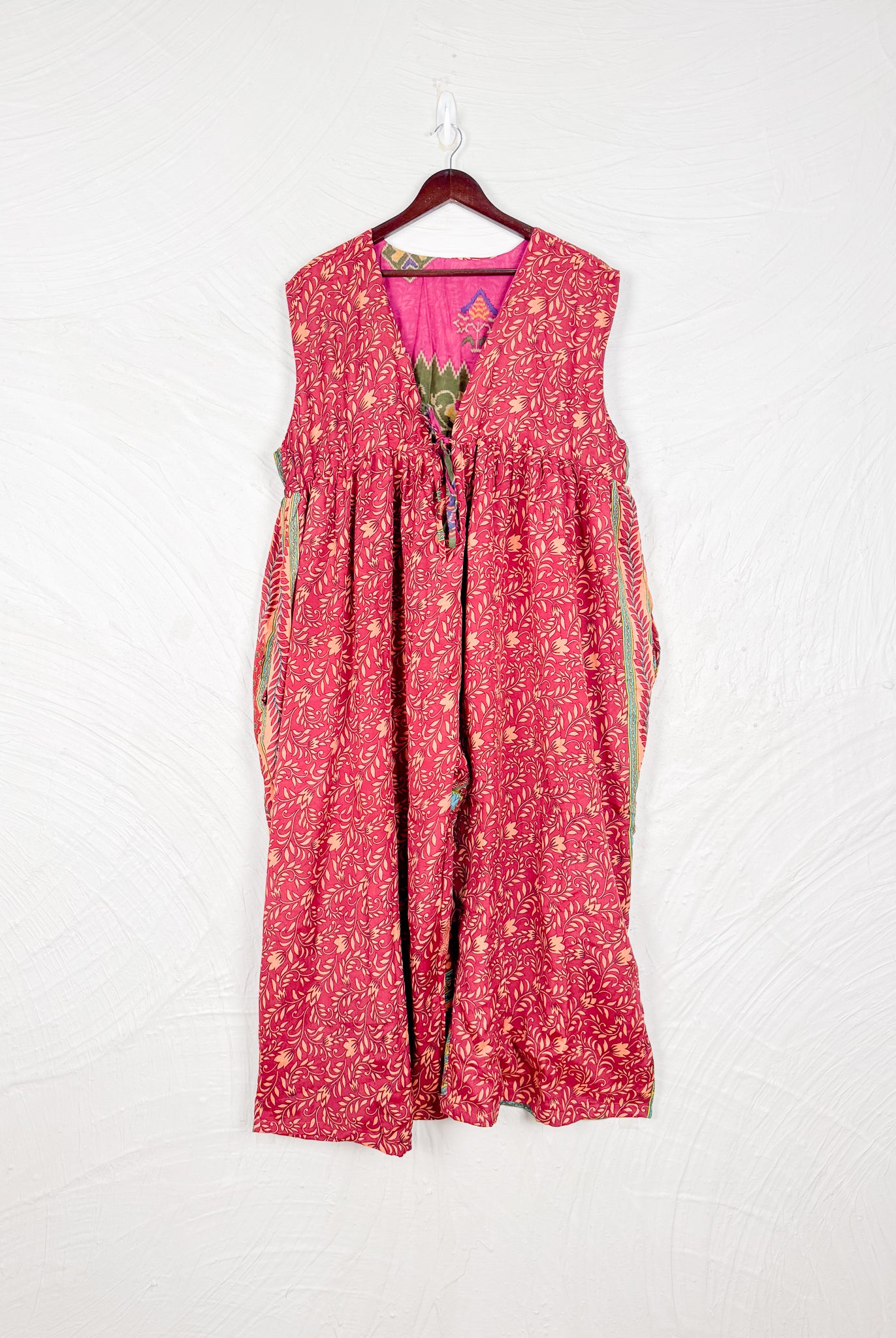 This reversible silk jumpsuit offers two distinct personalities: one side in vibrant, intricately patterned vintage Indian saree fabric, and the other in flowing, elegant silk. Its flattering V-neck, delicate ties, gathered waist, and wide, cropped legs provide ultimate comfort and breathability, making it a versatile piece of wearable art.