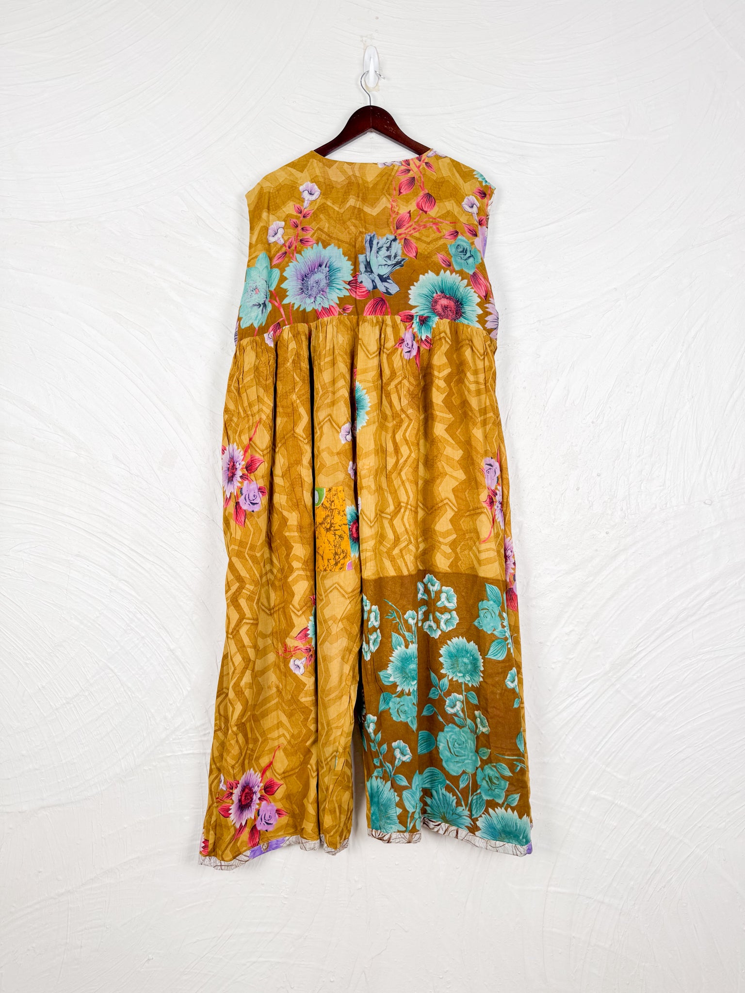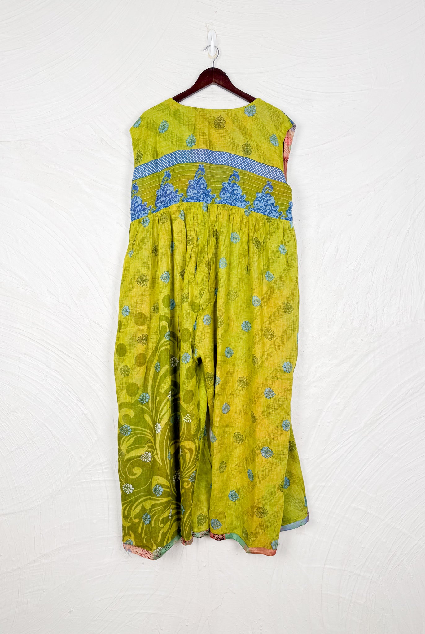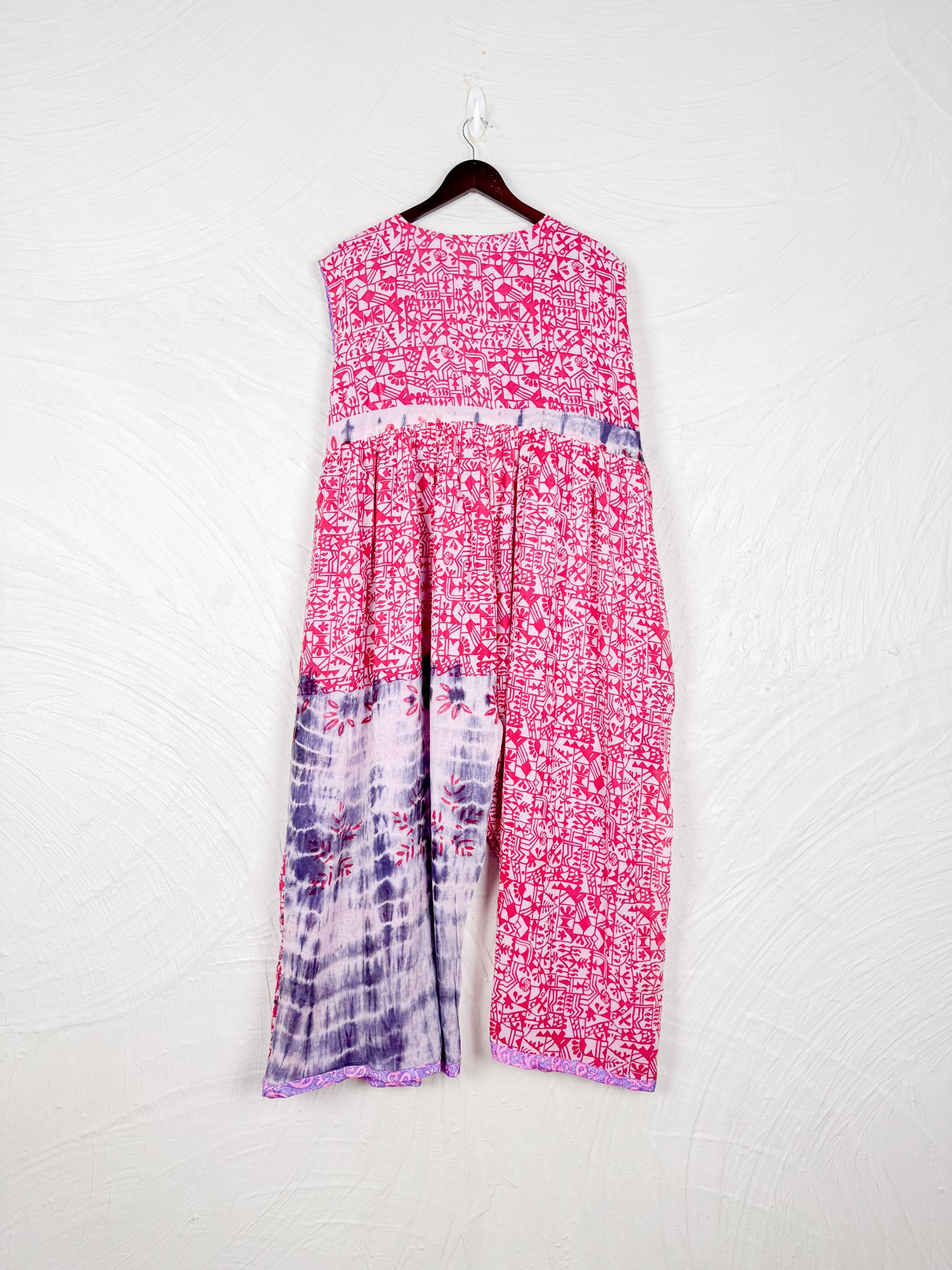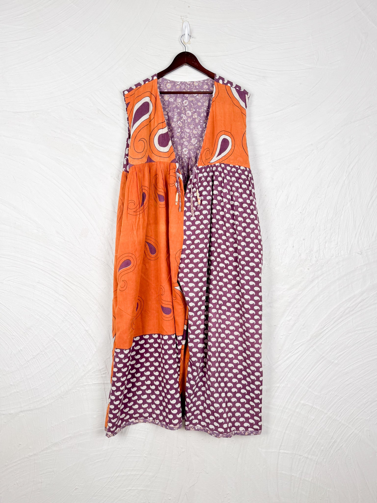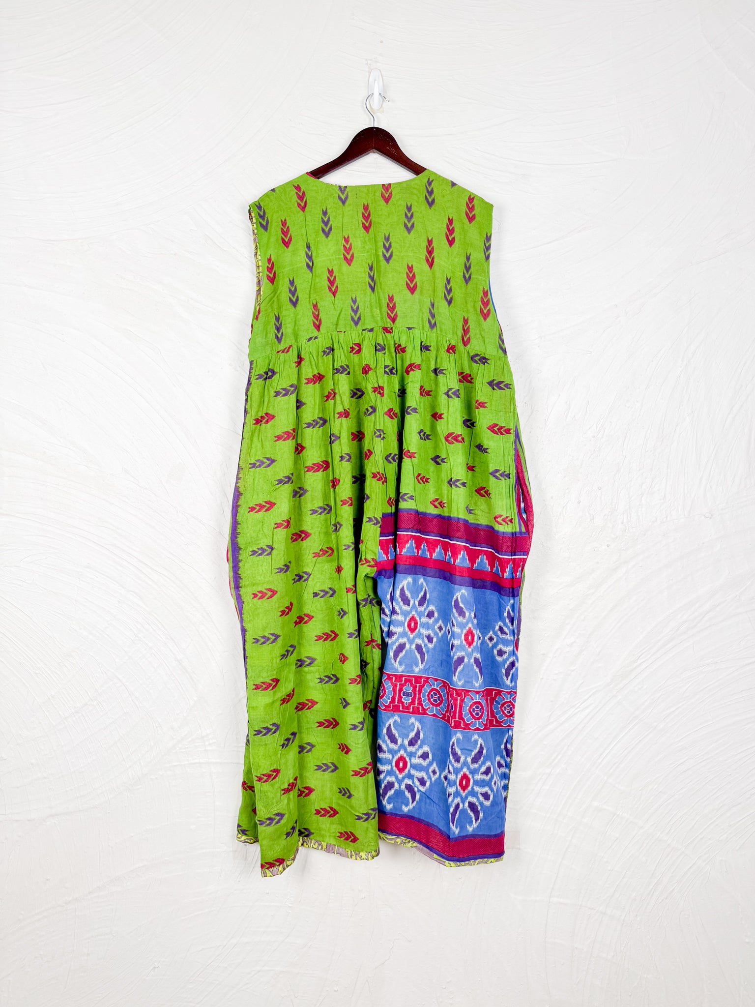 This reversible silk jumpsuit offers two distinct personalities: one side in vibrant, intricately patterned vintage Indian saree fabric, and the other in flowing, elegant silk. Its flattering V-neck, delicate ties, gathered waist, and wide, cropped legs provide ultimate comfort and breathability, making it a versatile piece of wearable art.