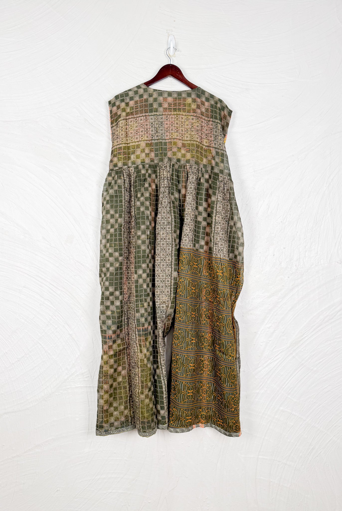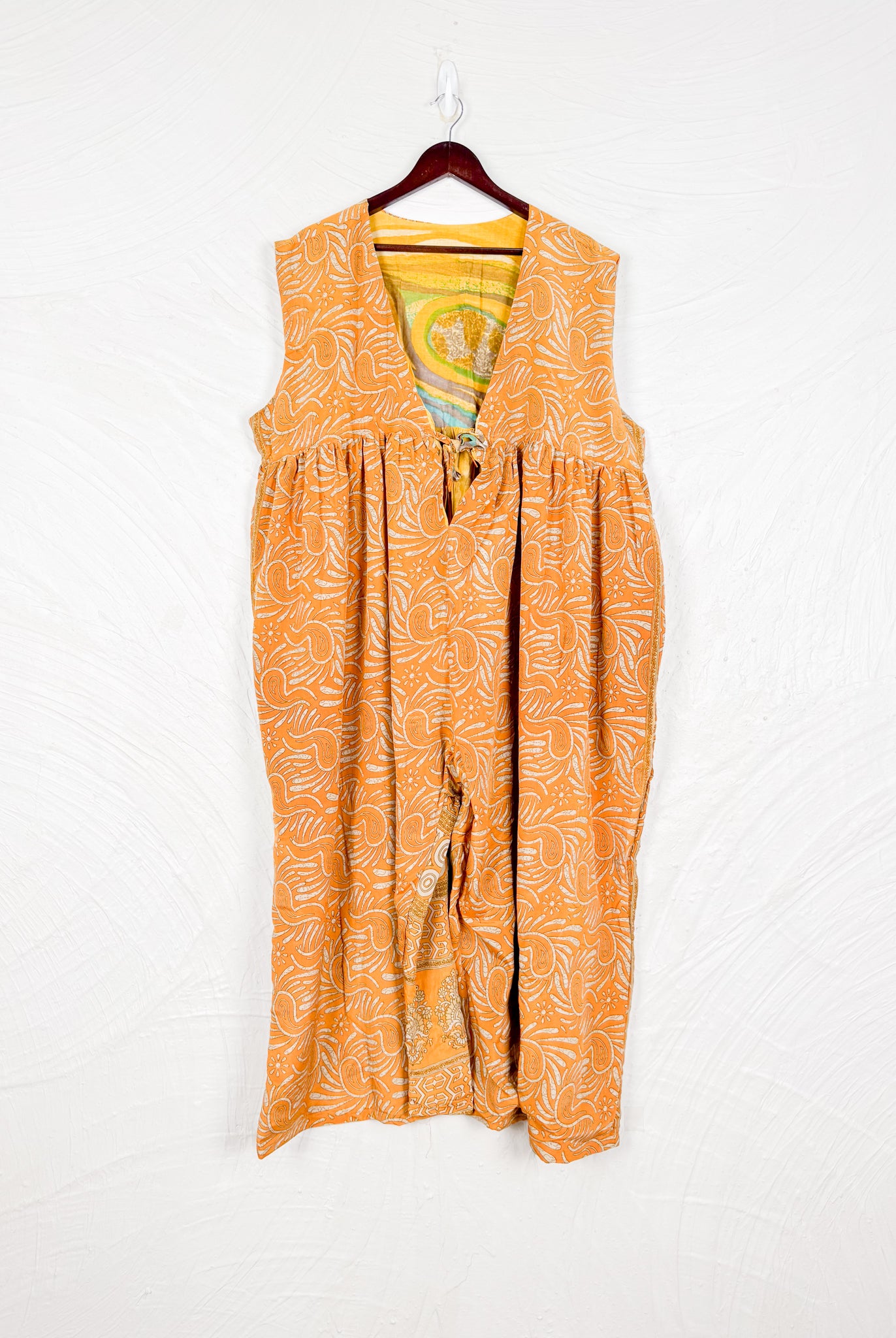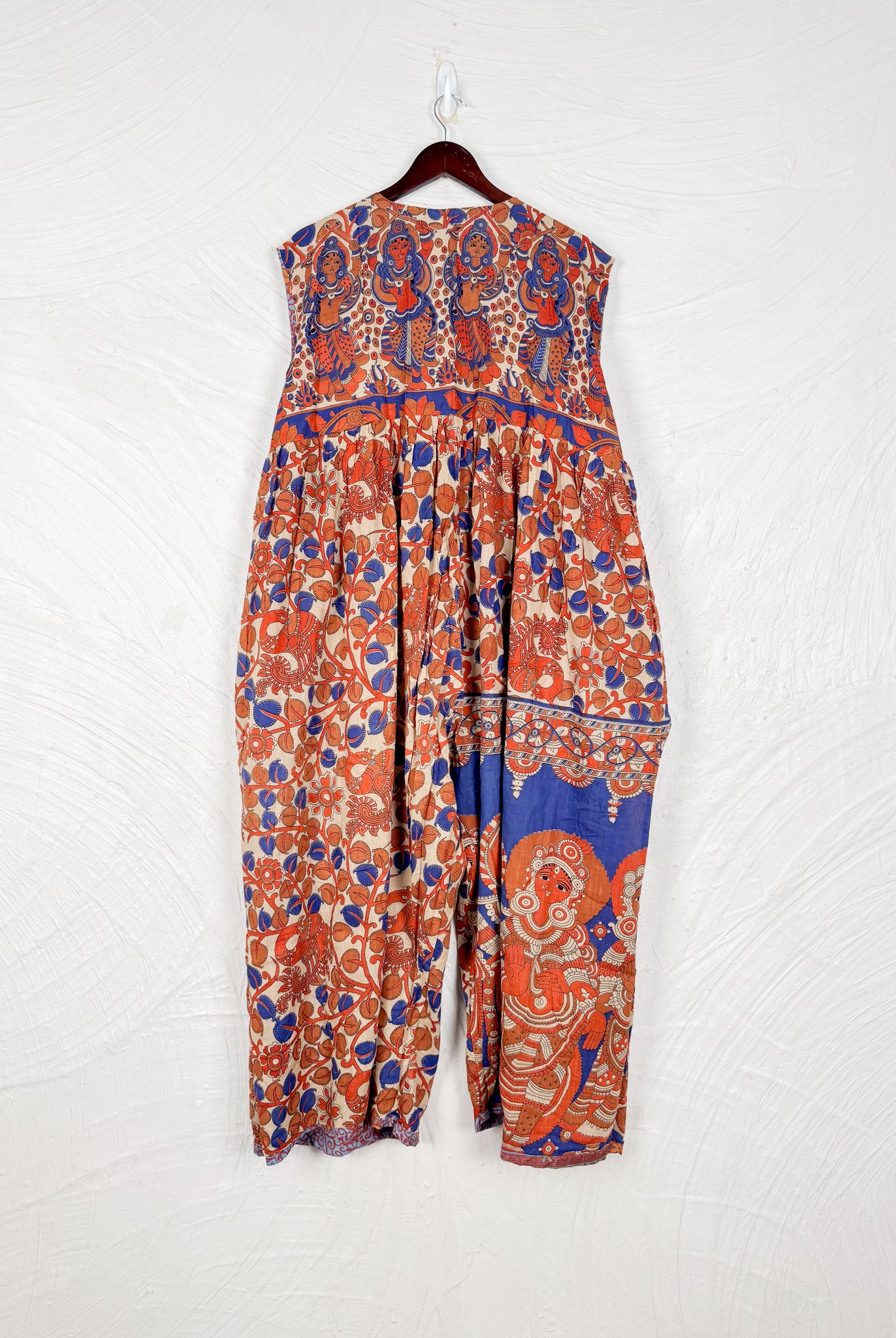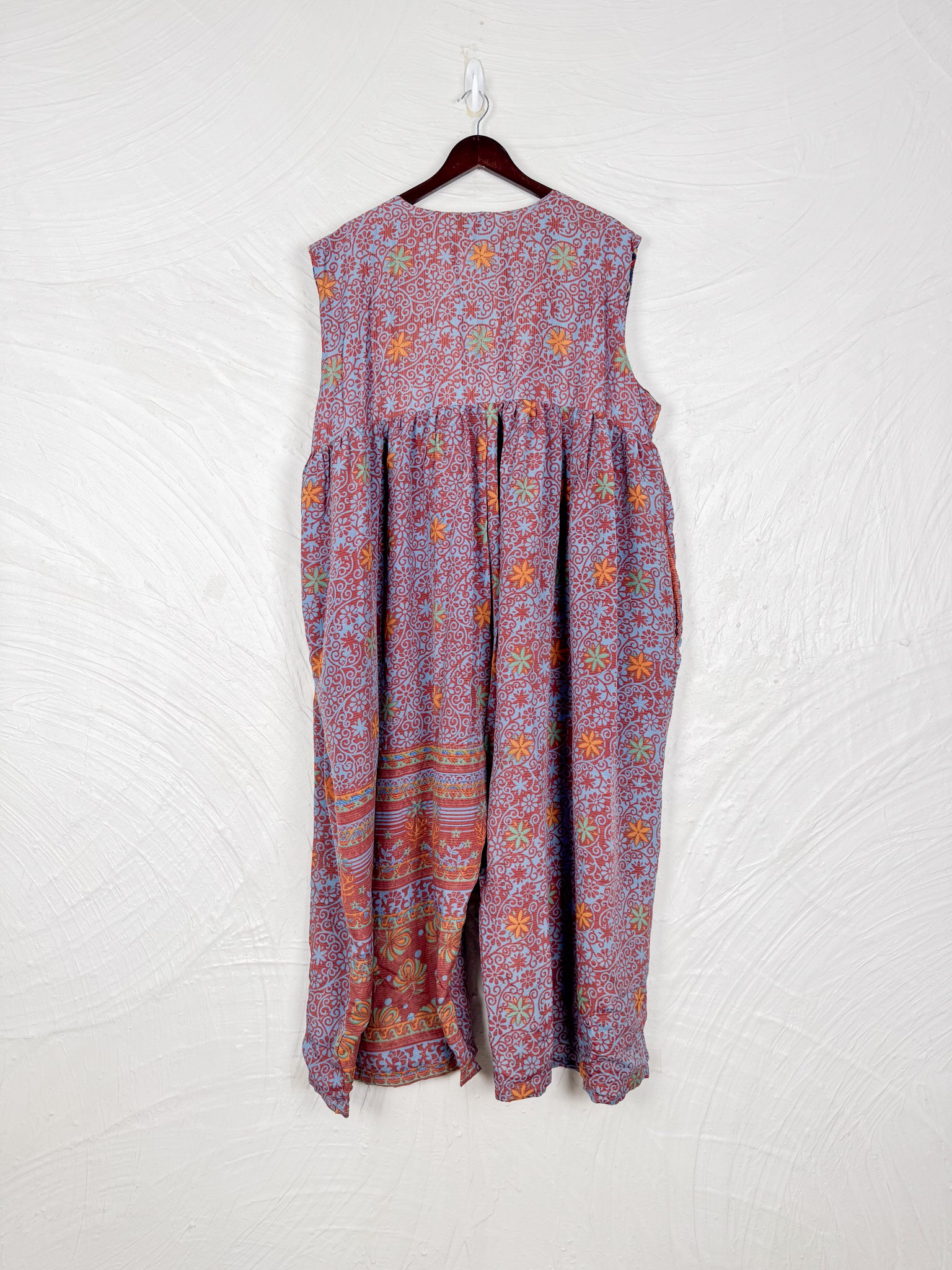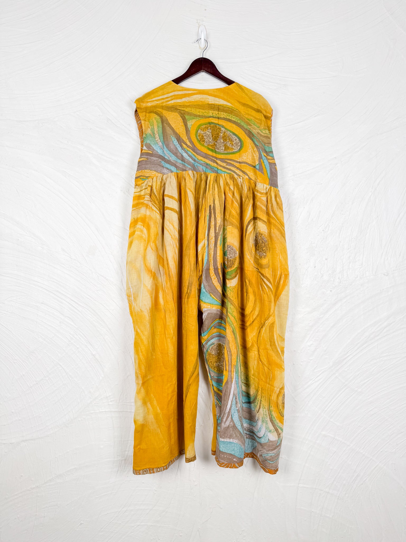 This reversible silk jumpsuit offers two distinct personalities: one side in vibrant, intricately patterned vintage Indian saree fabric, and the other in flowing, elegant silk. Its flattering V-neck, delicate ties, gathered waist, and wide, cropped legs provide ultimate comfort and breathability, making it a versatile piece of wearable art.