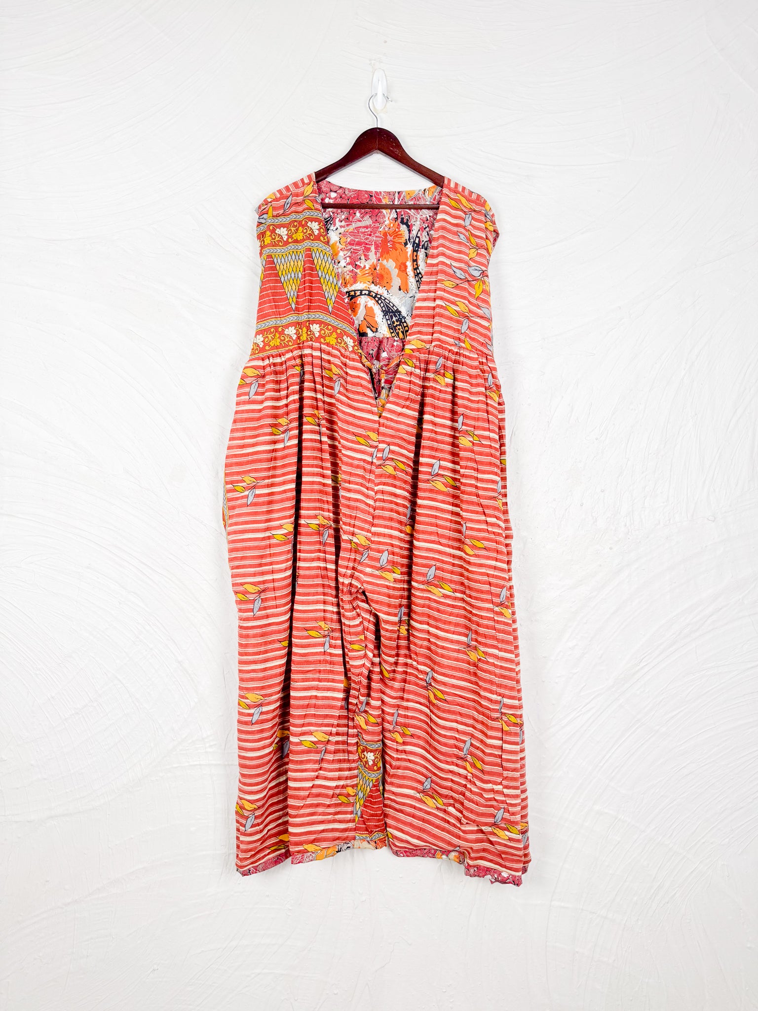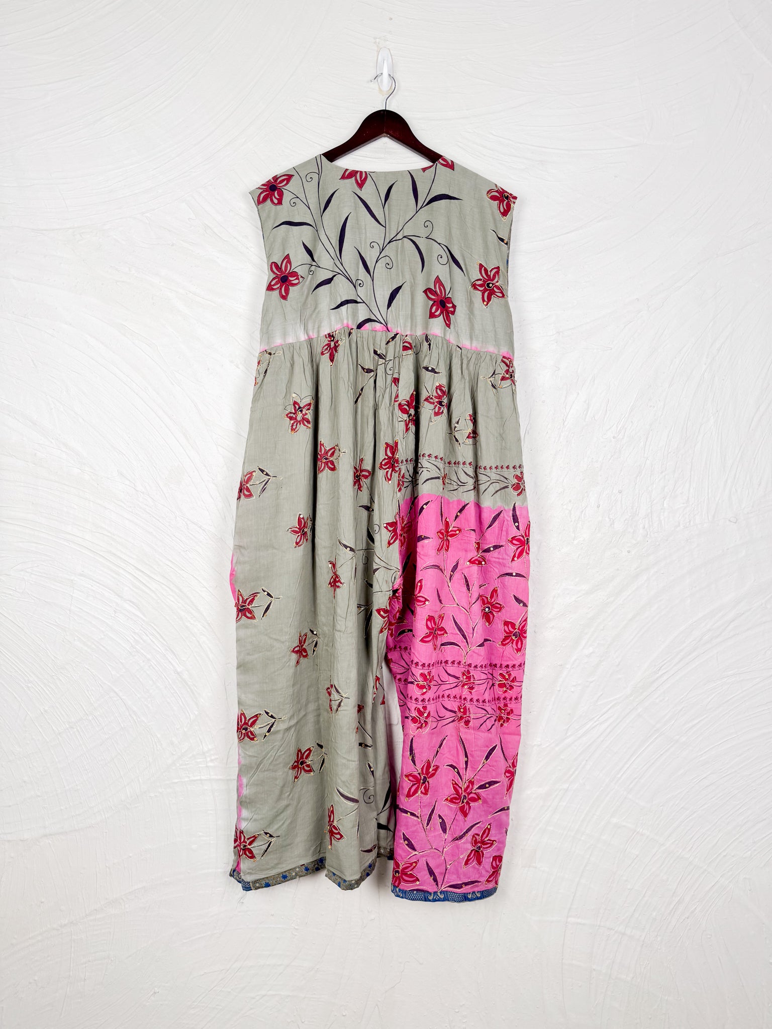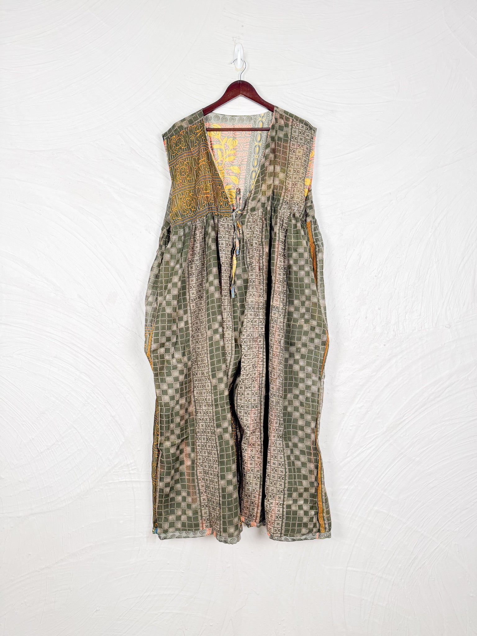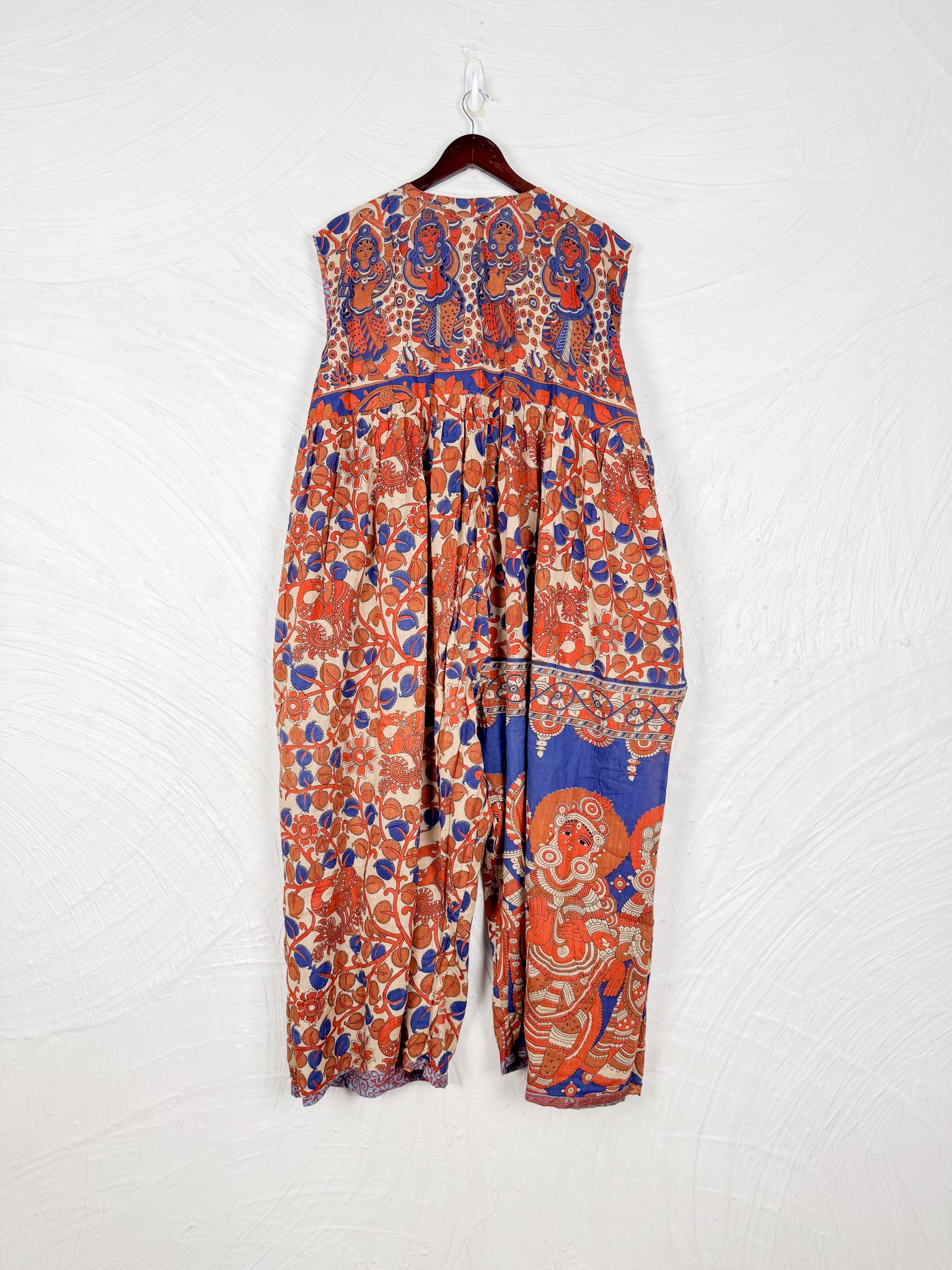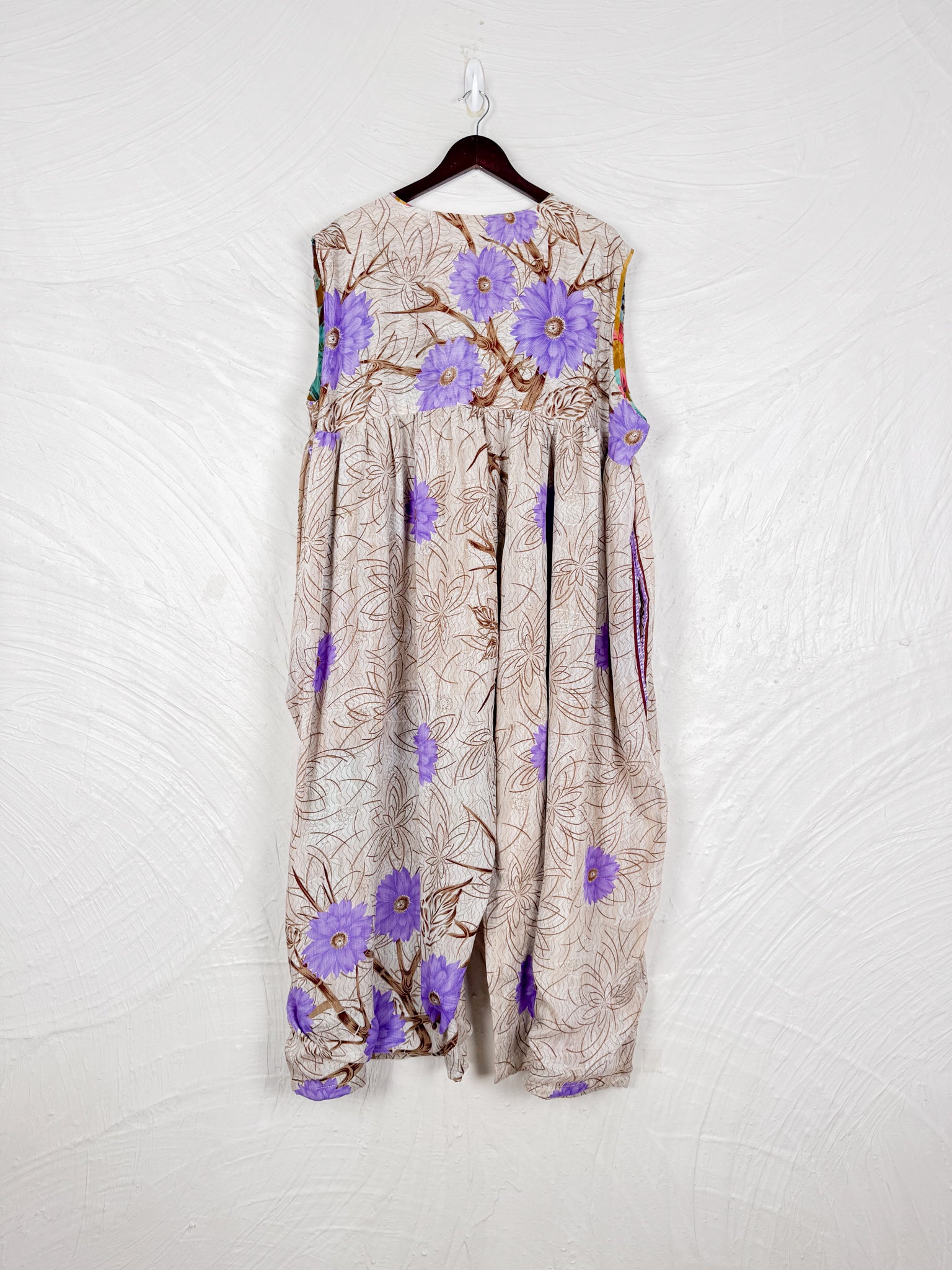 This reversible silk jumpsuit offers two distinct personalities: one side in vibrant, intricately patterned vintage Indian saree fabric, and the other in flowing, elegant silk. Its flattering V-neck, delicate ties, gathered waist, and wide, cropped legs provide ultimate comfort and breathability, making it a versatile piece of wearable art.