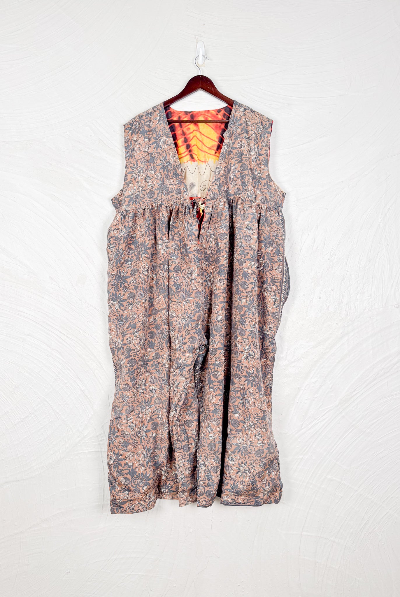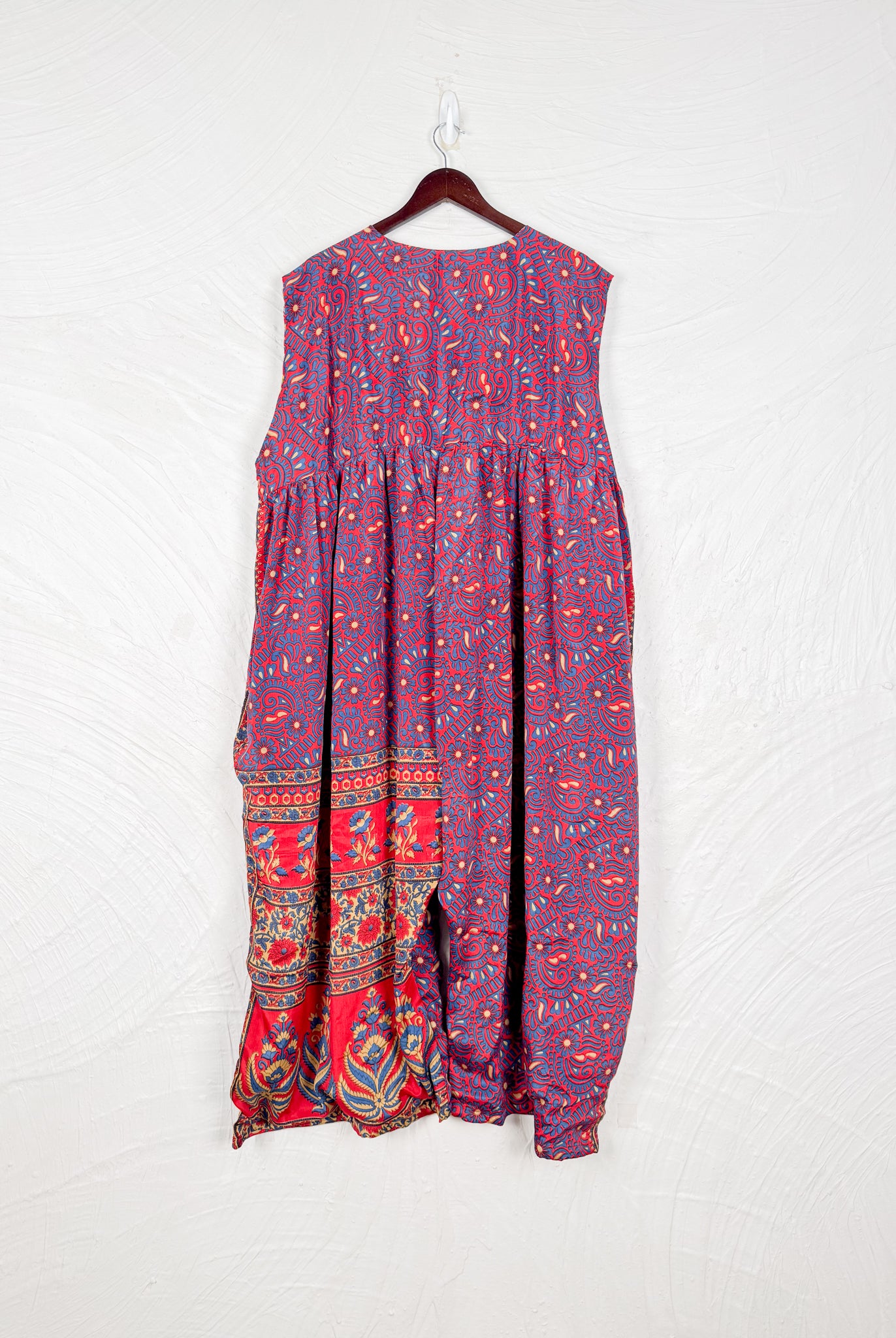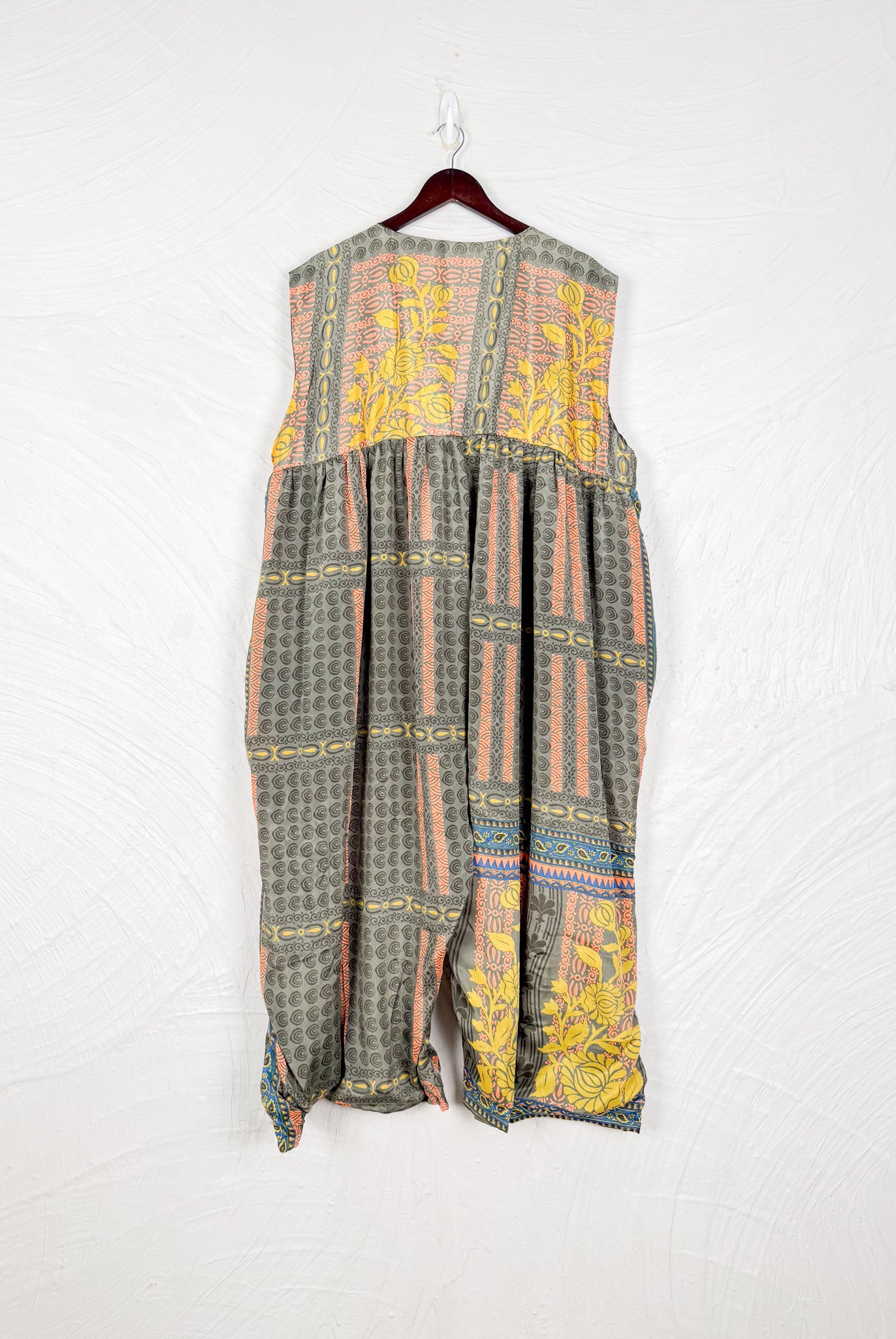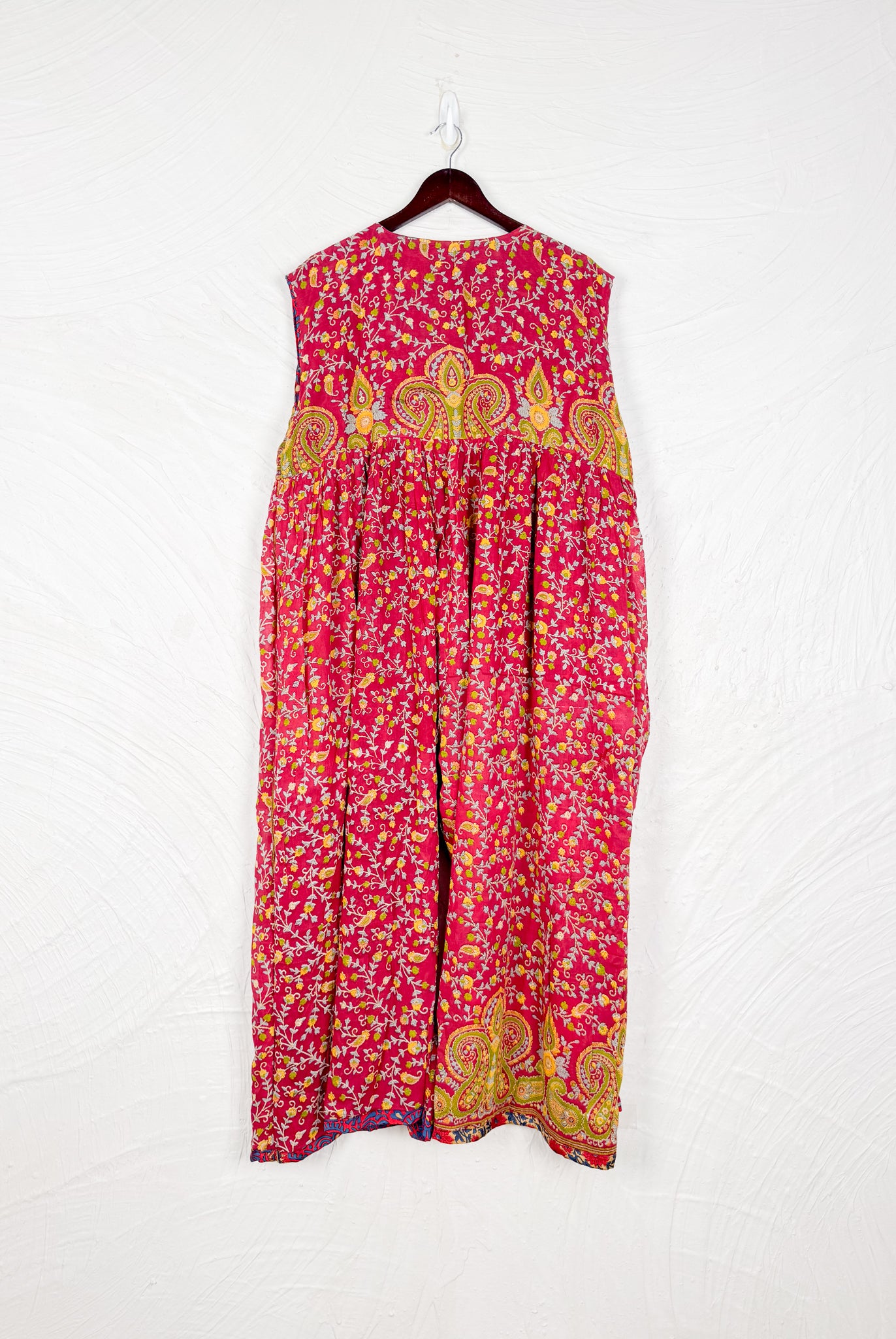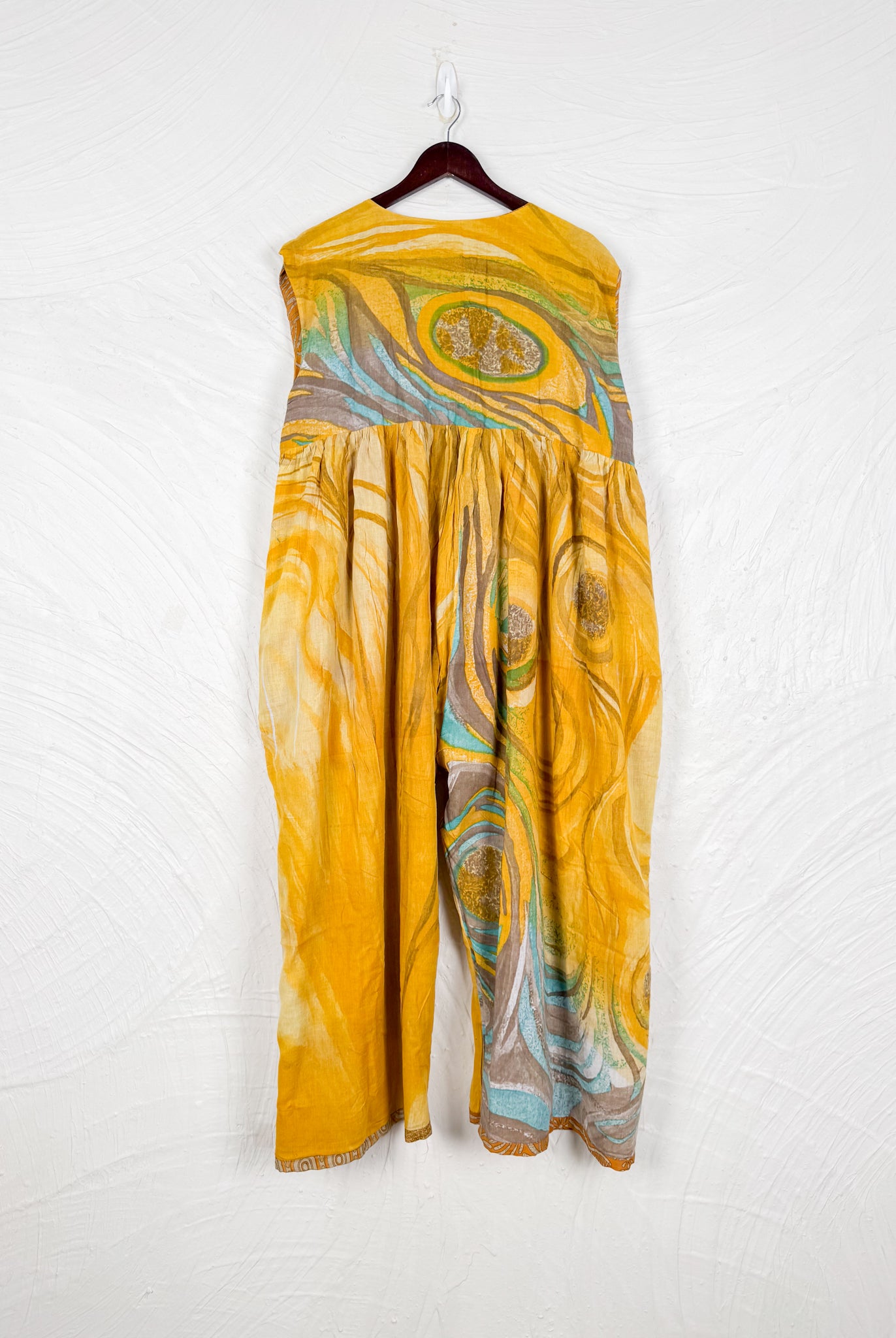 This reversible silk jumpsuit offers two distinct personalities: one side in vibrant, intricately patterned vintage Indian saree fabric, and the other in flowing, elegant silk. Its flattering V-neck, delicate ties, gathered waist, and wide, cropped legs provide ultimate comfort and breathability, making it a versatile piece of wearable art.