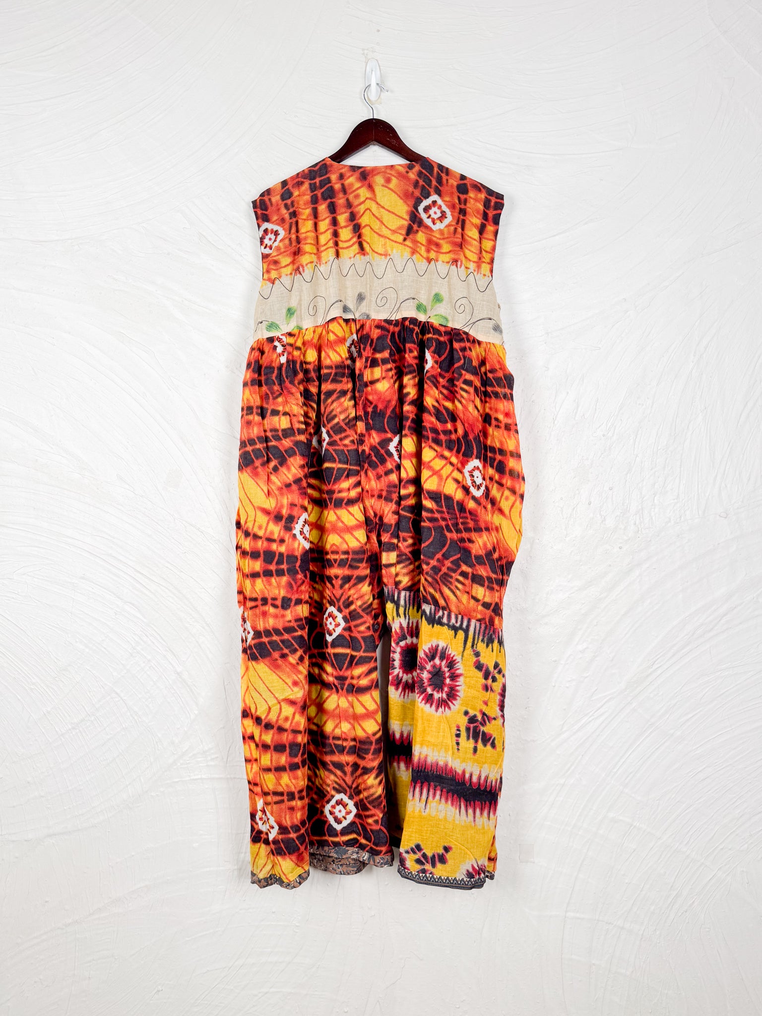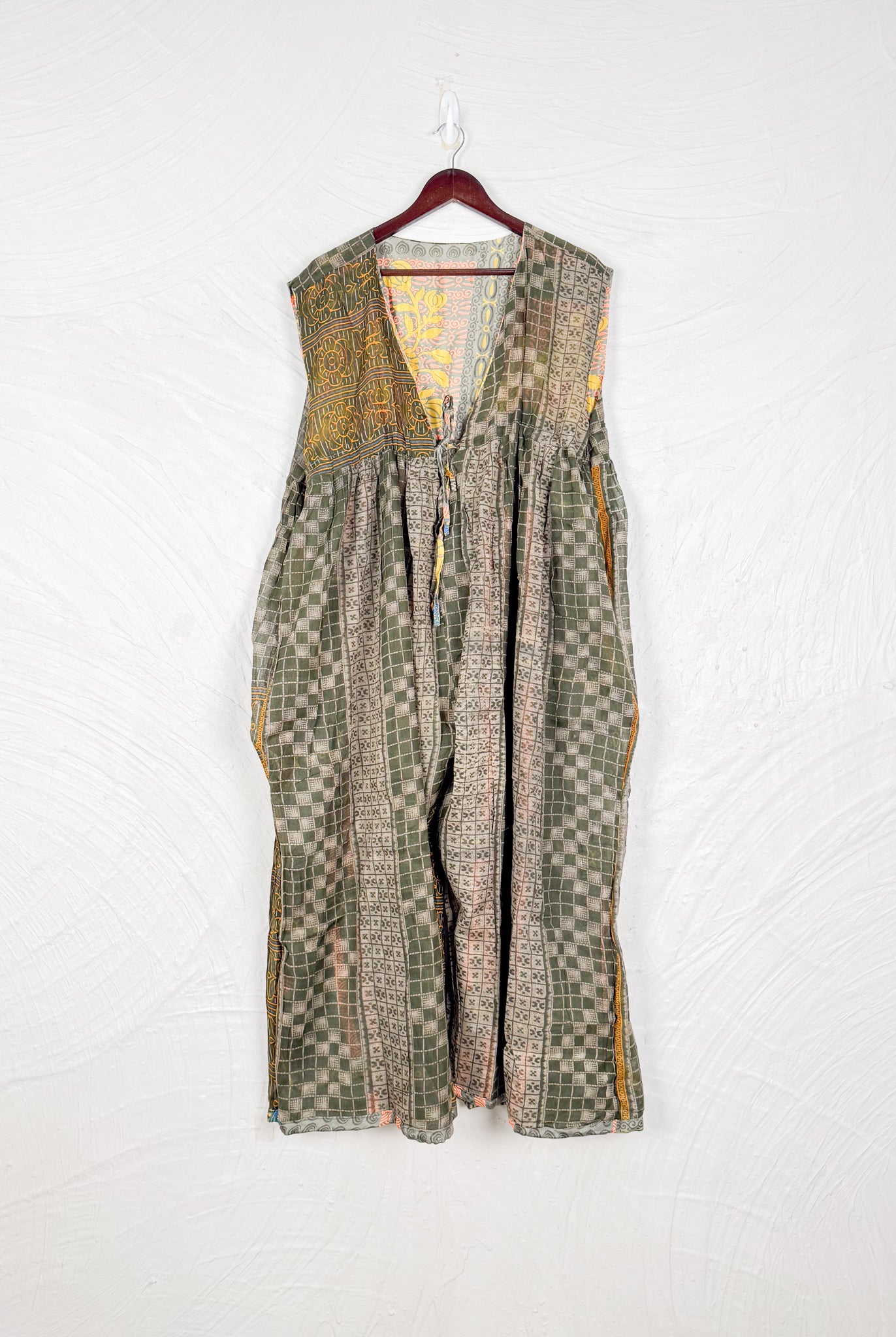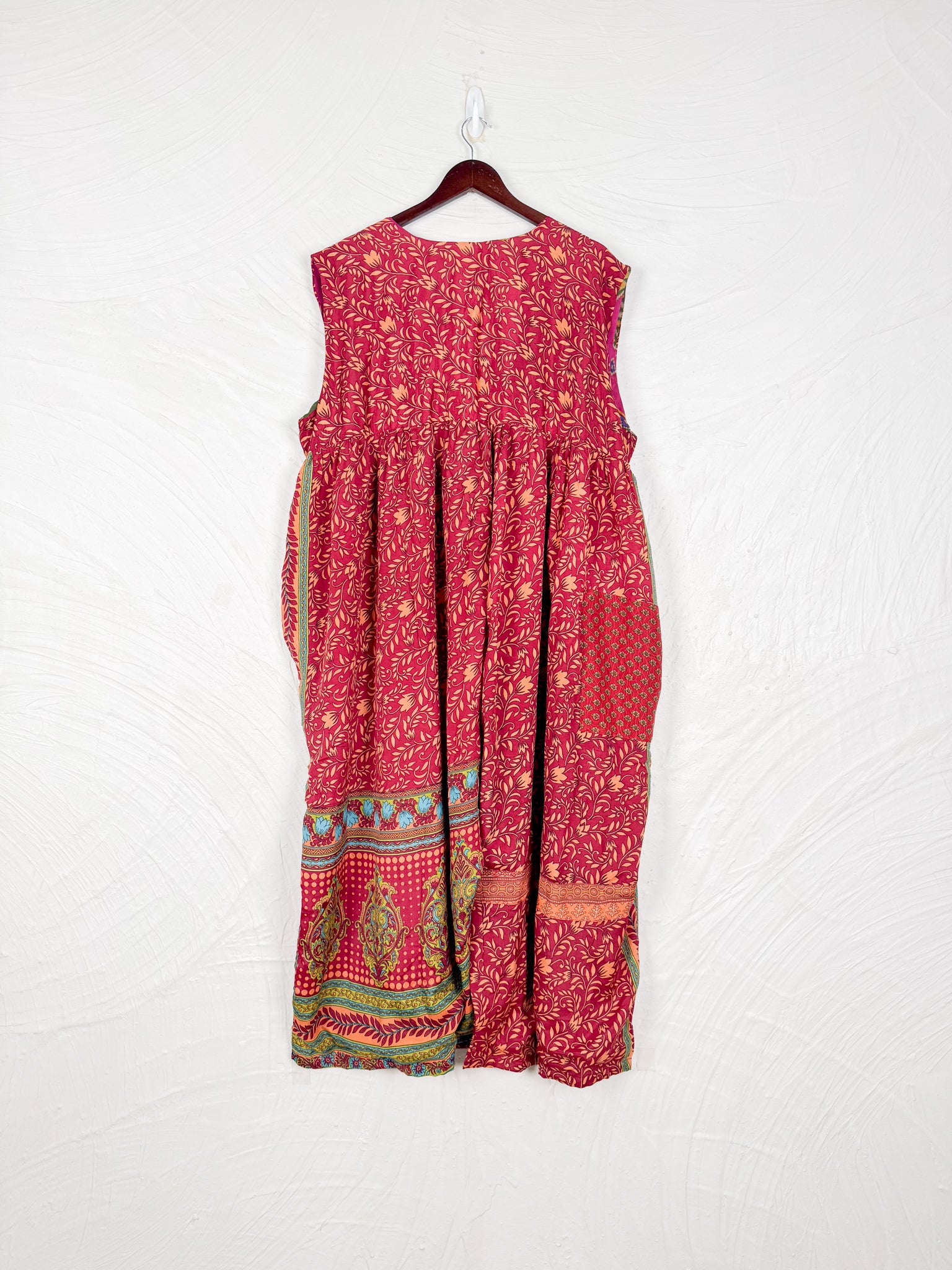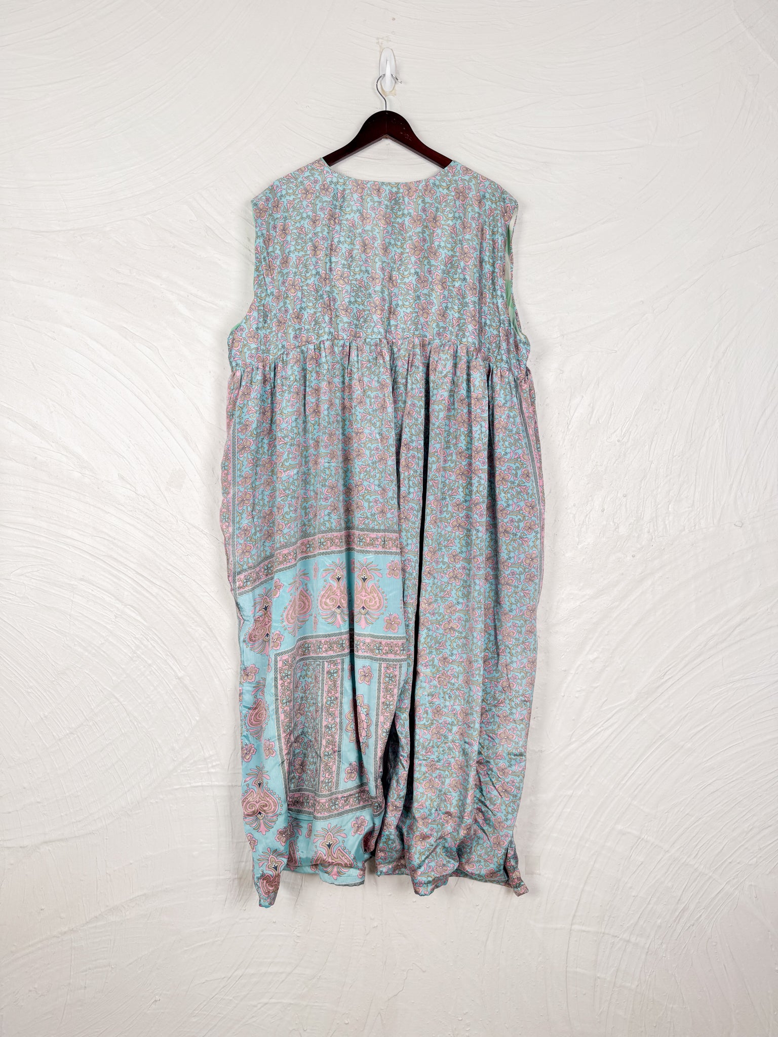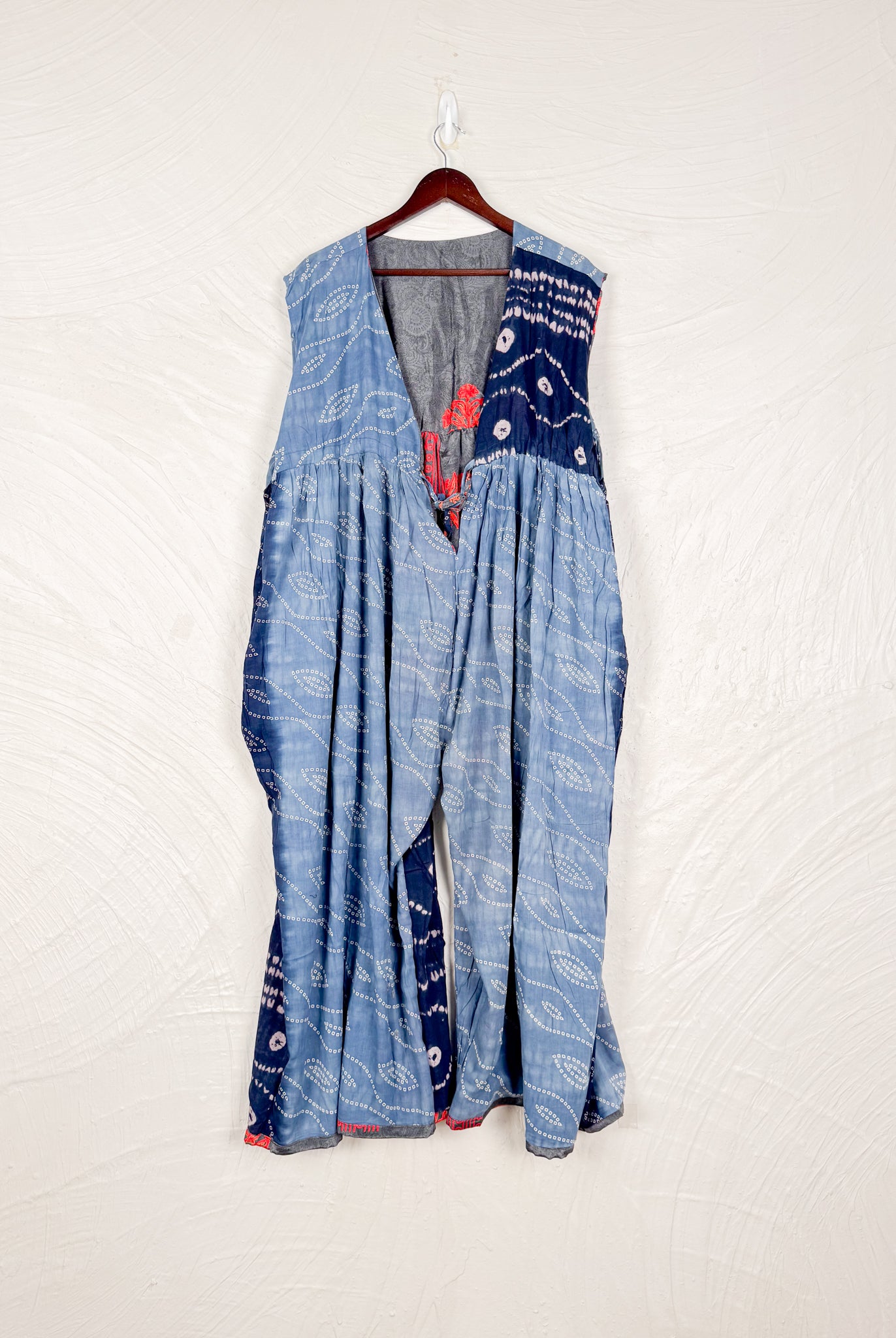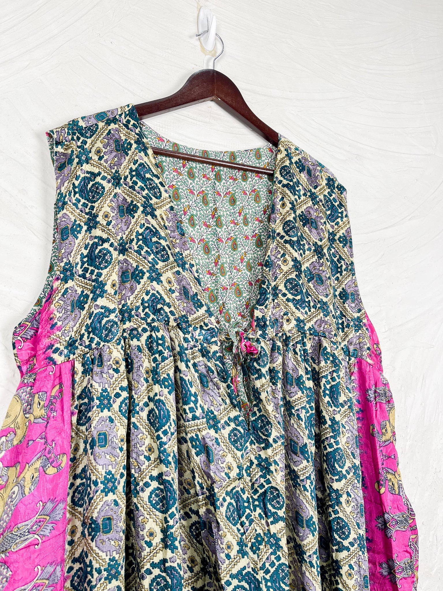 This reversible silk jumpsuit offers two distinct personalities: one side in vibrant, intricately patterned vintage Indian saree fabric, and the other in flowing, elegant silk. Its flattering V-neck, delicate ties, gathered waist, and wide, cropped legs provide ultimate comfort and breathability, making it a versatile piece of wearable art.