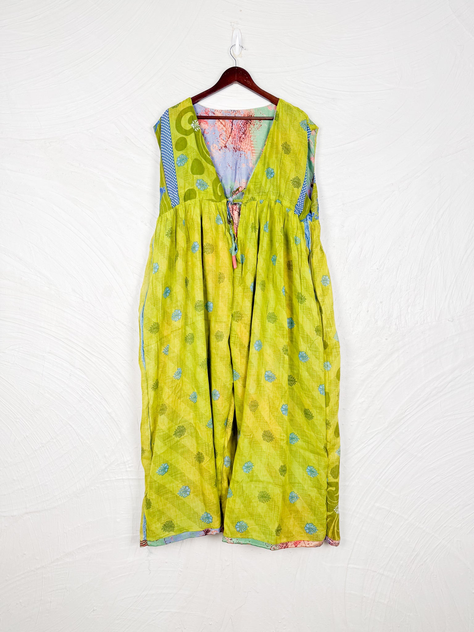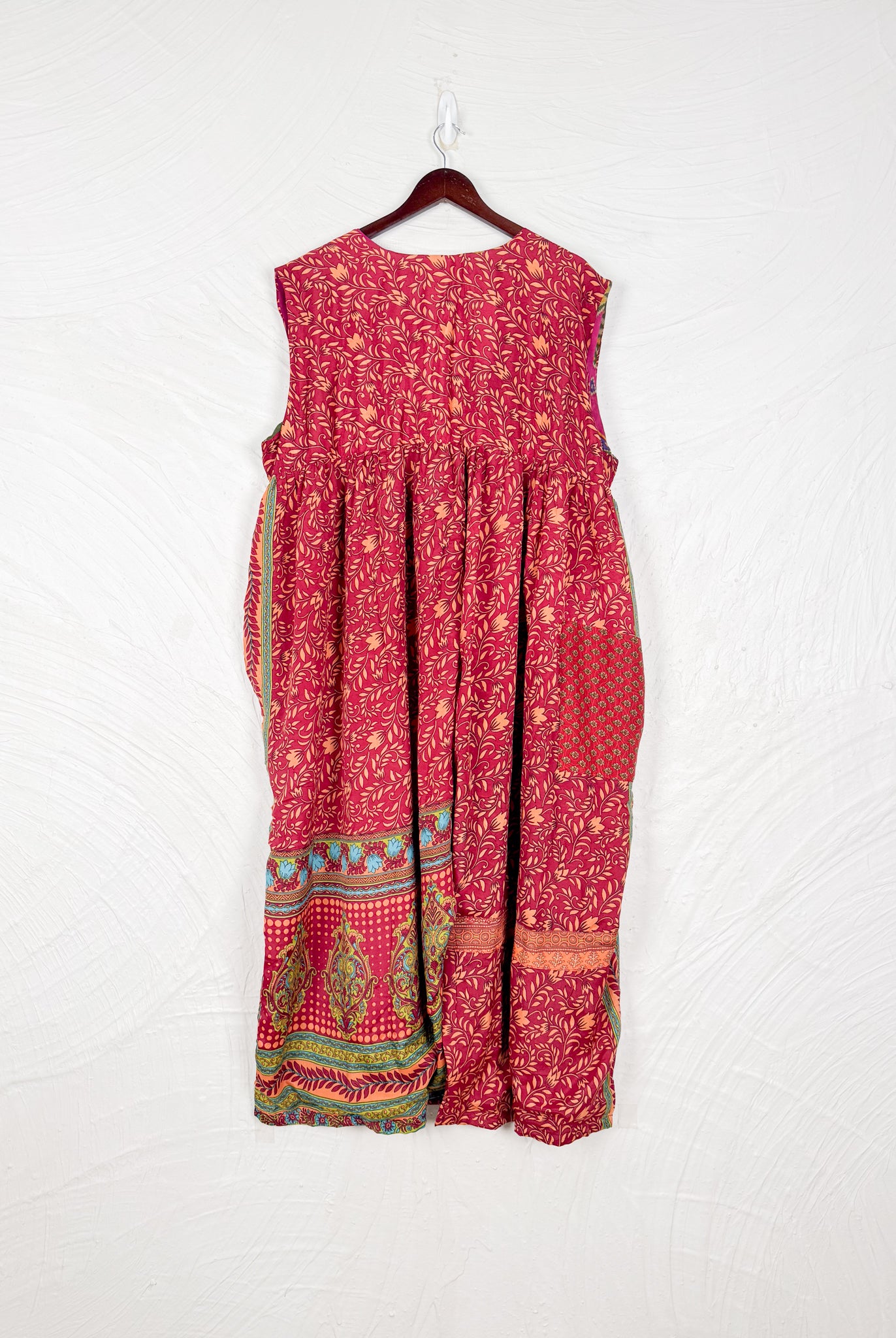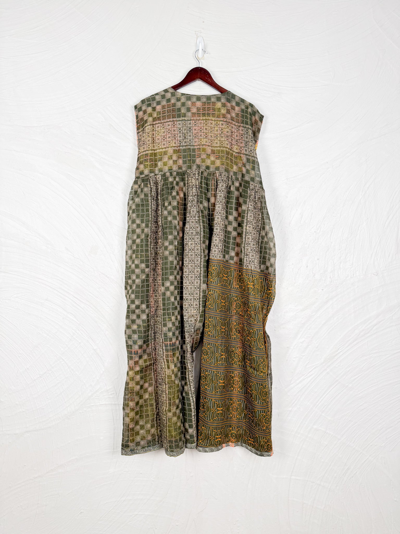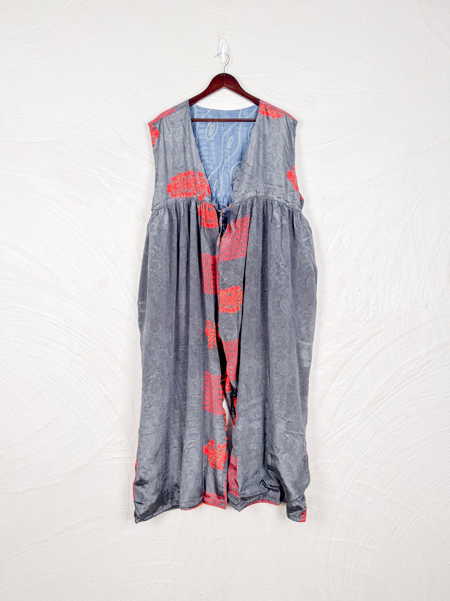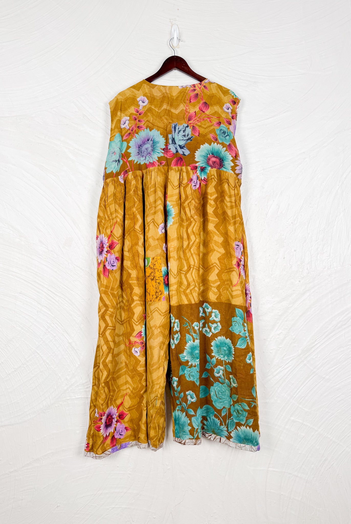 This reversible silk jumpsuit offers two distinct personalities: one side in vibrant, intricately patterned vintage Indian saree fabric, and the other in flowing, elegant silk. Its flattering V-neck, delicate ties, gathered waist, and wide, cropped legs provide ultimate comfort and breathability, making it a versatile piece of wearable art.