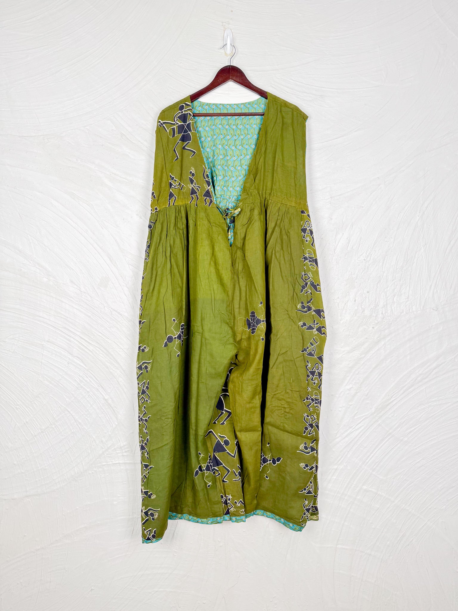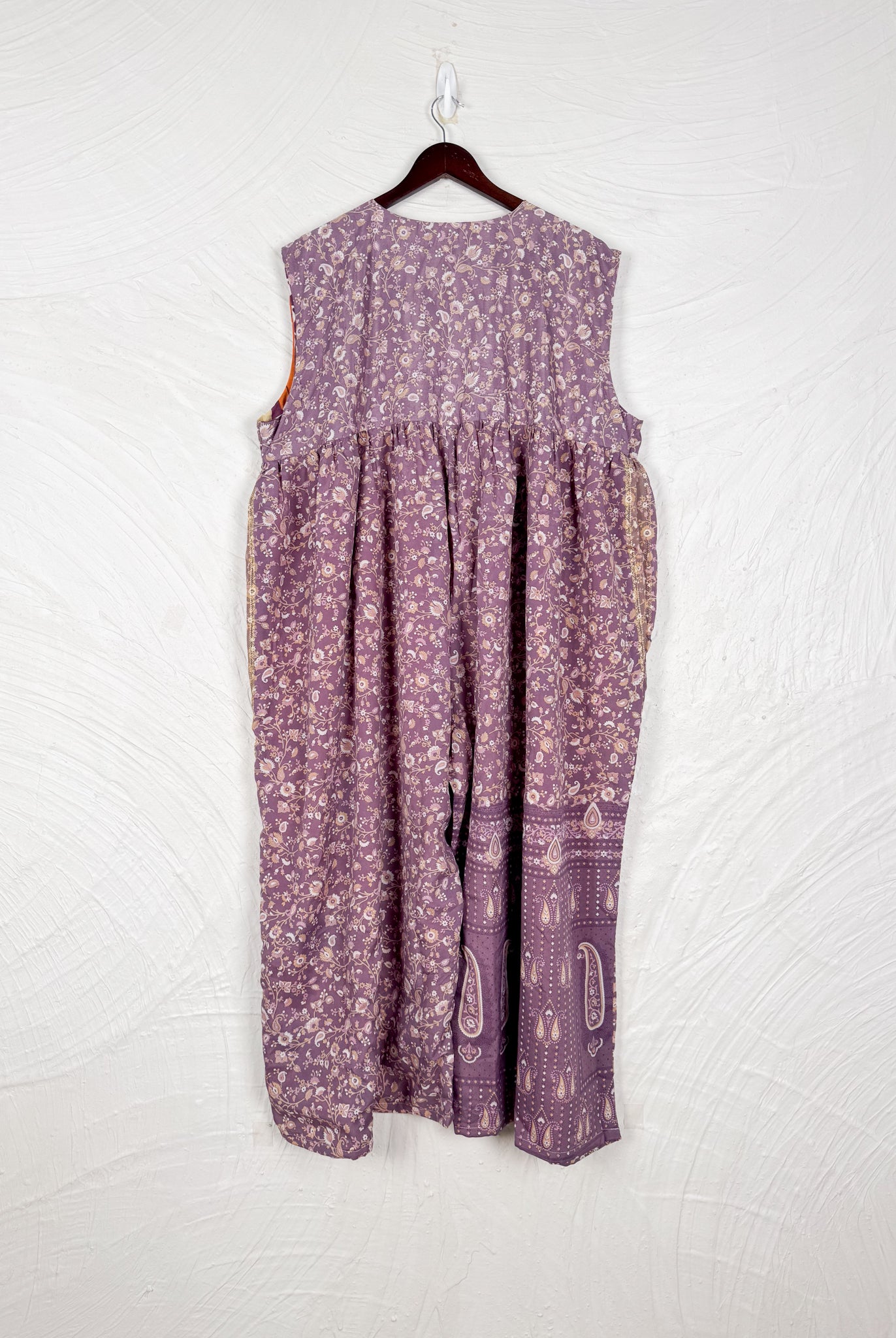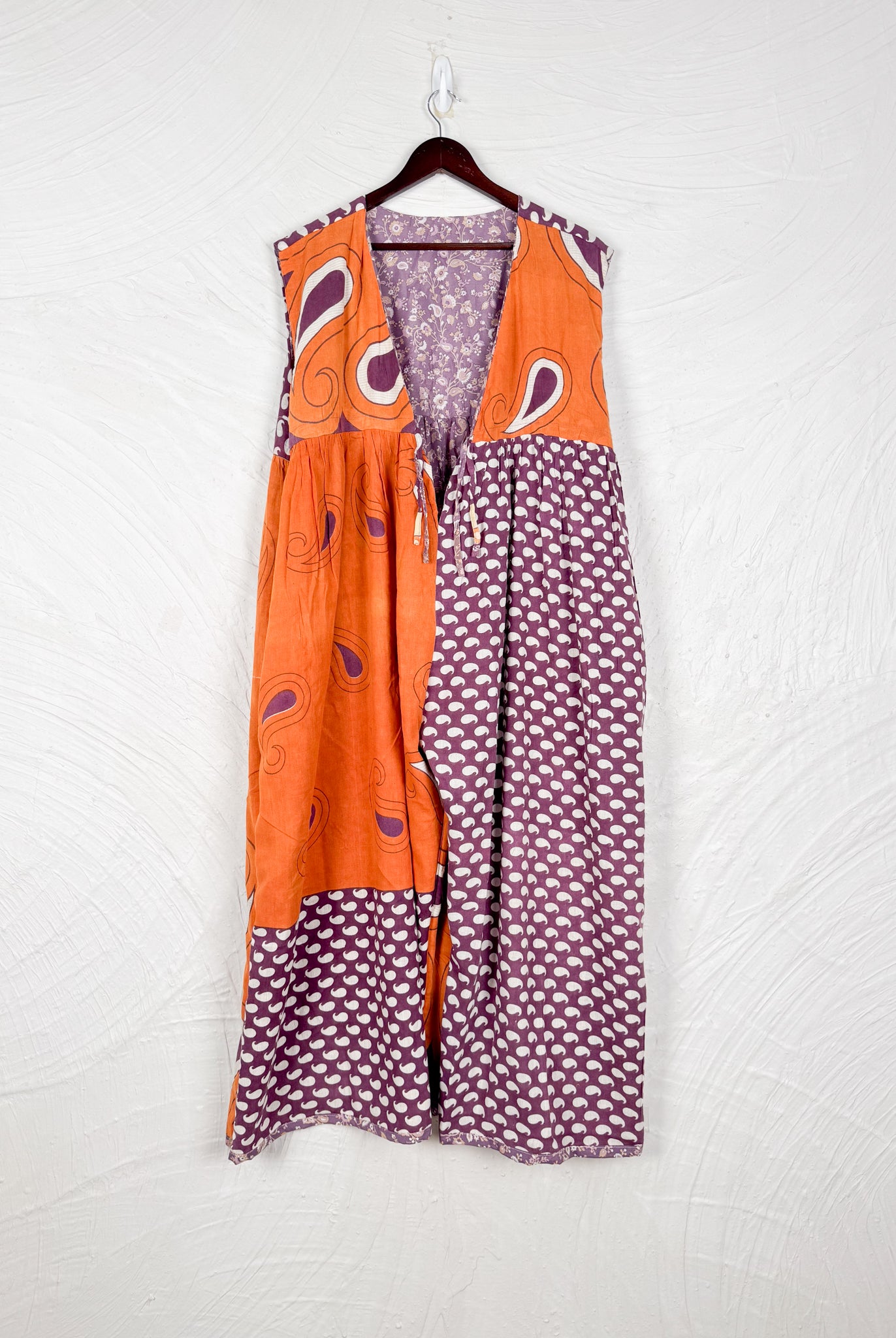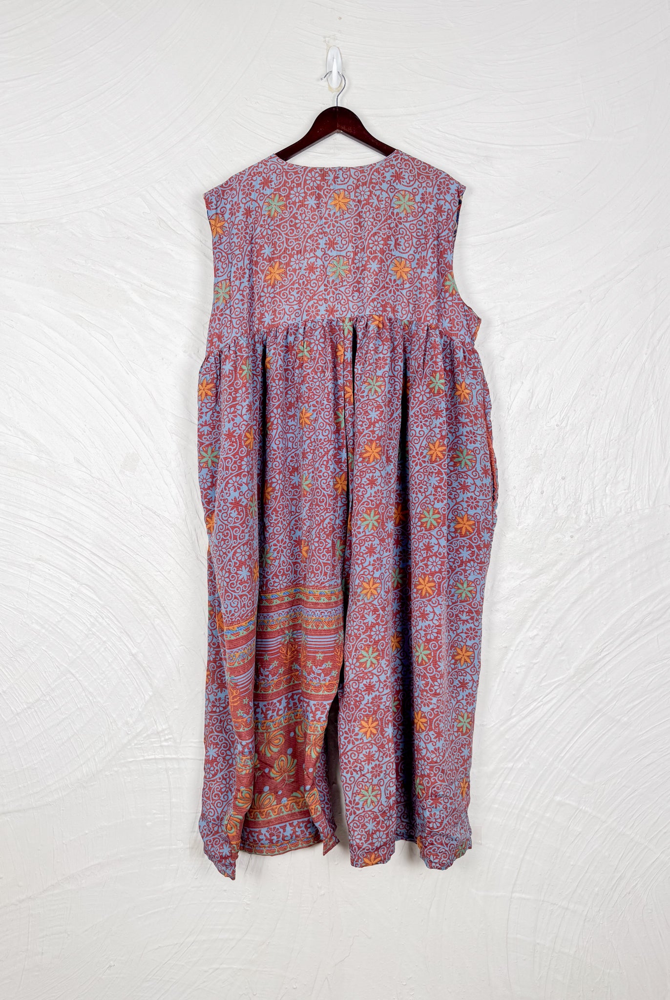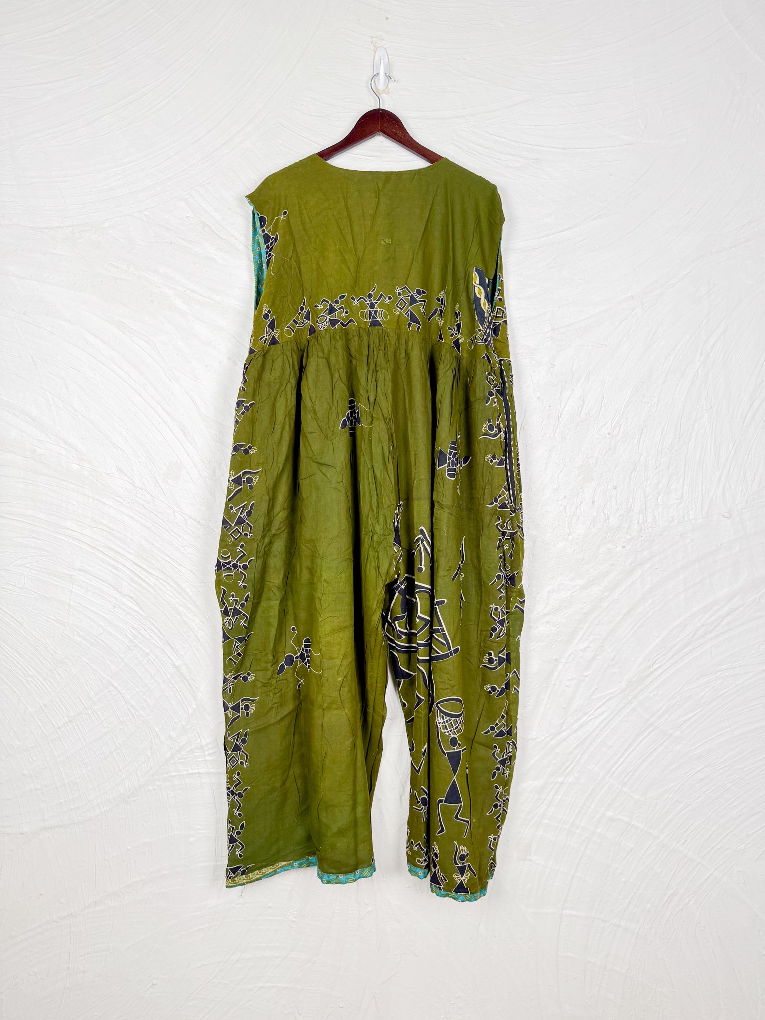 This reversible silk jumpsuit offers two distinct personalities: one side in vibrant, intricately patterned vintage Indian saree fabric, and the other in flowing, elegant silk. Its flattering V-neck, delicate ties, gathered waist, and wide, cropped legs provide ultimate comfort and breathability, making it a versatile piece of wearable art.