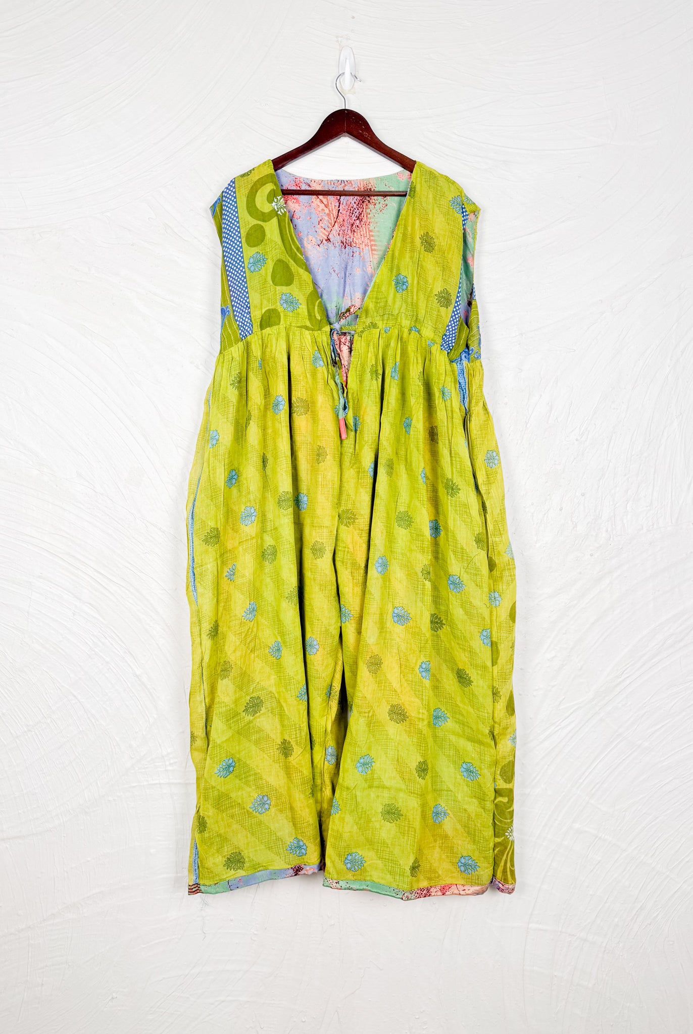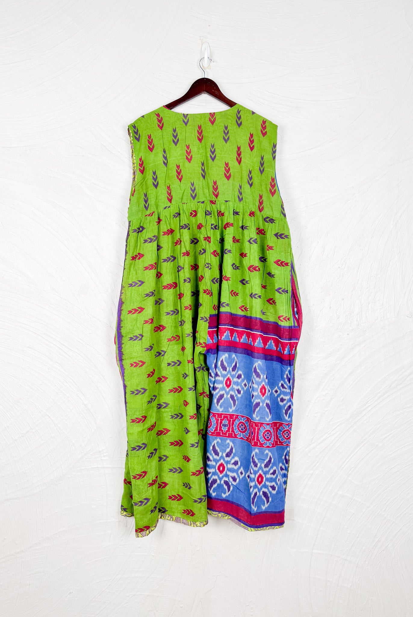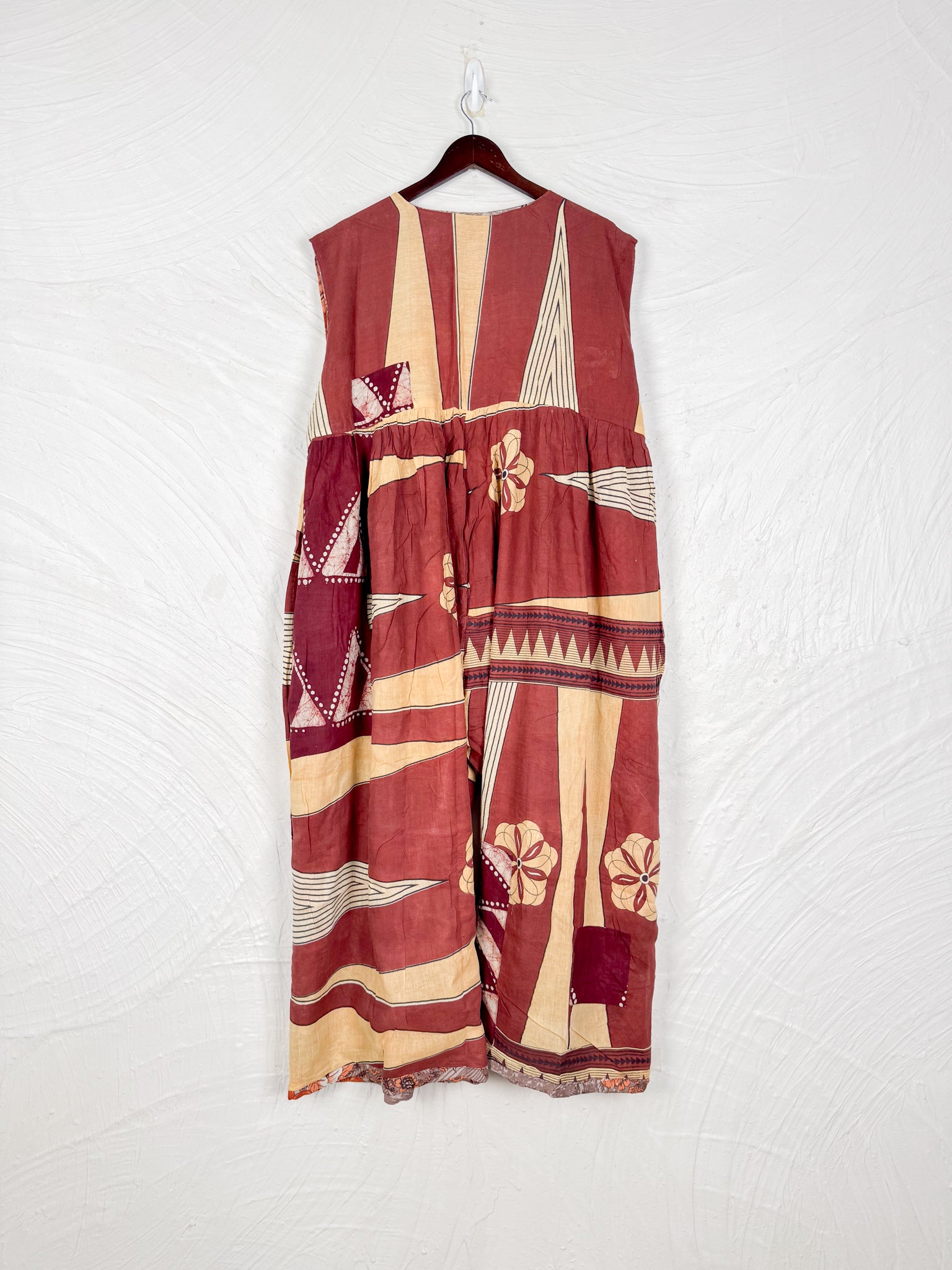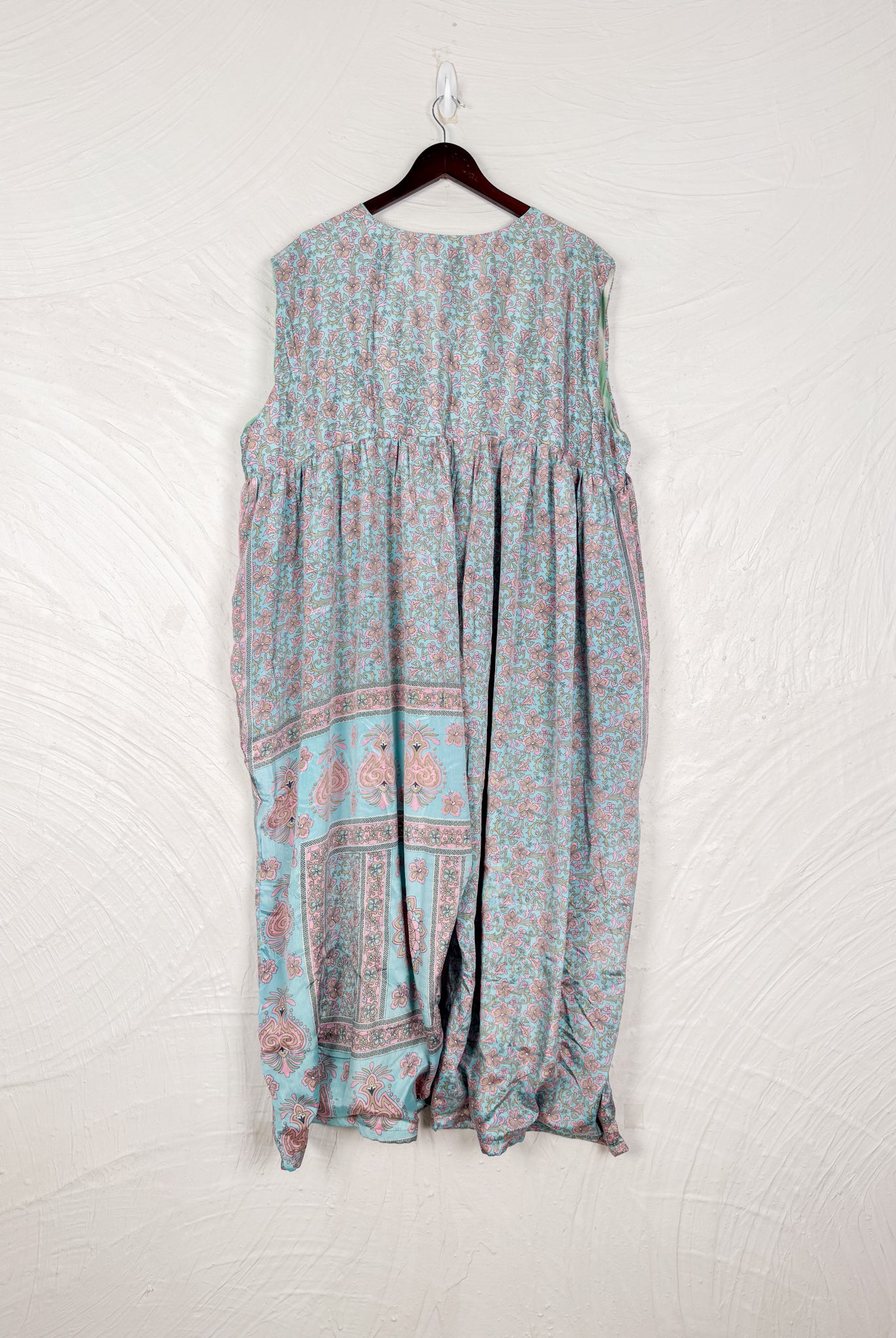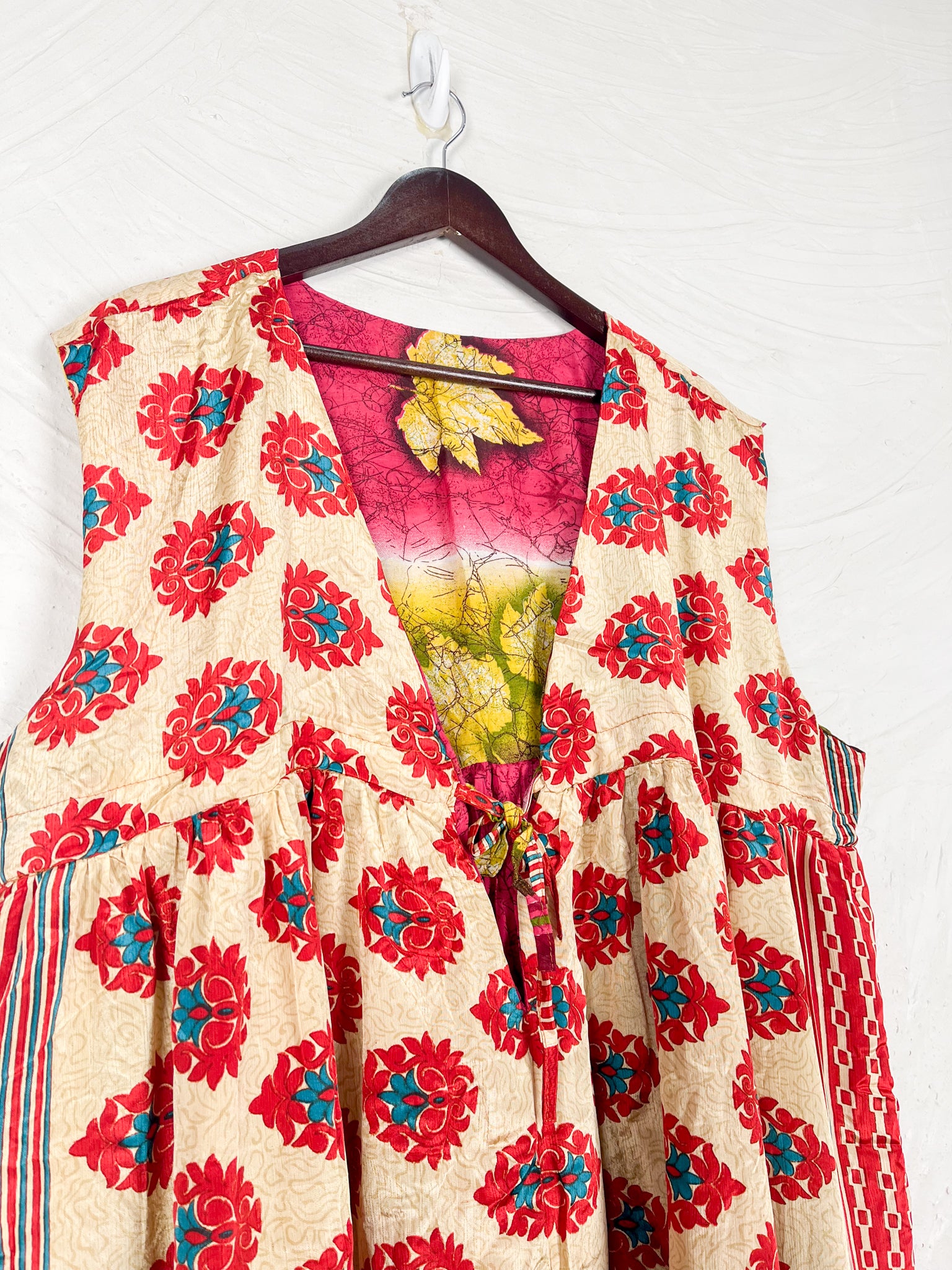 This reversible silk jumpsuit offers two distinct personalities: one side in vibrant, intricately patterned vintage Indian saree fabric, and the other in flowing, elegant silk. Its flattering V-neck, delicate ties, gathered waist, and wide, cropped legs provide ultimate comfort and breathability, making it a versatile piece of wearable art.