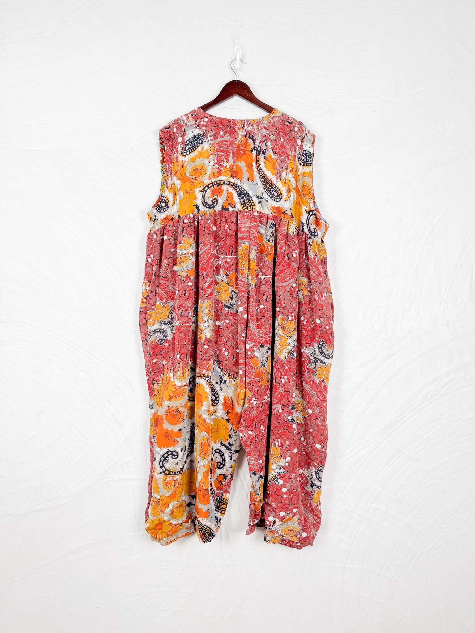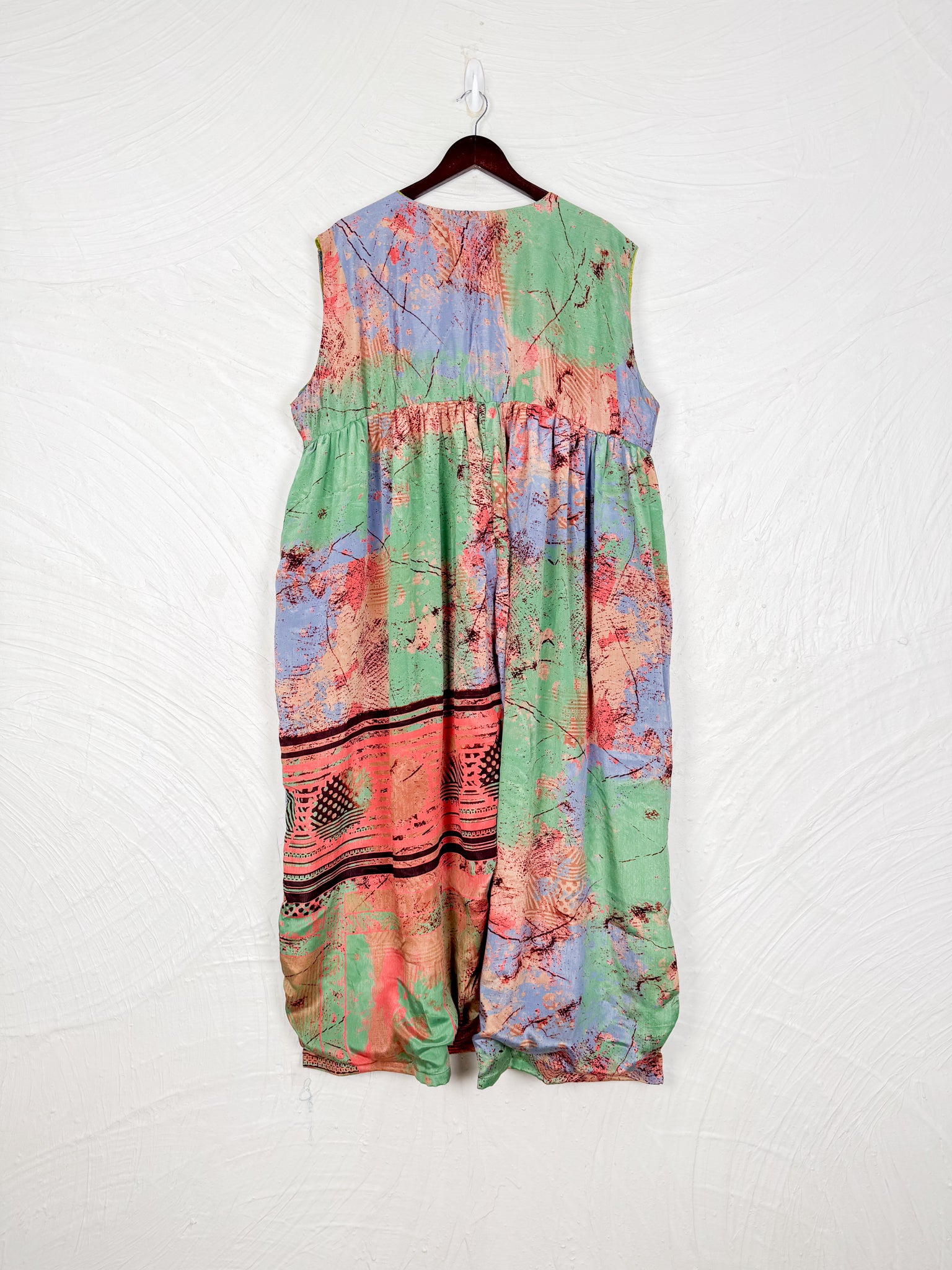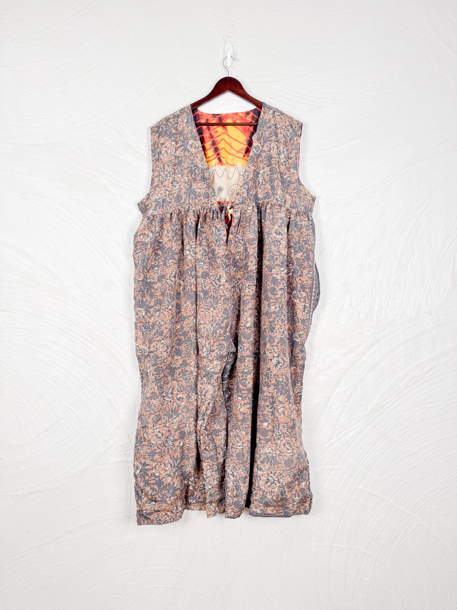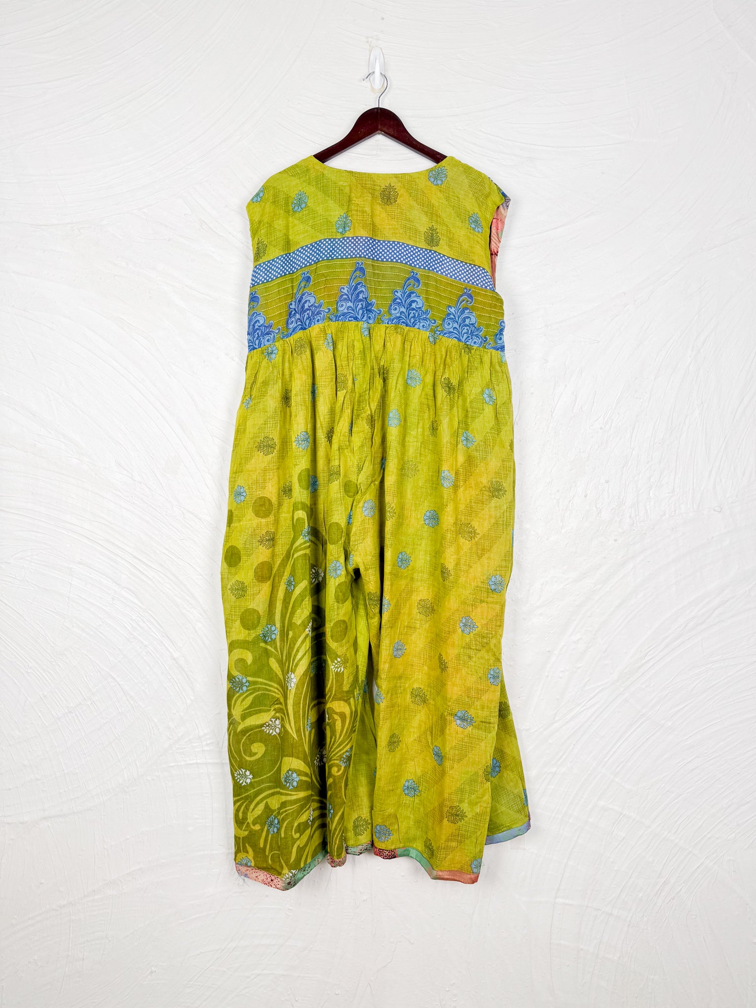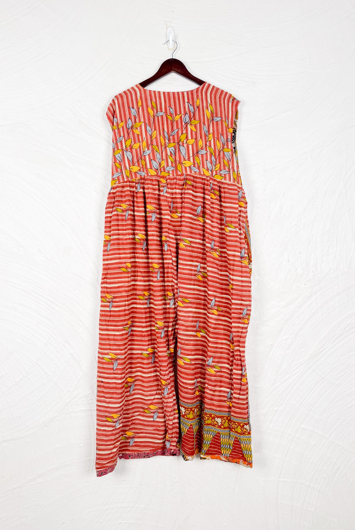 This reversible silk jumpsuit offers two distinct personalities: one side in vibrant, intricately patterned vintage Indian saree fabric, and the other in flowing, elegant silk. Its flattering V-neck, delicate ties, gathered waist, and wide, cropped legs provide ultimate comfort and breathability, making it a versatile piece of wearable art.
