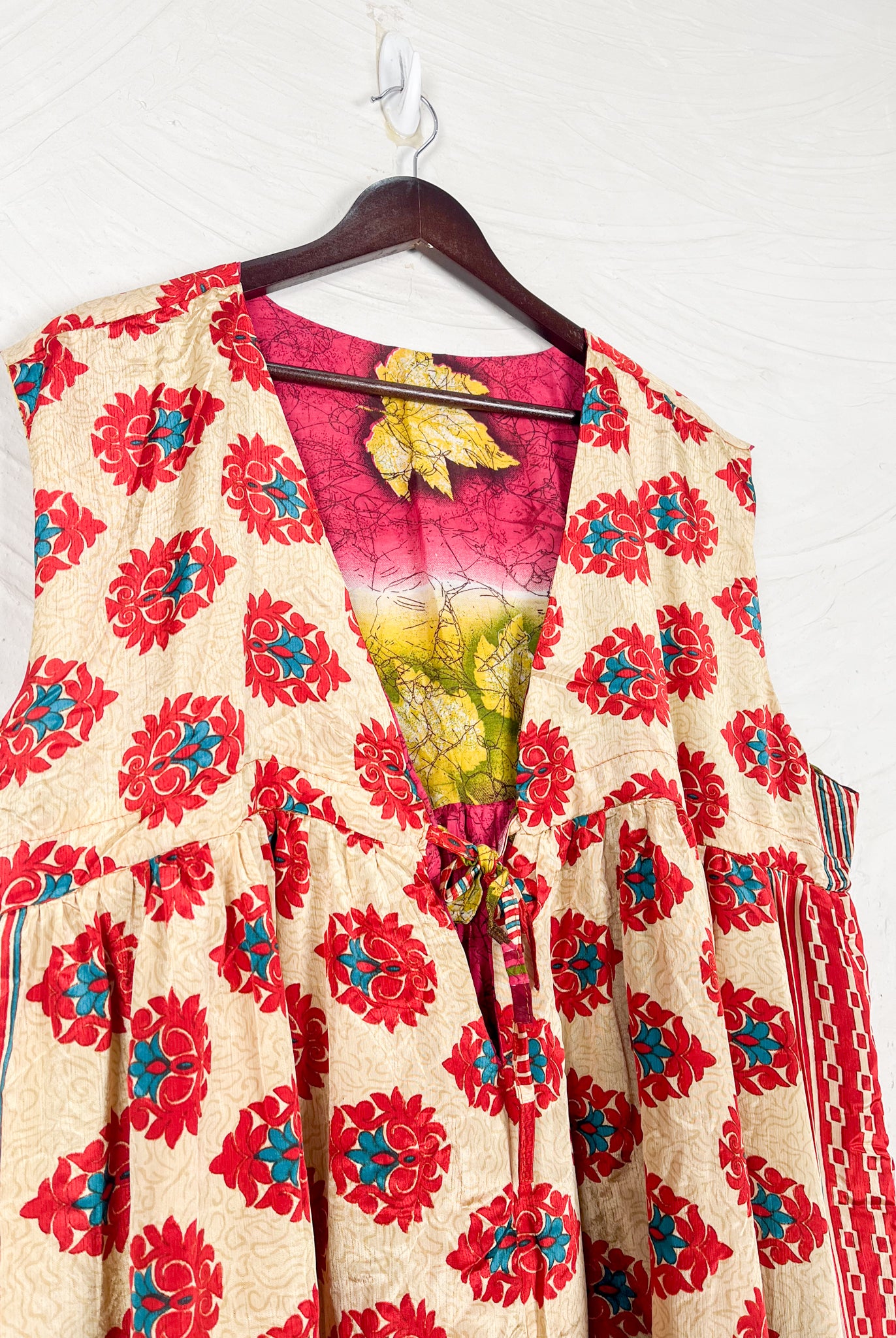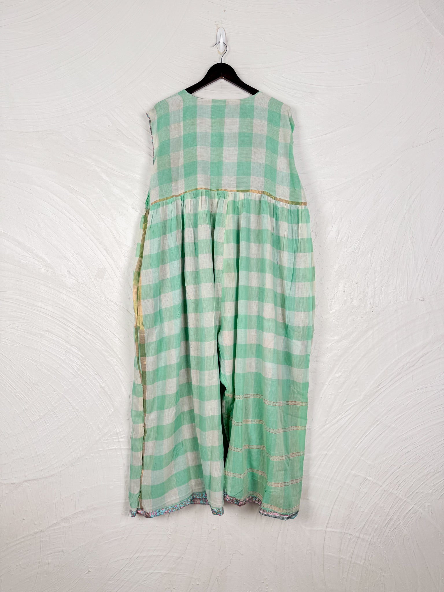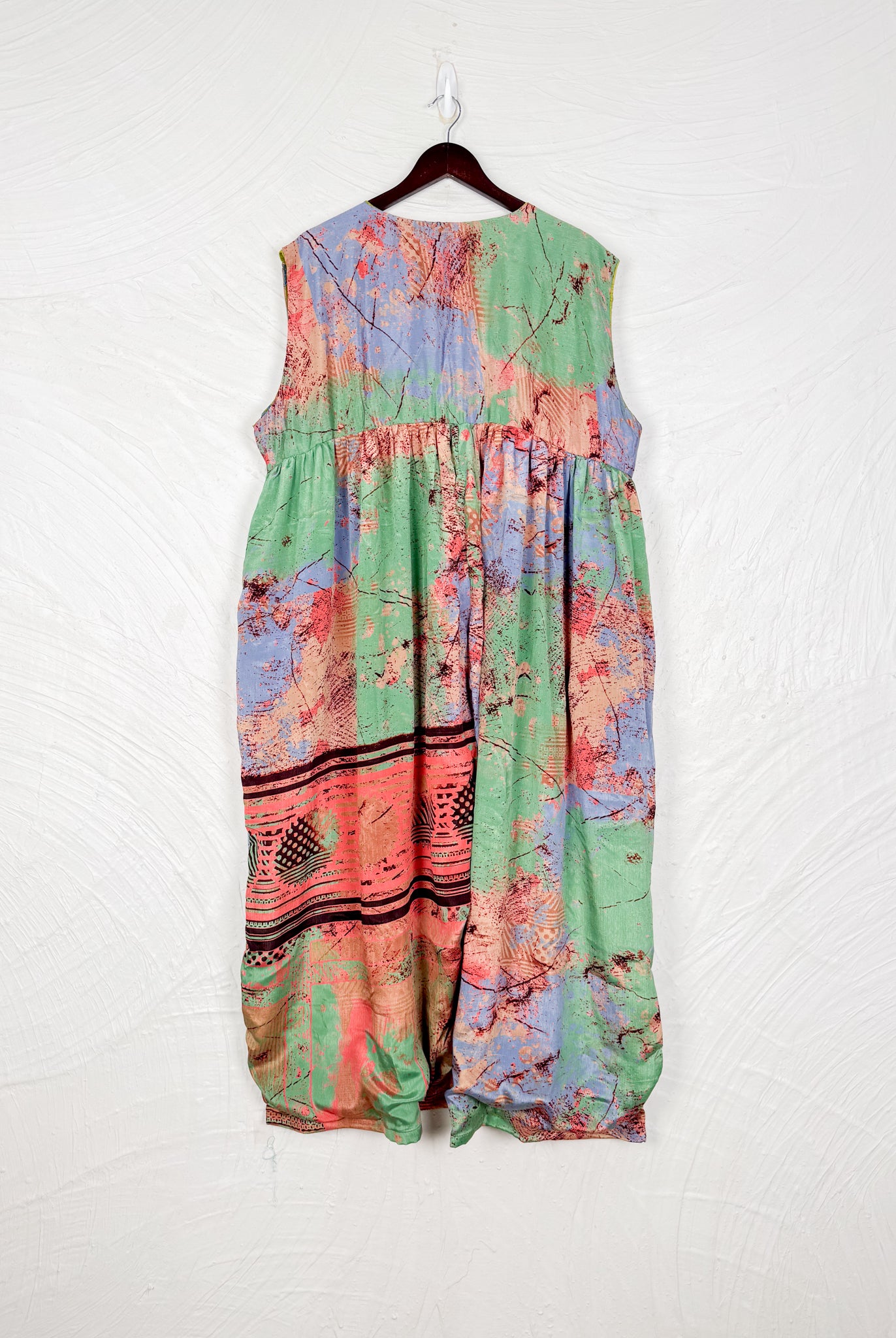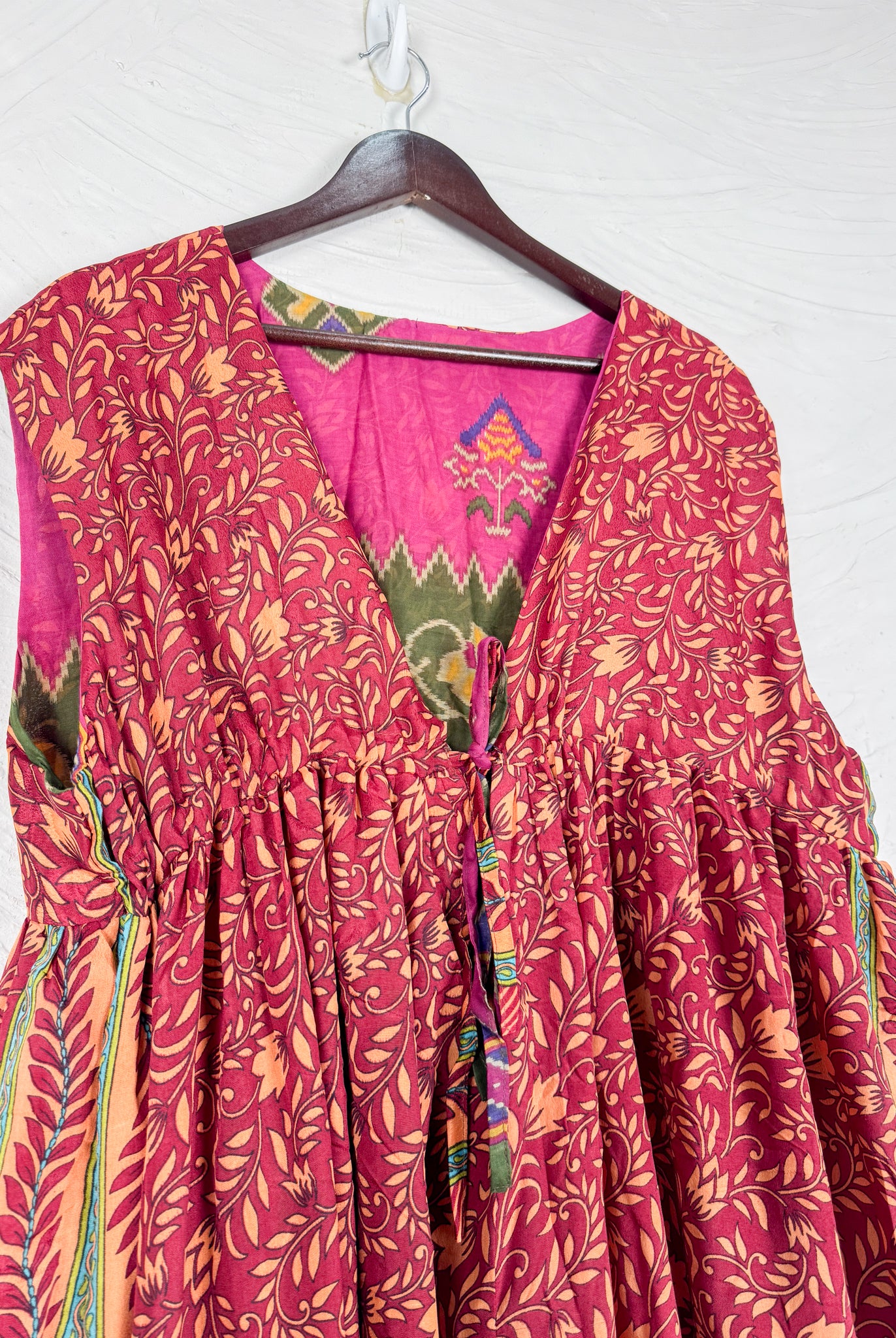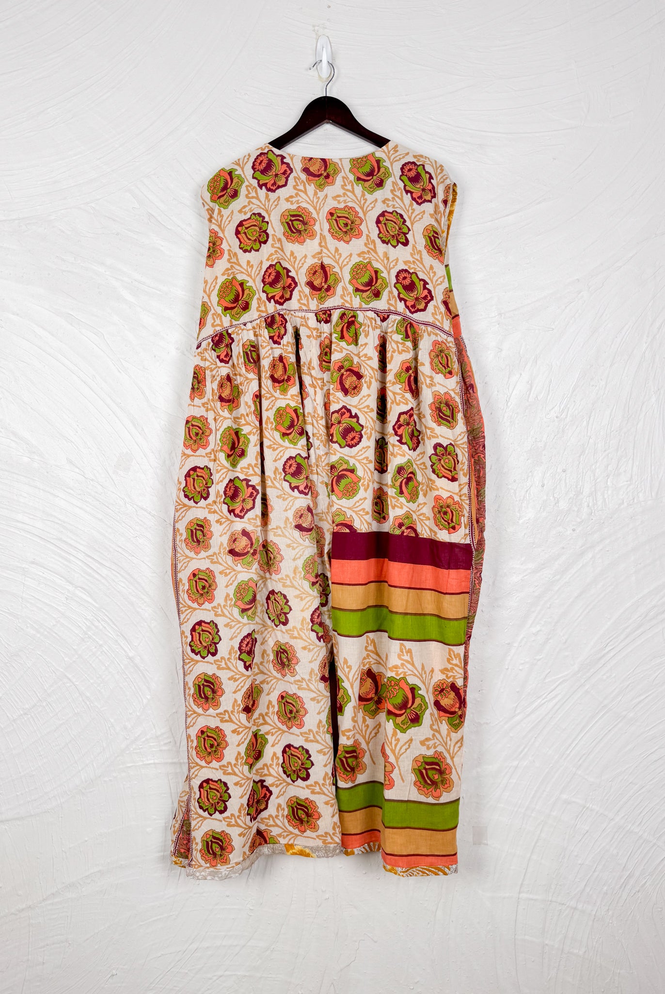 This reversible silk jumpsuit offers two distinct personalities: one side in vibrant, intricately patterned vintage Indian saree fabric, and the other in flowing, elegant silk. Its flattering V-neck, delicate ties, gathered waist, and wide, cropped legs provide ultimate comfort and breathability, making it a versatile piece of wearable art.