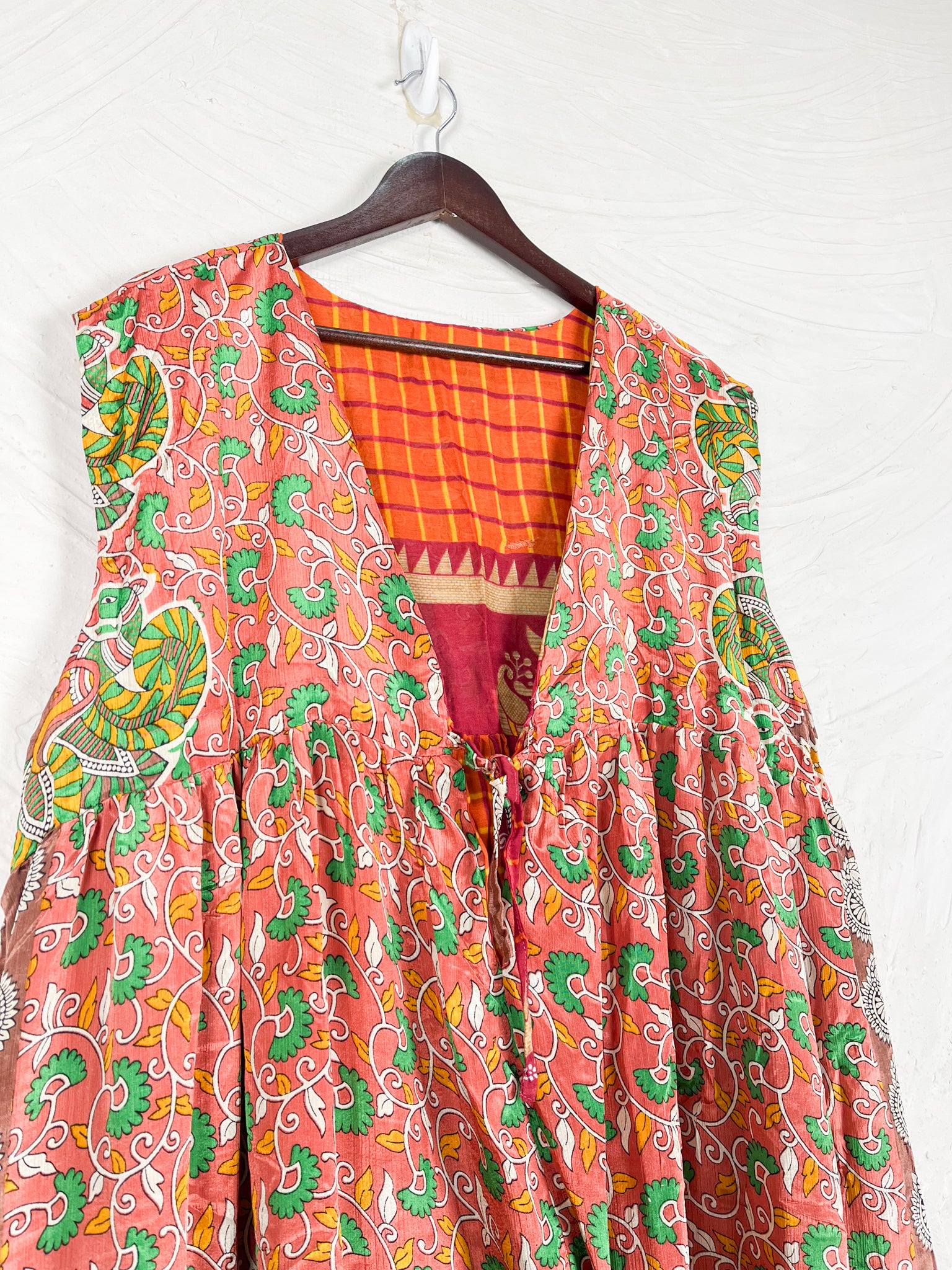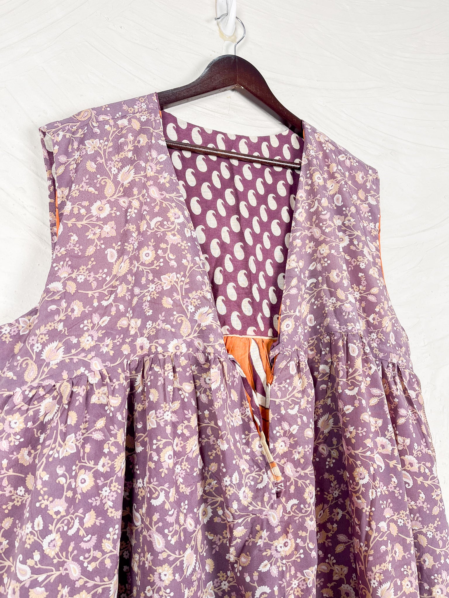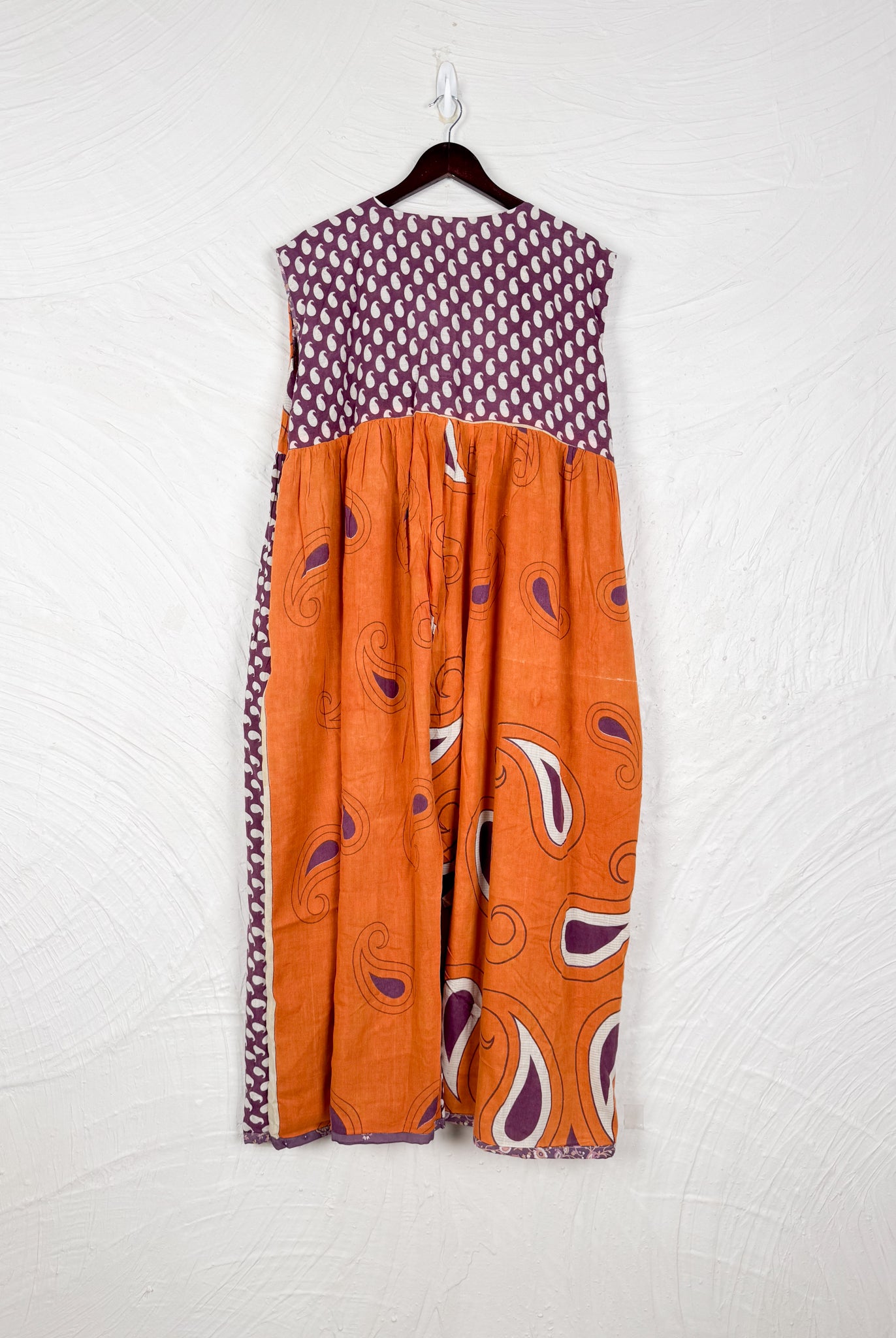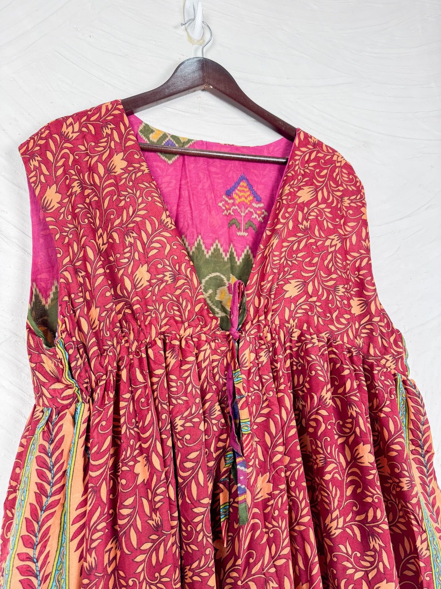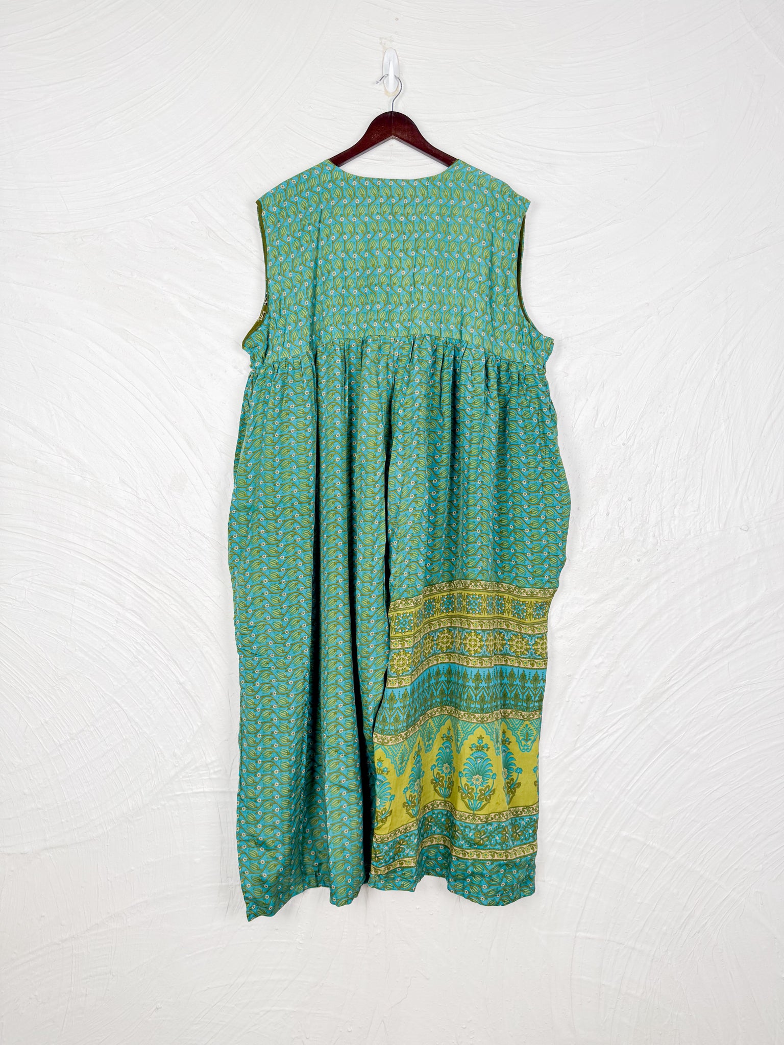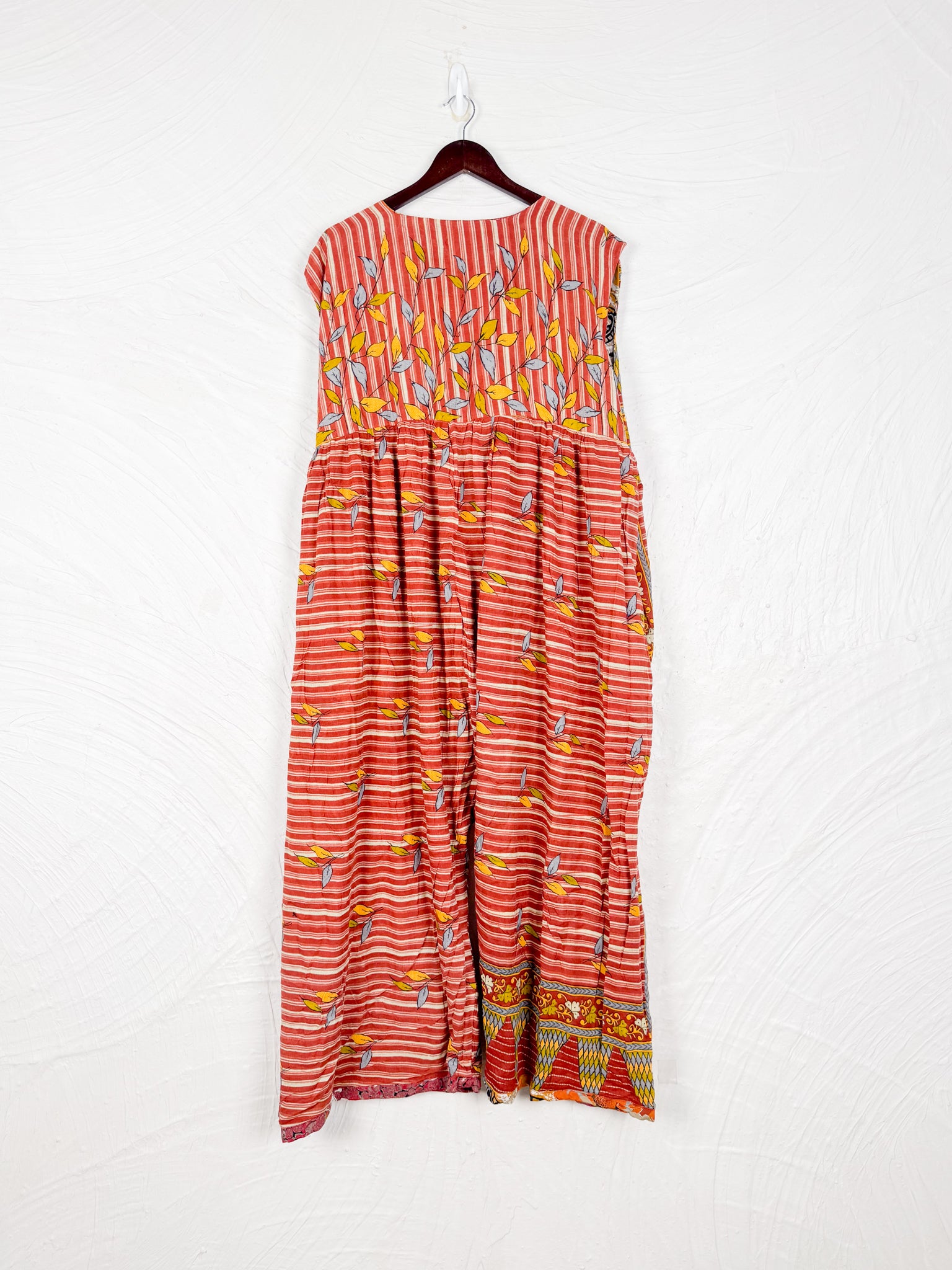 This reversible silk jumpsuit offers two distinct personalities: one side in vibrant, intricately patterned vintage Indian saree fabric, and the other in flowing, elegant silk. Its flattering V-neck, delicate ties, gathered waist, and wide, cropped legs provide ultimate comfort and breathability, making it a versatile piece of wearable art.
