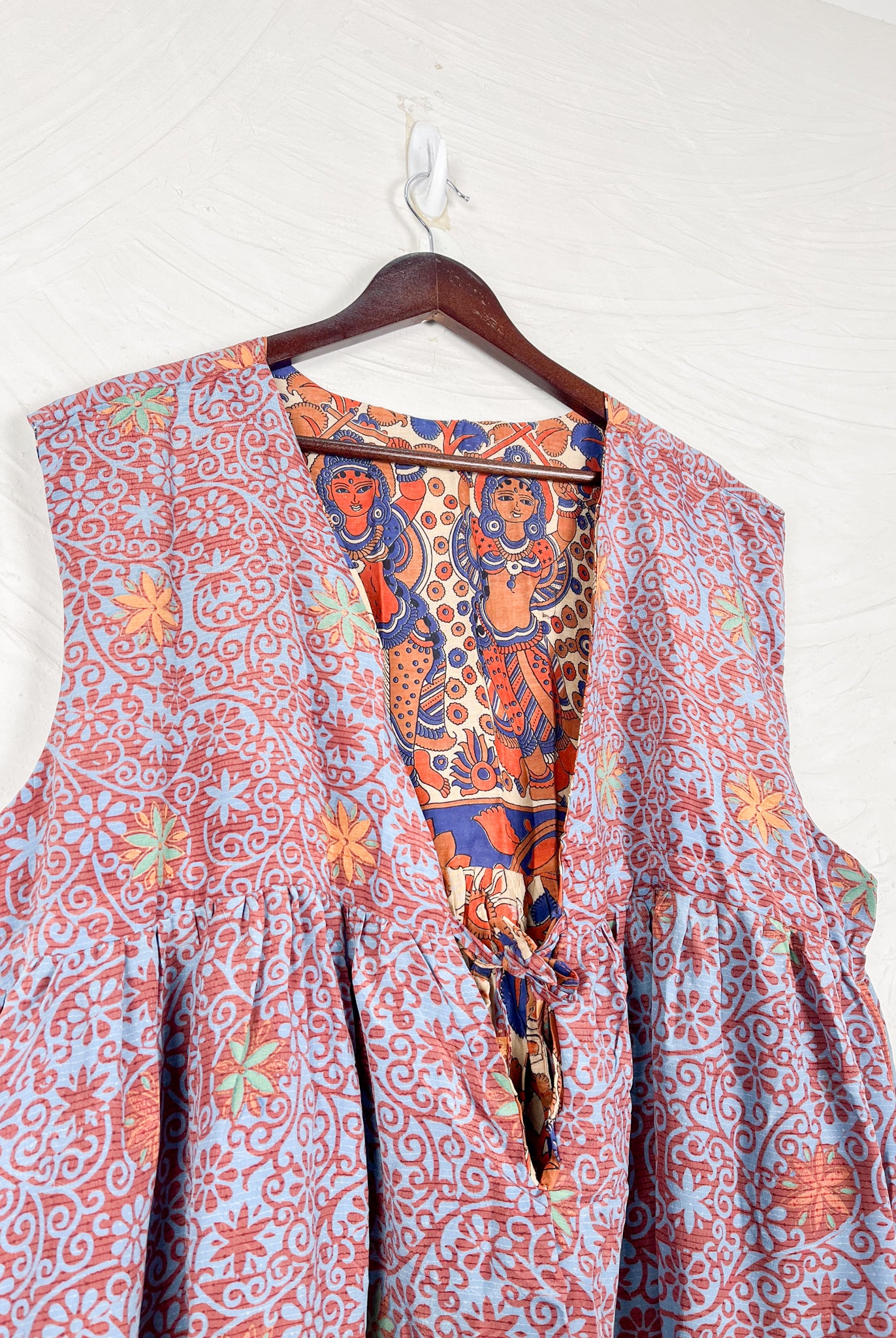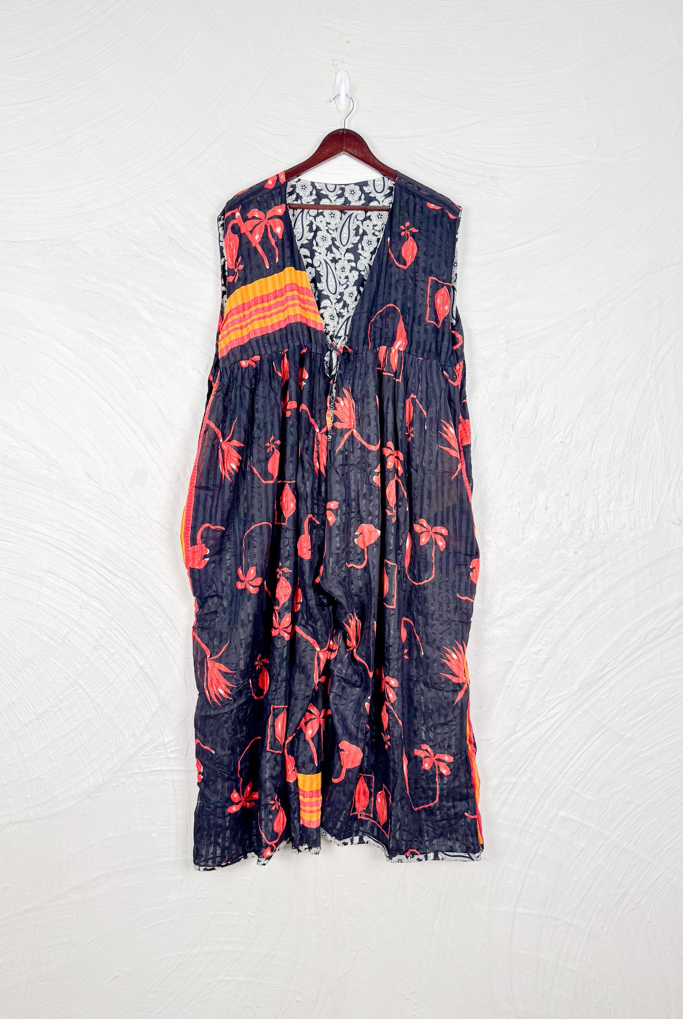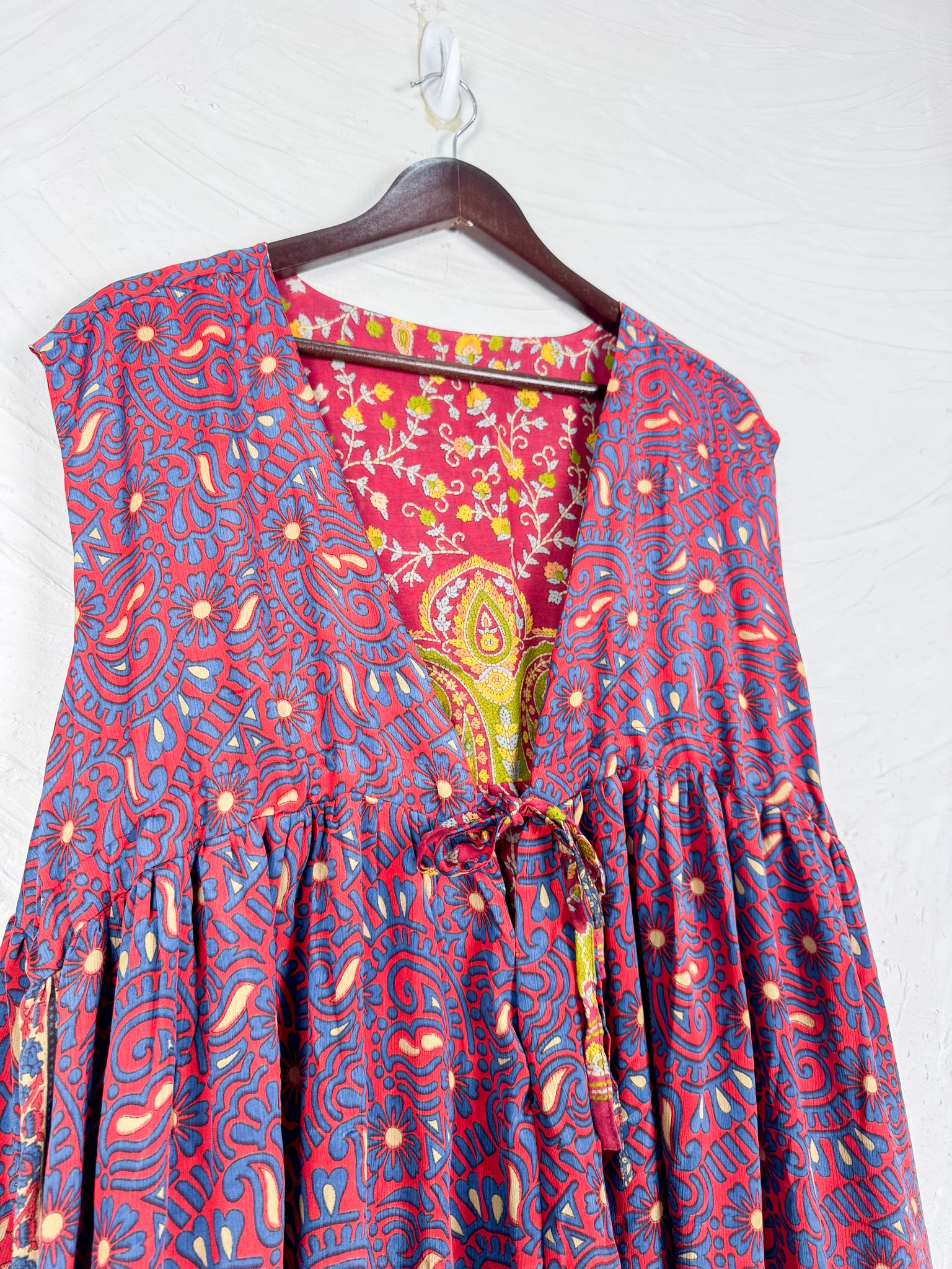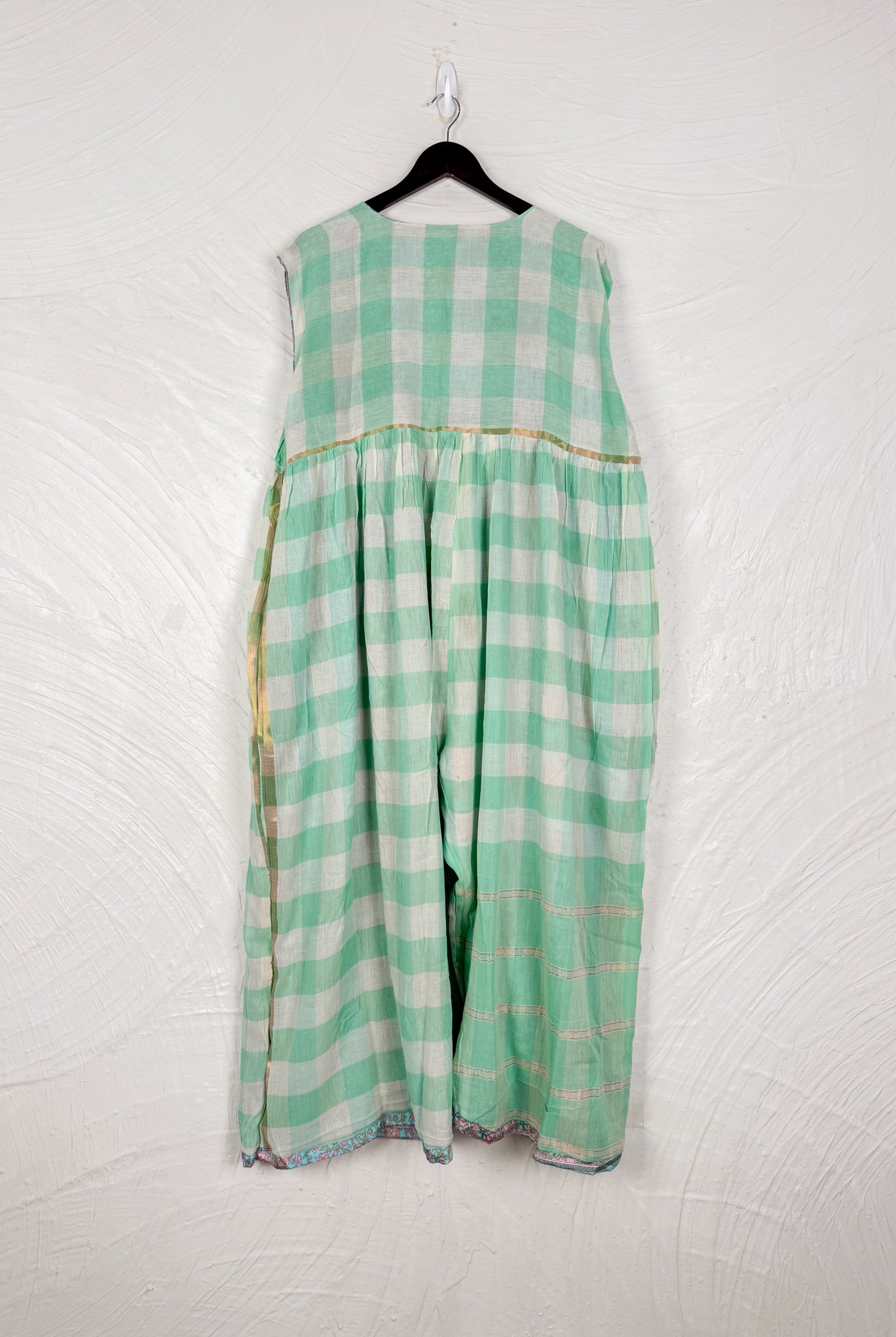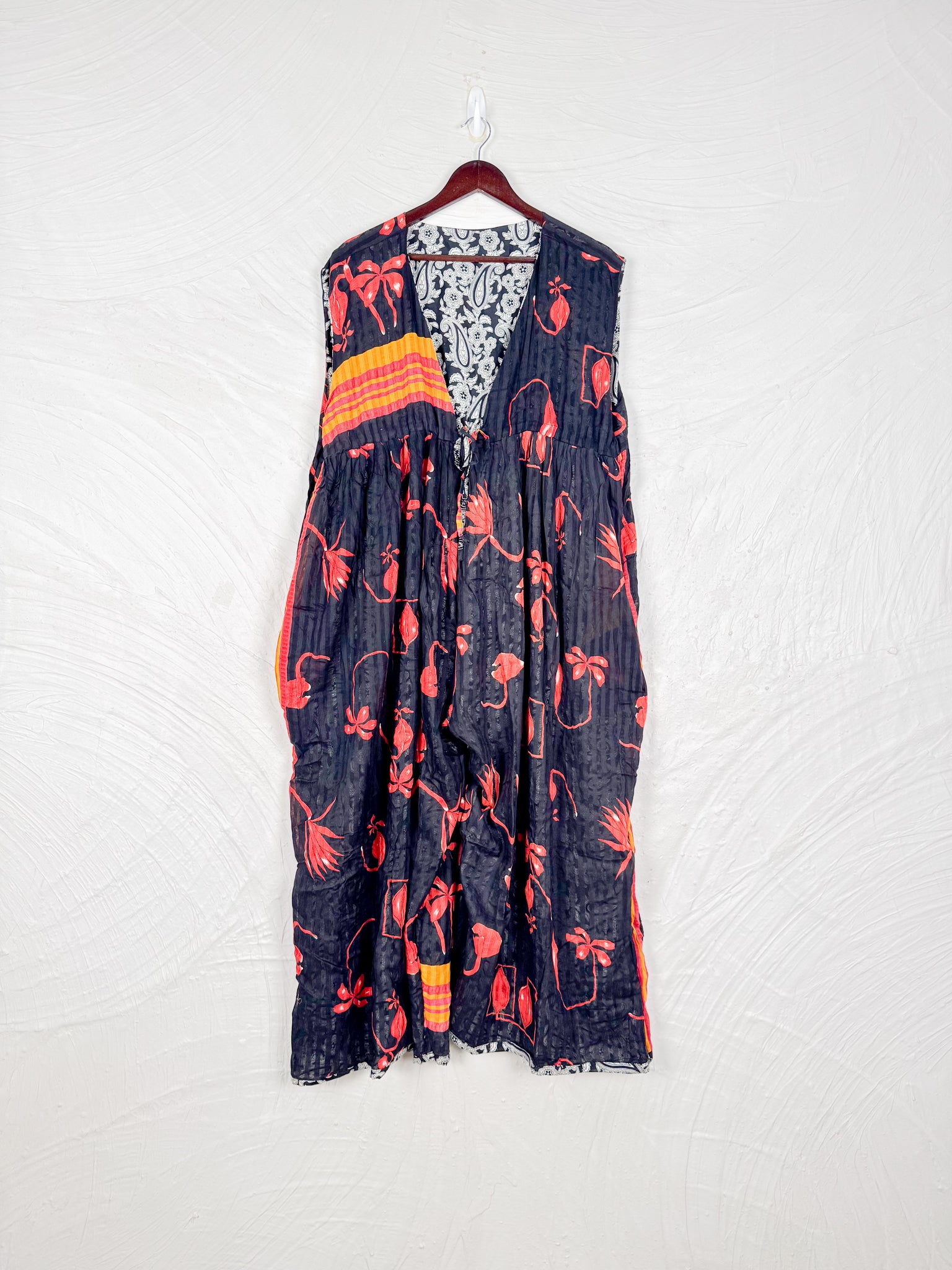This reversible silk jumpsuit offers two distinct personalities: one side in vibrant, intricately patterned vintage Indian saree fabric, and the other in flowing, elegant silk. Its flattering V-neck, delicate ties, gathered waist, and wide, cropped legs provide ultimate comfort and breathability, making it a versatile piece of wearable art.