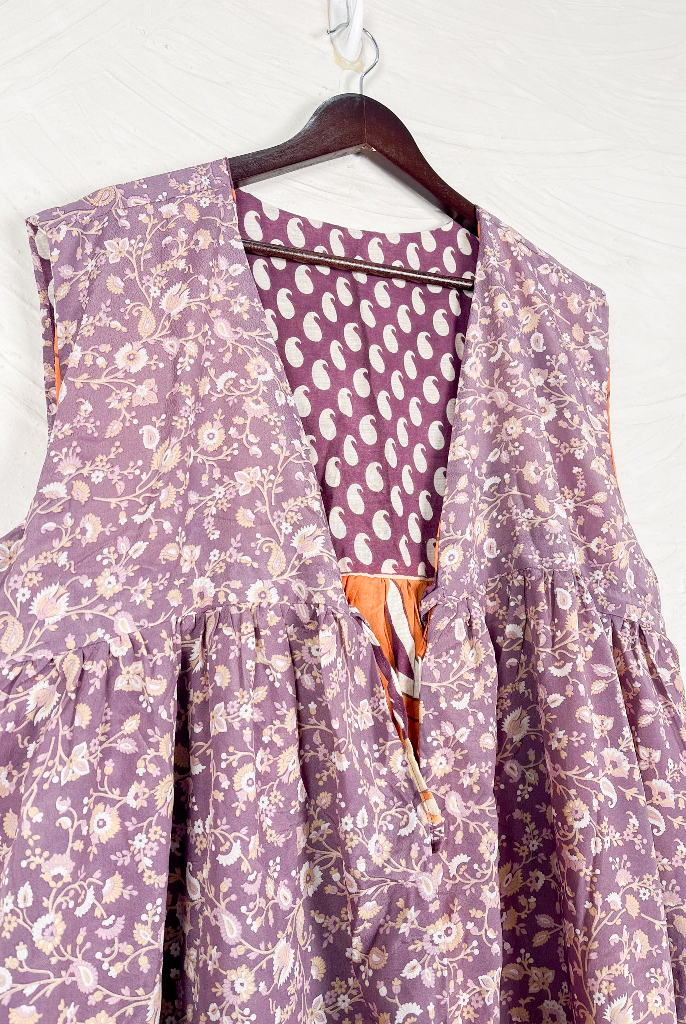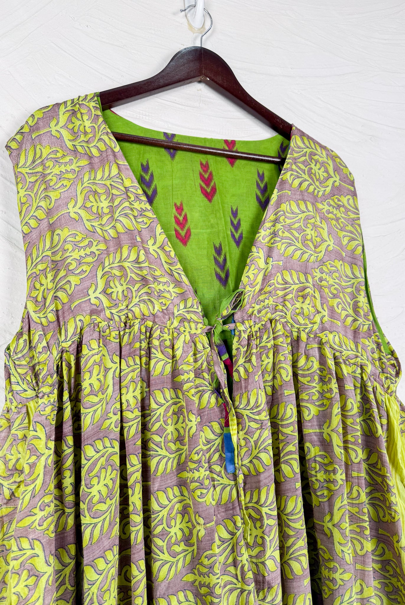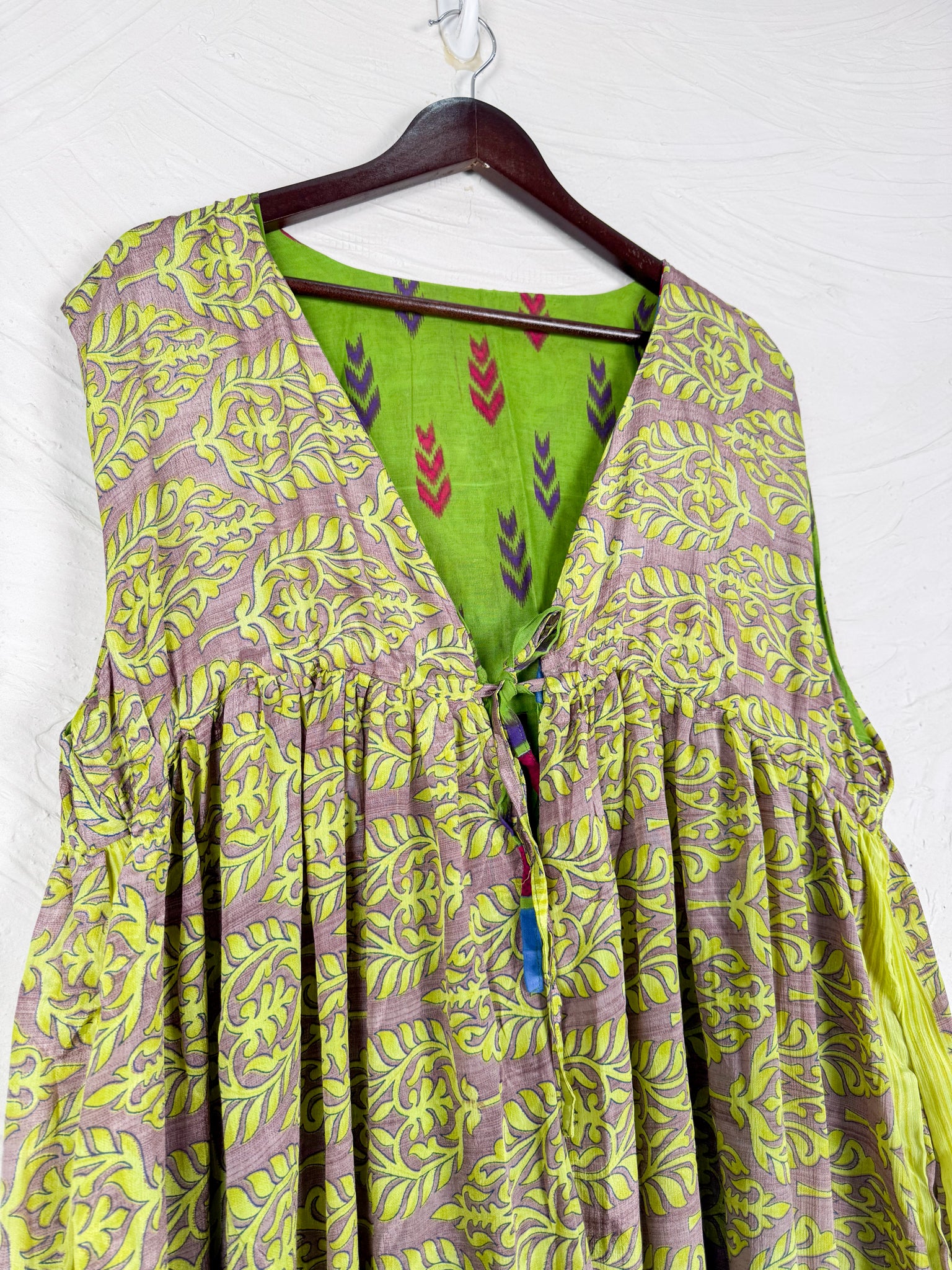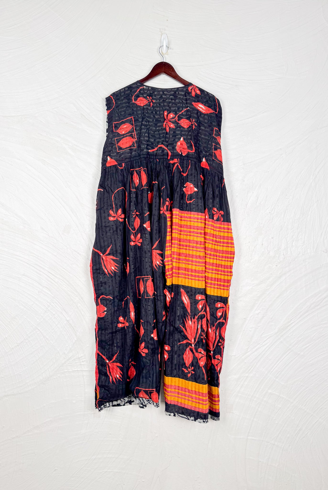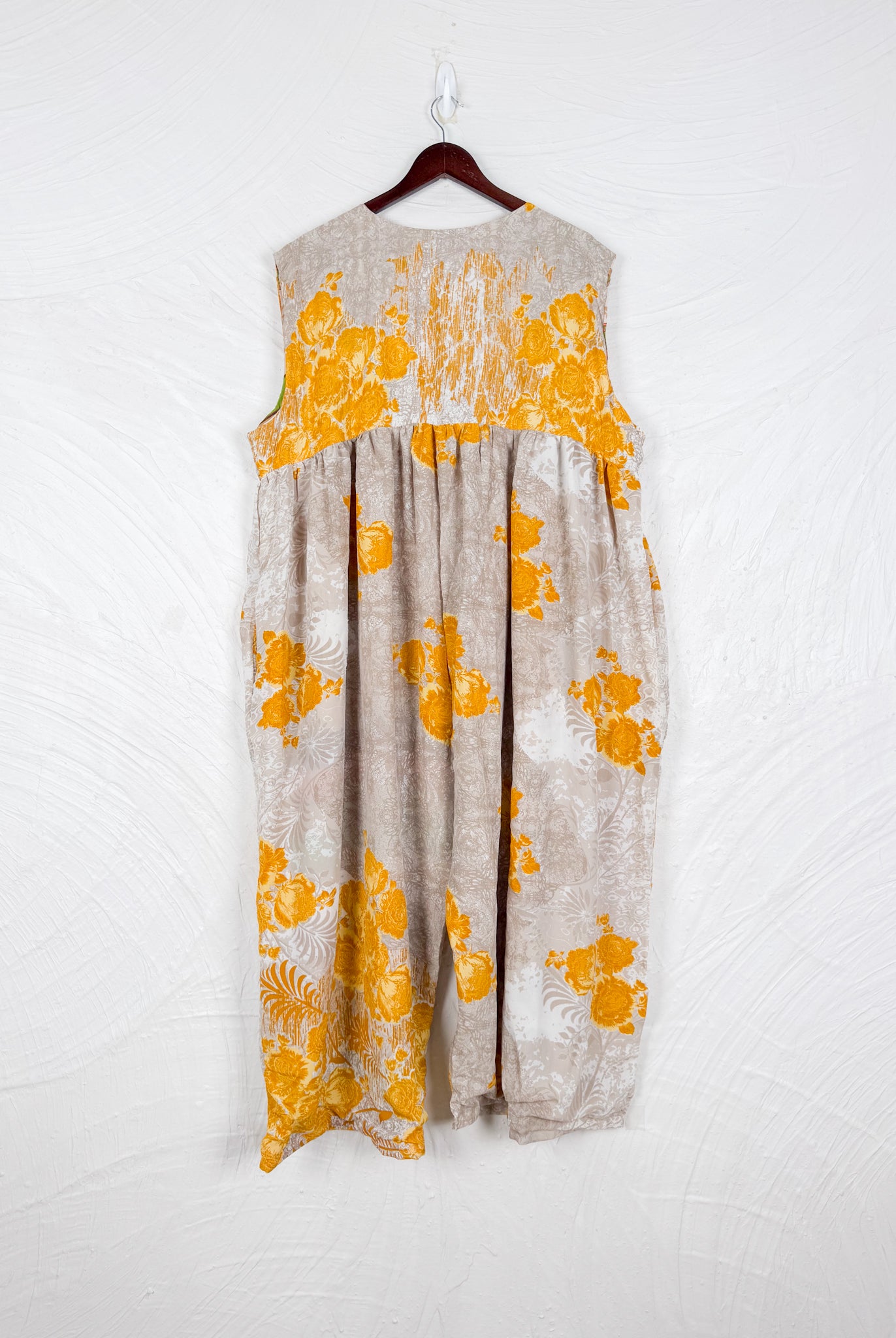 This reversible silk jumpsuit offers two distinct personalities: one side in vibrant, intricately patterned vintage Indian saree fabric, and the other in flowing, elegant silk. Its flattering V-neck, delicate ties, gathered waist, and wide, cropped legs provide ultimate comfort and breathability, making it a versatile piece of wearable art.