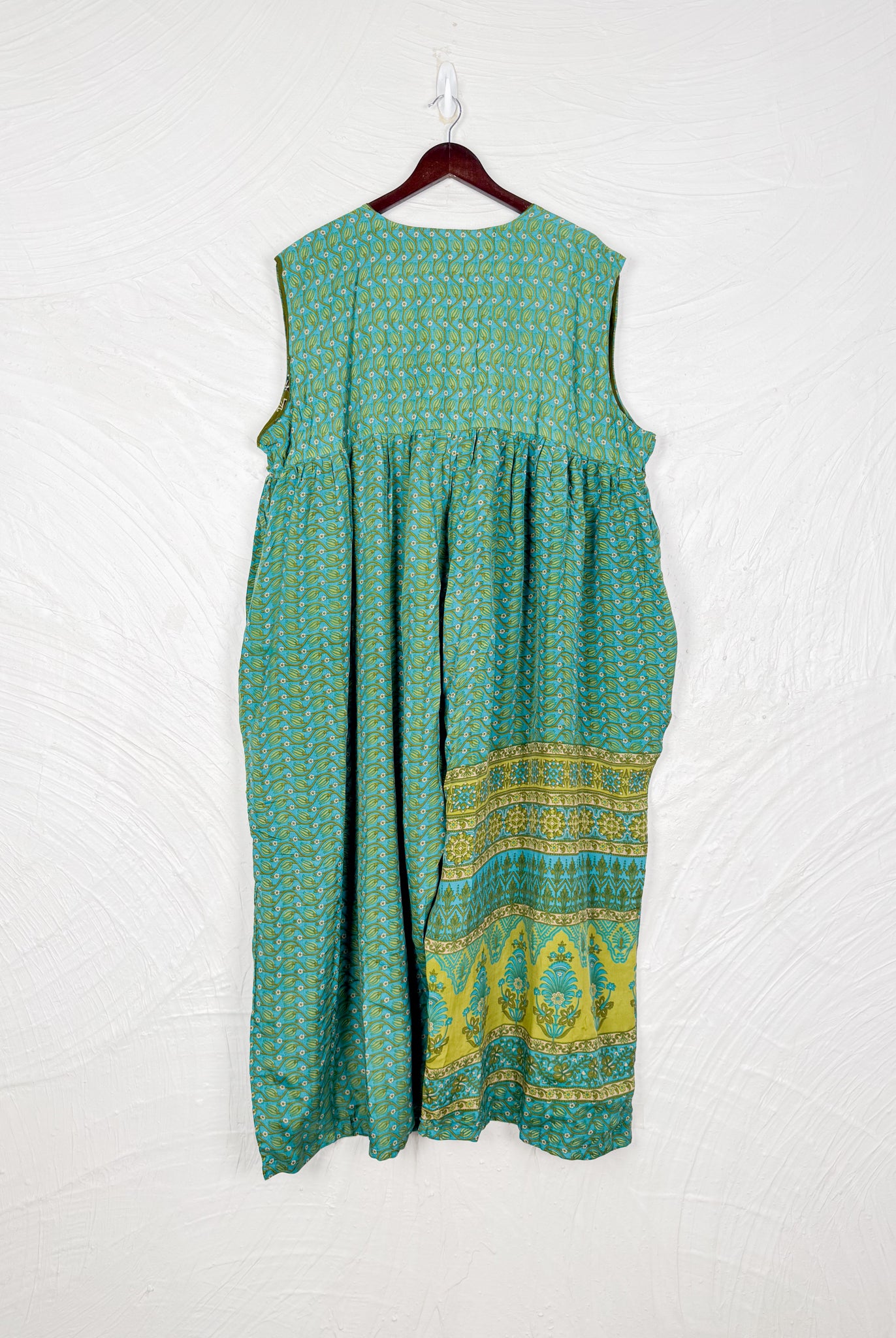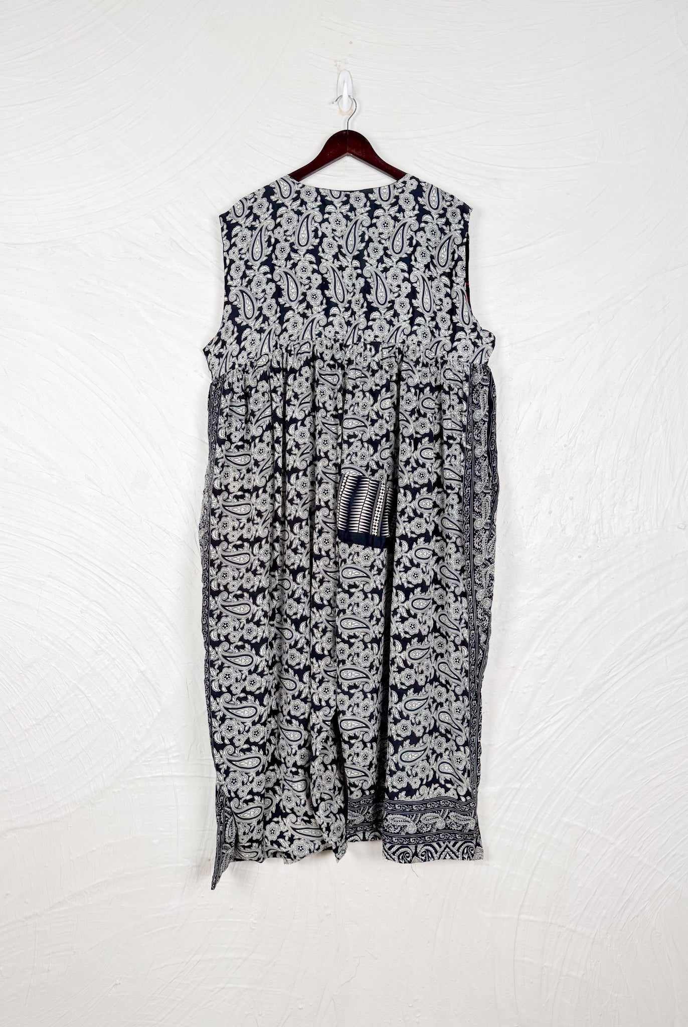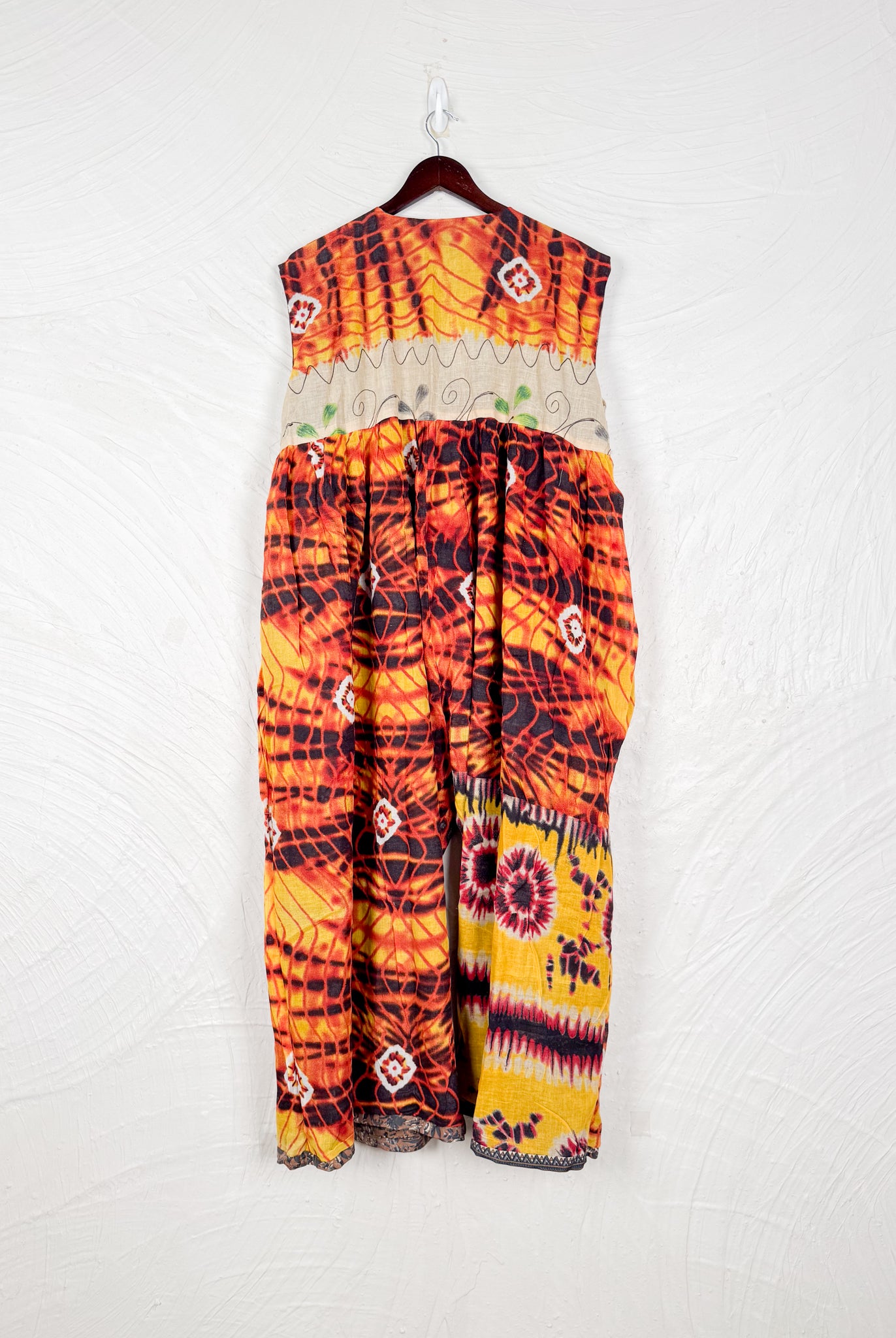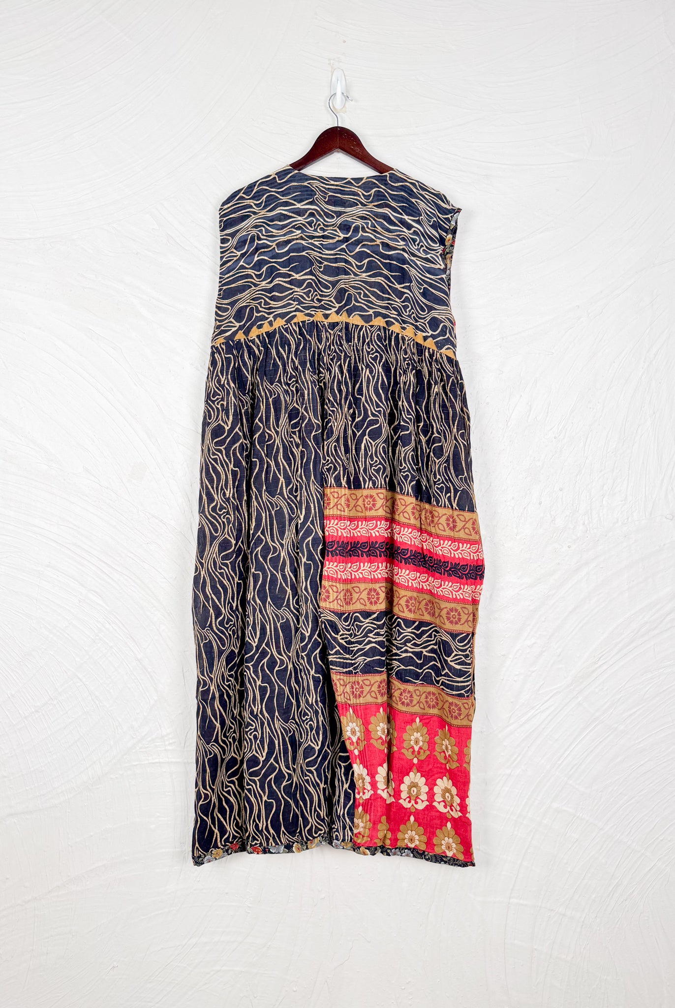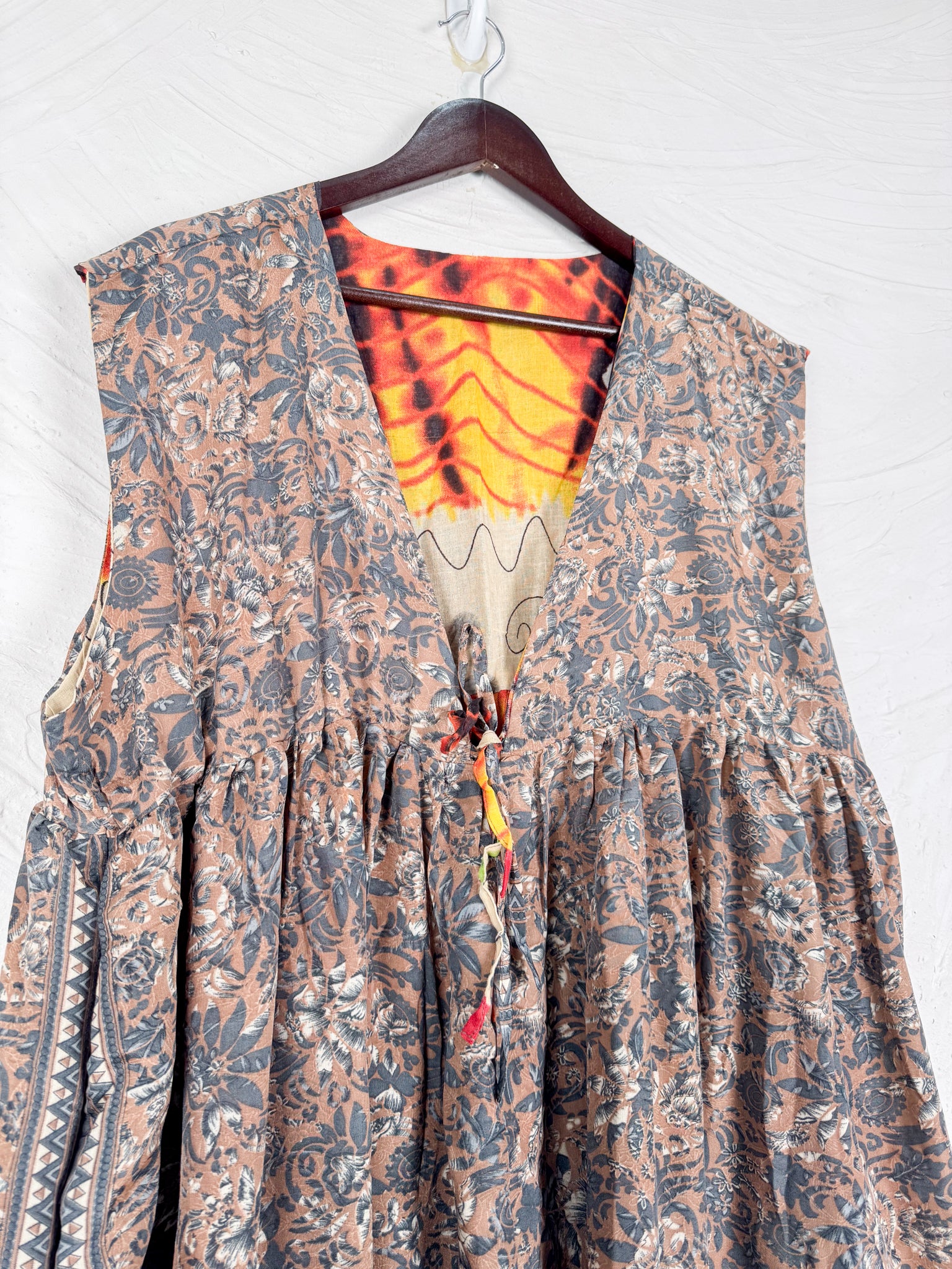 This reversible silk jumpsuit offers two distinct personalities: one side in vibrant, intricately patterned vintage Indian saree fabric, and the other in flowing, elegant silk. Its flattering V-neck, delicate ties, gathered waist, and wide, cropped legs provide ultimate comfort and breathability, making it a versatile piece of wearable art.