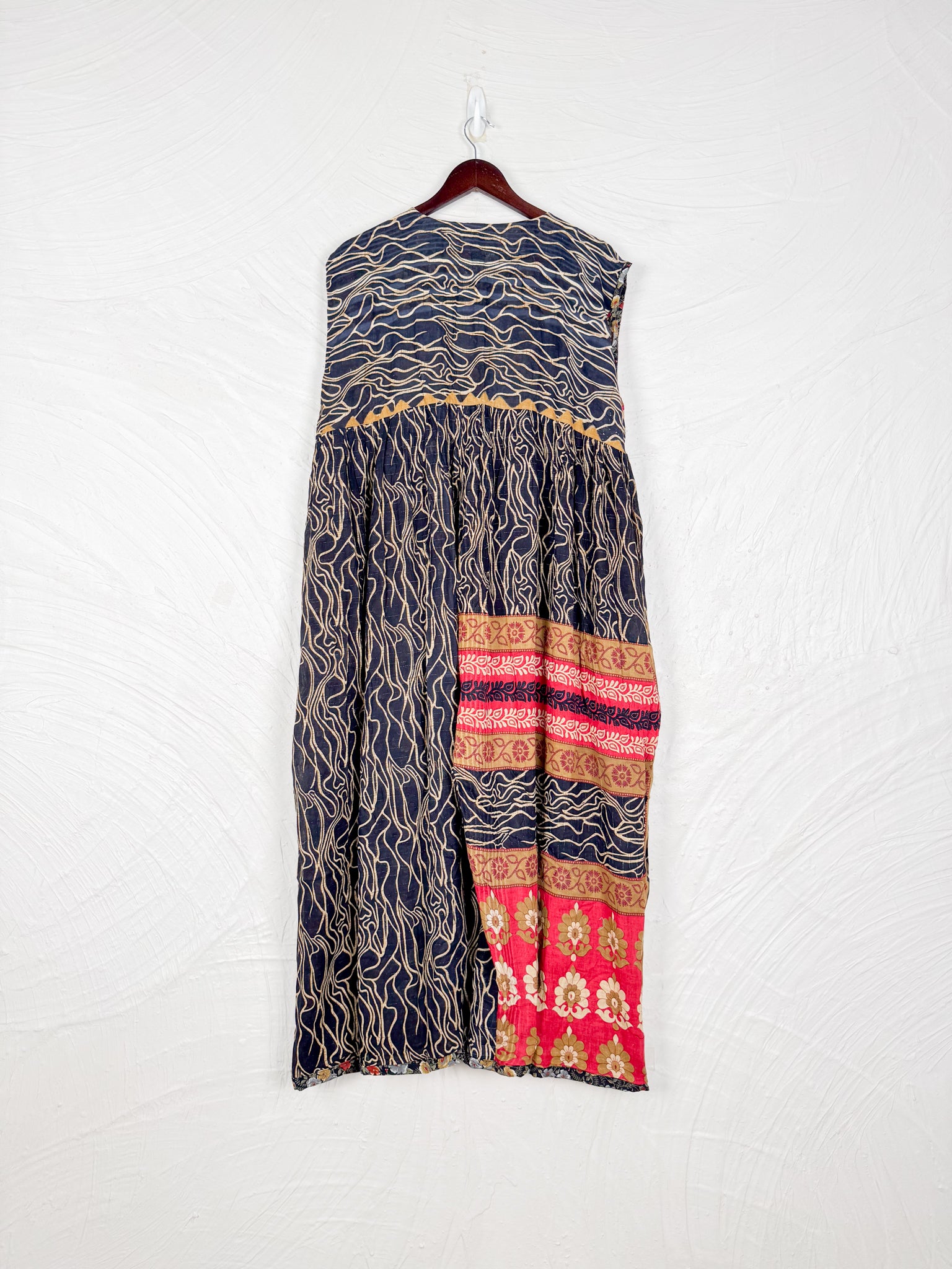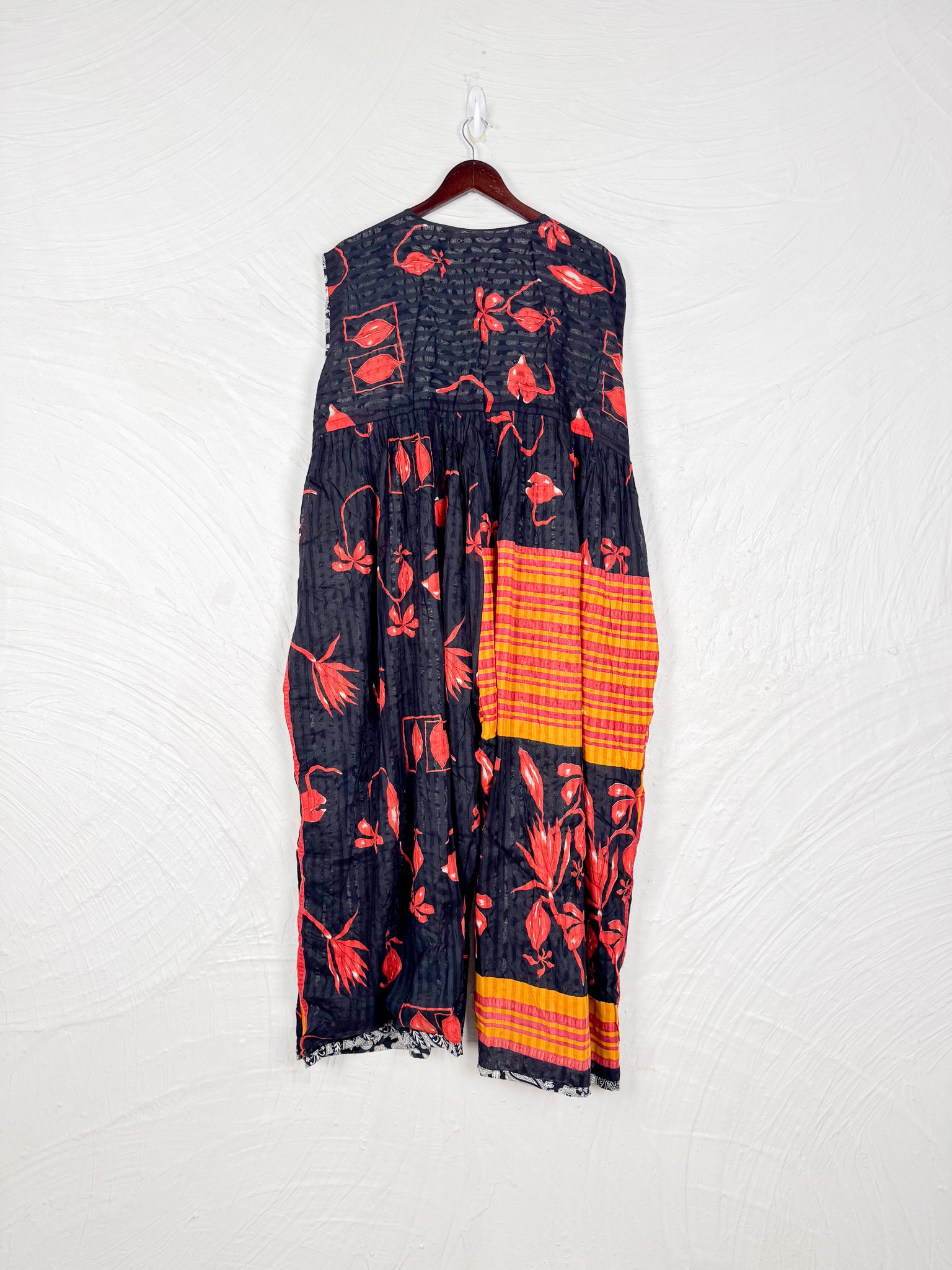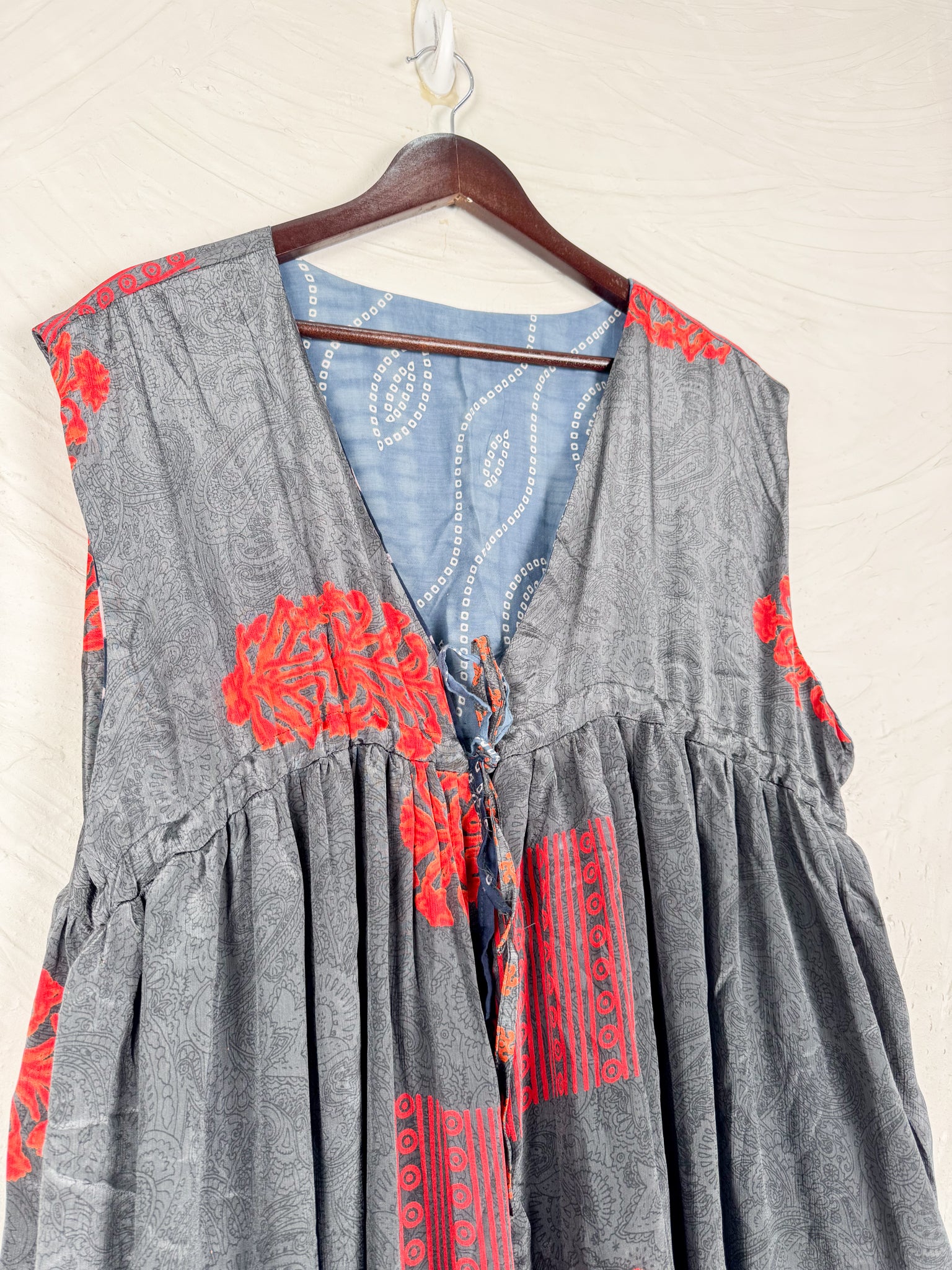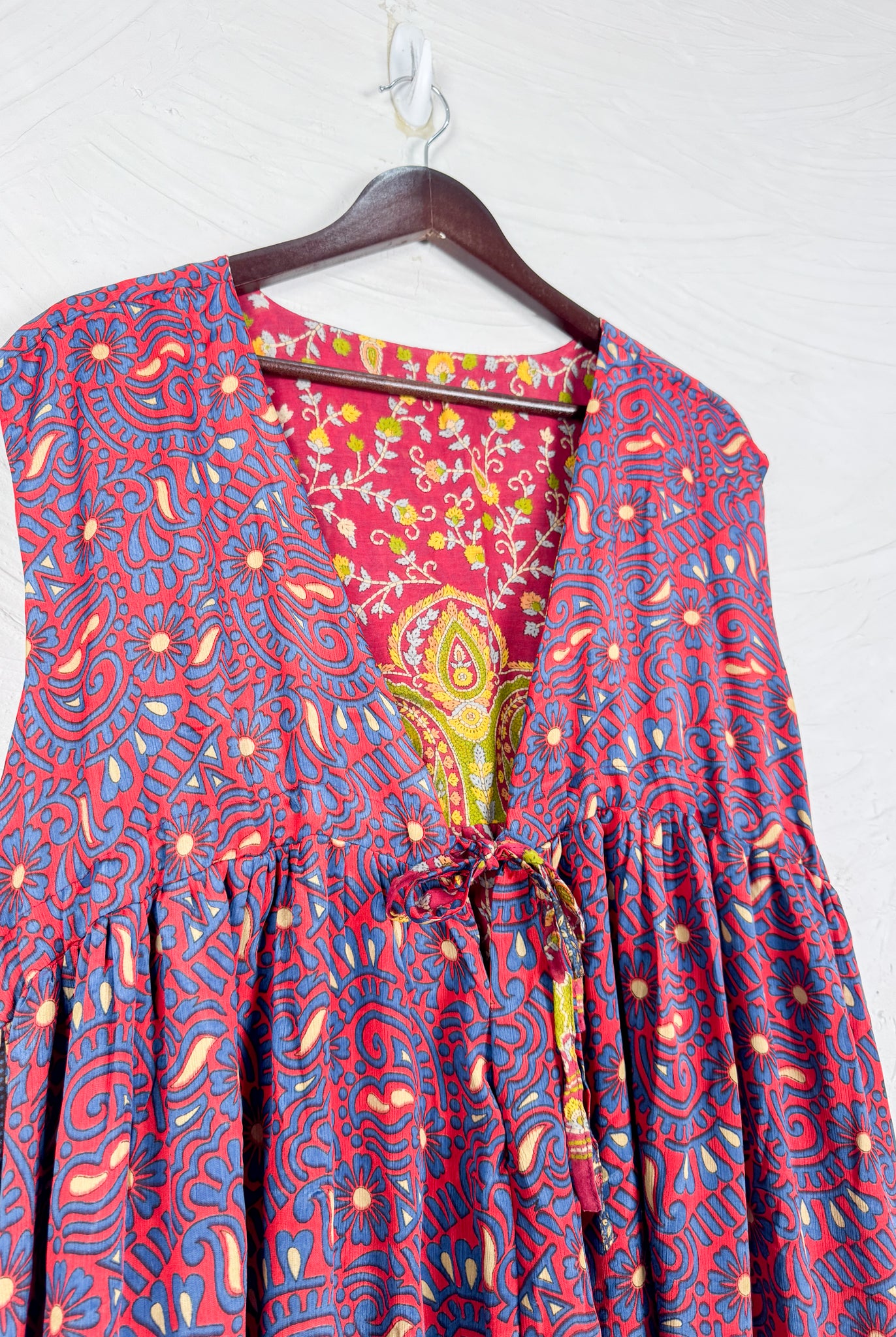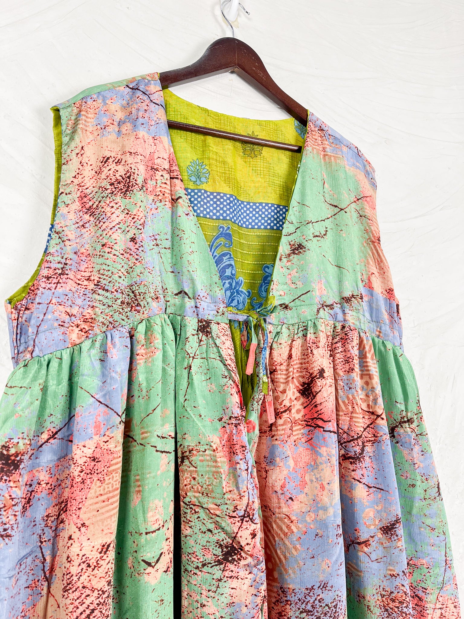 This reversible silk jumpsuit offers two distinct personalities: one side in vibrant, intricately patterned vintage Indian saree fabric, and the other in flowing, elegant silk. Its flattering V-neck, delicate ties, gathered waist, and wide, cropped legs provide ultimate comfort and breathability, making it a versatile piece of wearable art.