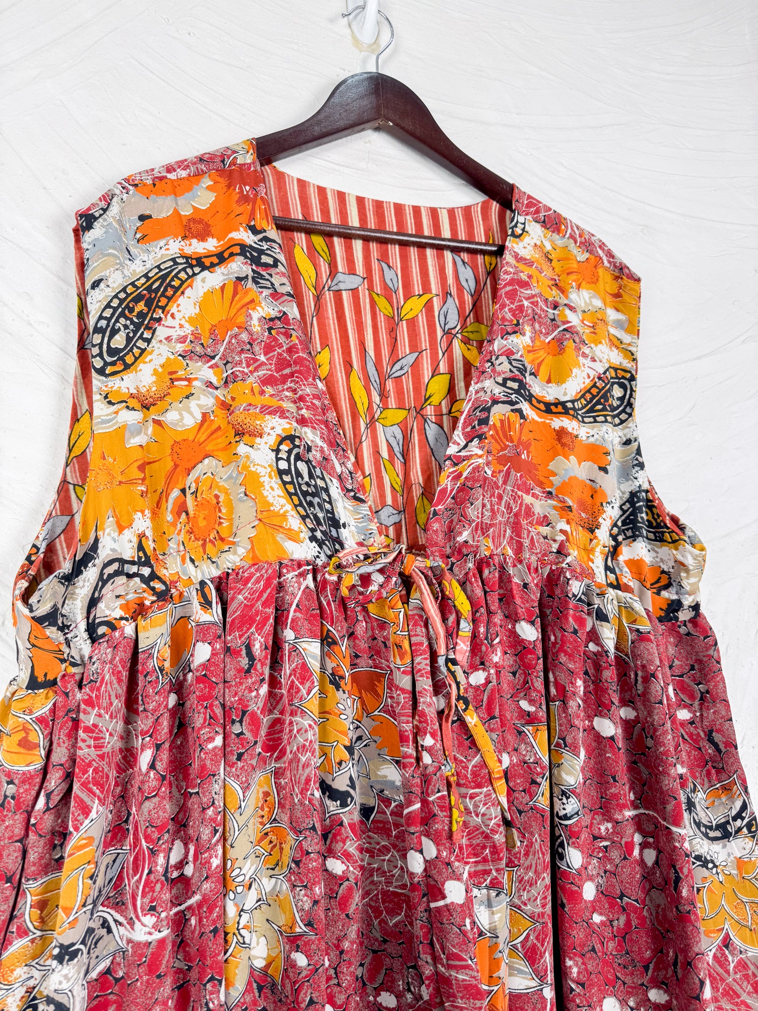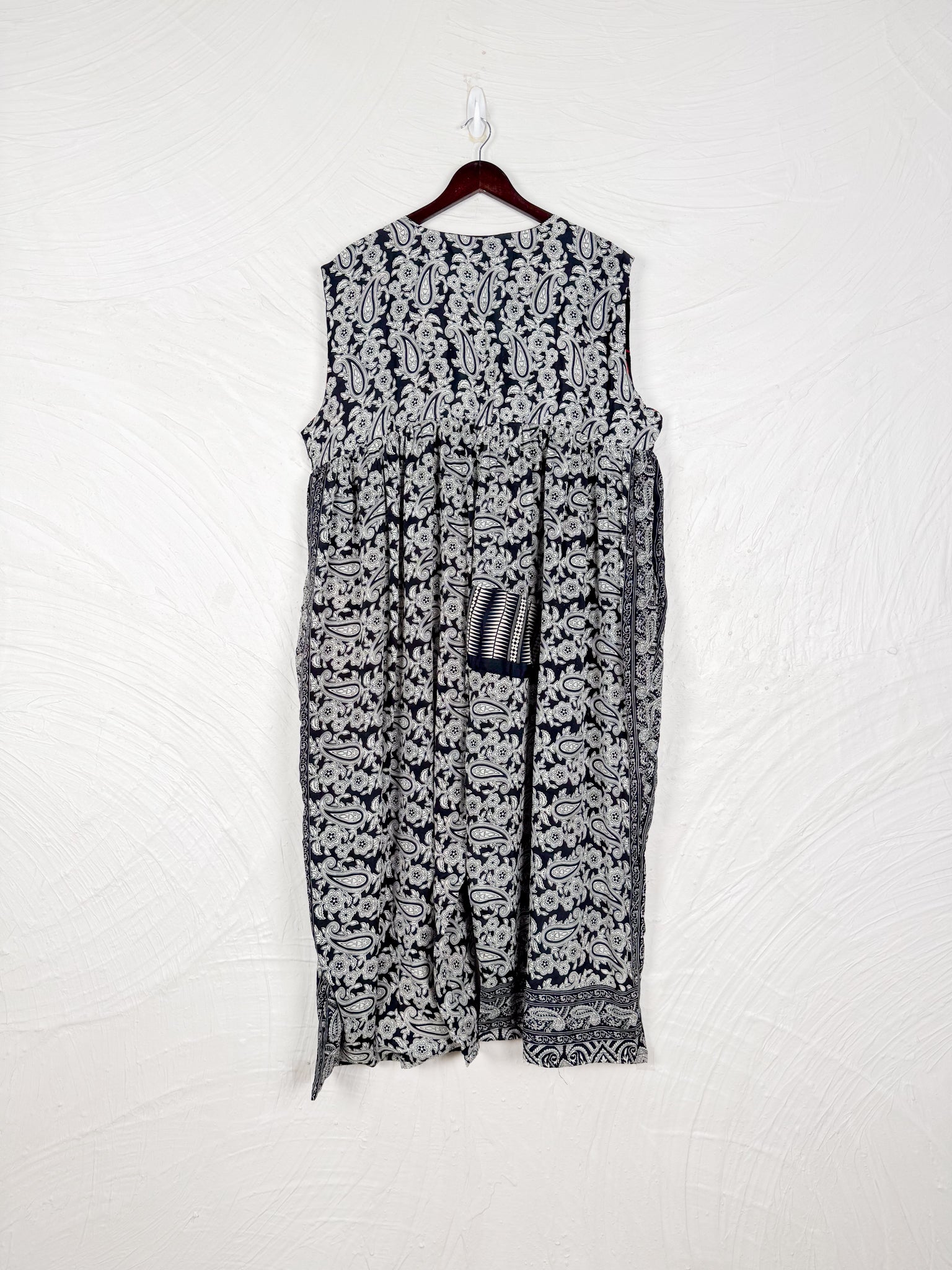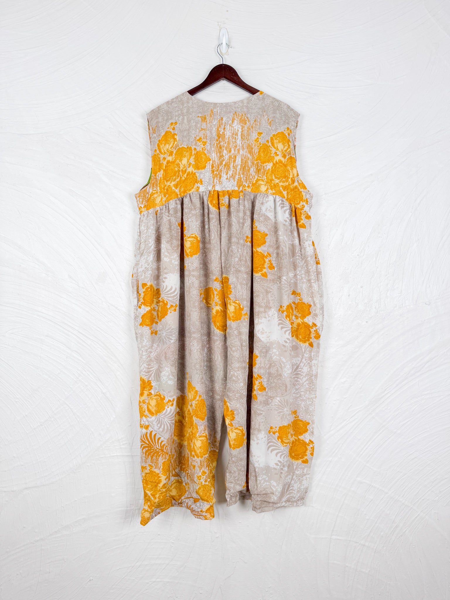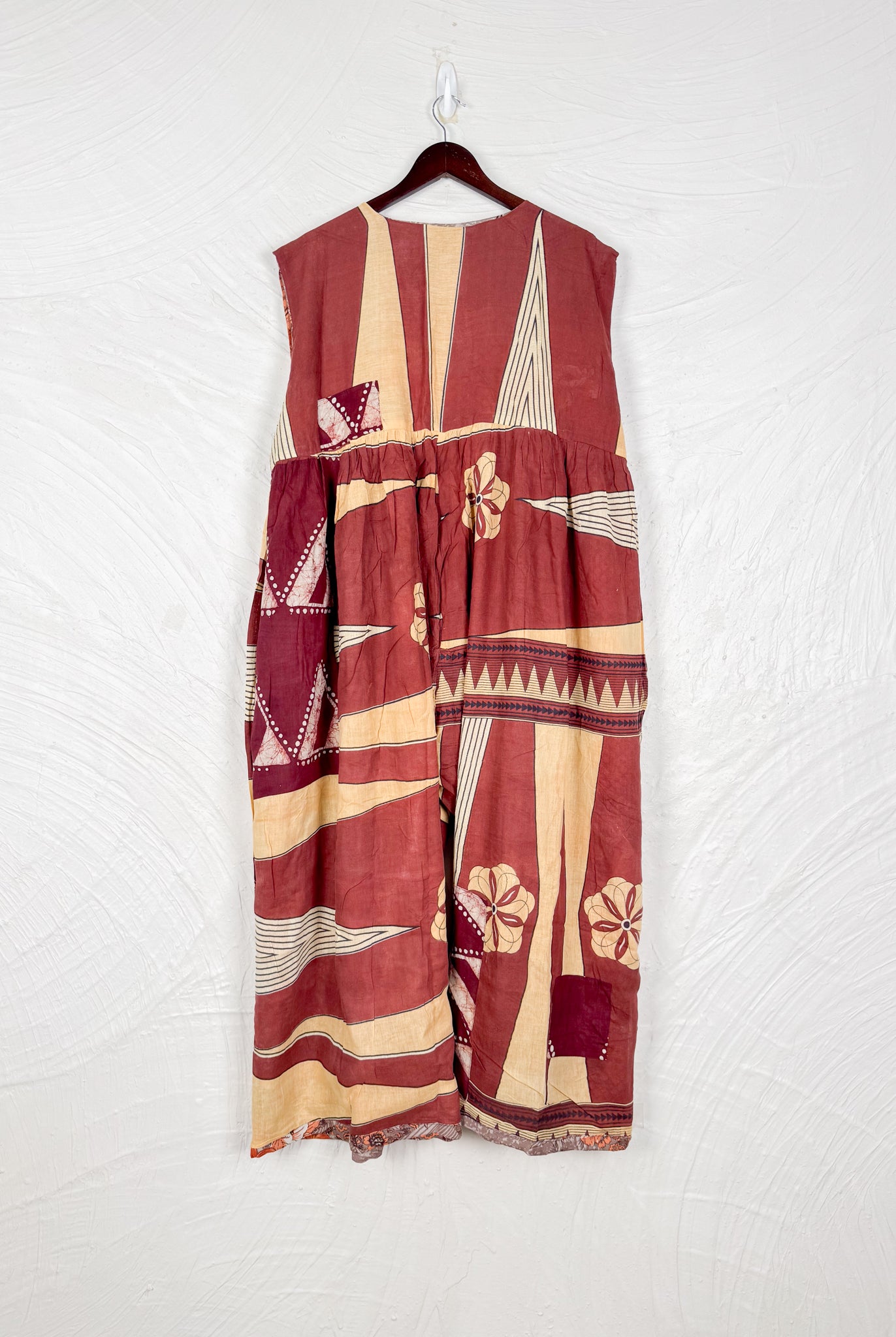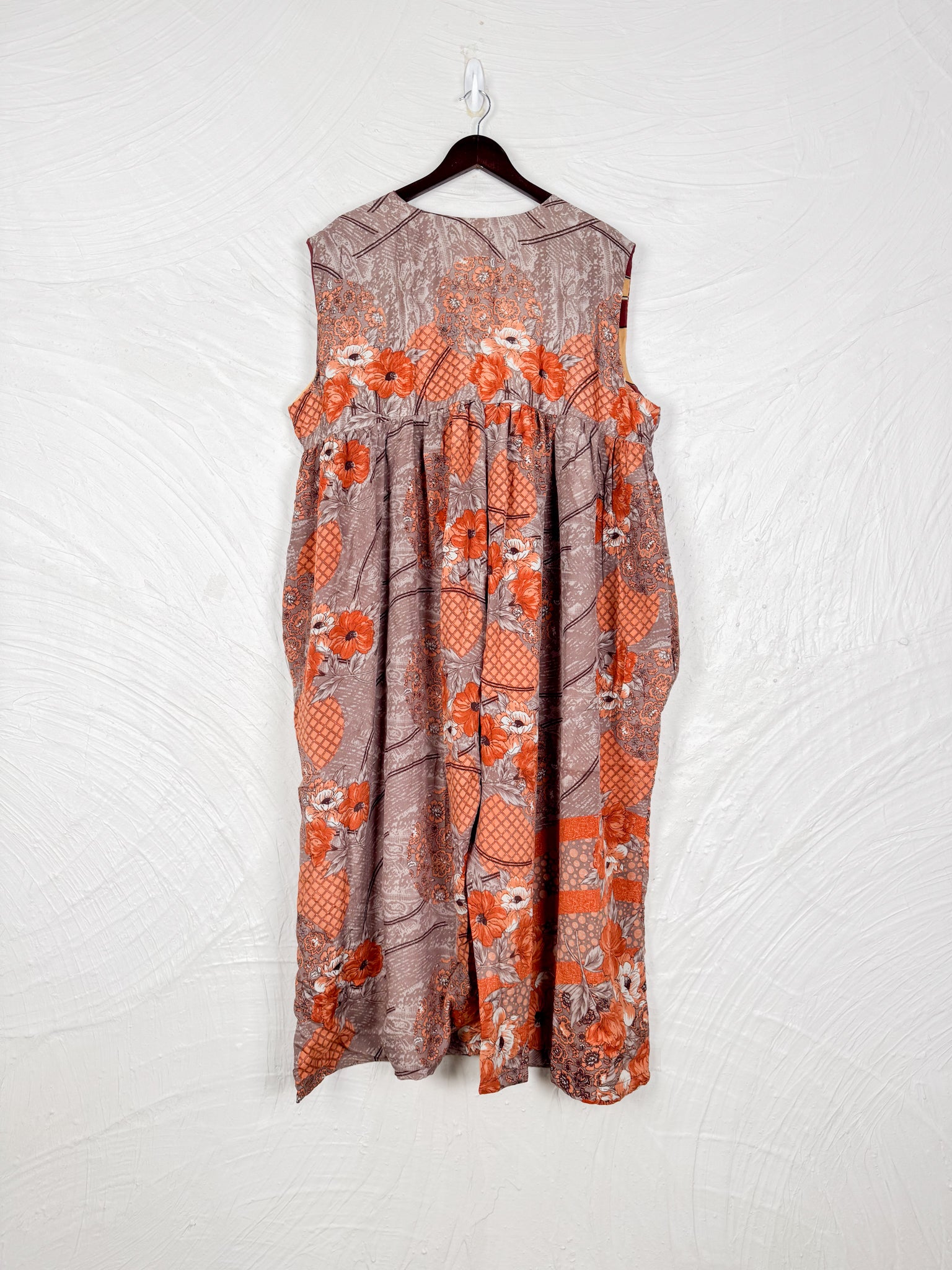 This reversible silk jumpsuit offers two distinct personalities: one side in vibrant, intricately patterned vintage Indian saree fabric, and the other in flowing, elegant silk. Its flattering V-neck, delicate ties, gathered waist, and wide, cropped legs provide ultimate comfort and breathability, making it a versatile piece of wearable art.