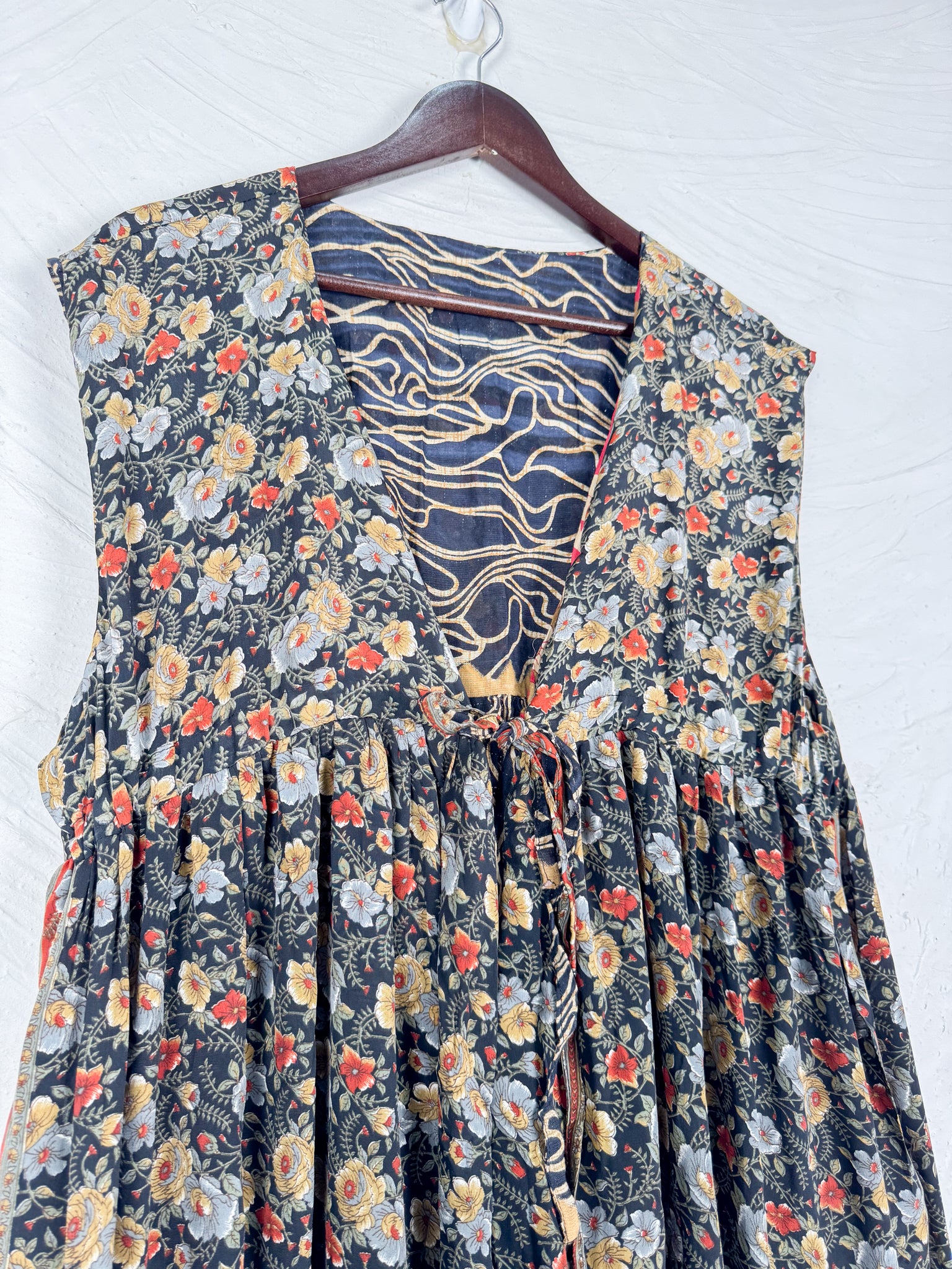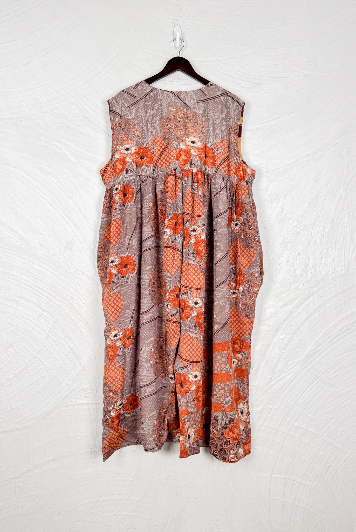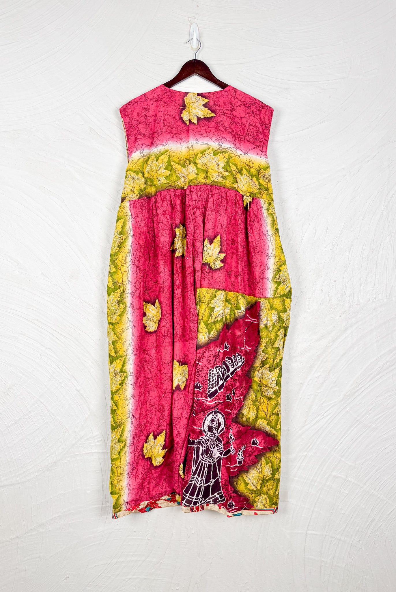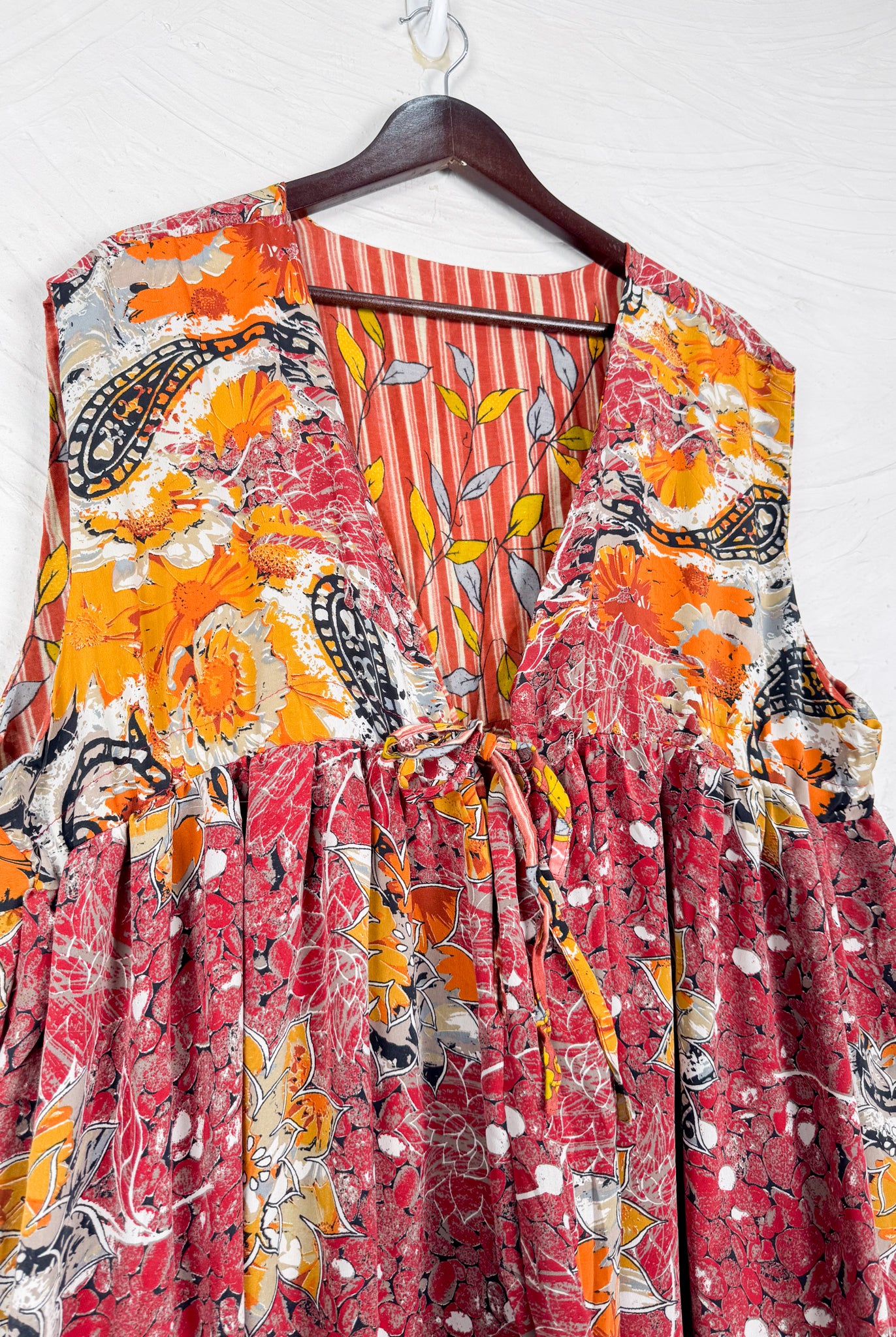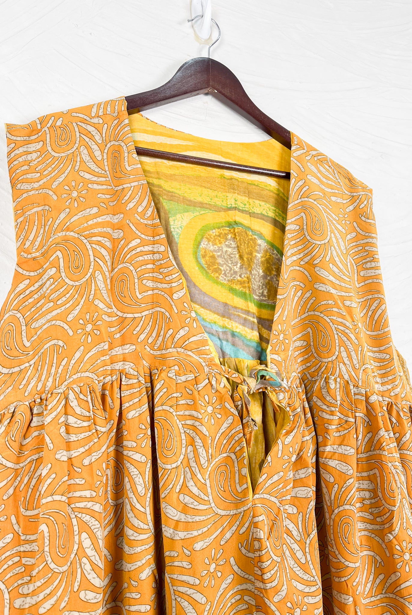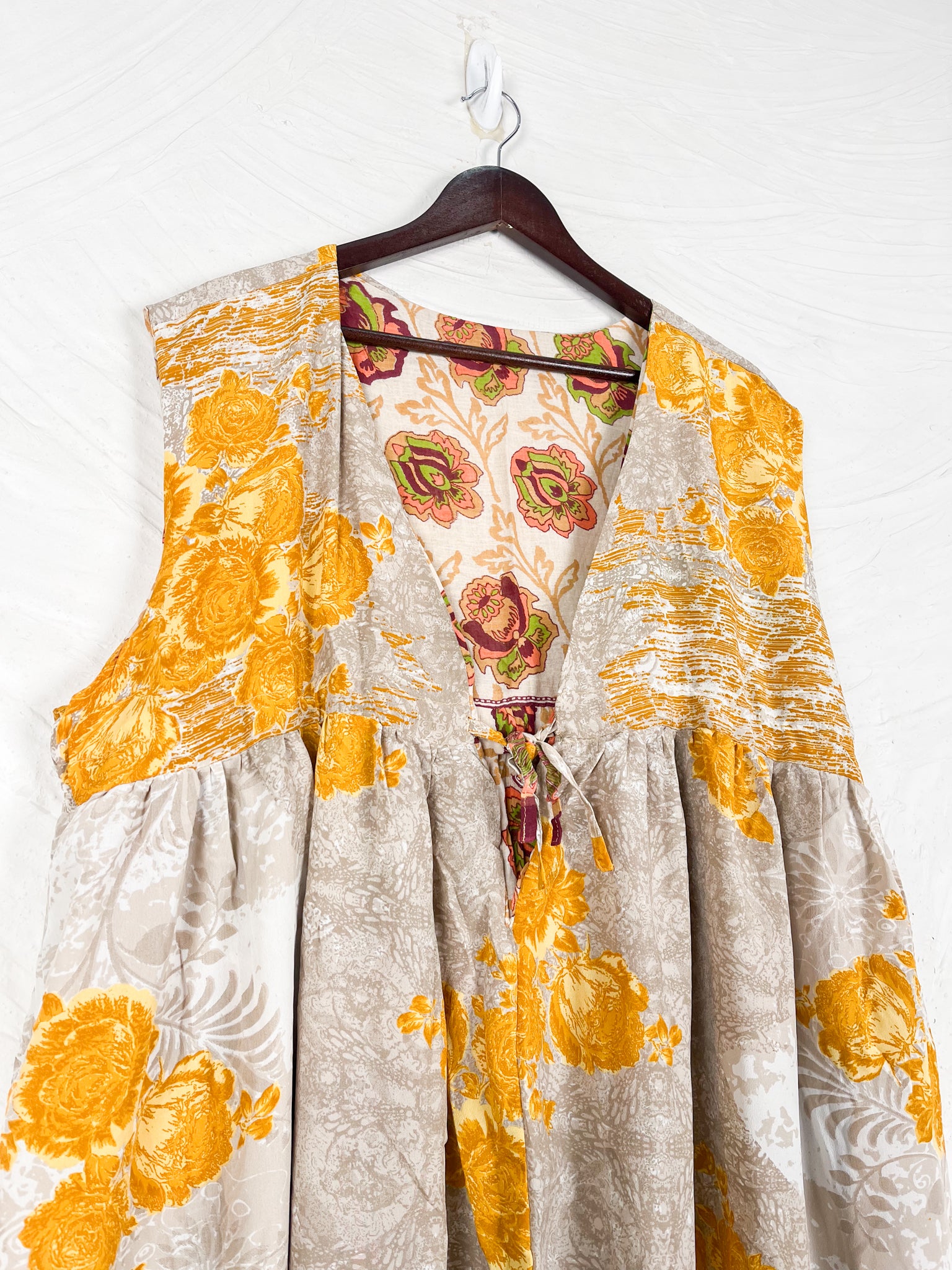 This reversible silk jumpsuit offers two distinct personalities: one side in vibrant, intricately patterned vintage Indian saree fabric, and the other in flowing, elegant silk. Its flattering V-neck, delicate ties, gathered waist, and wide, cropped legs provide ultimate comfort and breathability, making it a versatile piece of wearable art.