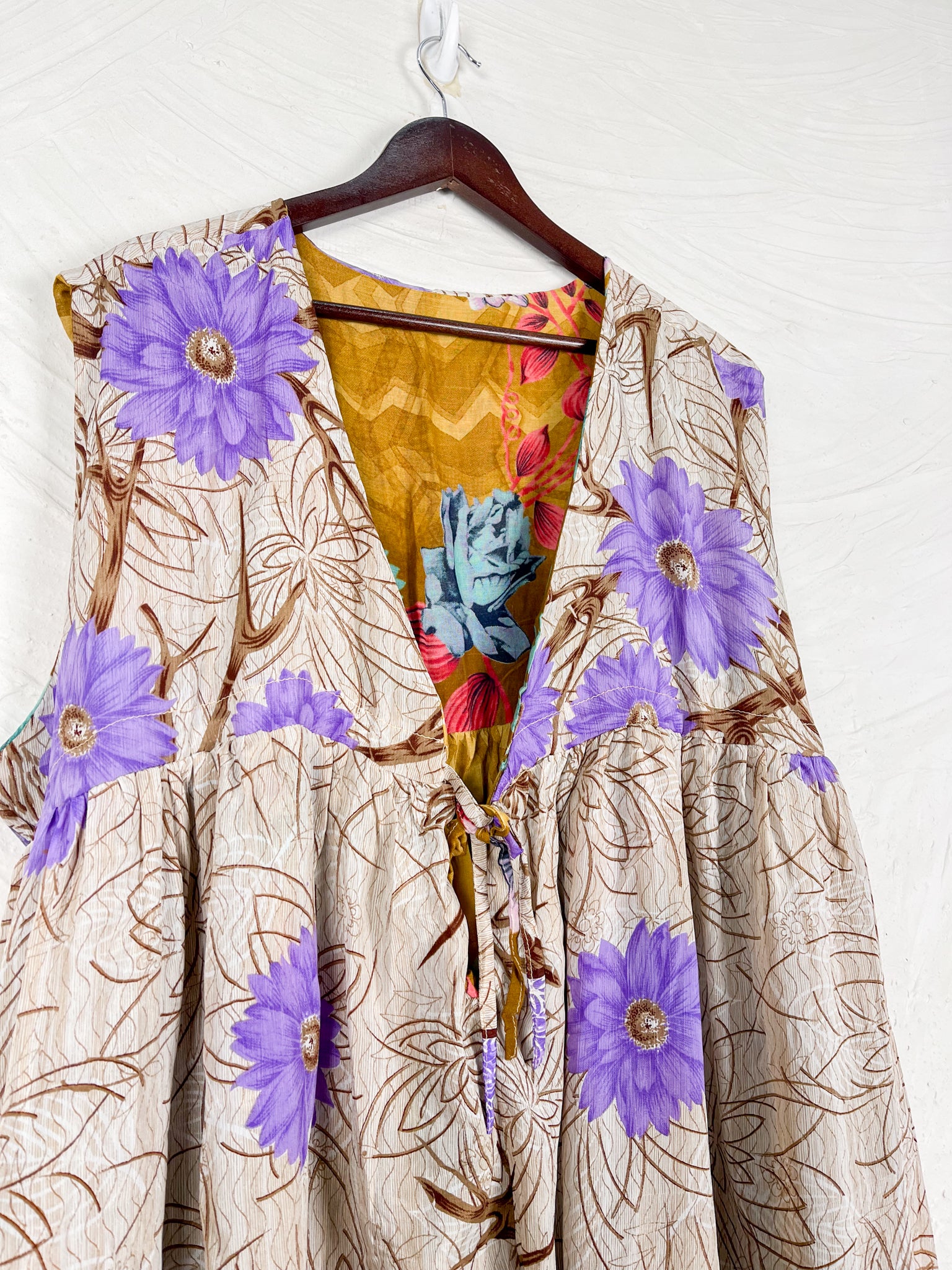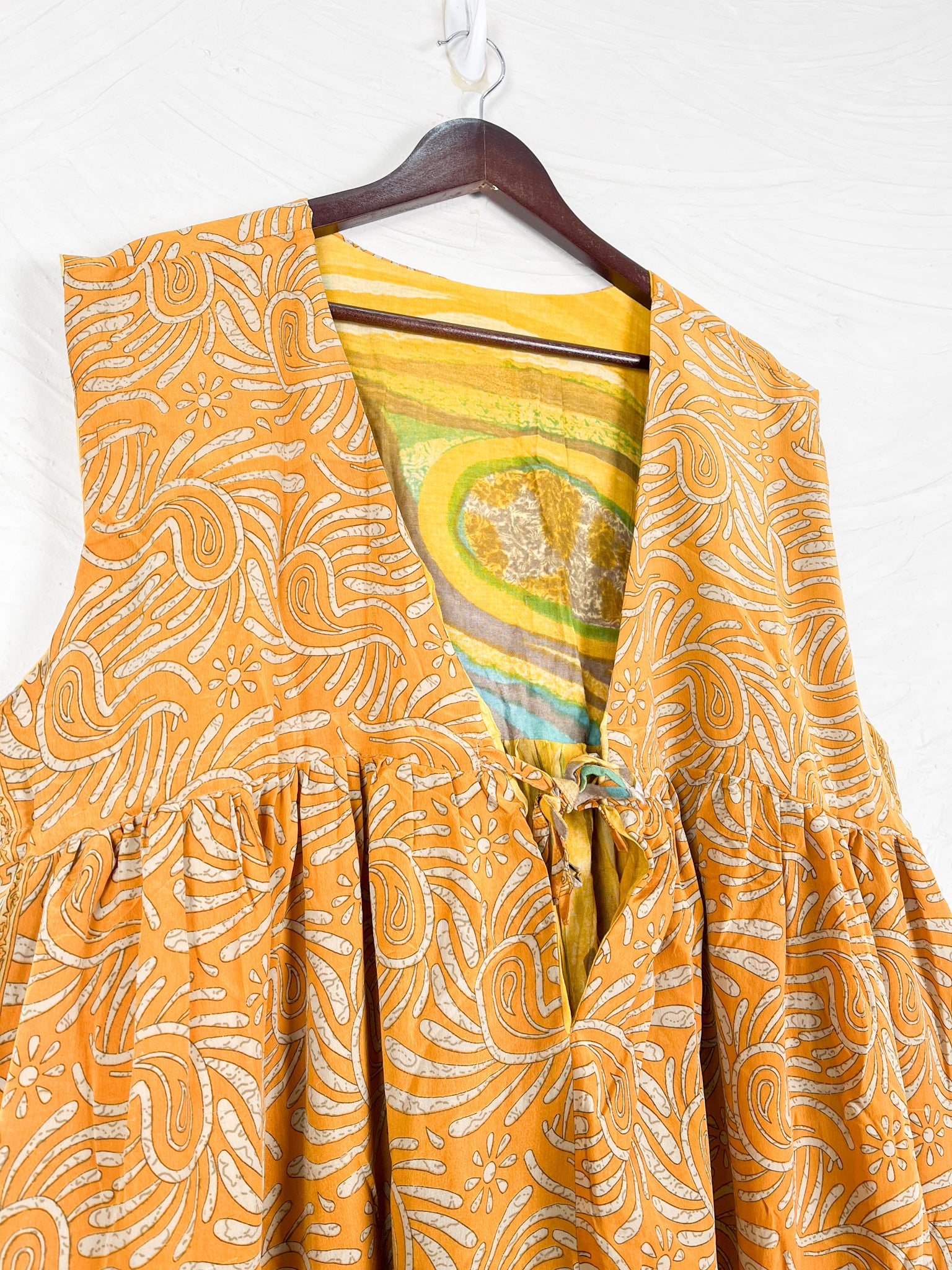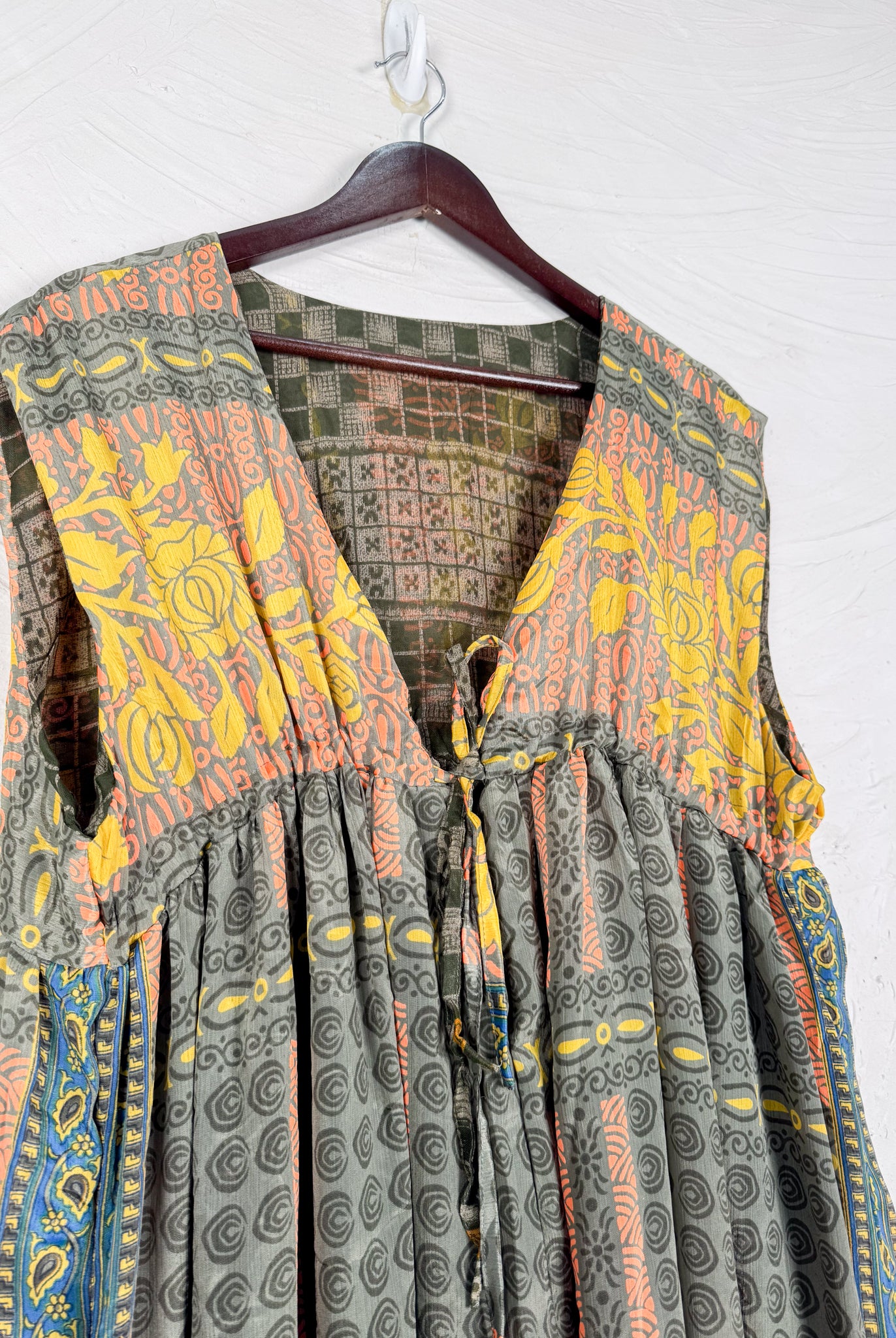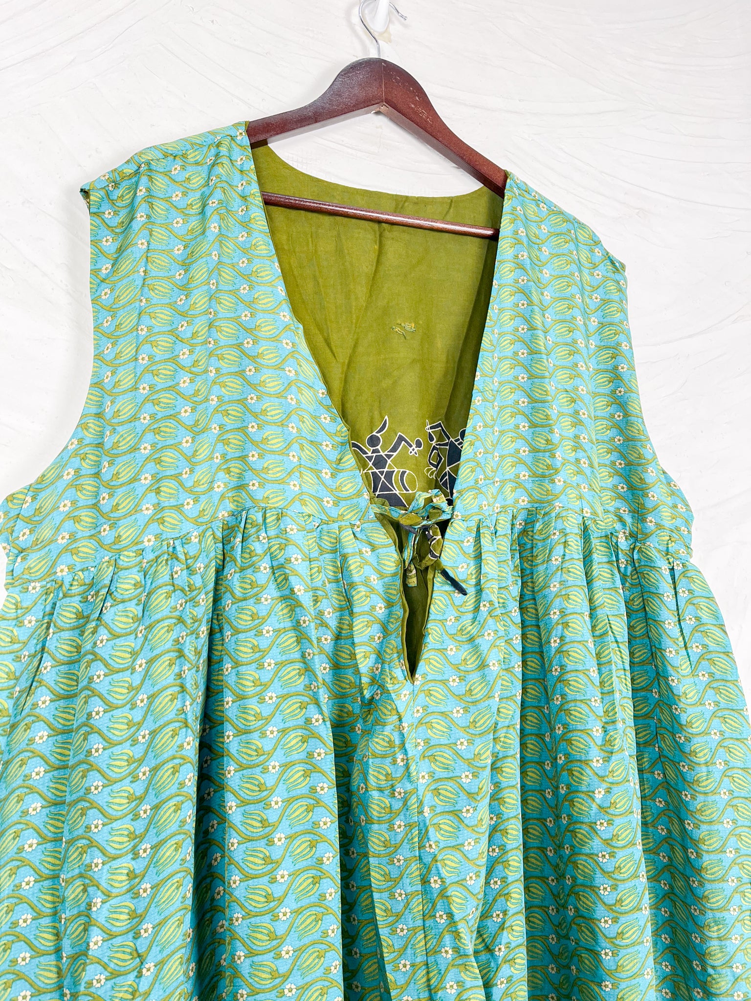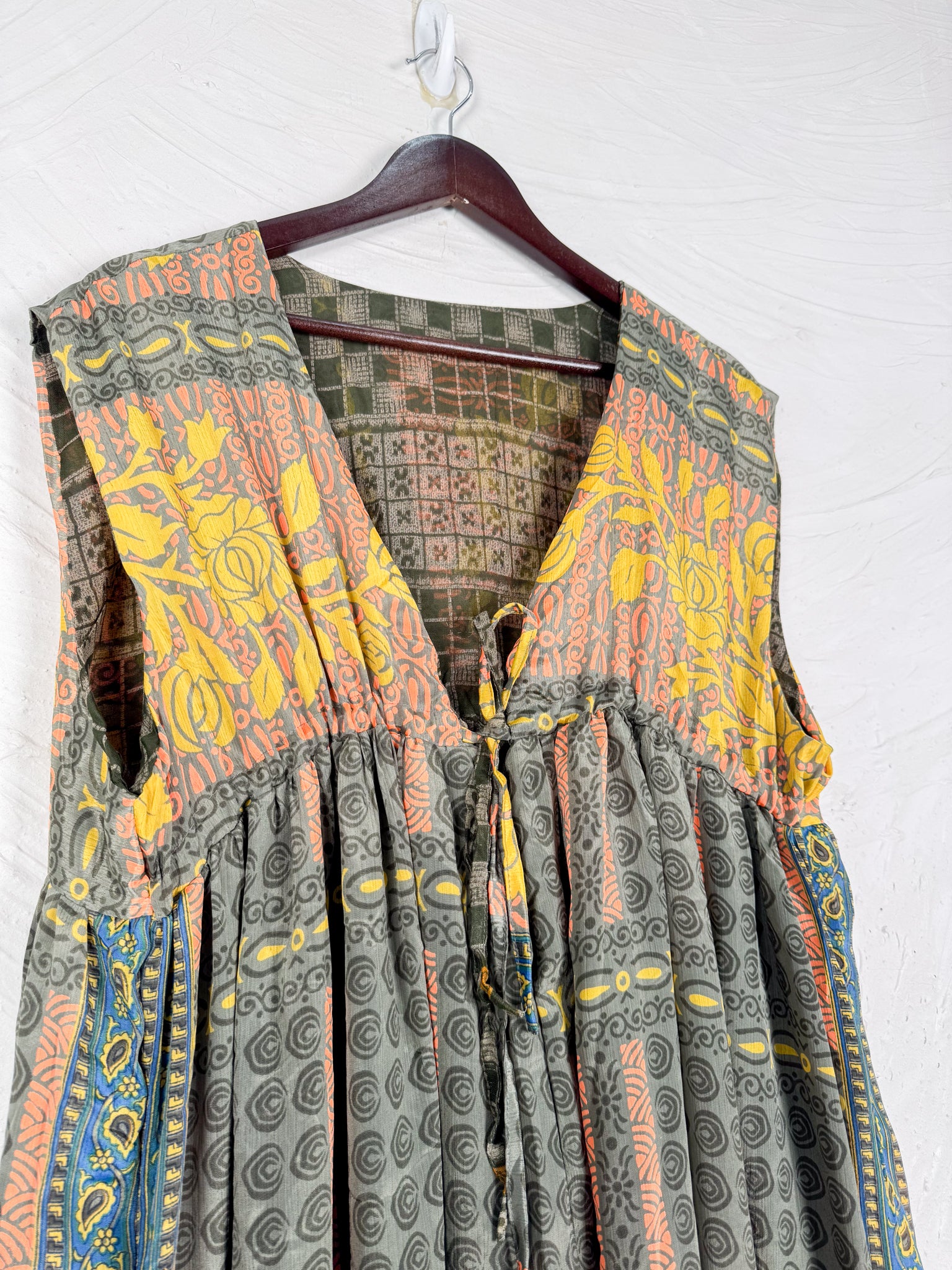 This reversible silk jumpsuit offers two distinct personalities: one side in vibrant, intricately patterned vintage Indian saree fabric, and the other in flowing, elegant silk. Its flattering V-neck, delicate ties, gathered waist, and wide, cropped legs provide ultimate comfort and breathability, making it a versatile piece of wearable art.