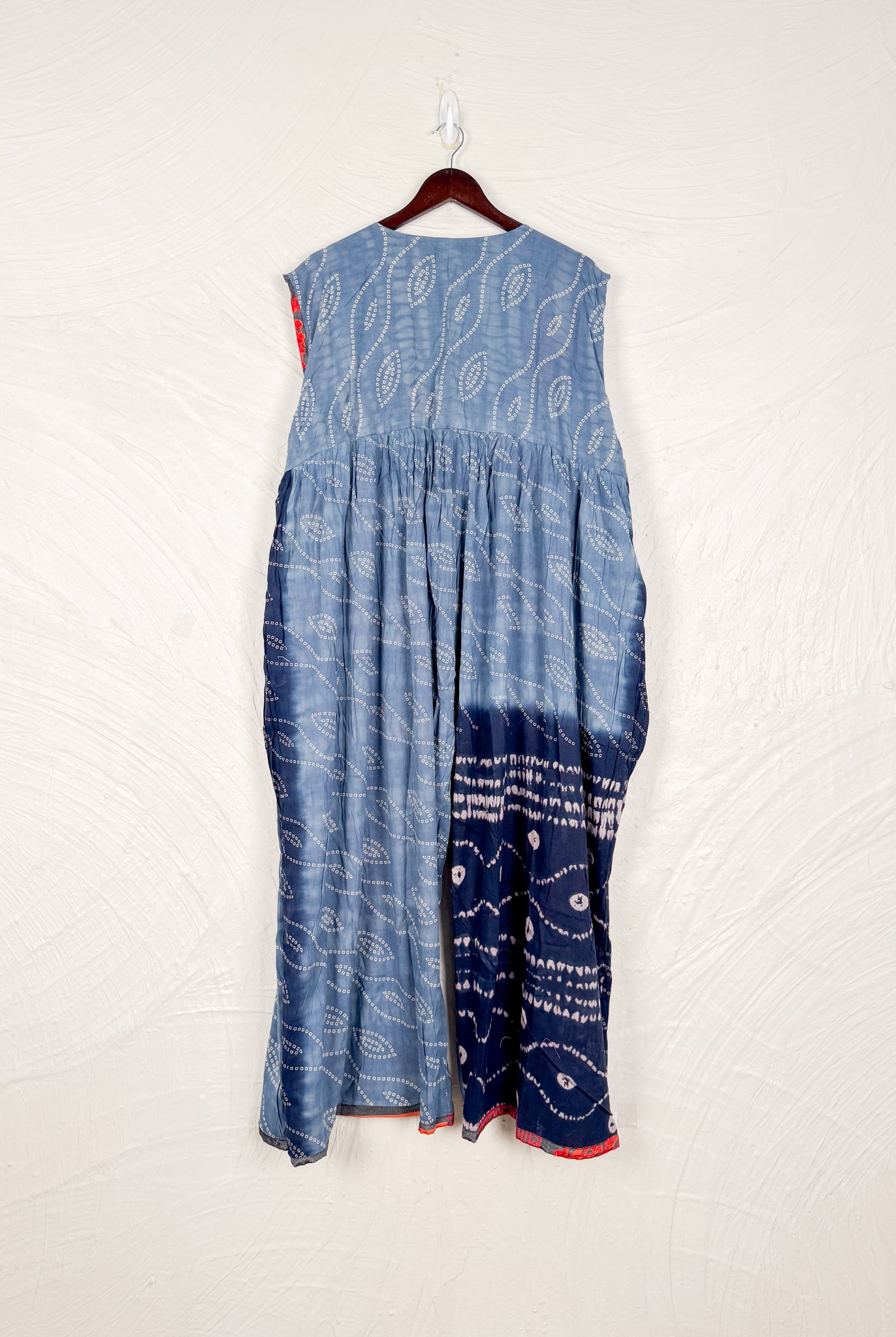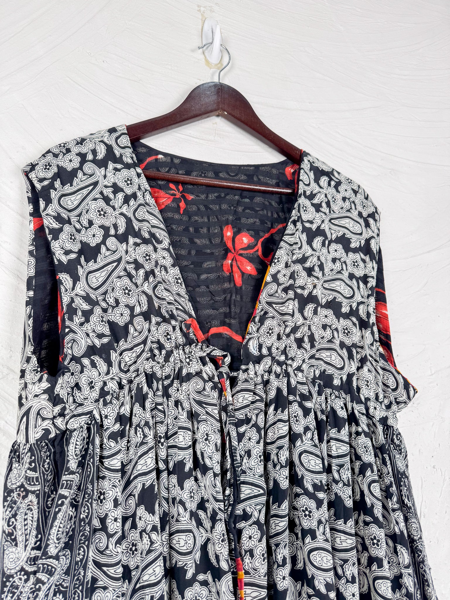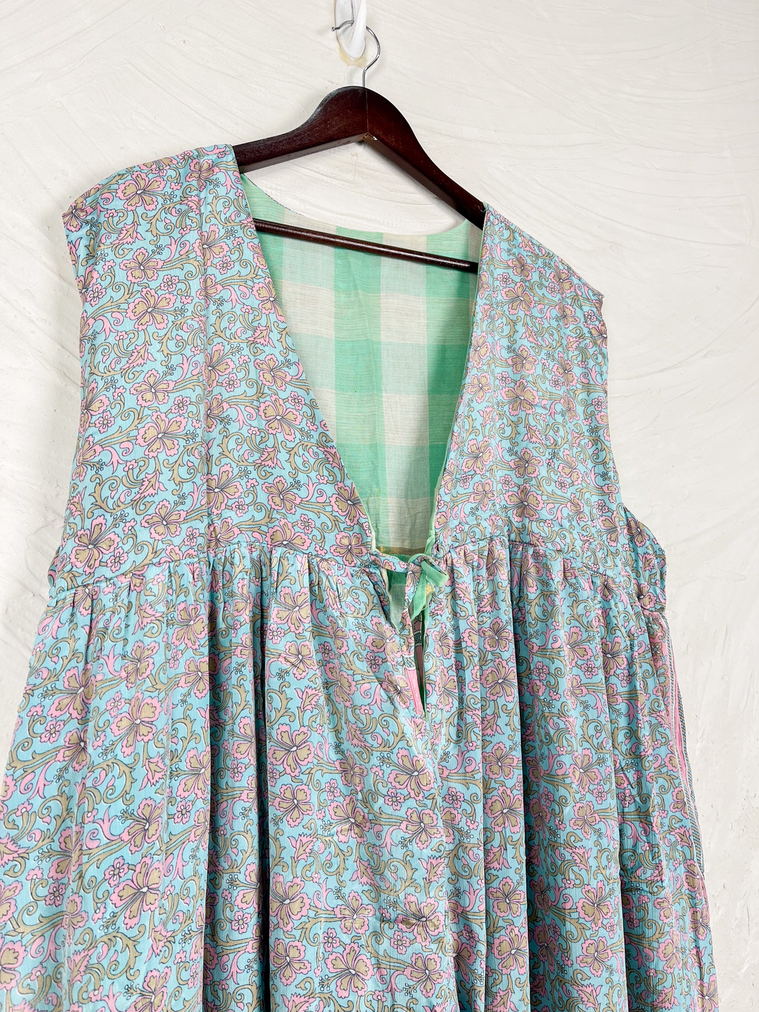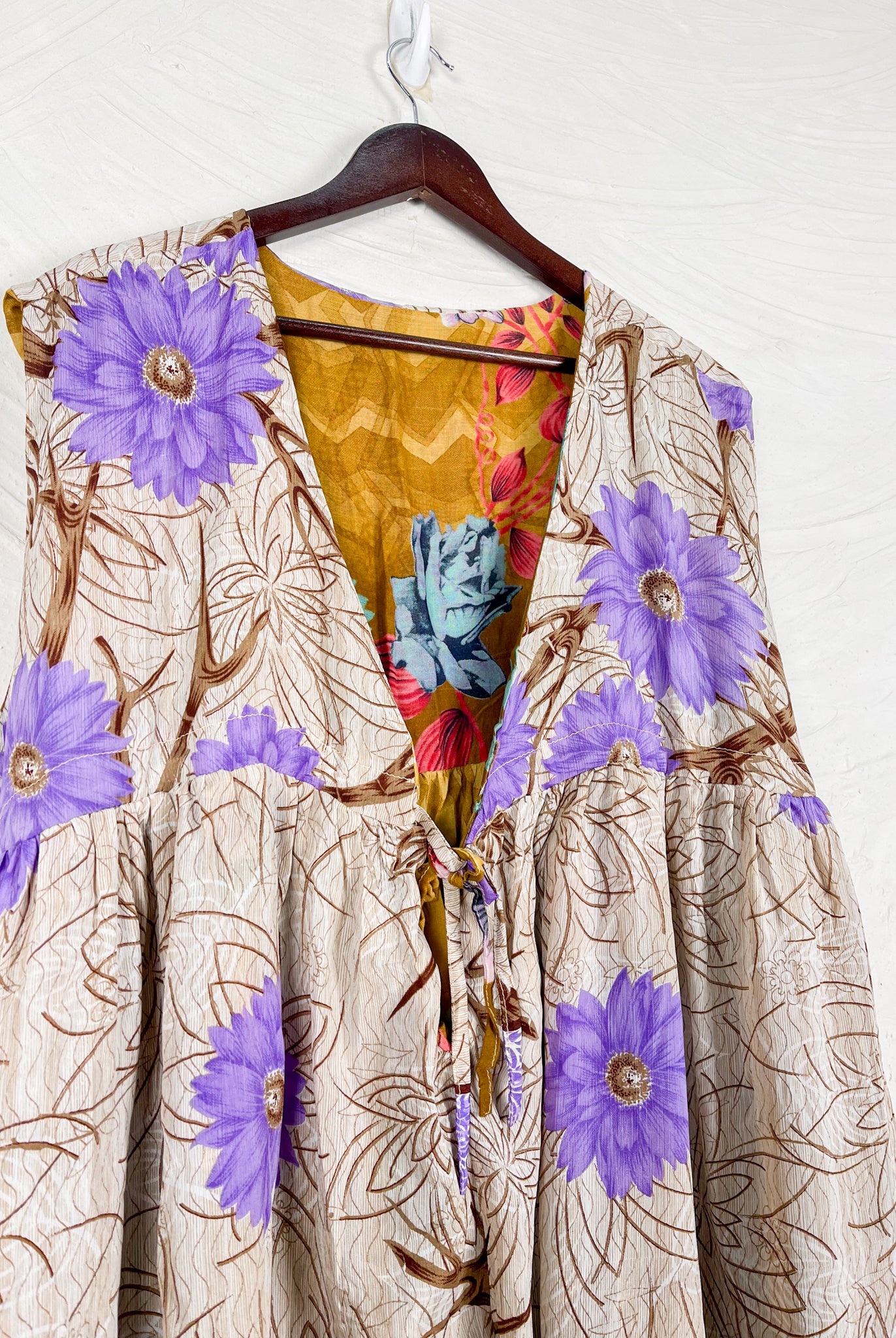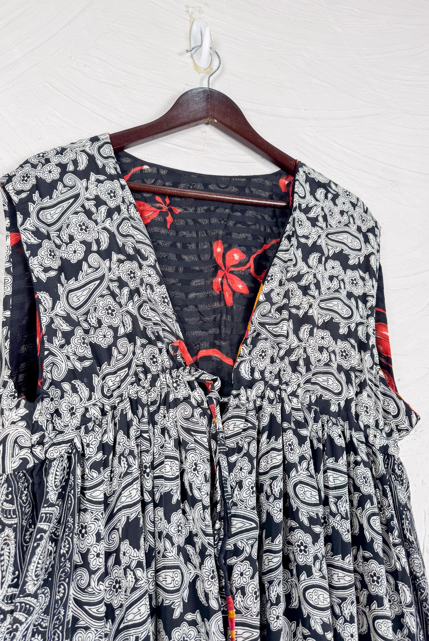 This reversible silk jumpsuit offers two distinct personalities: one side in vibrant, intricately patterned vintage Indian saree fabric, and the other in flowing, elegant silk. Its flattering V-neck, delicate ties, gathered waist, and wide, cropped legs provide ultimate comfort and breathability, making it a versatile piece of wearable art.