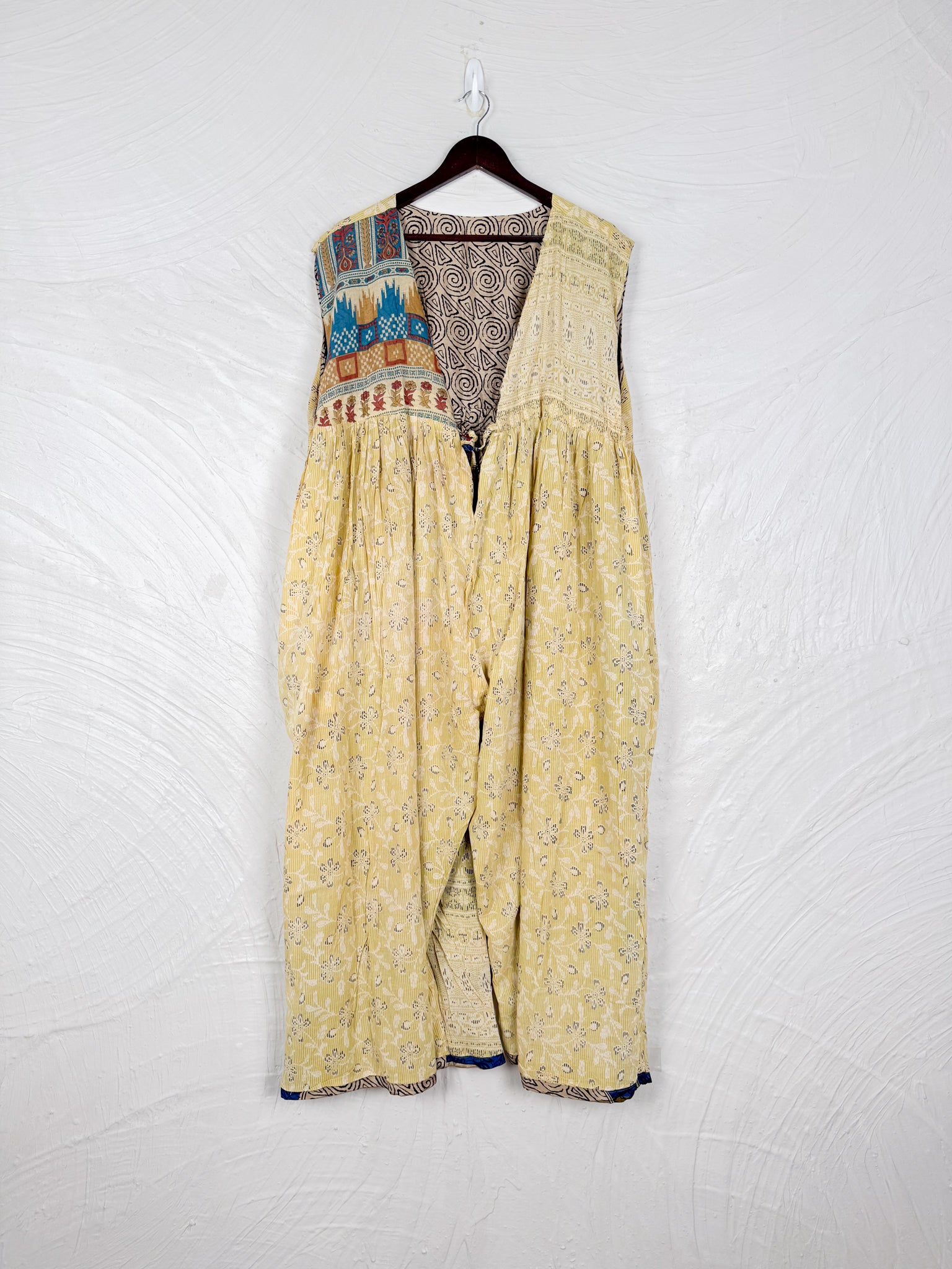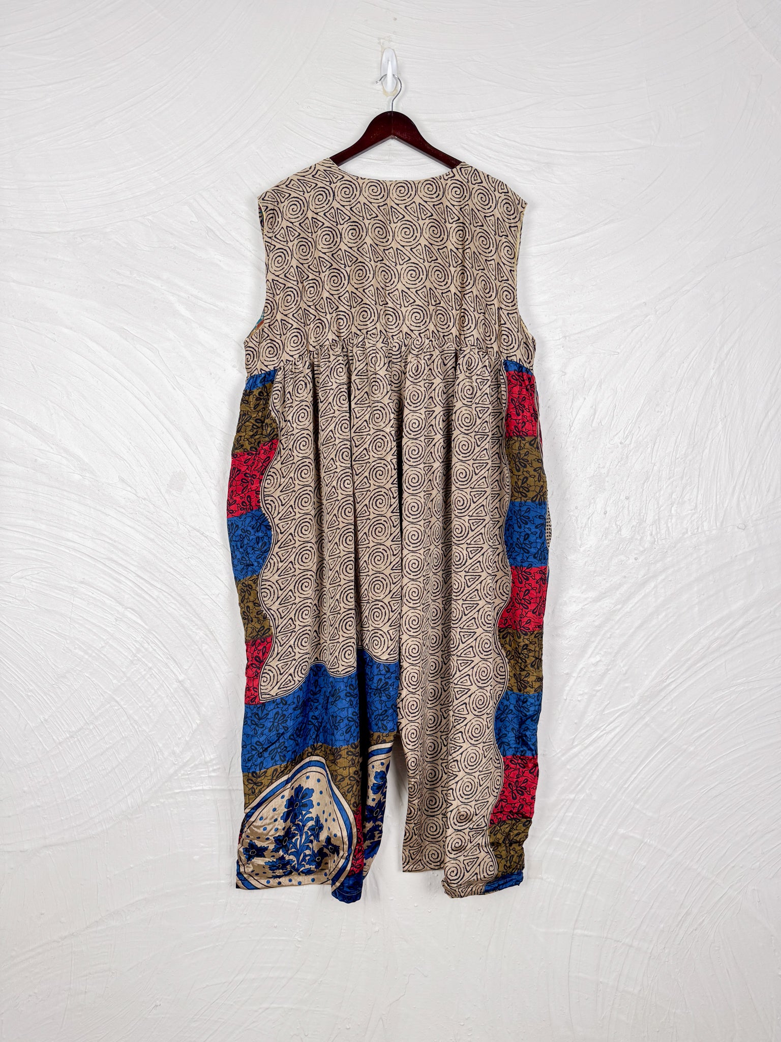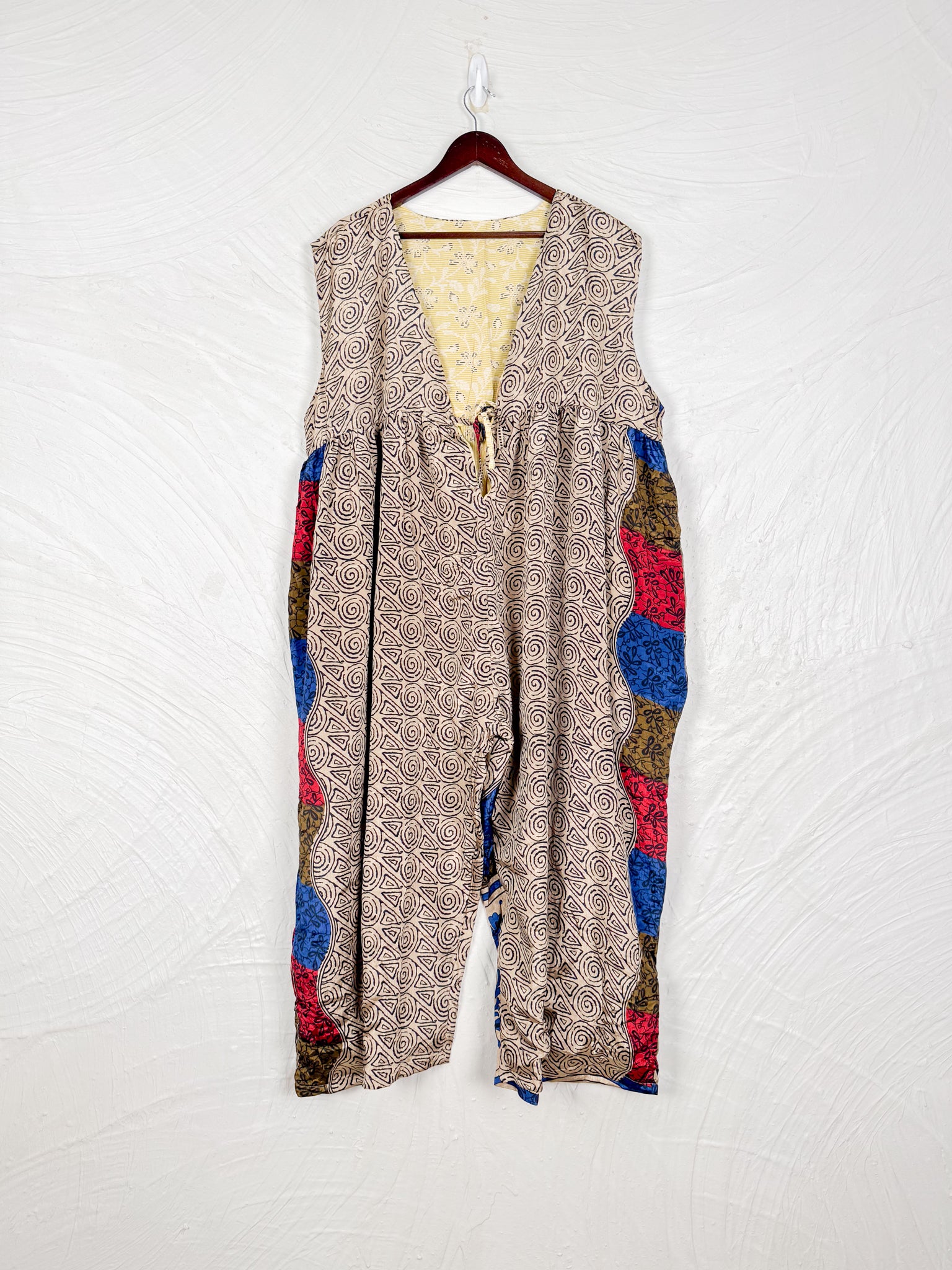 Step into a world of effortless style with this reversible dream of a jumpsuit! Imagine slipping into a single garment that offers two distinct personalities. One side whispers tales of vintage Indian sarees, where vibrant colors, intricate patterns, and the soft touch of recycled cotton create a truly unique, bohemian vibe. Flip it inside out, and you're embraced by the silken whisper of flowy silk, draping beautifully for an elegant and fluid silhouette.